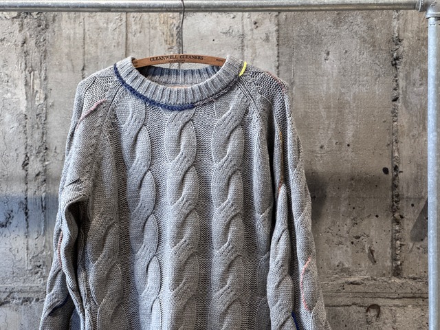 Remake cable pattern knit c/nになります。 リメイクのニットセーター。 カラーはライトグレー、程よく伸縮性のあるレギュラーサイズのMくらい。 ケーブル編みに合わせてランダムに別カラーの編みのパターンを施しています。 どの角度からも楽しめるitem。 インナーとして、春はトップスとしてスウェット感覚で楽しめます。 size:FREE(着丈60cm 身幅48cm 裄丈70cm) 【material アクリル100%】 made in SHHH