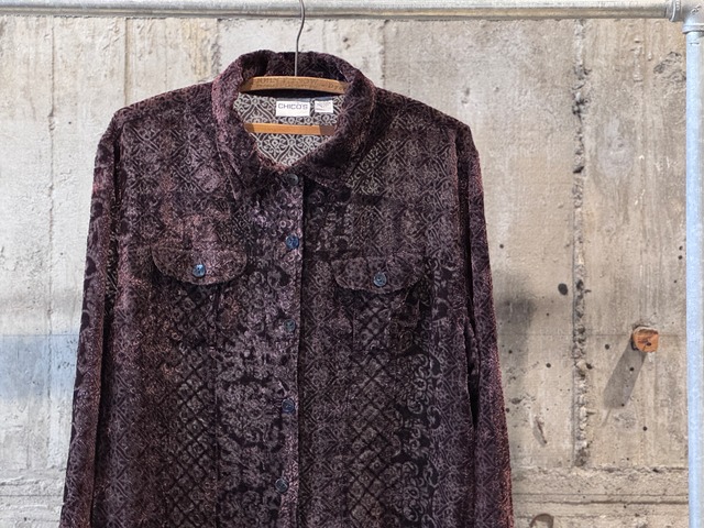 CHICO'S design see through pattern shirtになります。 トラッカータイプのデザインシャツ。 モコモコで凸凹とした生地でパターンが施され、透け感のある部分との絶妙な表情です。インナーに何のカラーを着るかでその表情が異なりますね。 カラーはブラウン。 短丈で程よくワイドなボックスシルエット。 size:3(着丈64cm 身幅59cm 肩幅46cm 袖丈56cm) 【material レーヨン54% ナイロン46%】 *USED商品ですので表記以外の小さな汚れやシワがある場合がございます。 中古の特性としてご理解ください。