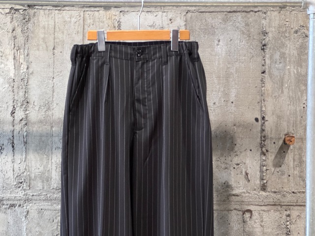 Remake stripe 1tuck wide slacksになります。 サラッとした生地感、ドレープ性を兼ね備えているモダンな生地感のデザインスラックス。 グレーベースのストライプパターン。1タックでセンタープレスの入った程よくワイドなシルエット。ウエストはゴムとコードのイージー仕様なので快適な穿き心地です。 size:M(ウエスト76-84cm 総丈102cm 股下73cm ワタリ幅33cm 裾幅27cm) size:L(ウエスト80-90cm 総丈105cm 股下75cm ワタリ幅35cm 裾幅28cm) 【material ポリエステル80% レーヨン15% ポリウレタン5%】 made in SHHH