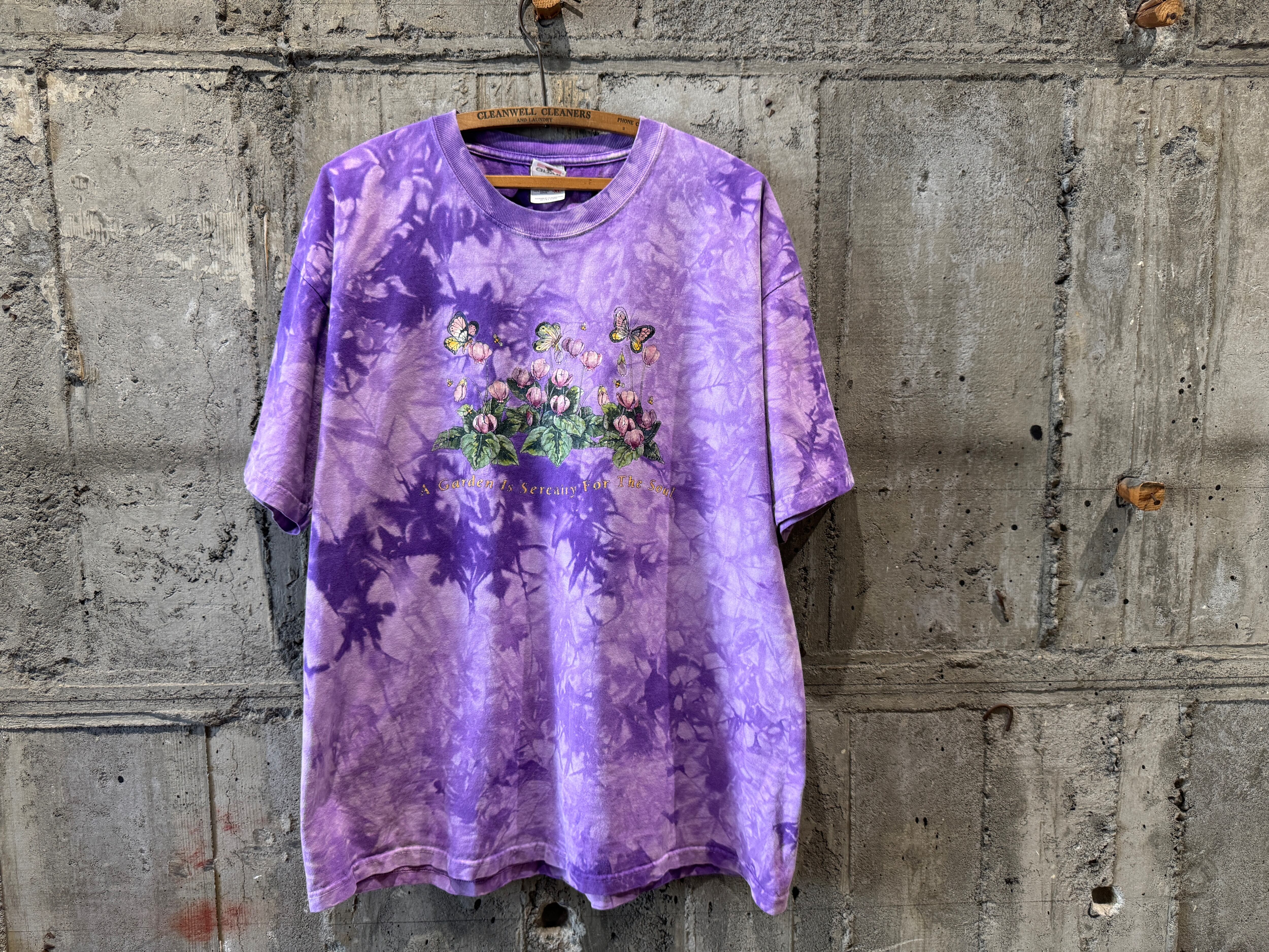 パープルベースのタイダイにピースフルなプリント。前身頃だけでなく後ろ身頃の右肩付近のグラフィックの配置が最高!