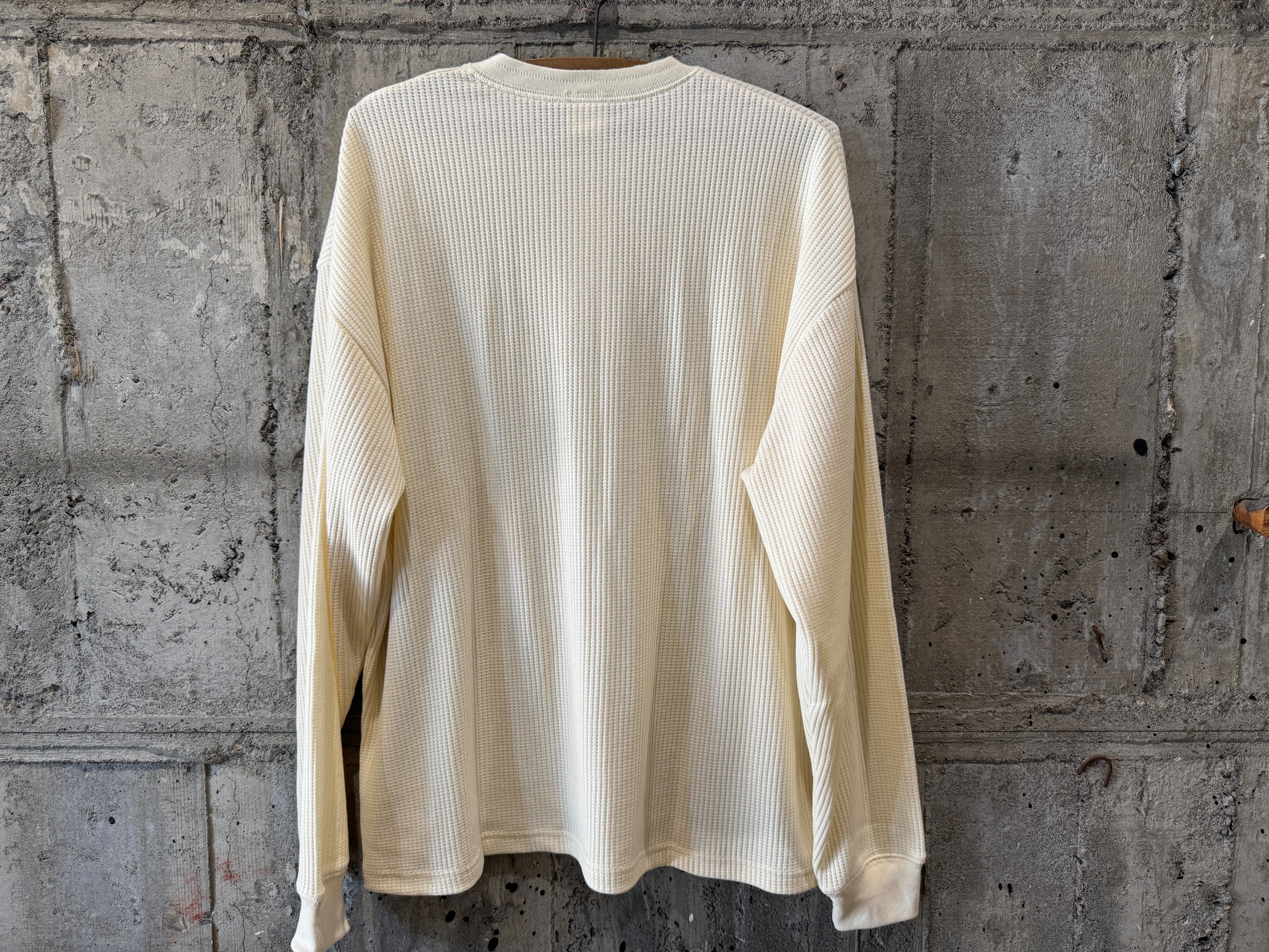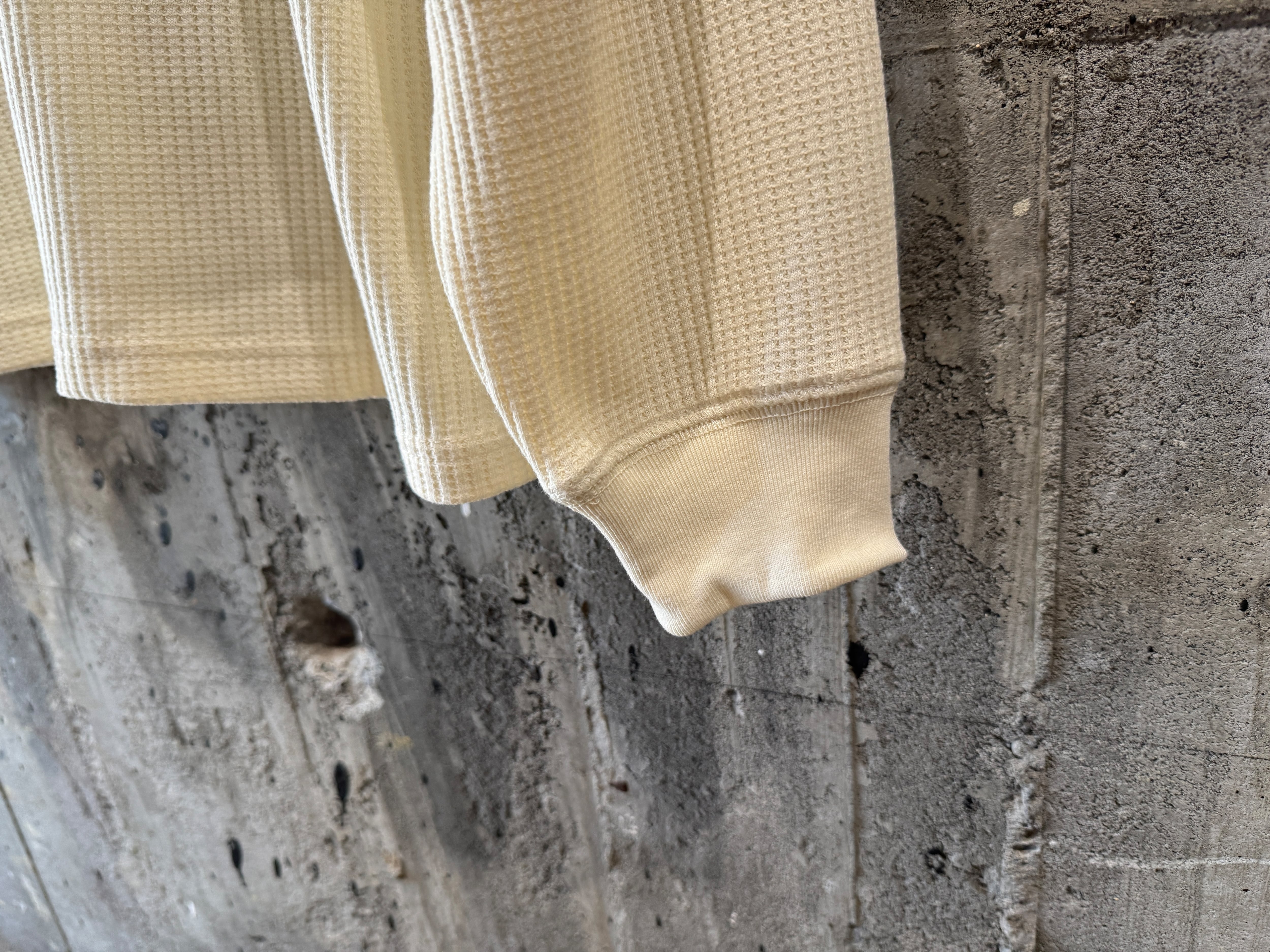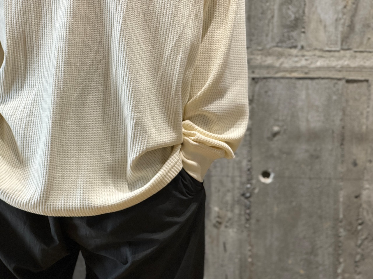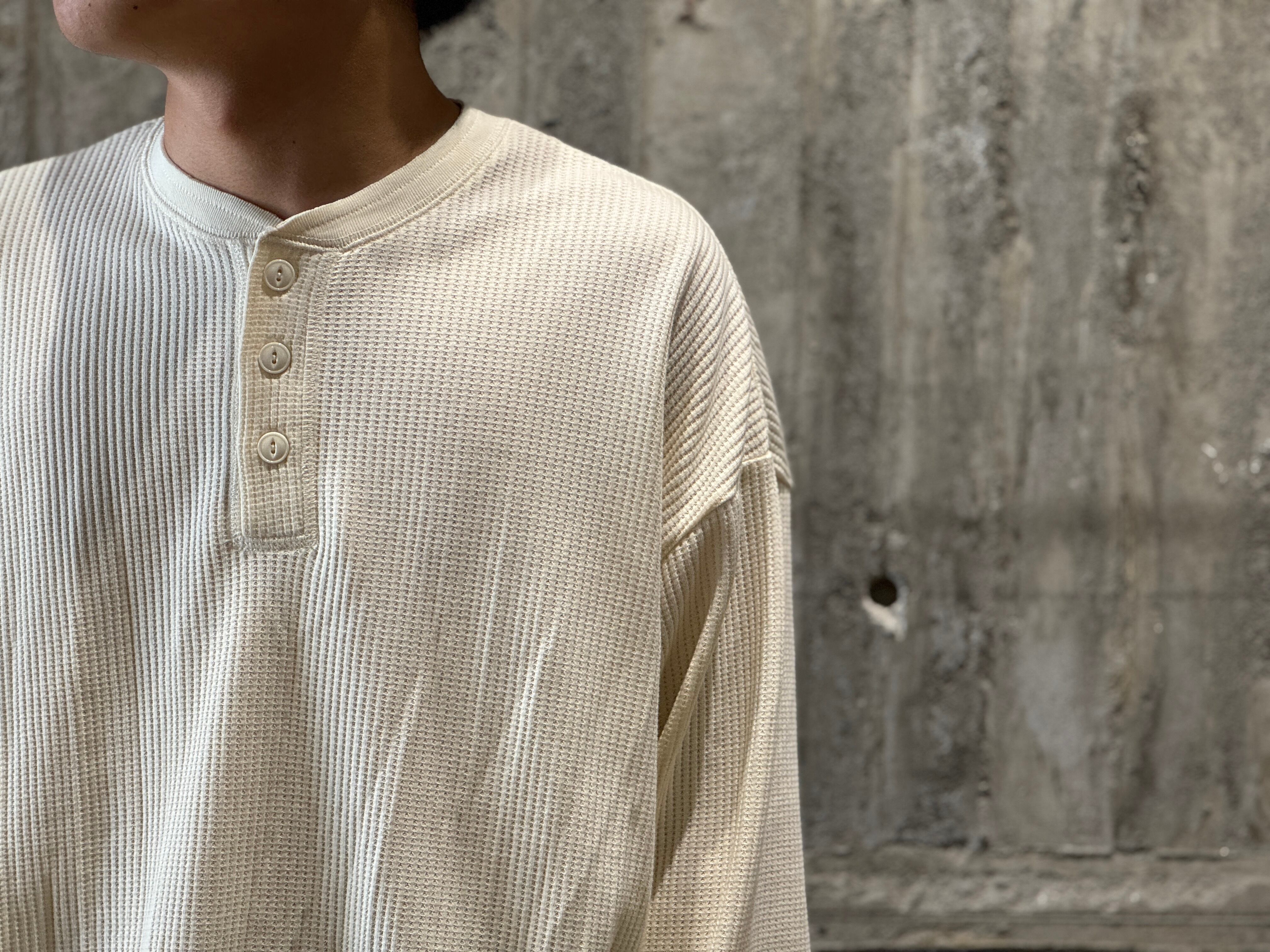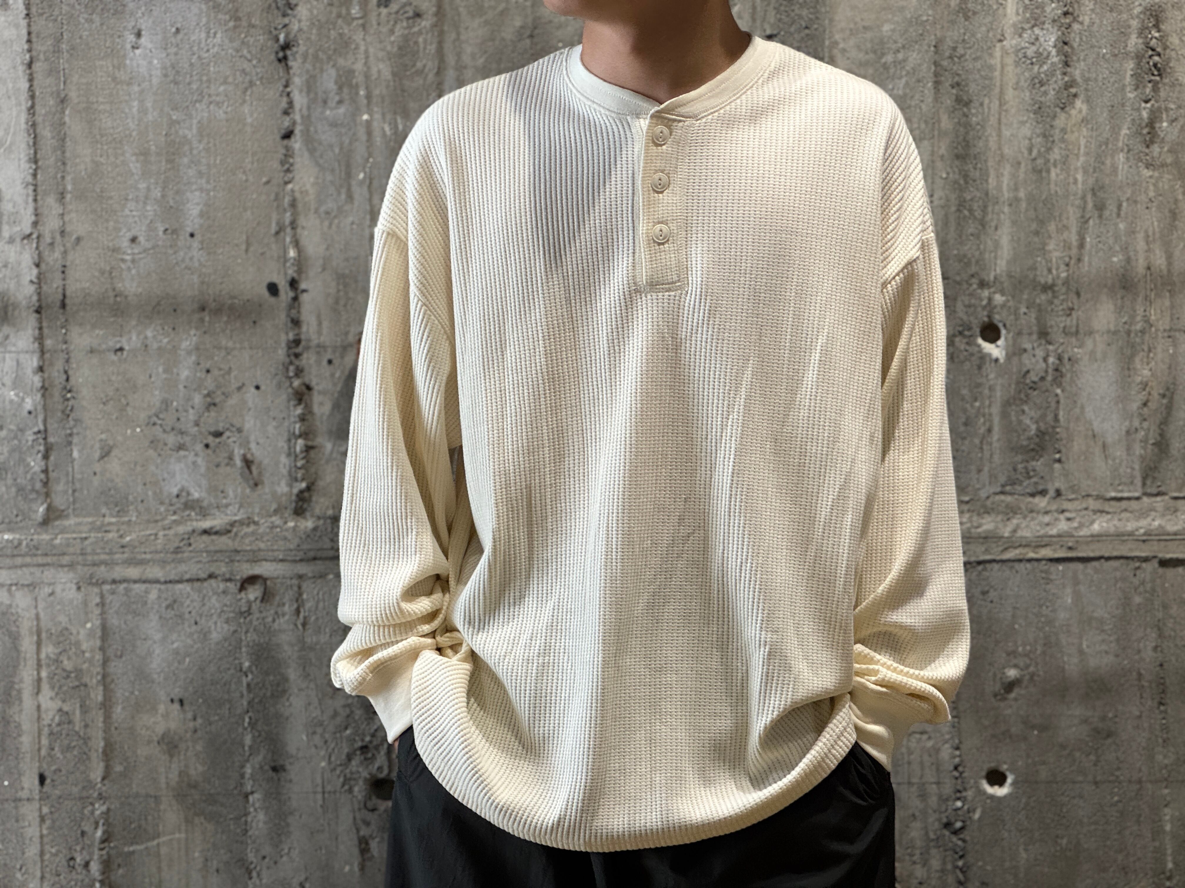 1枚は勿論、インナー使いも楽しめる丁度良いライトなサーマル生地を使用したヘンリーネックロンT。目の粗い生地はニットのような伸縮性と、肌触りの良い生地感です。