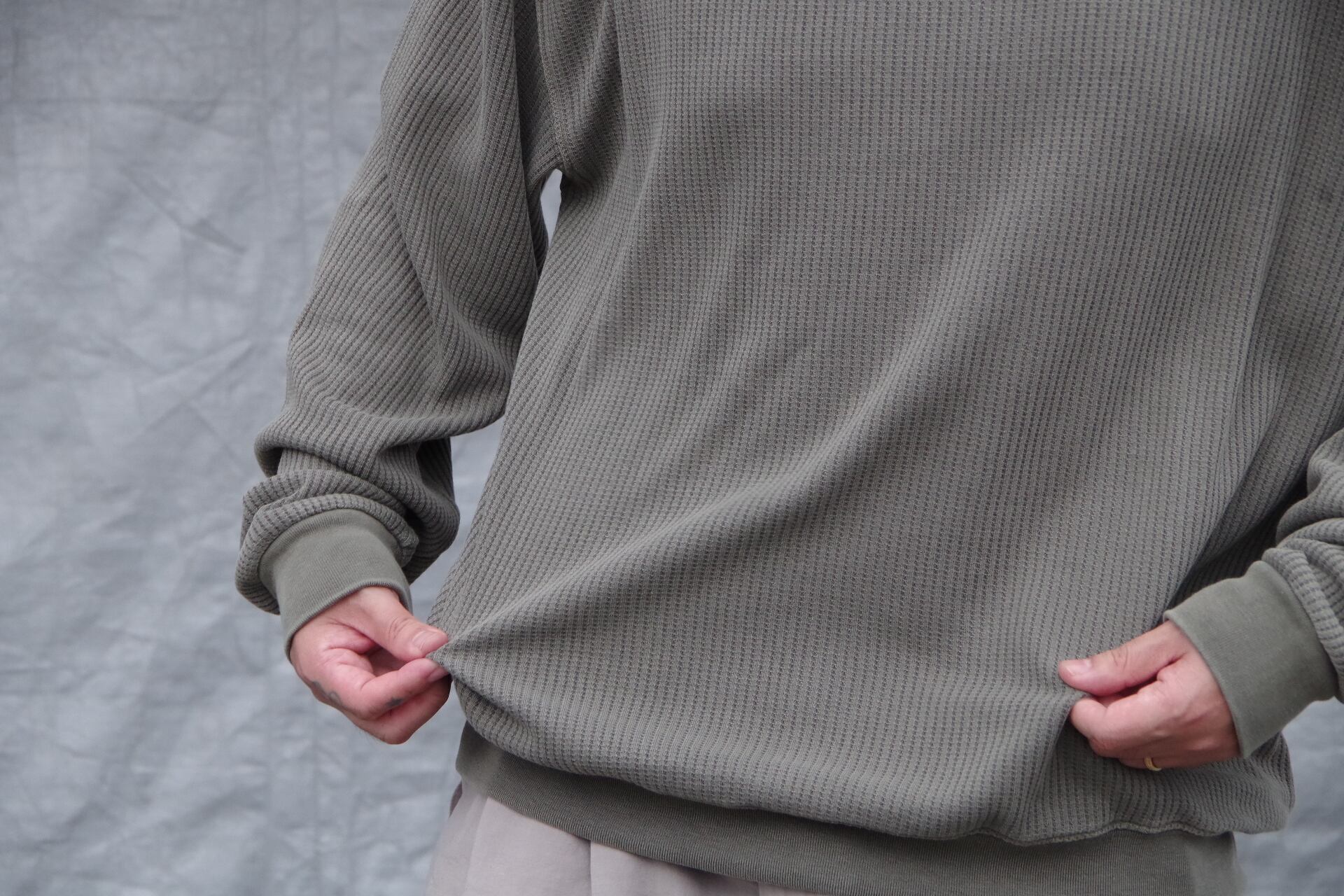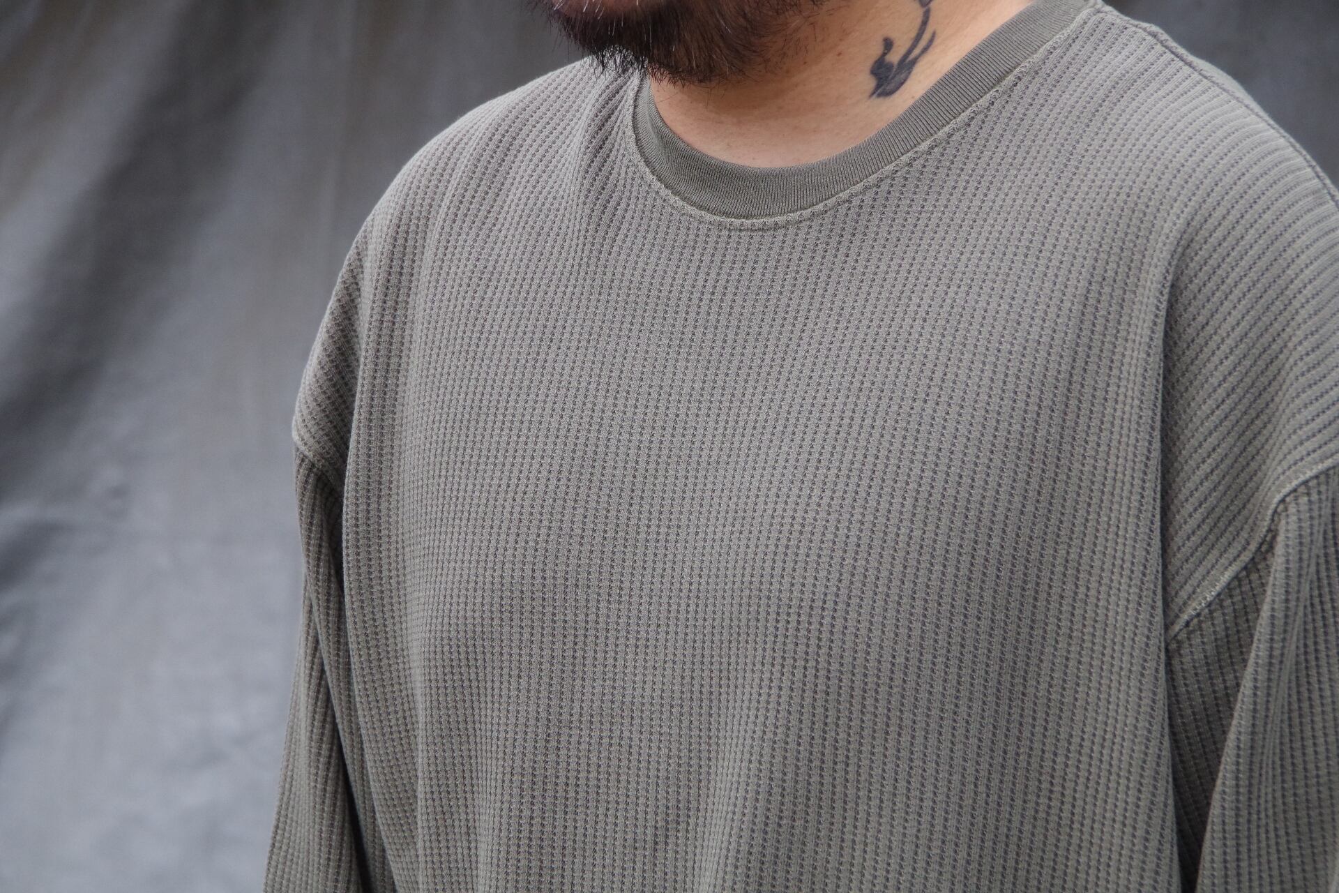 1枚は勿論、インナー使いも楽しめる丁度良いライトなサーマル生地を使用したクルーネックロンT。コチラは袖口と裾にリブ仕様のスウェットスタイル。目の粗い生地はニットのような伸縮性と、肌触りの良い生地感です。