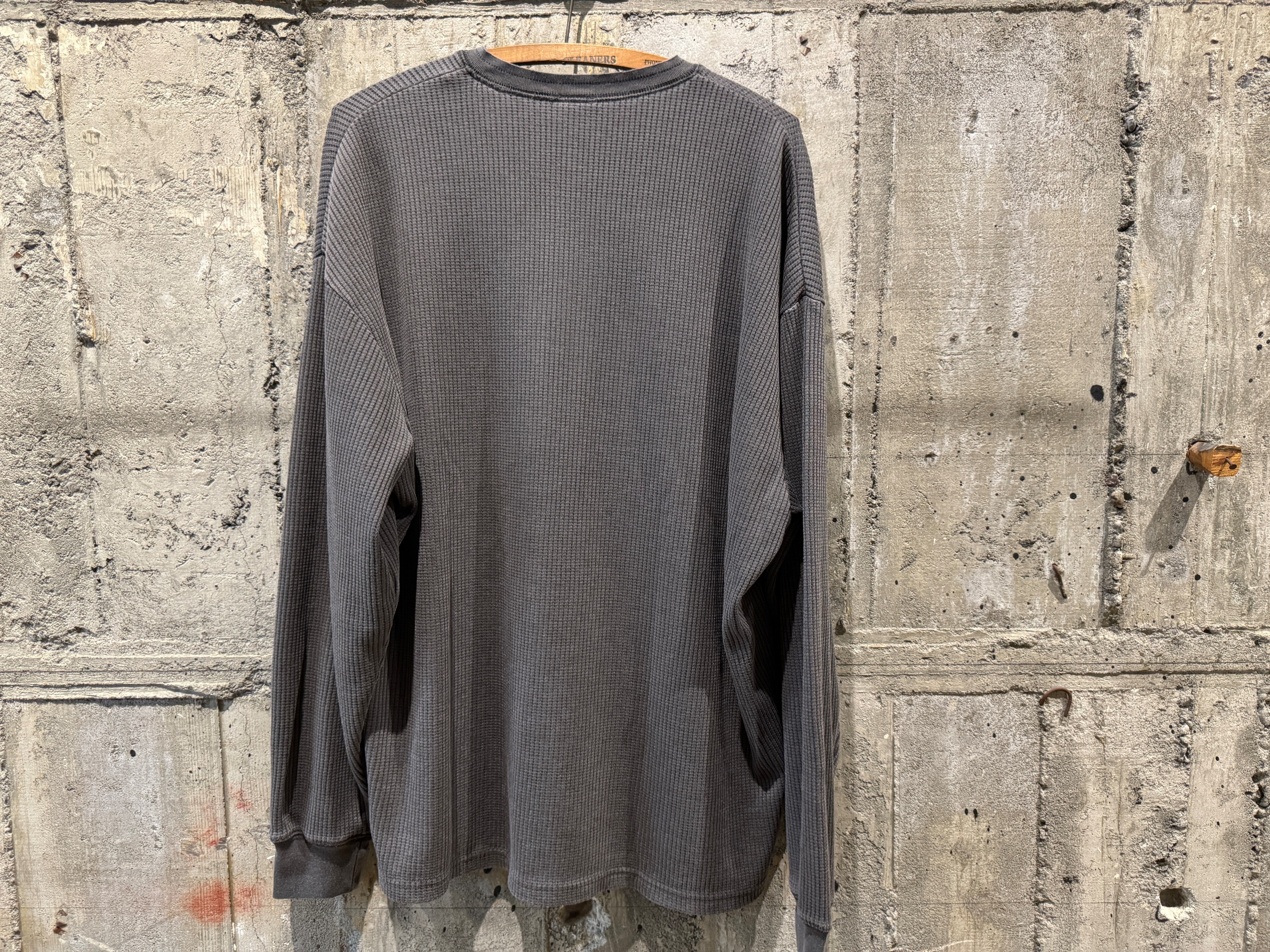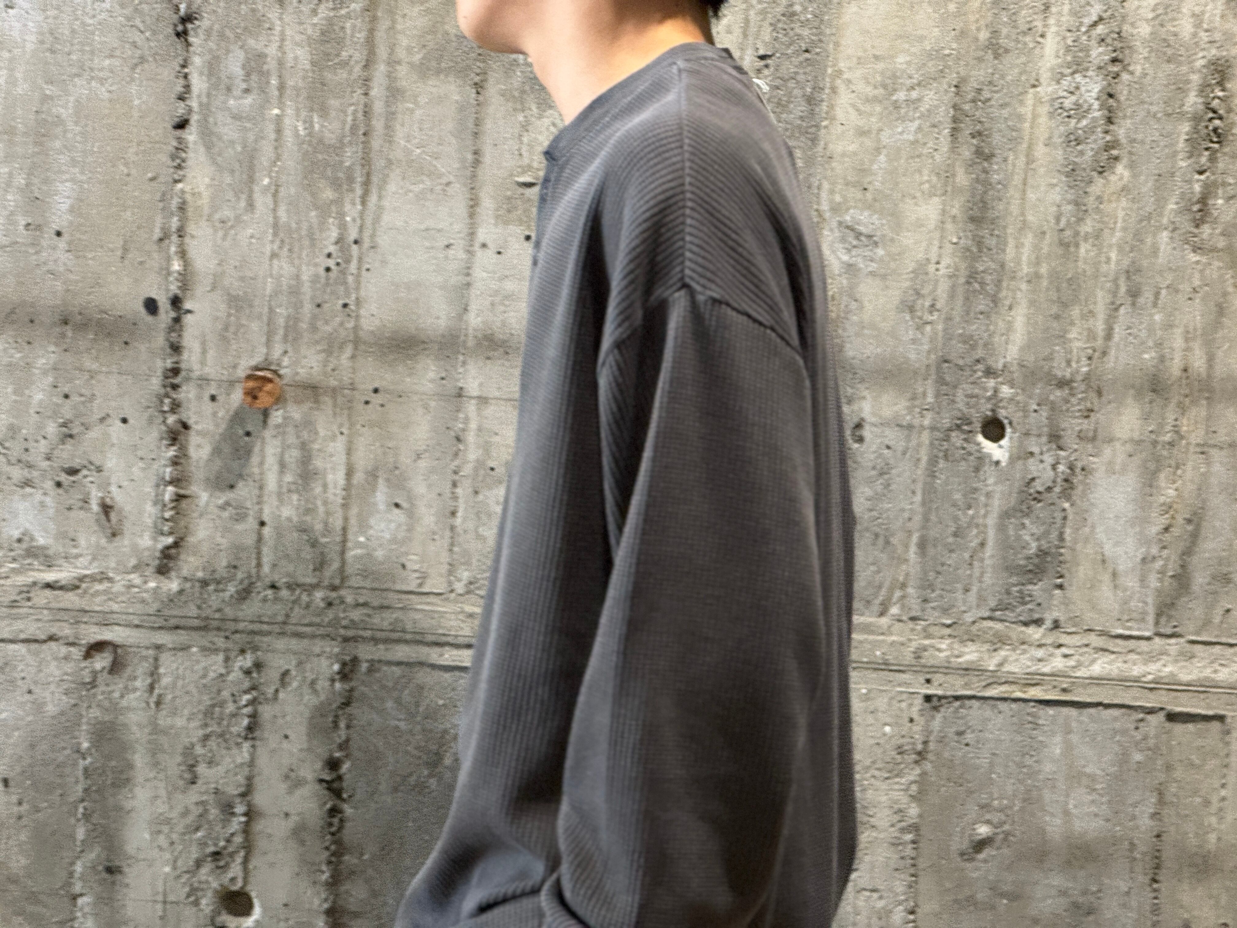 1枚は勿論、インナー使いも楽しめる丁度良いライトなサーマル生地を使用したヘンリーネックロンT。目の粗い生地はニットのような伸縮性と、肌触りの良い生地感です。