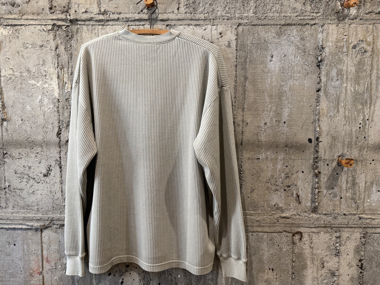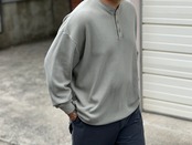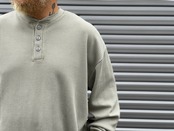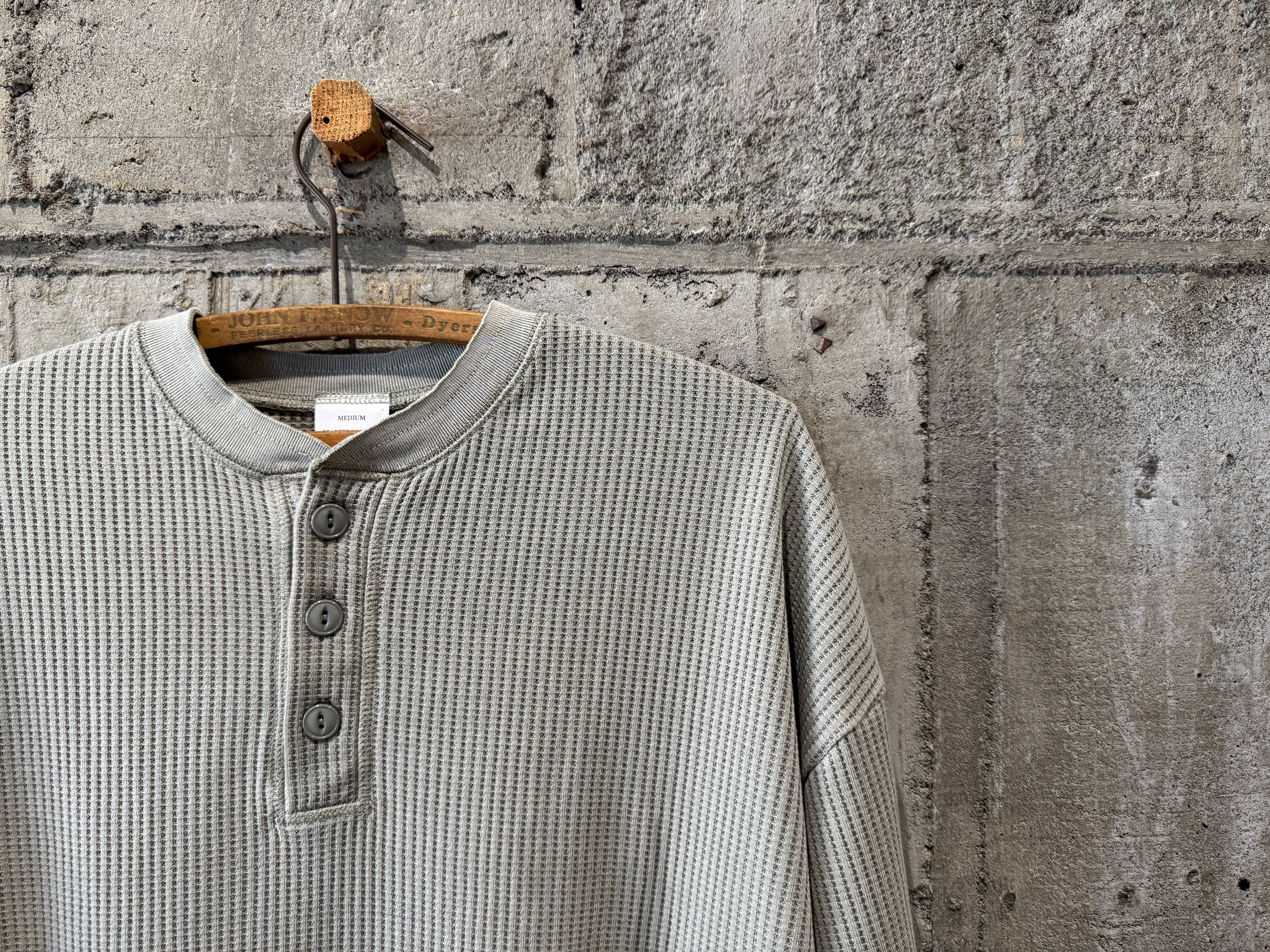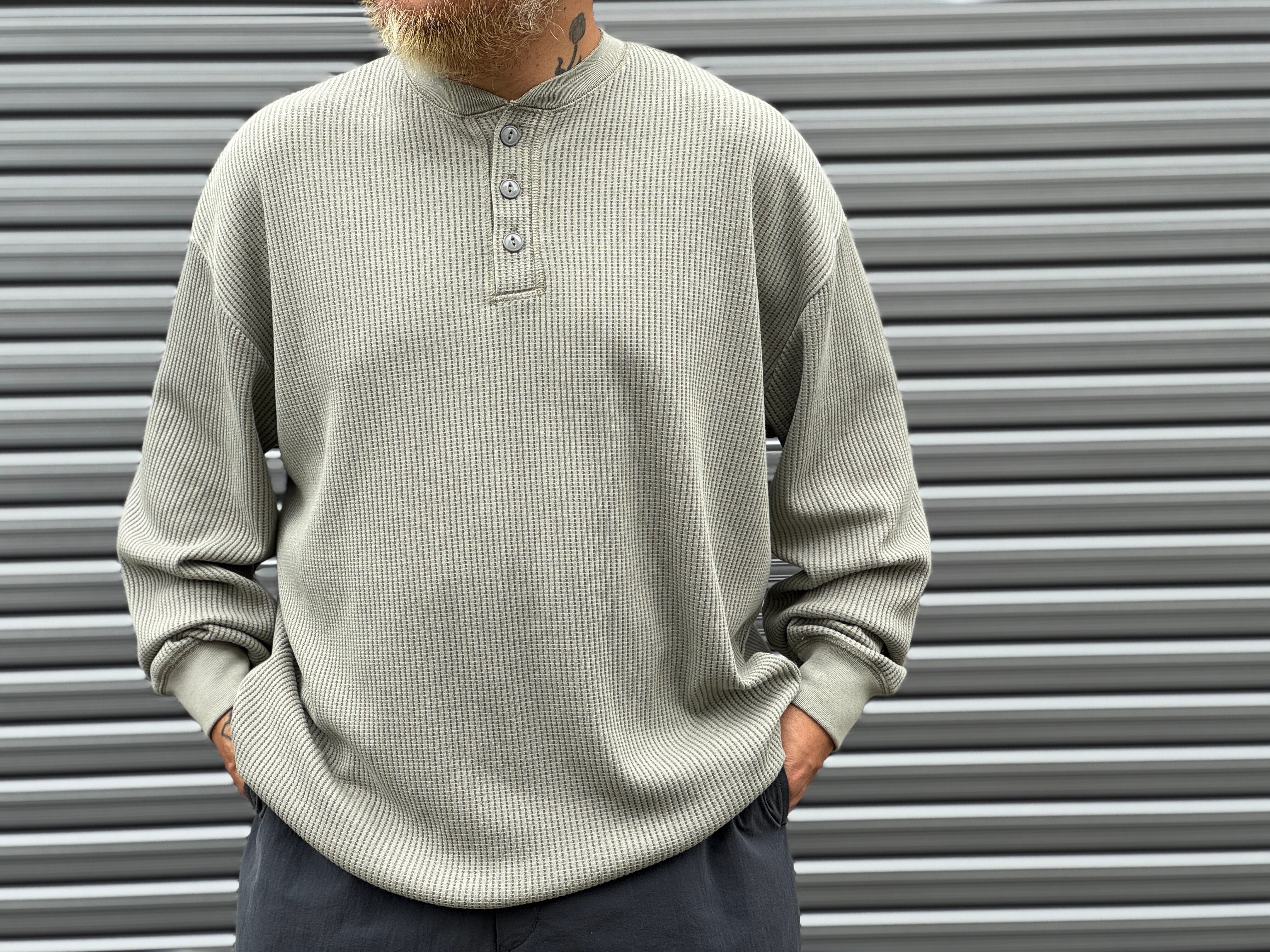 1枚は勿論、インナー使いも楽しめる丁度良いライトなサーマル生地を使用したヘンリーネックロンT。目の粗い生地はニットのような伸縮性と、肌触りの良い生地感です。
