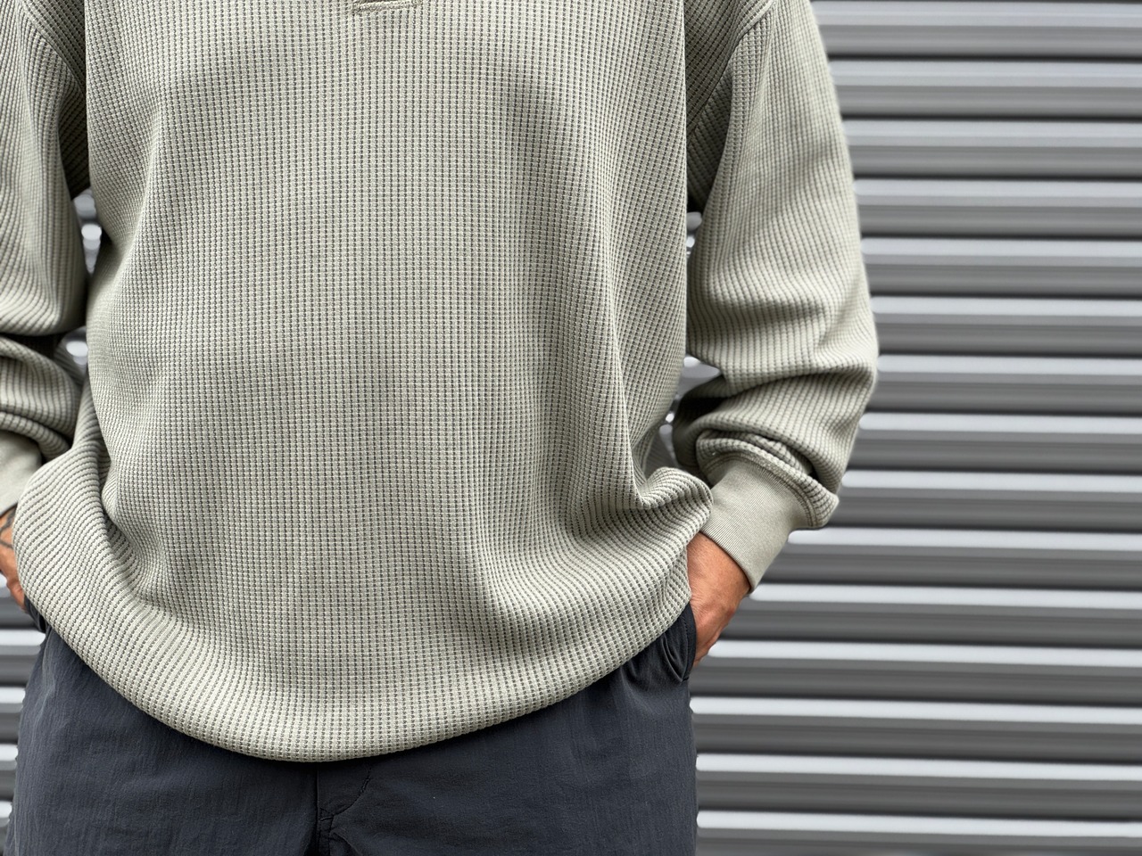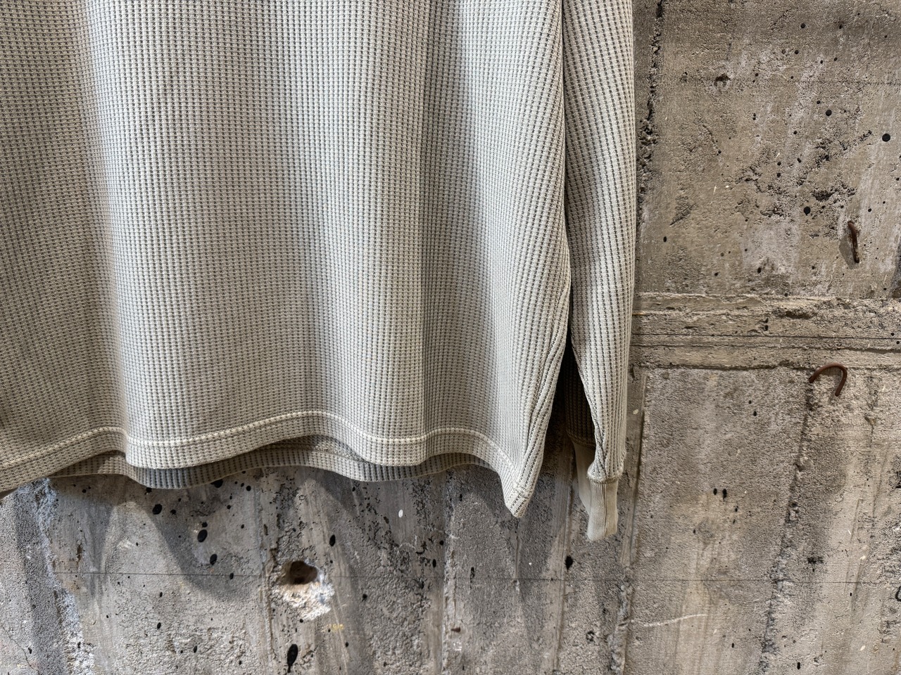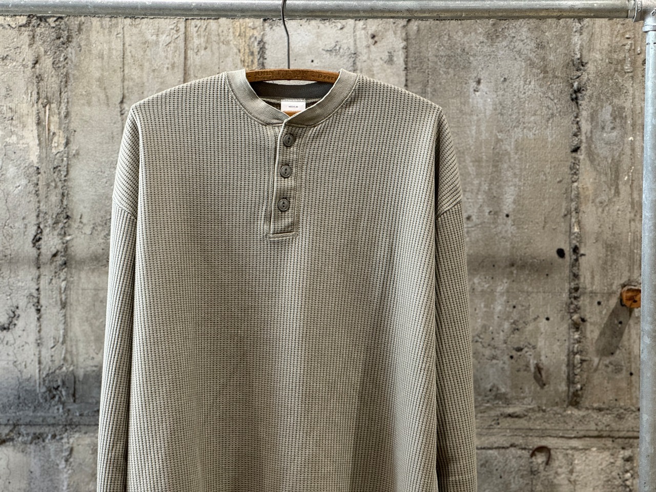 1枚は勿論、インナー使いも楽しめる丁度良いライトなサーマル生地を使用したヘンリーネックロンT。目の粗い生地はニットのような伸縮性と、肌触りの良い生地感です。