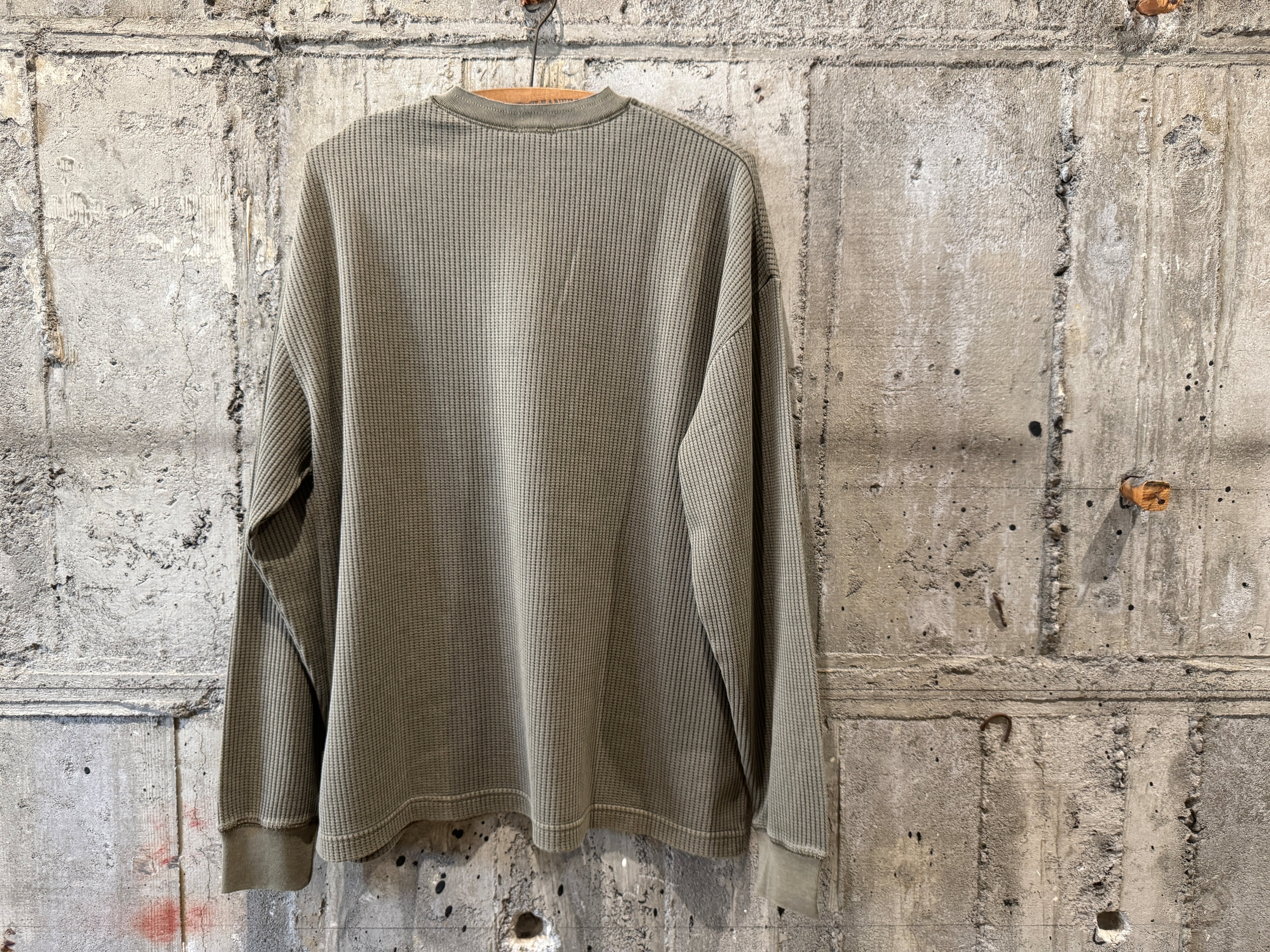 1枚は勿論、インナー使いも楽しめる丁度良いライトなサーマル生地を使用したヘンリーネックロンT。目の粗い生地はニットのような伸縮性と、肌触りの良い生地感です。