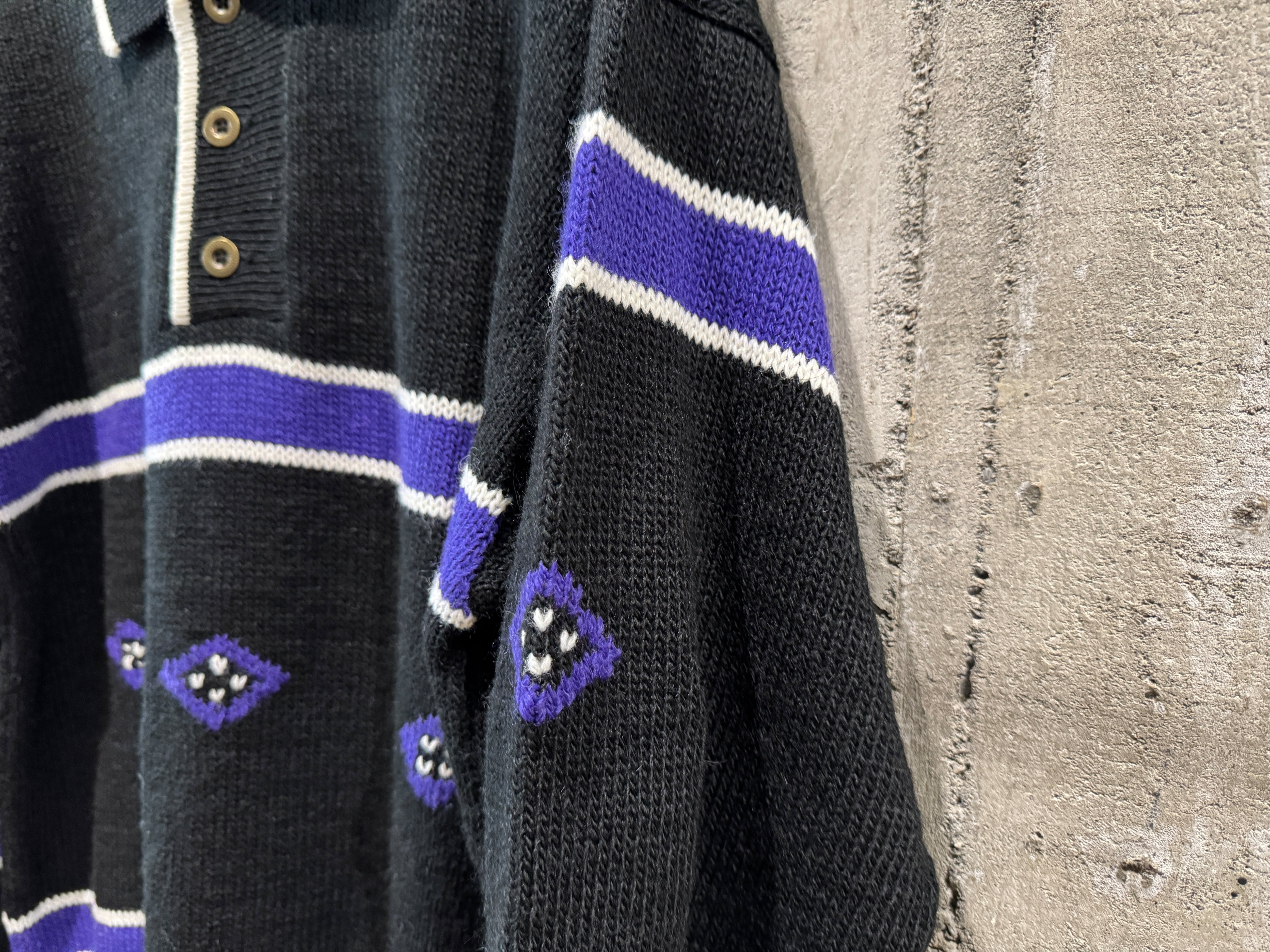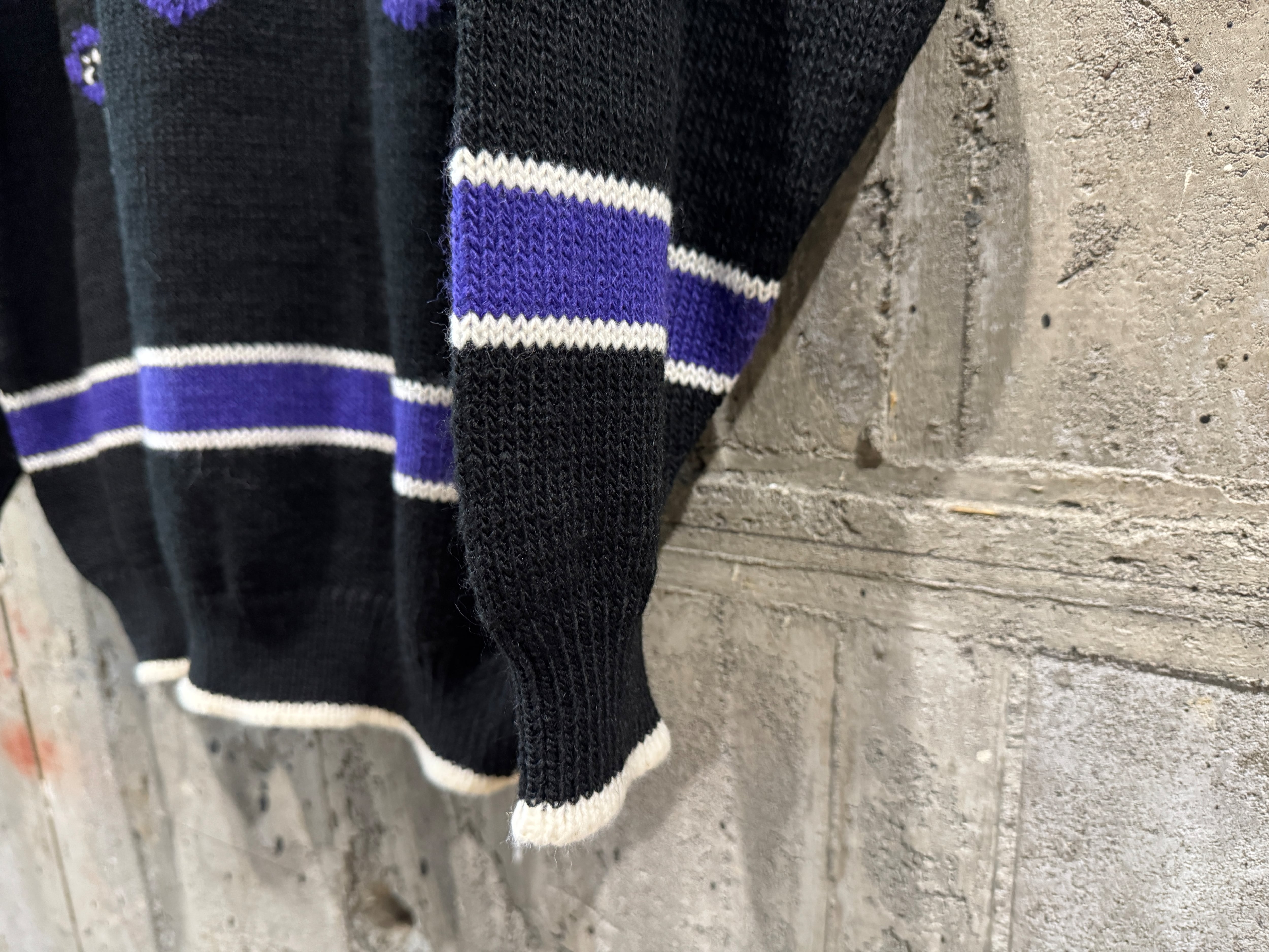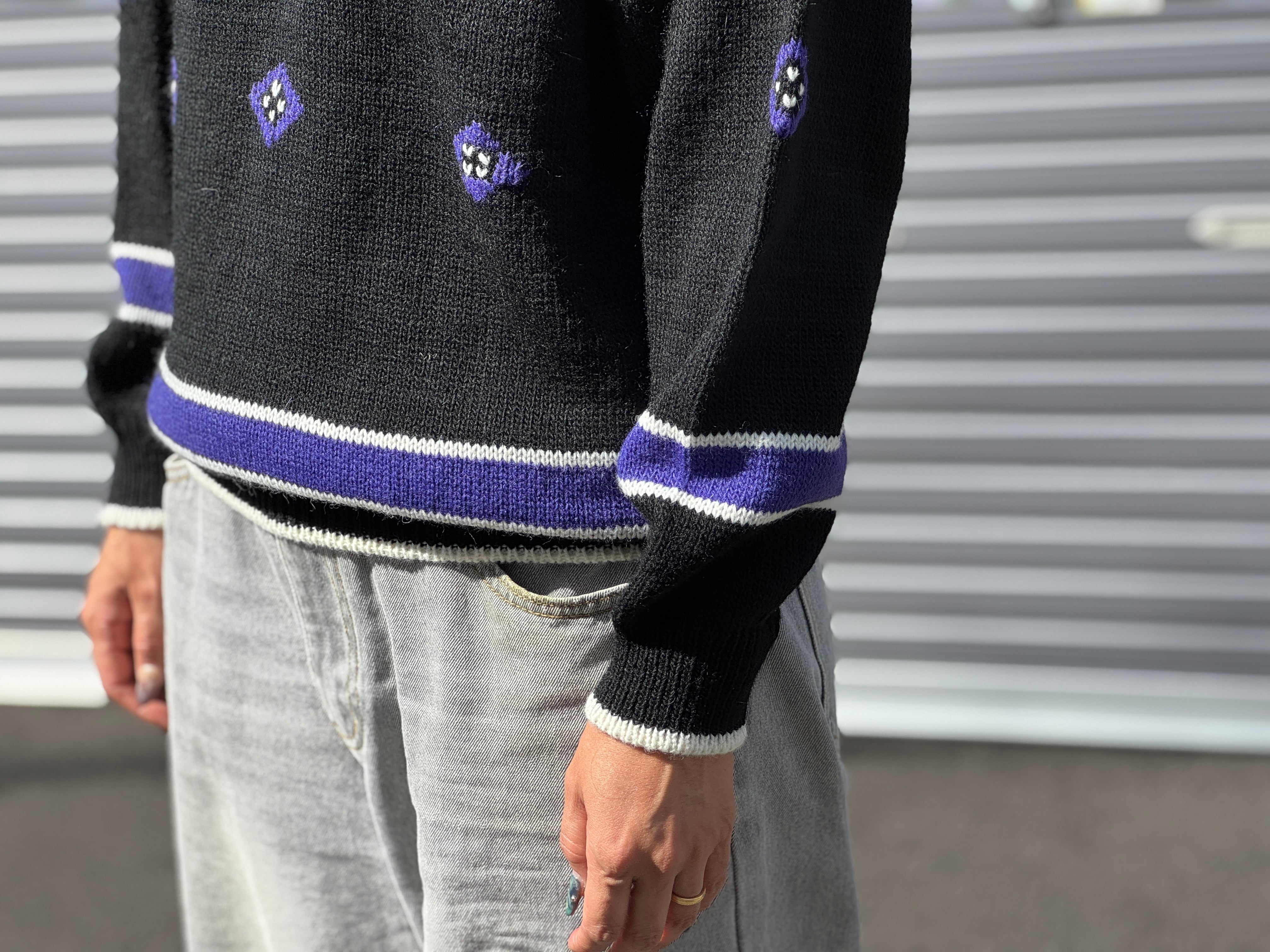 コチラはリクエストの多いブラックカラー、ウール×アクリルの混紡素材。中肉厚。ラインやハンドステッチのようなパターンが施されています。