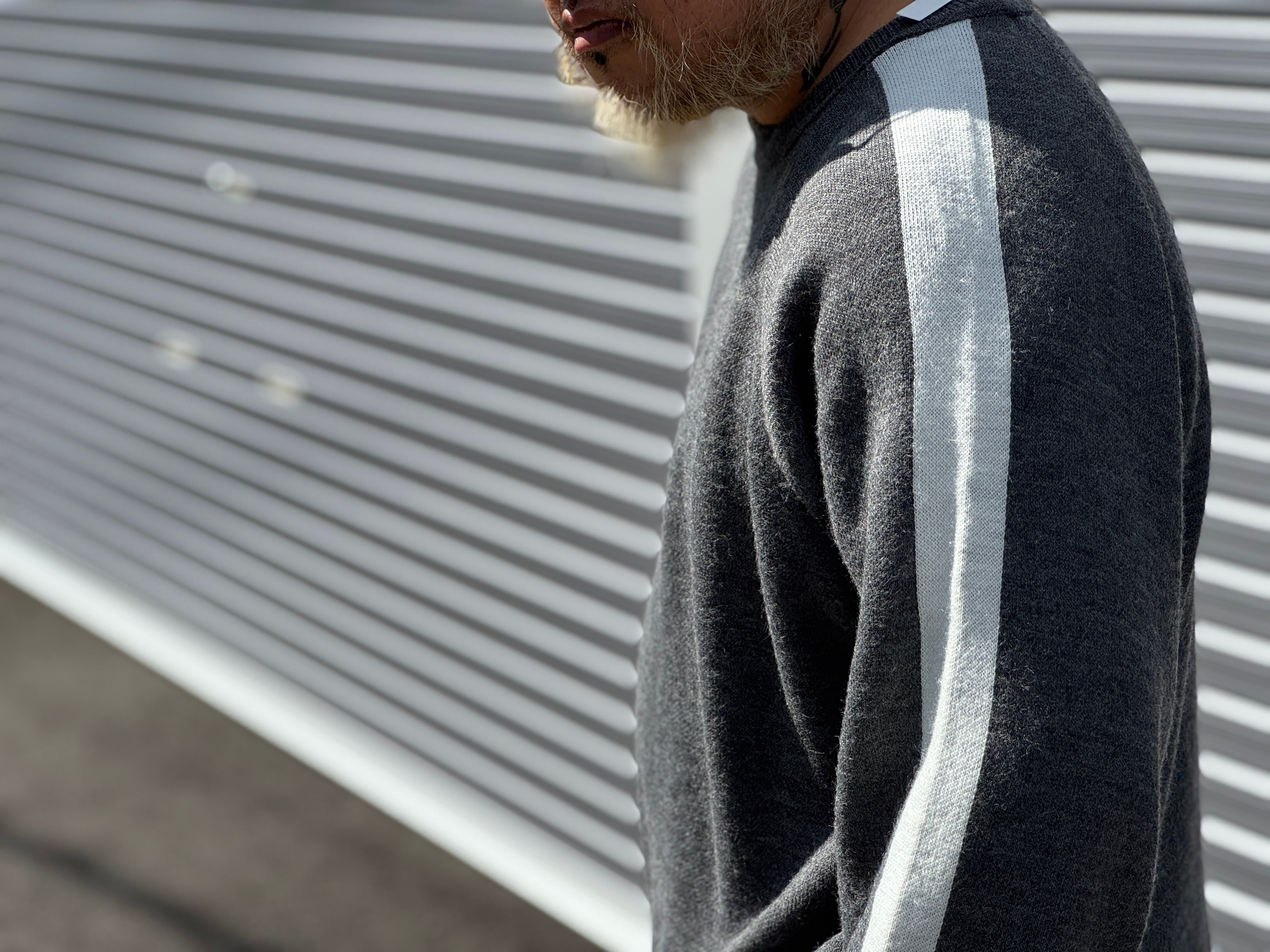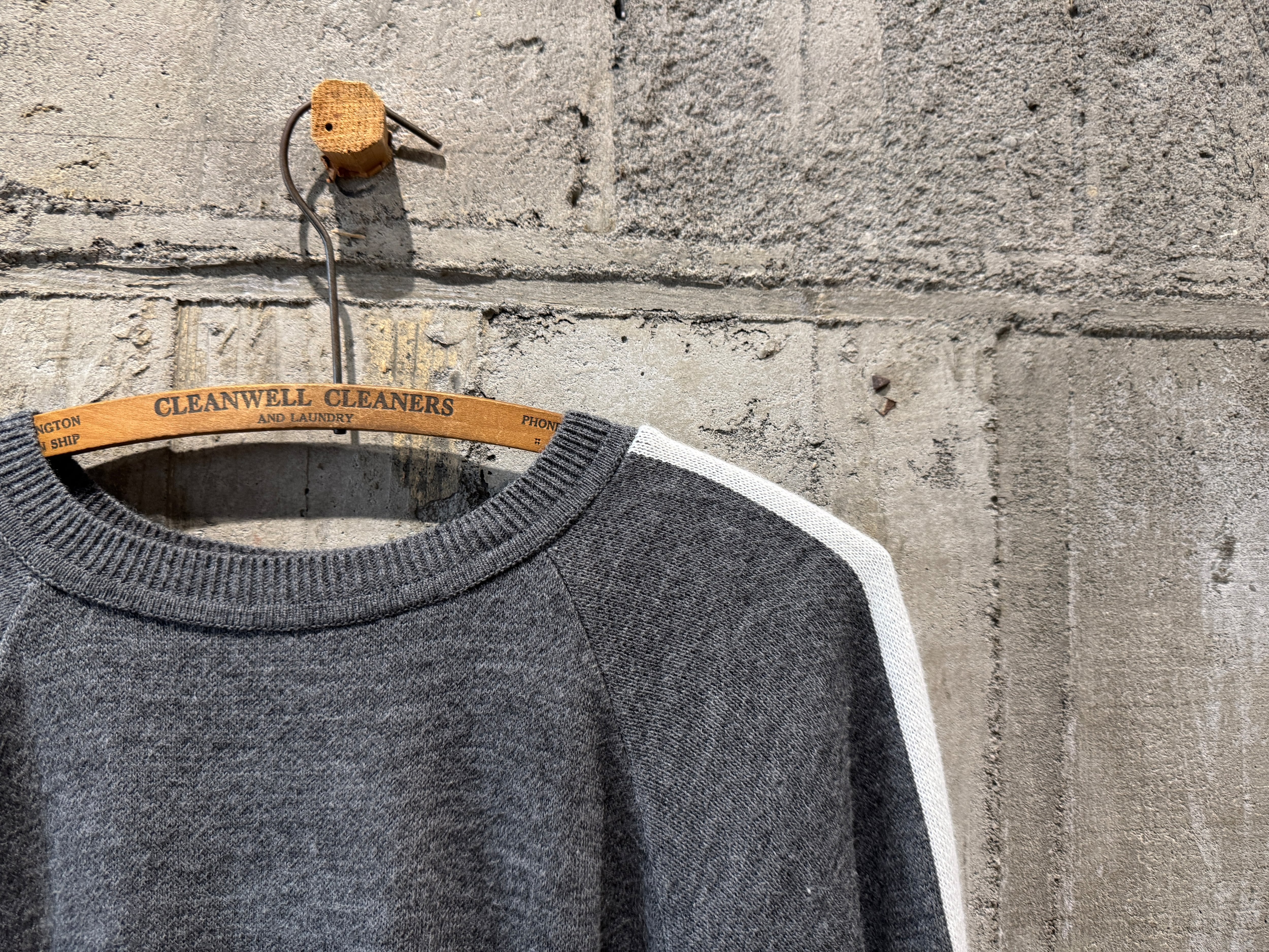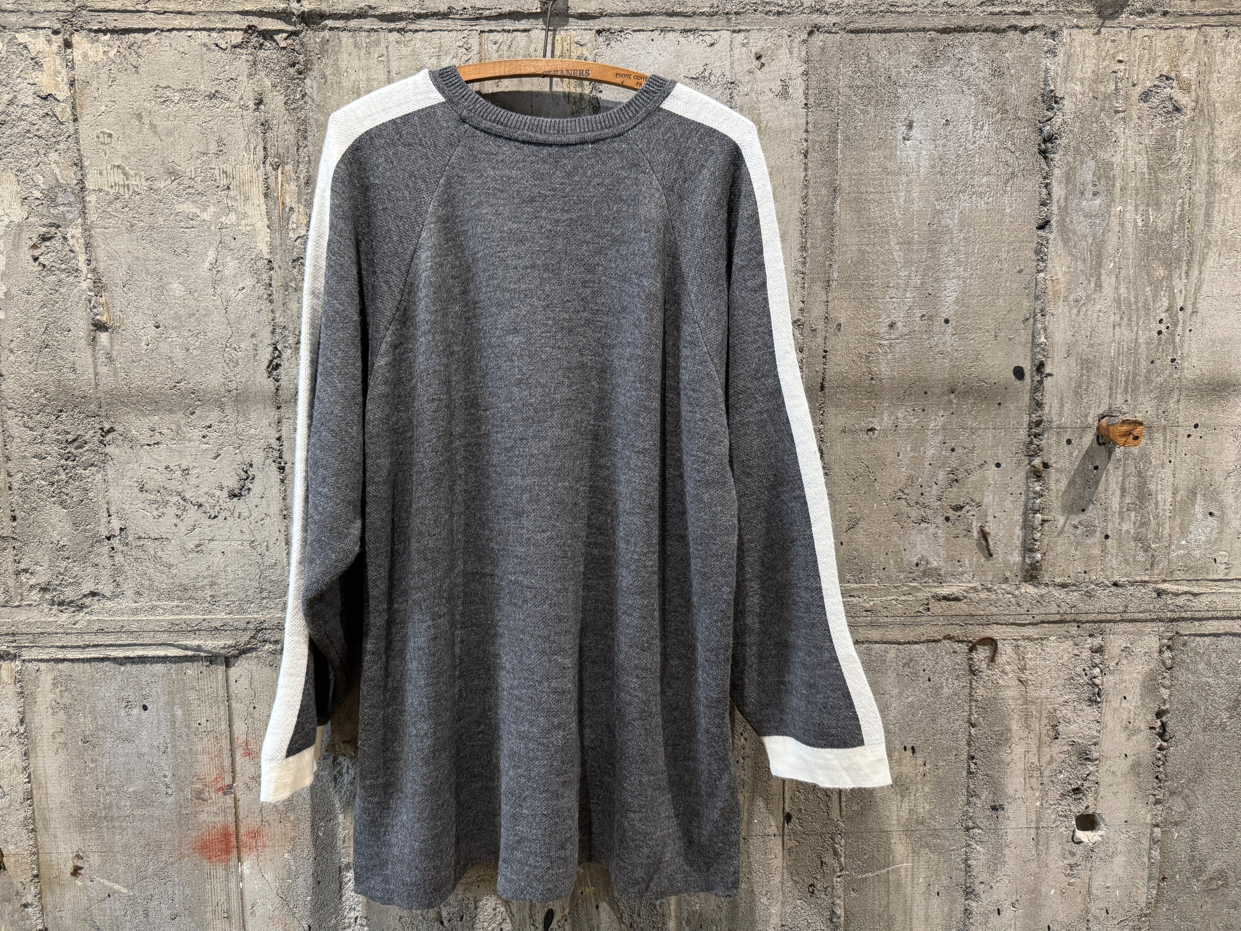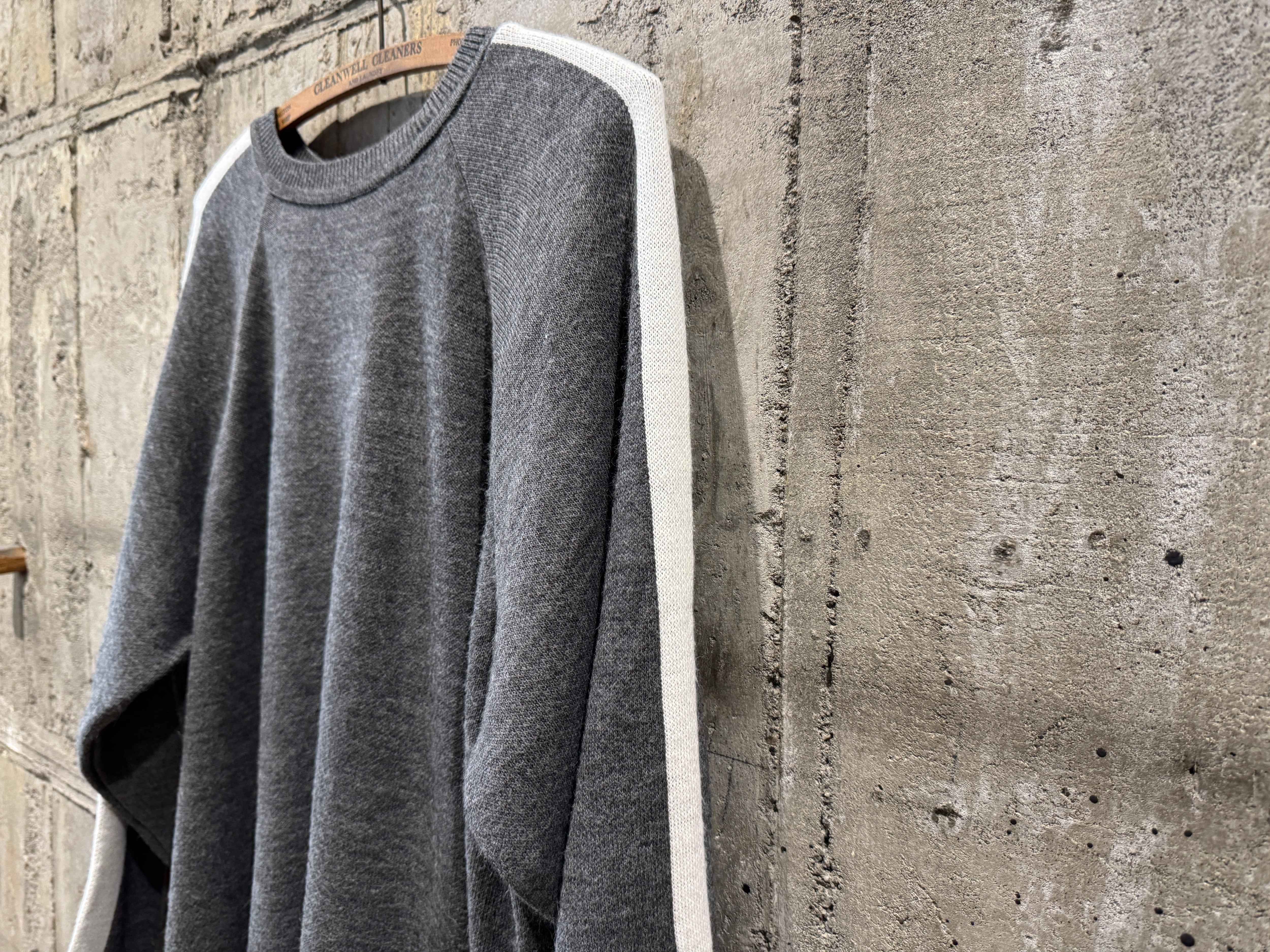 杢グレーカラー、ラグランスリーブタイプで程よくロング丈でワイドなシルエット。肩から袖へのラインデザインが特徴的。