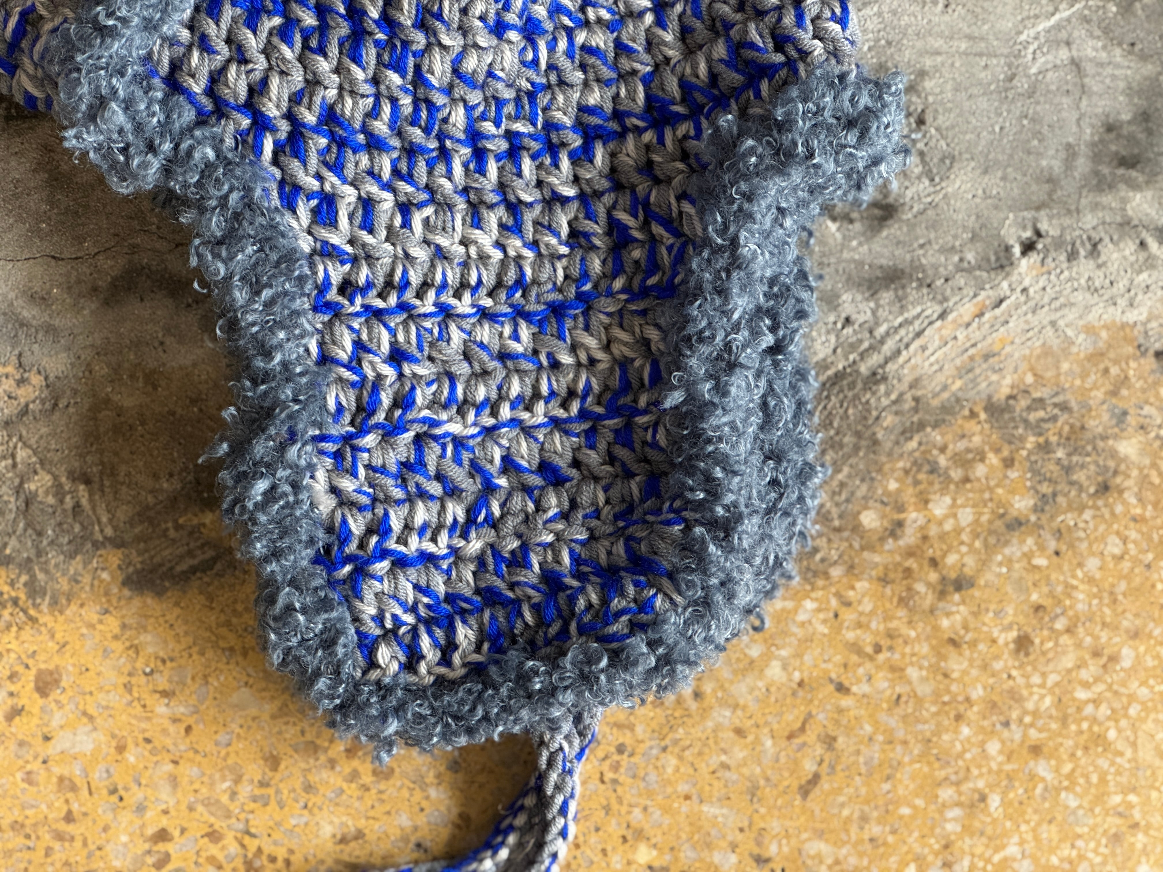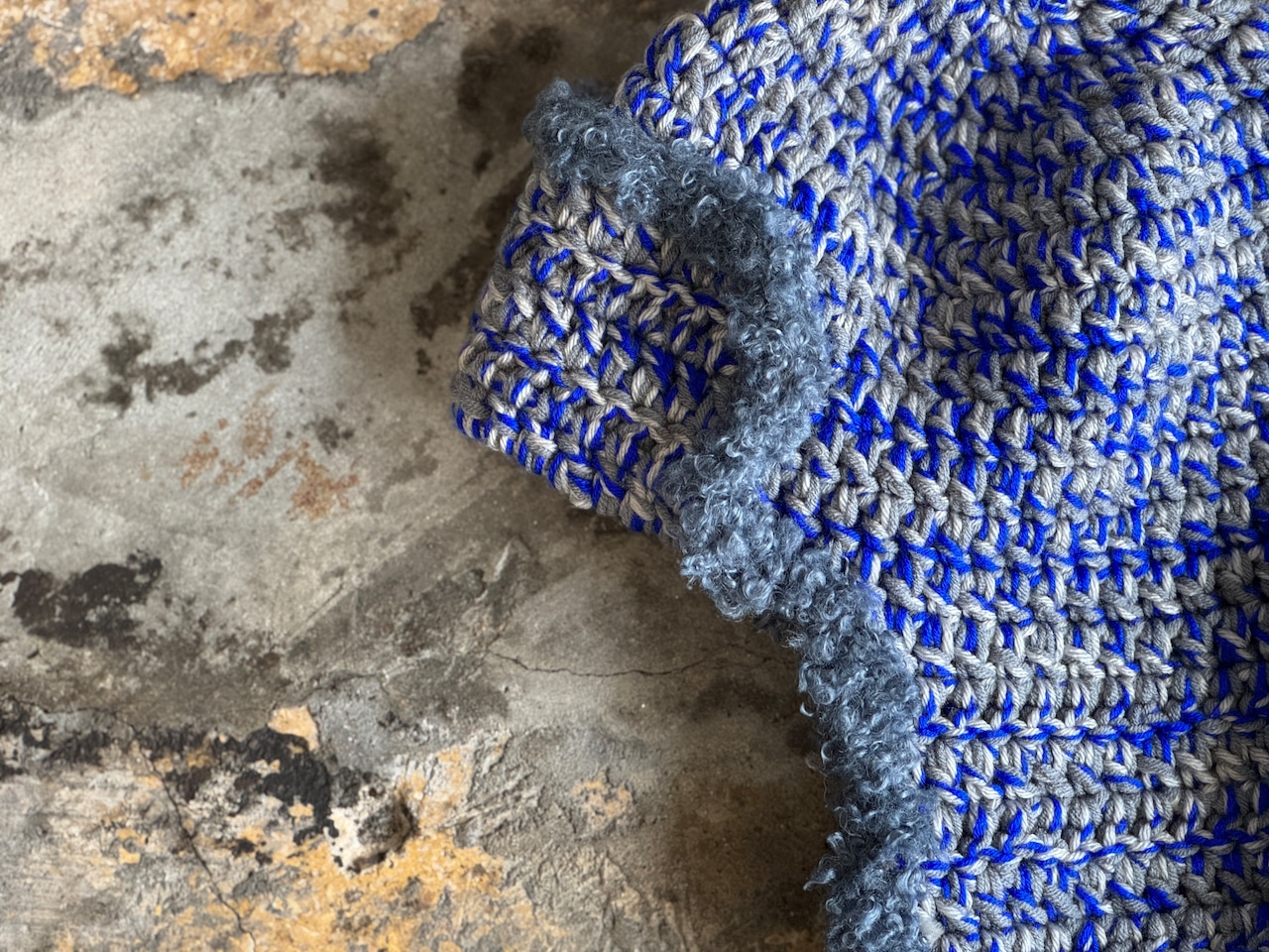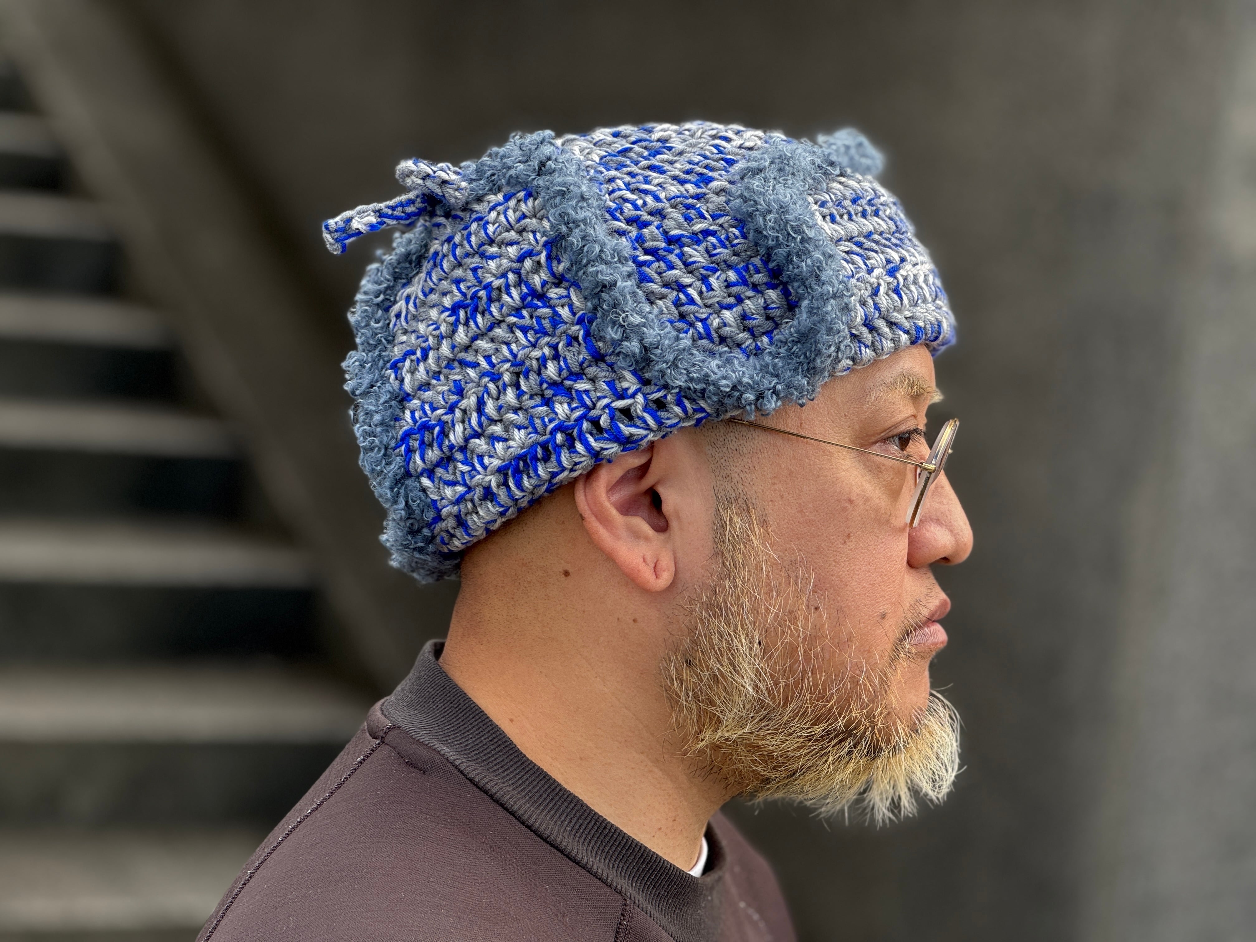 ニット素材は珍しいのではないでしょうか。肌触りが良く被り心地の良いアクリルウールを使用。のブルー×グレー×ライトグレーの絶妙なミックスのカラー。ブークレ素材のパイピングもポイント。