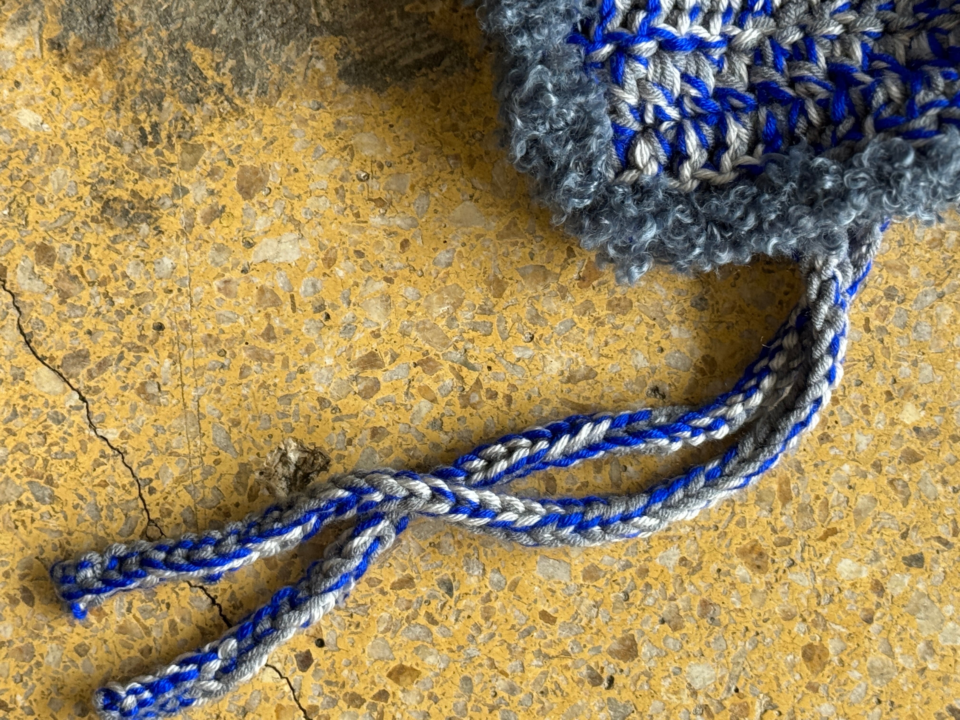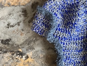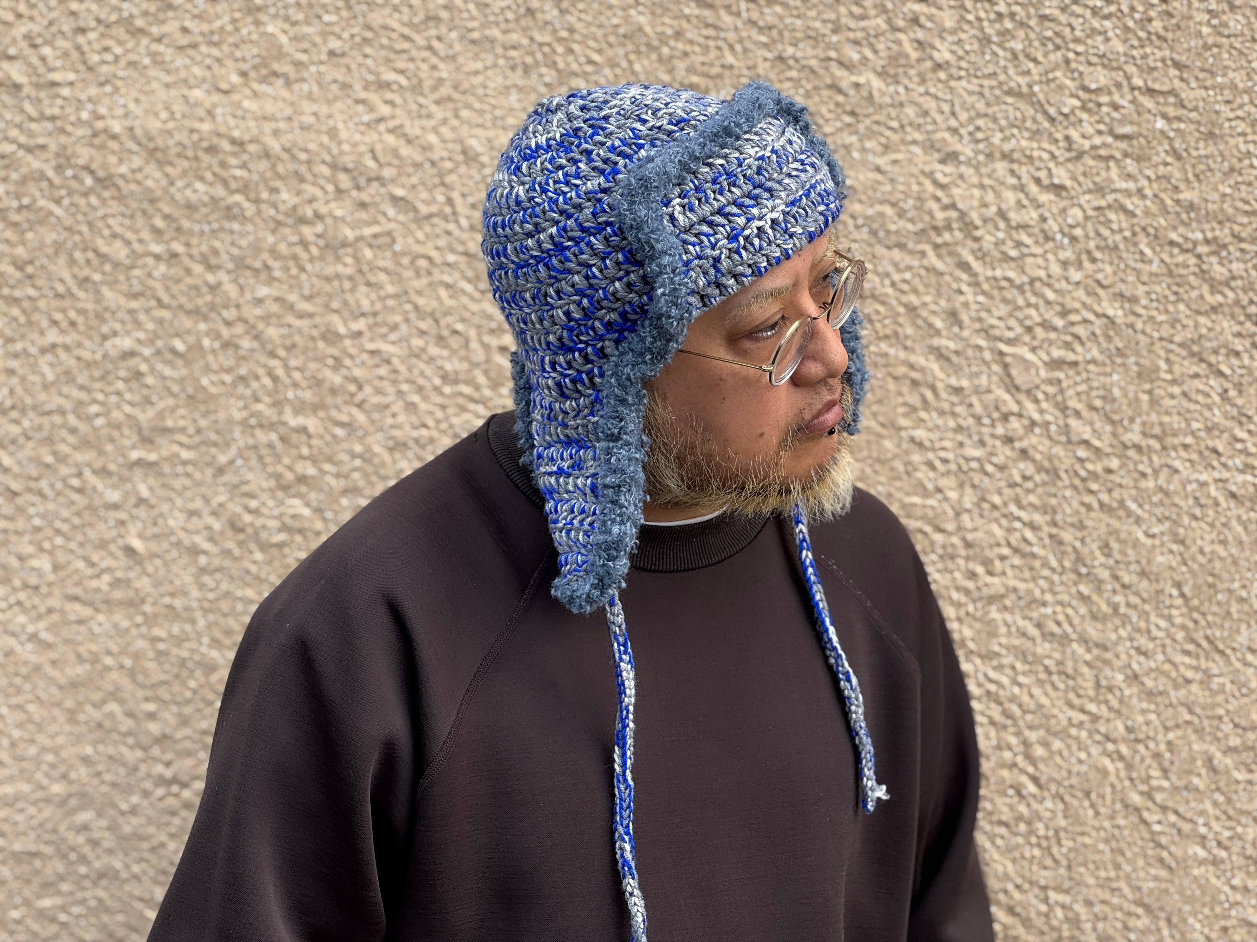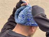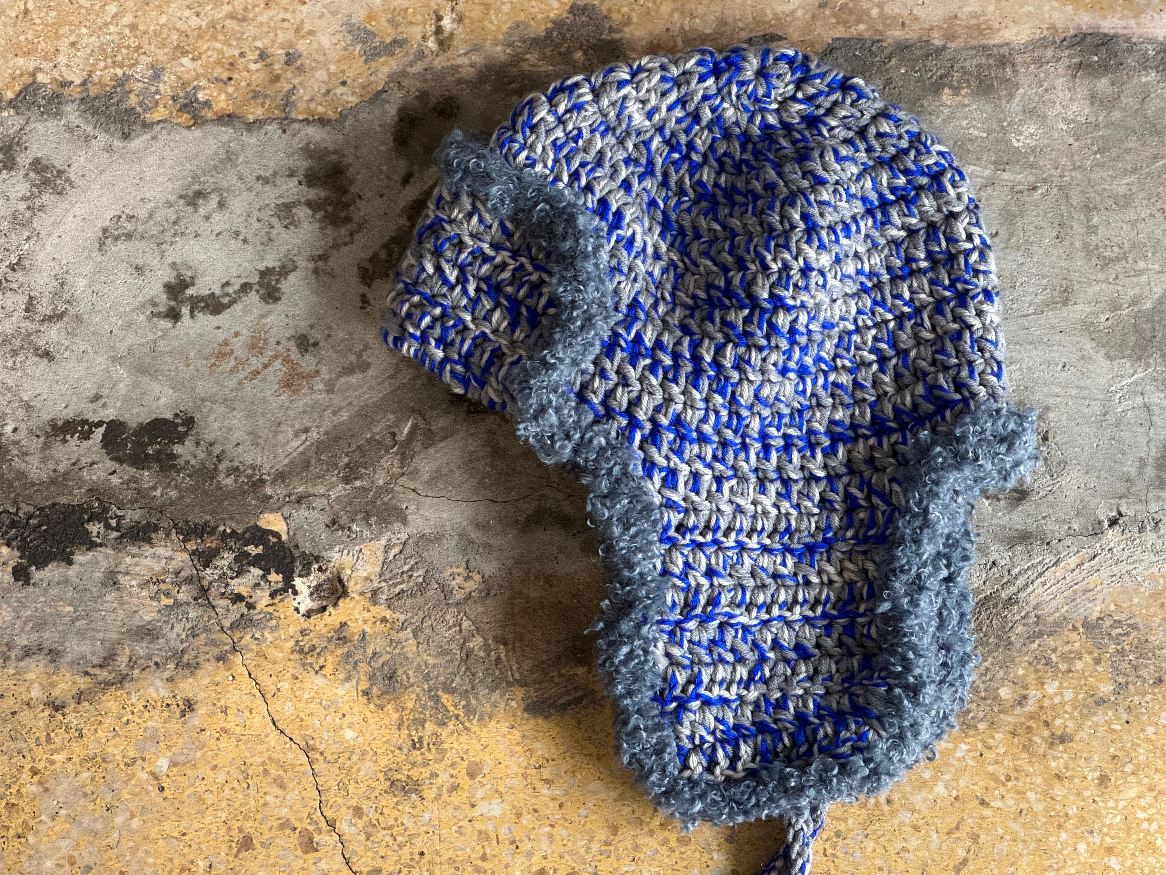 ニット素材は珍しいのではないでしょうか。肌触りが良く被り心地の良いアクリルウールを使用。のブルー×グレー×ライトグレーの絶妙なミックスのカラー。ブークレ素材のパイピングもポイント。