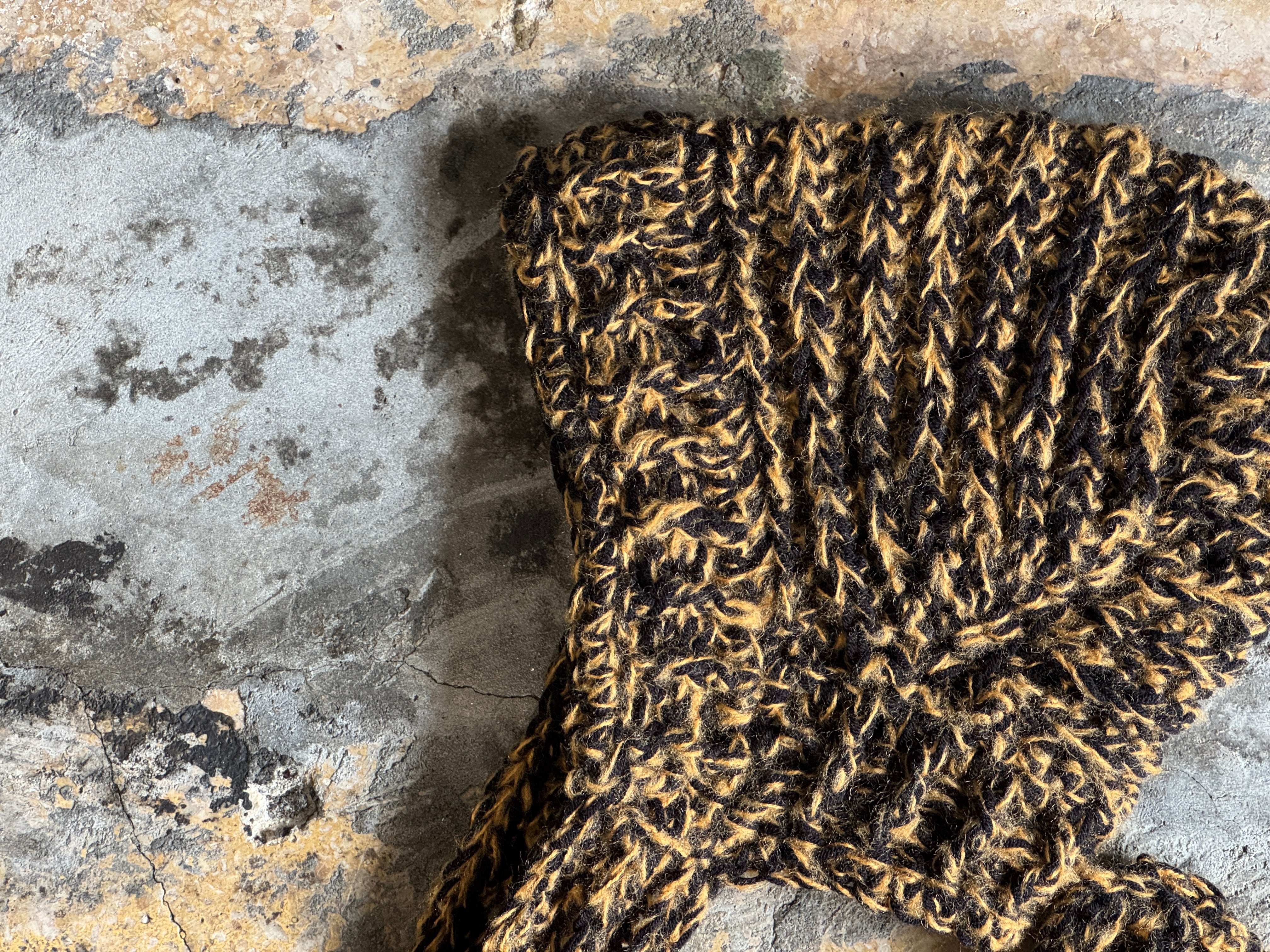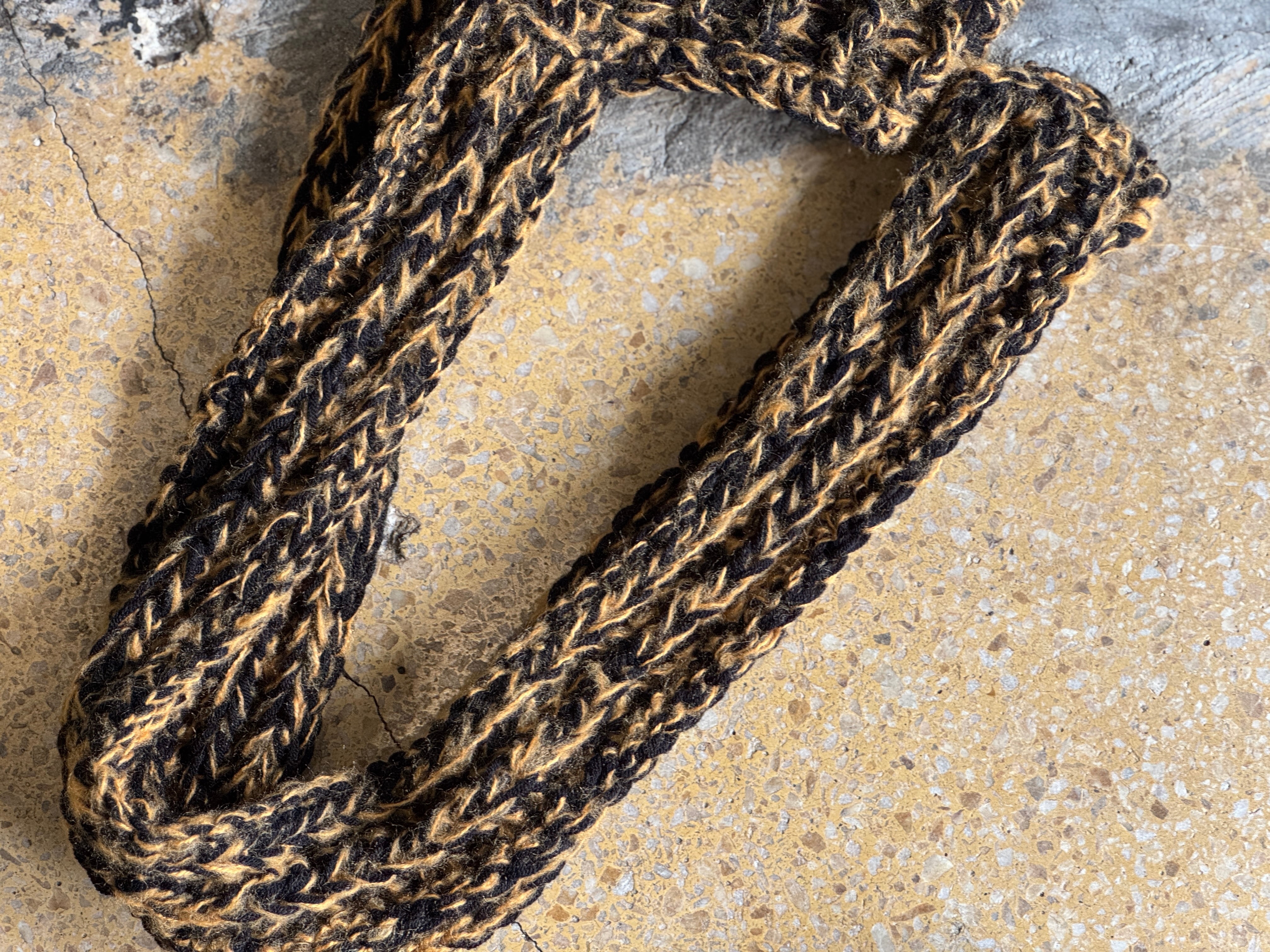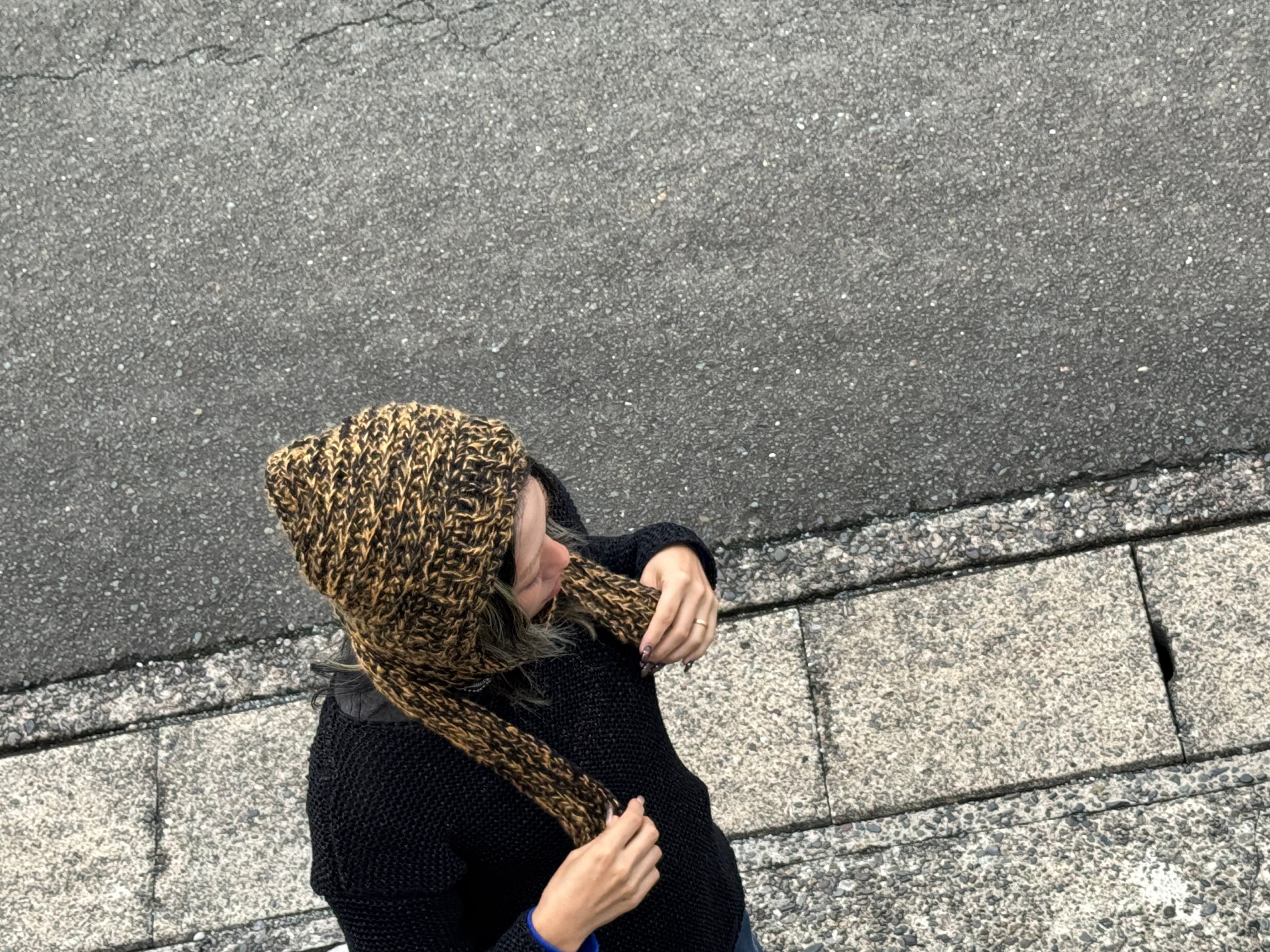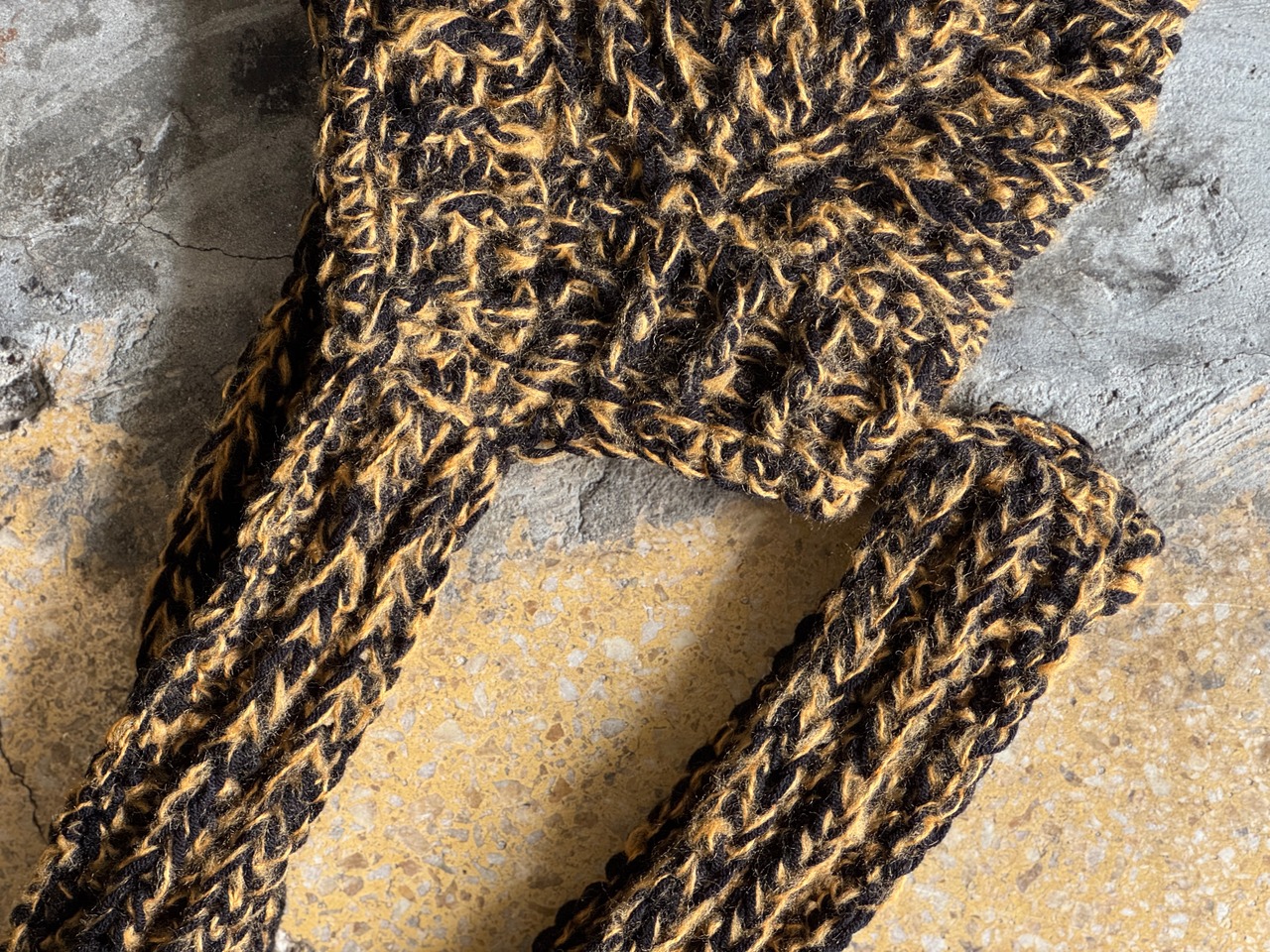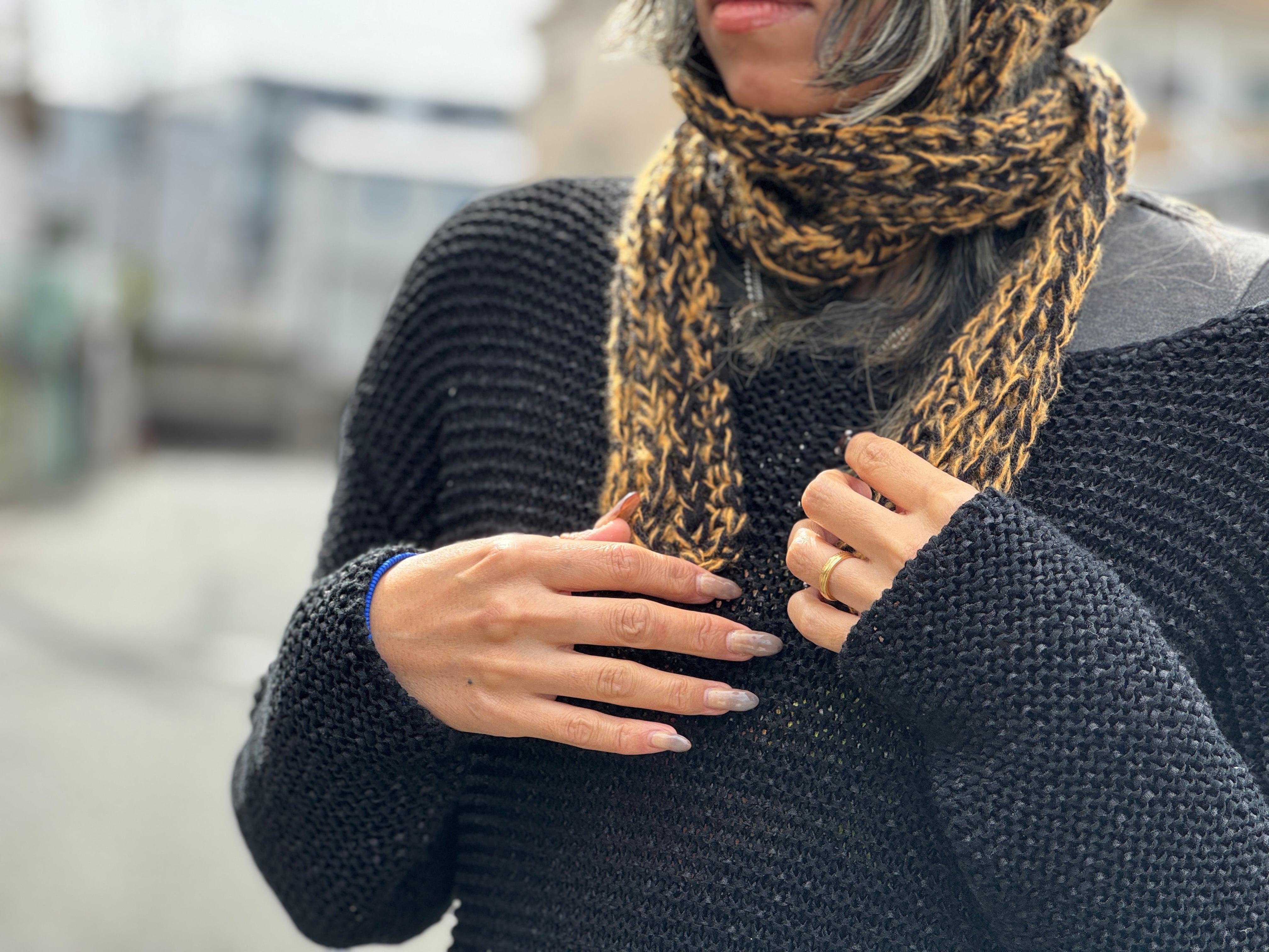 肌触りが良く、被り心地も良いアクリルウールを使用。ブラック×タンの絶妙なミックスのカラー。コード部分は垂らすも良し、マフラー感覚で巻くのも良しの2way仕様です。