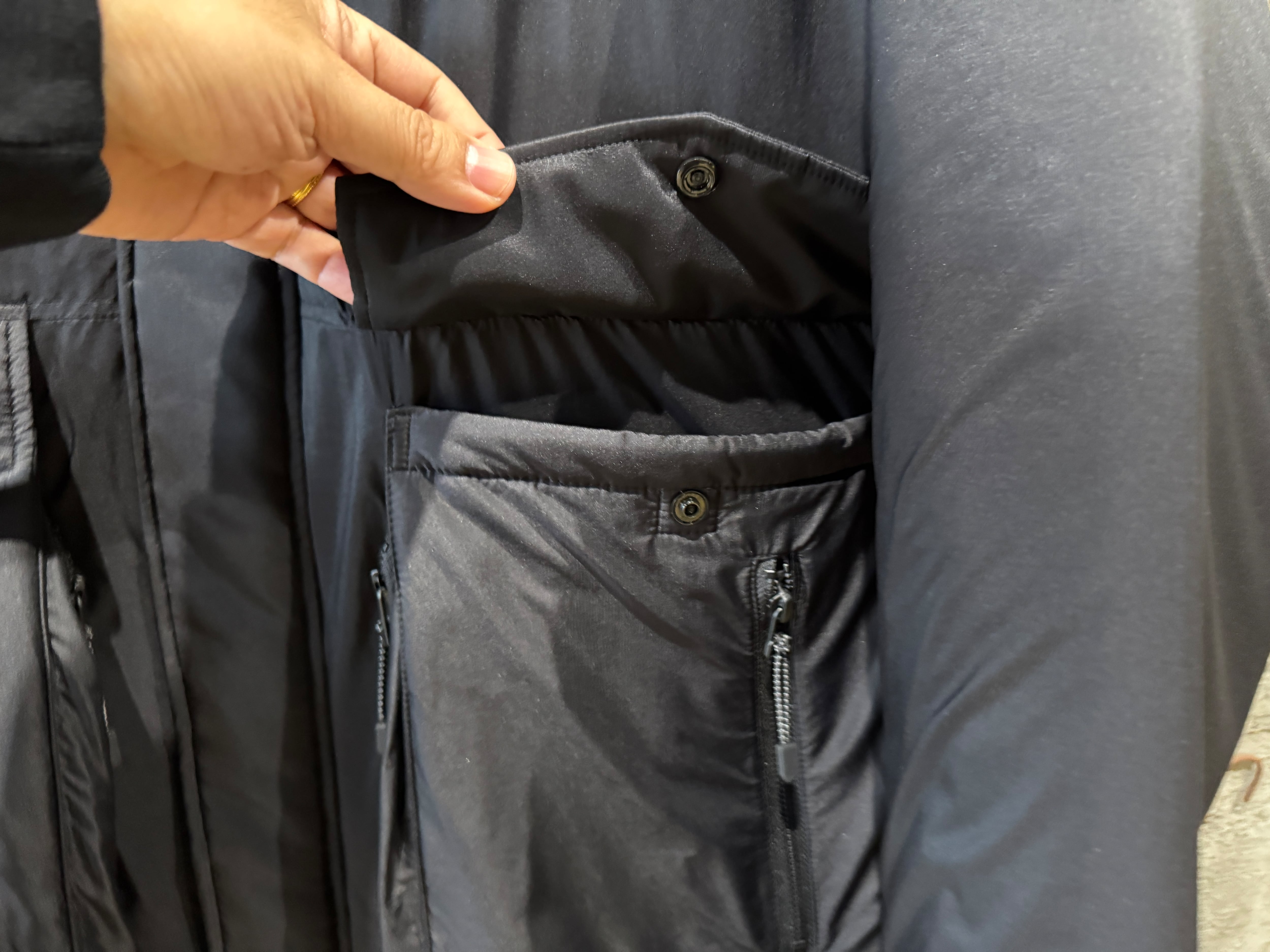 フラップ付きポケットは、フラップを開けずに中に入れたものを取り出せるように、ポケットの内側にもファスナーをつけて、スムーズに取り出しができるようになっています。