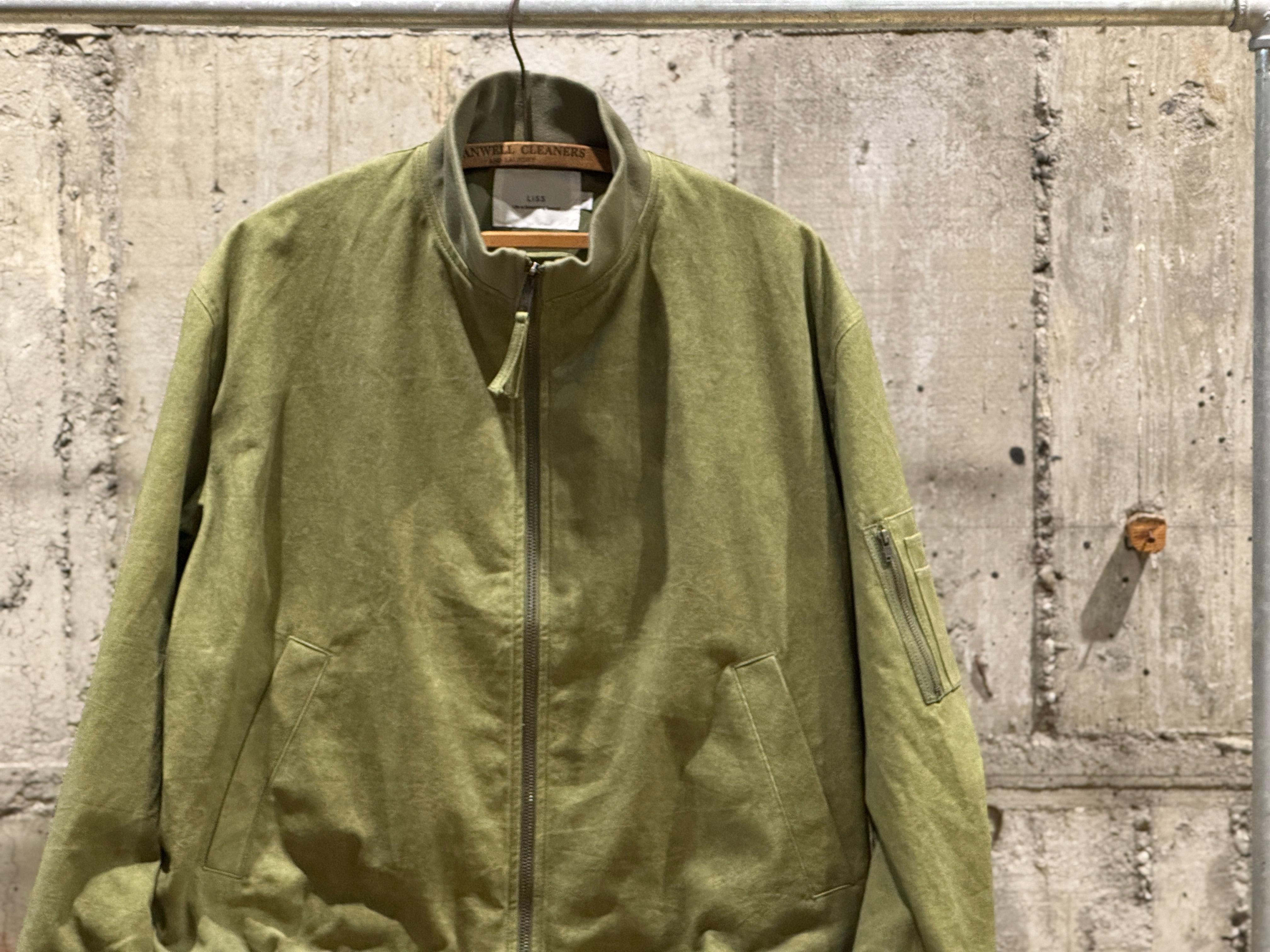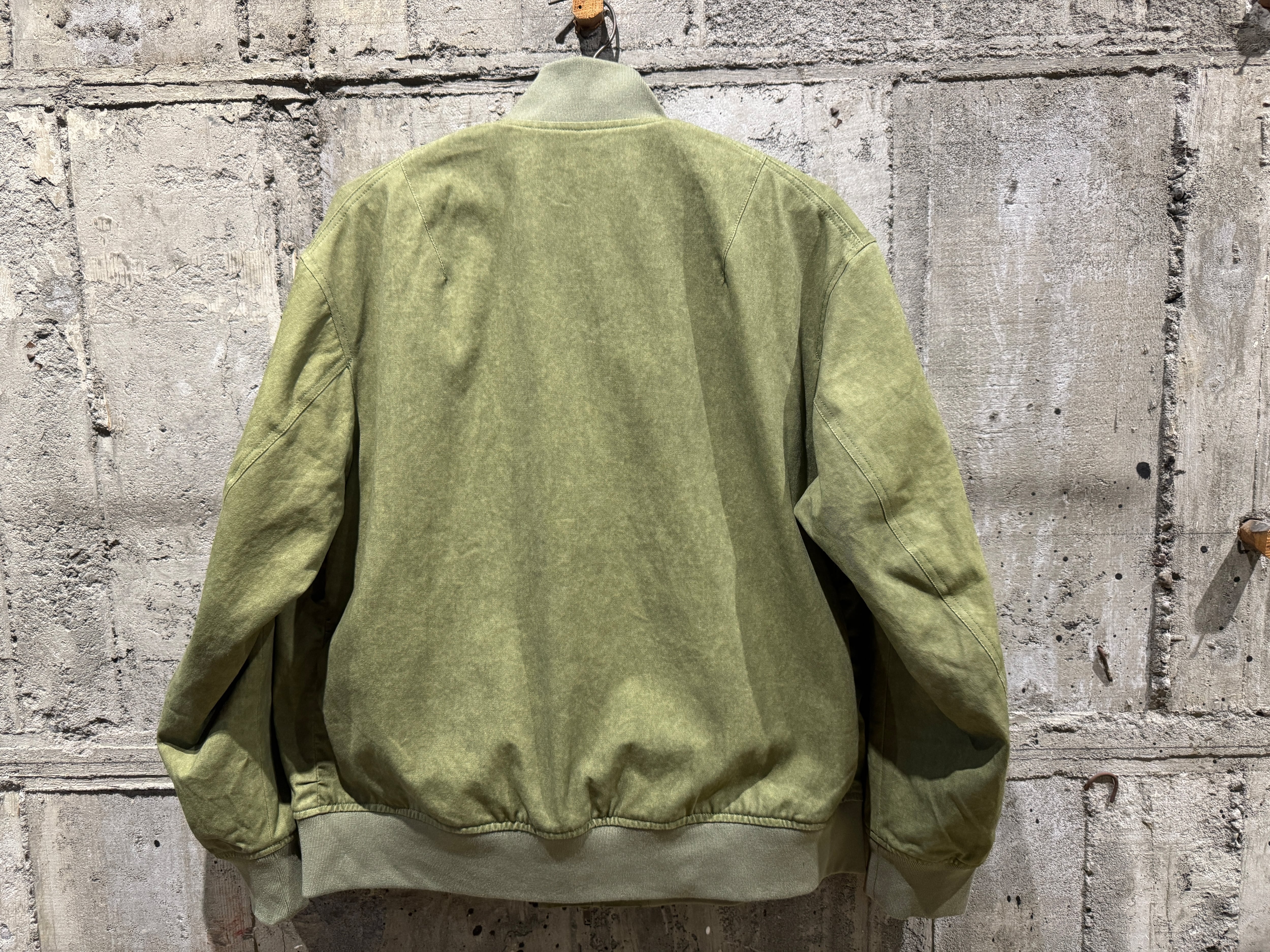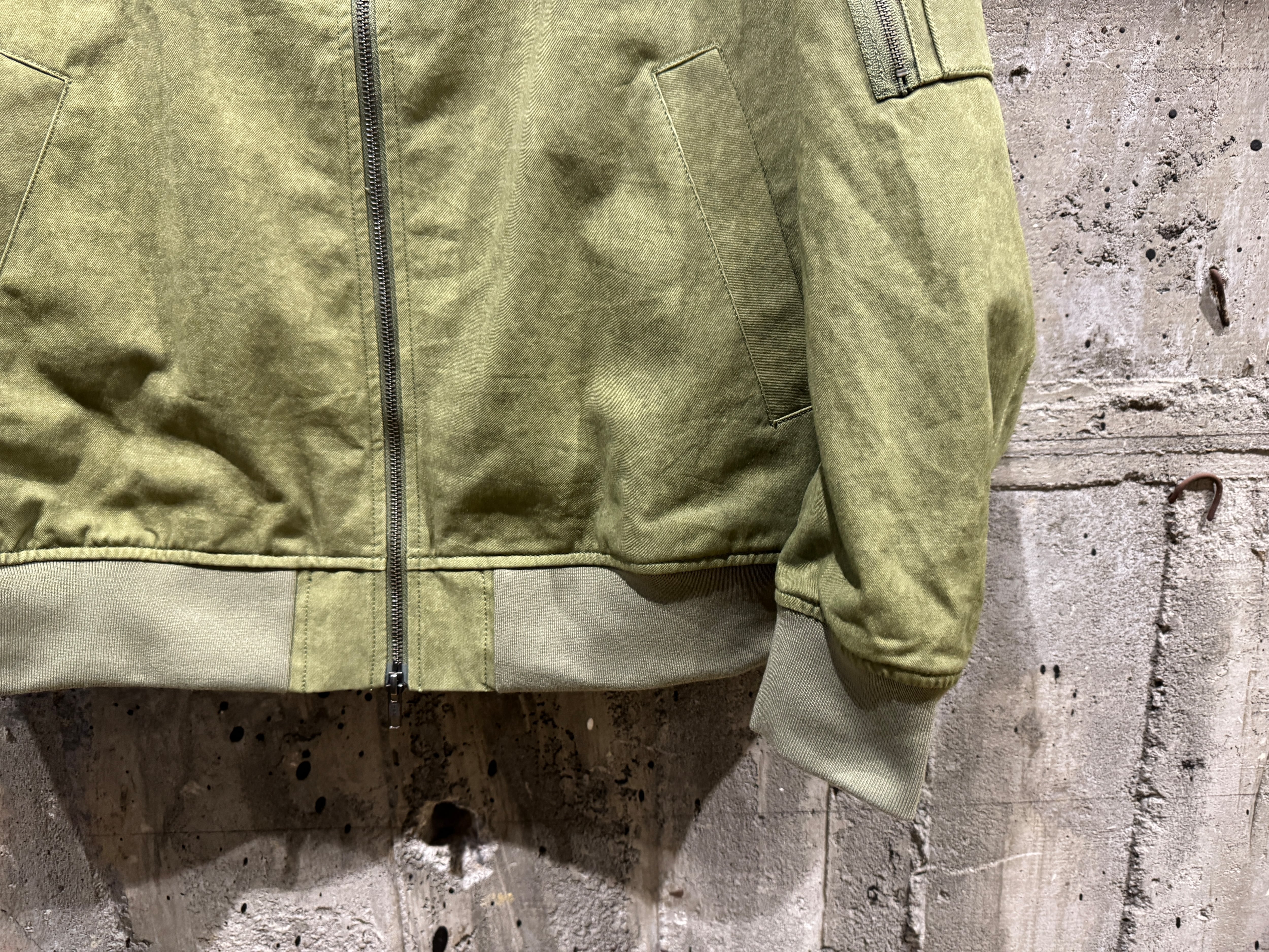 ウォッシュ加工を合わせることでさらに風合いが増したハイネックリブ衿の裏付き MA-1ブルゾン。