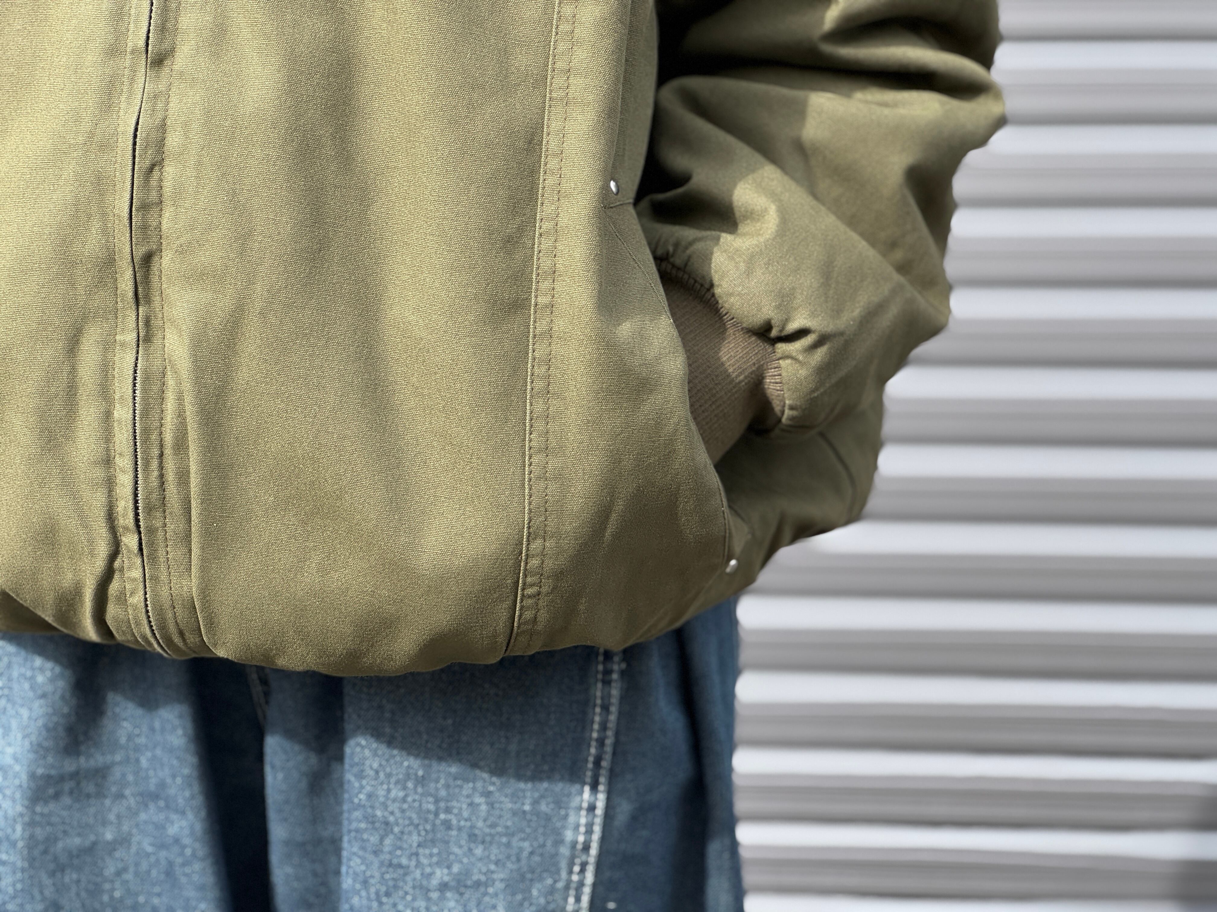 タフでハリのあるコットン生地×薄中綿の入ったナイロンライクなポリエステルのリバーシブルのフードブルゾン。