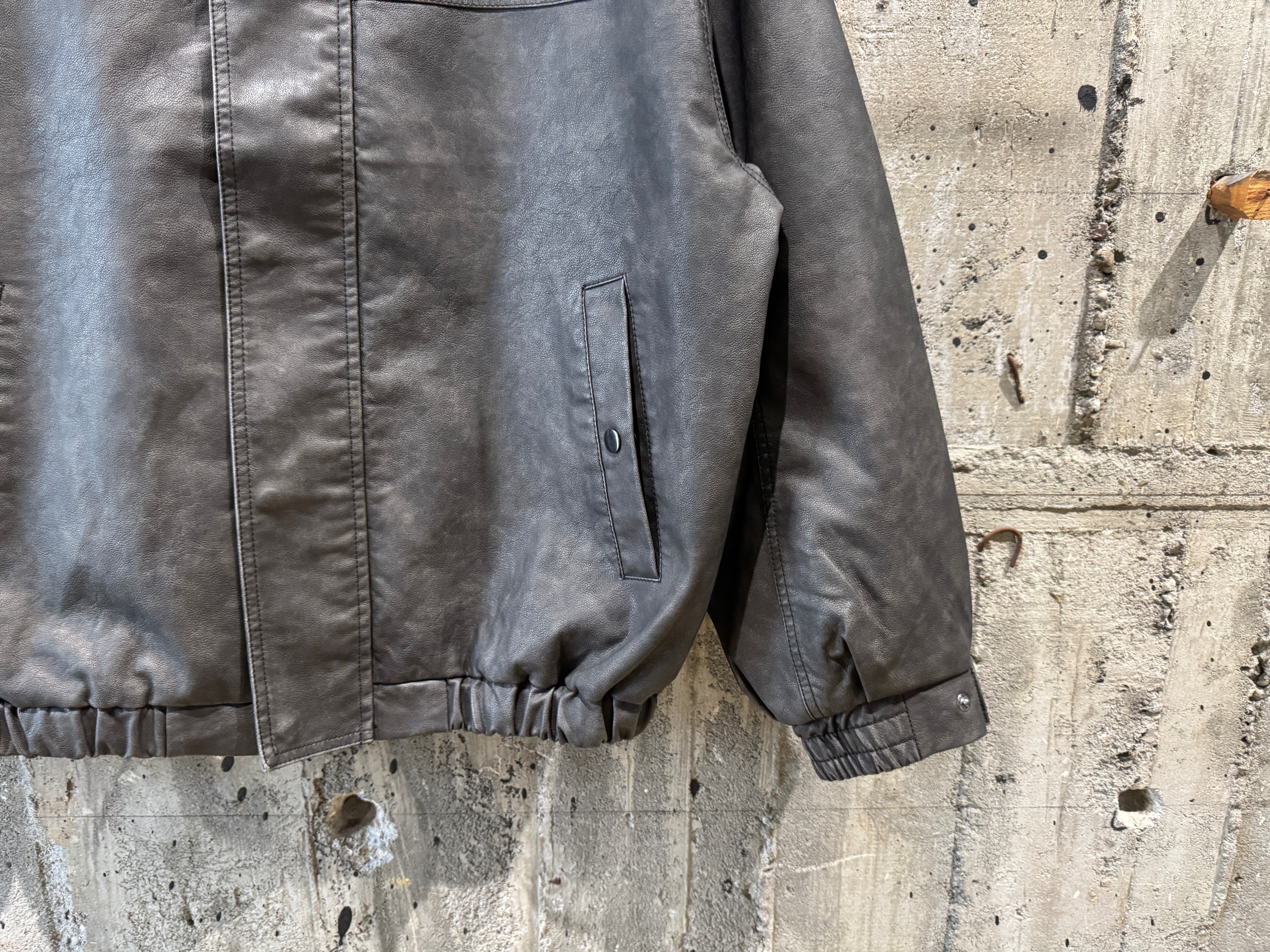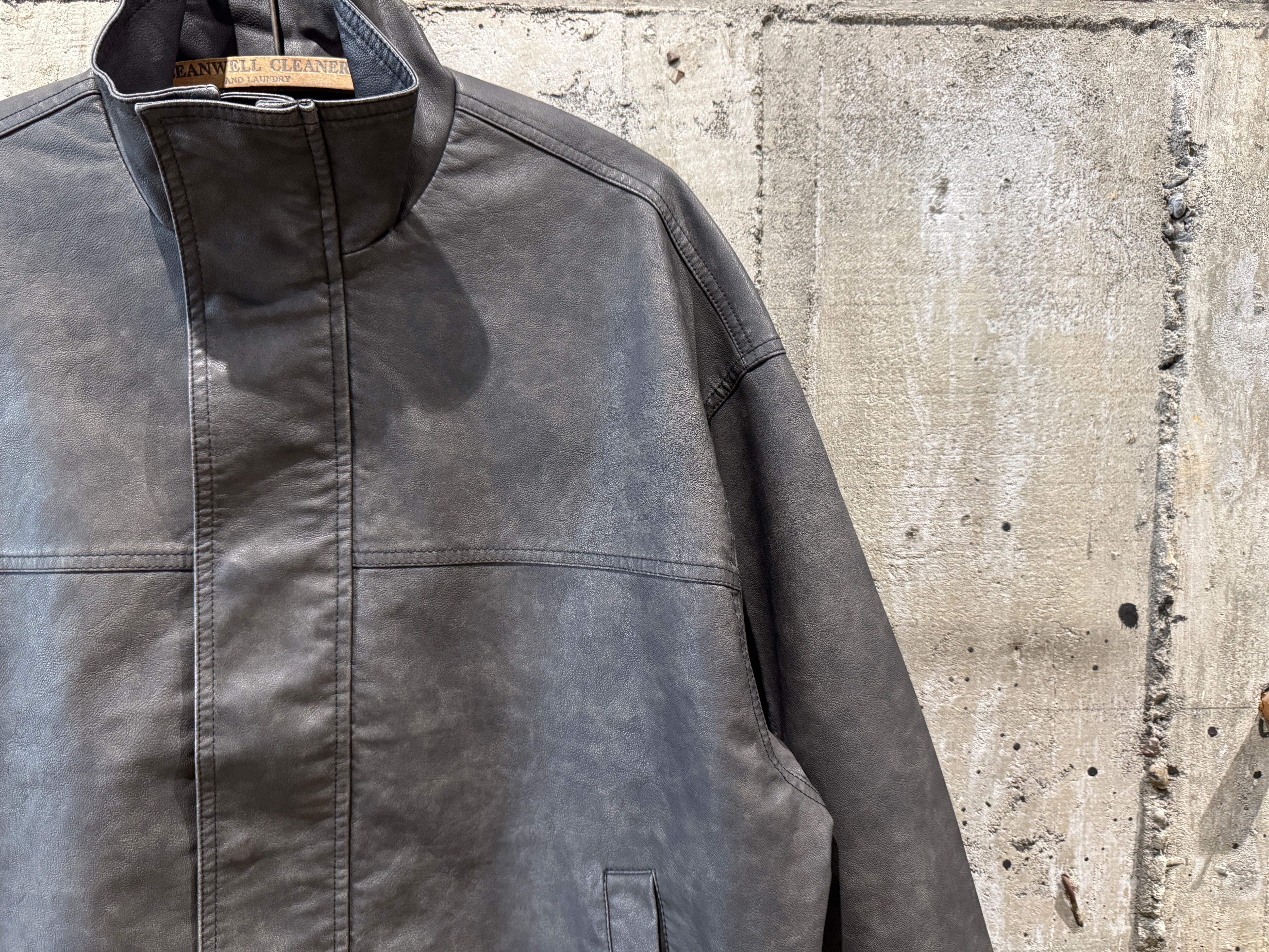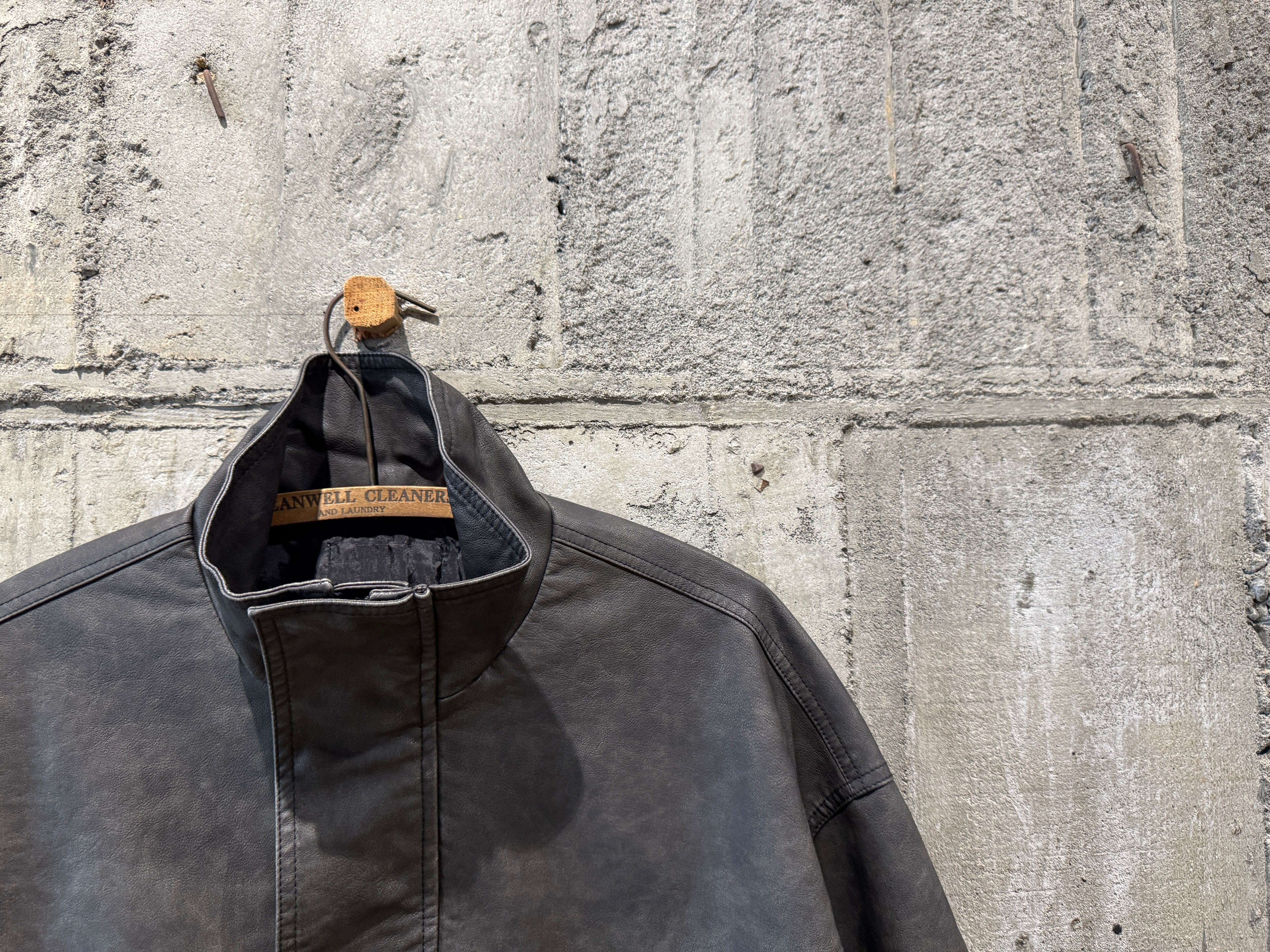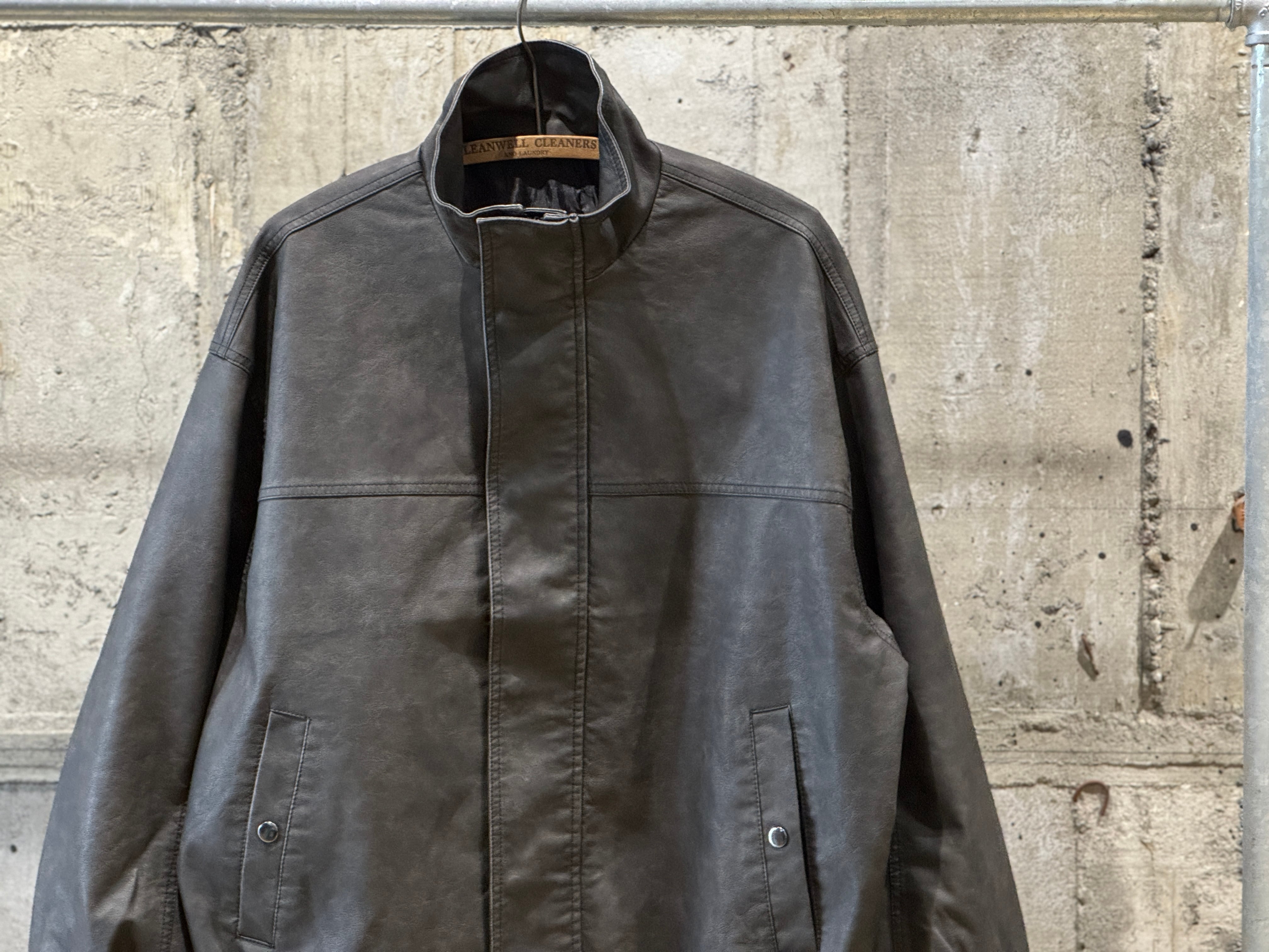 コチラはしっとりとしたレザータッチな生地感のスタンドブルゾン。ウォッシュ加工による独特な色落ち感のある珍しいフェイクレザー生地を使用。ウィンドウシールド仕様でポケットはスナップ。