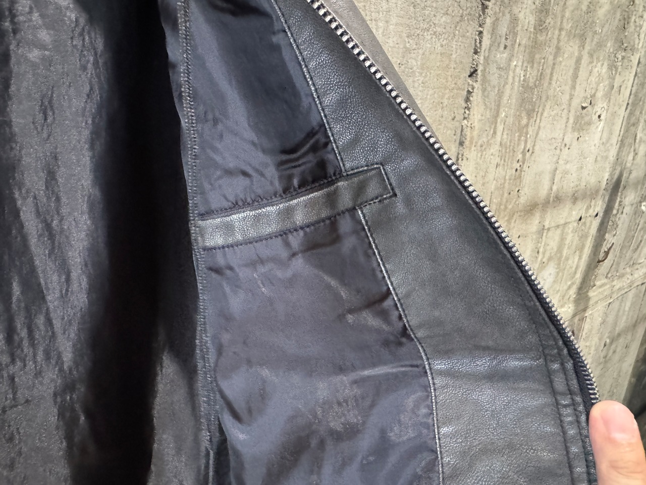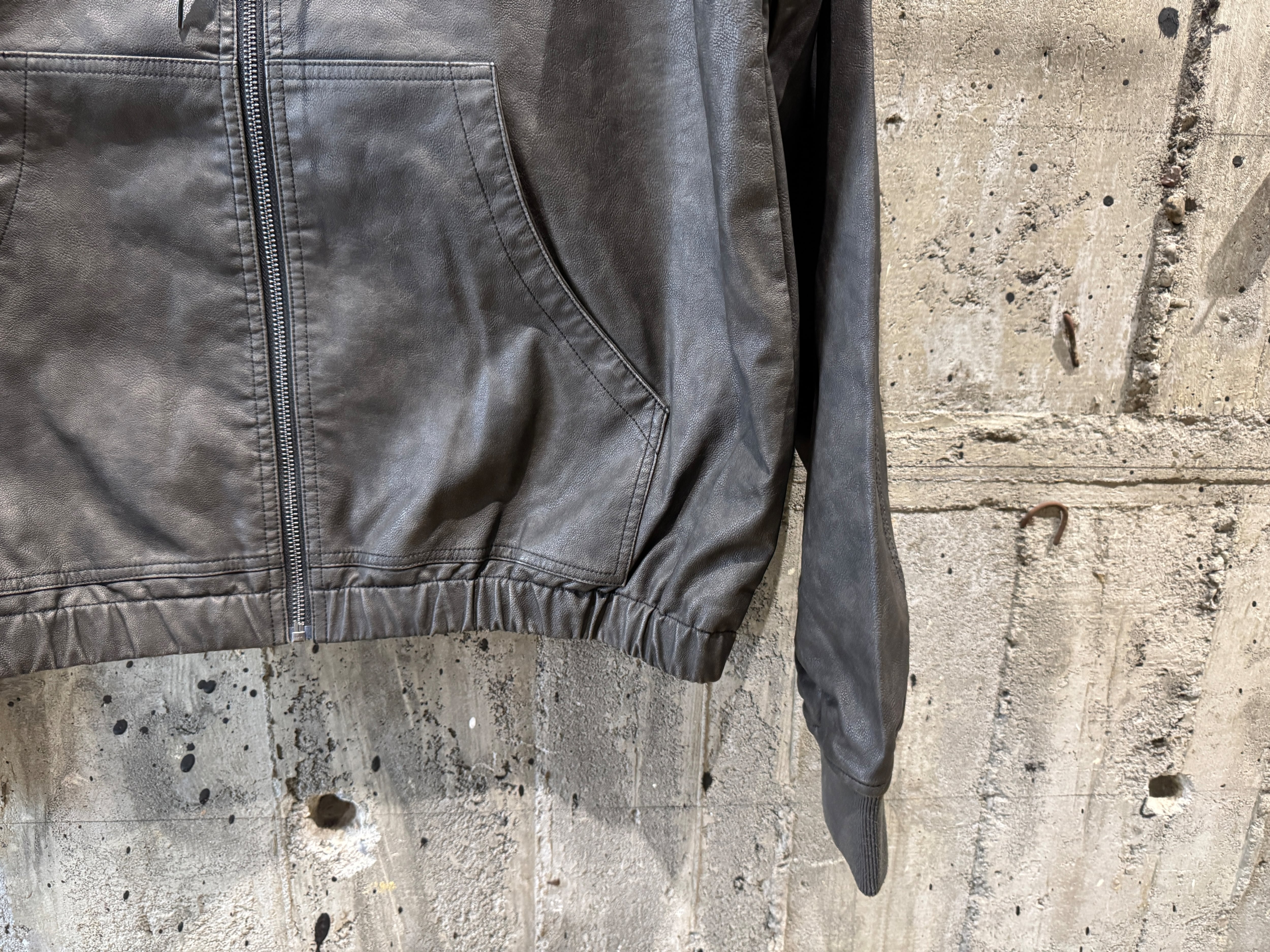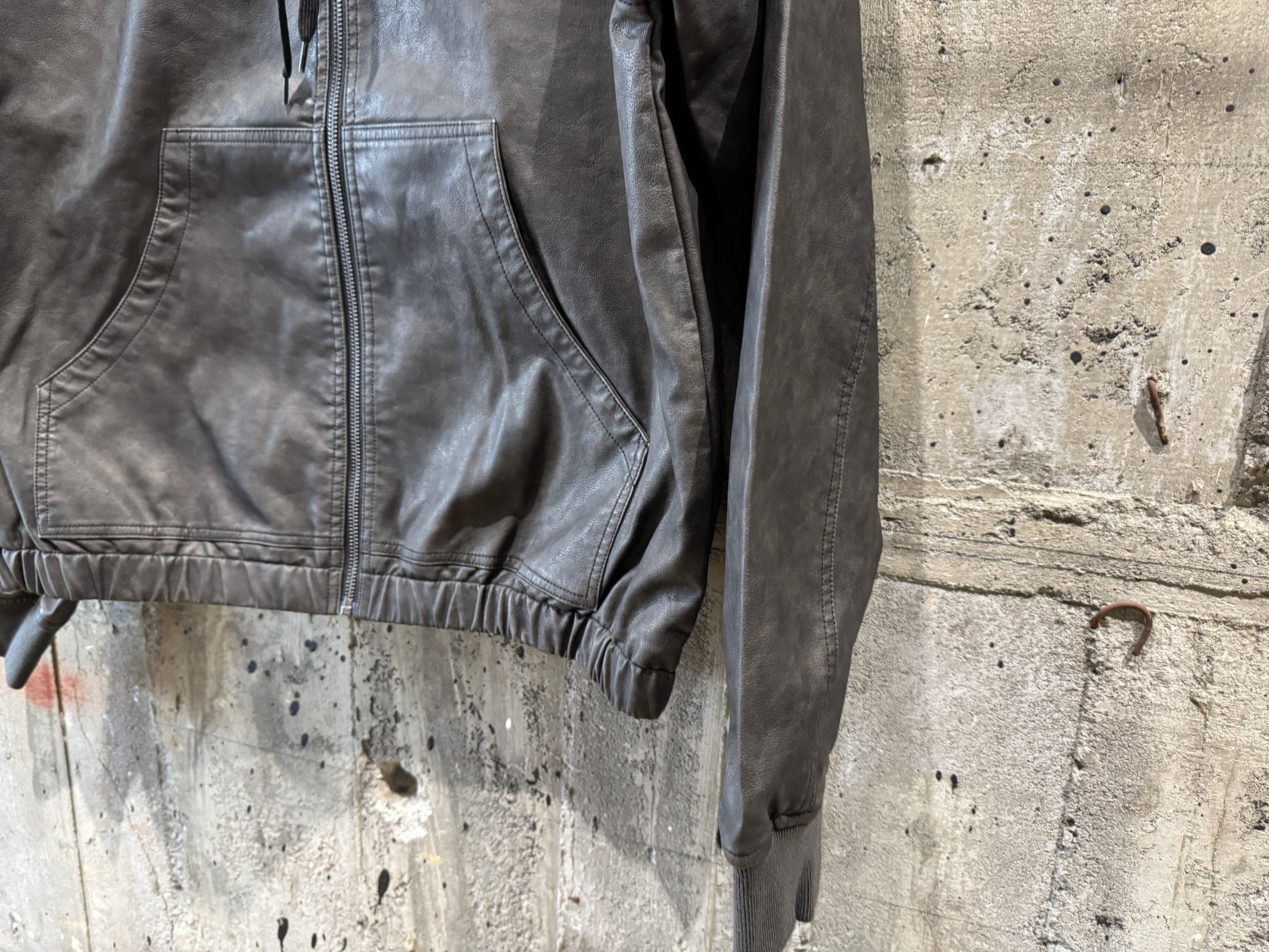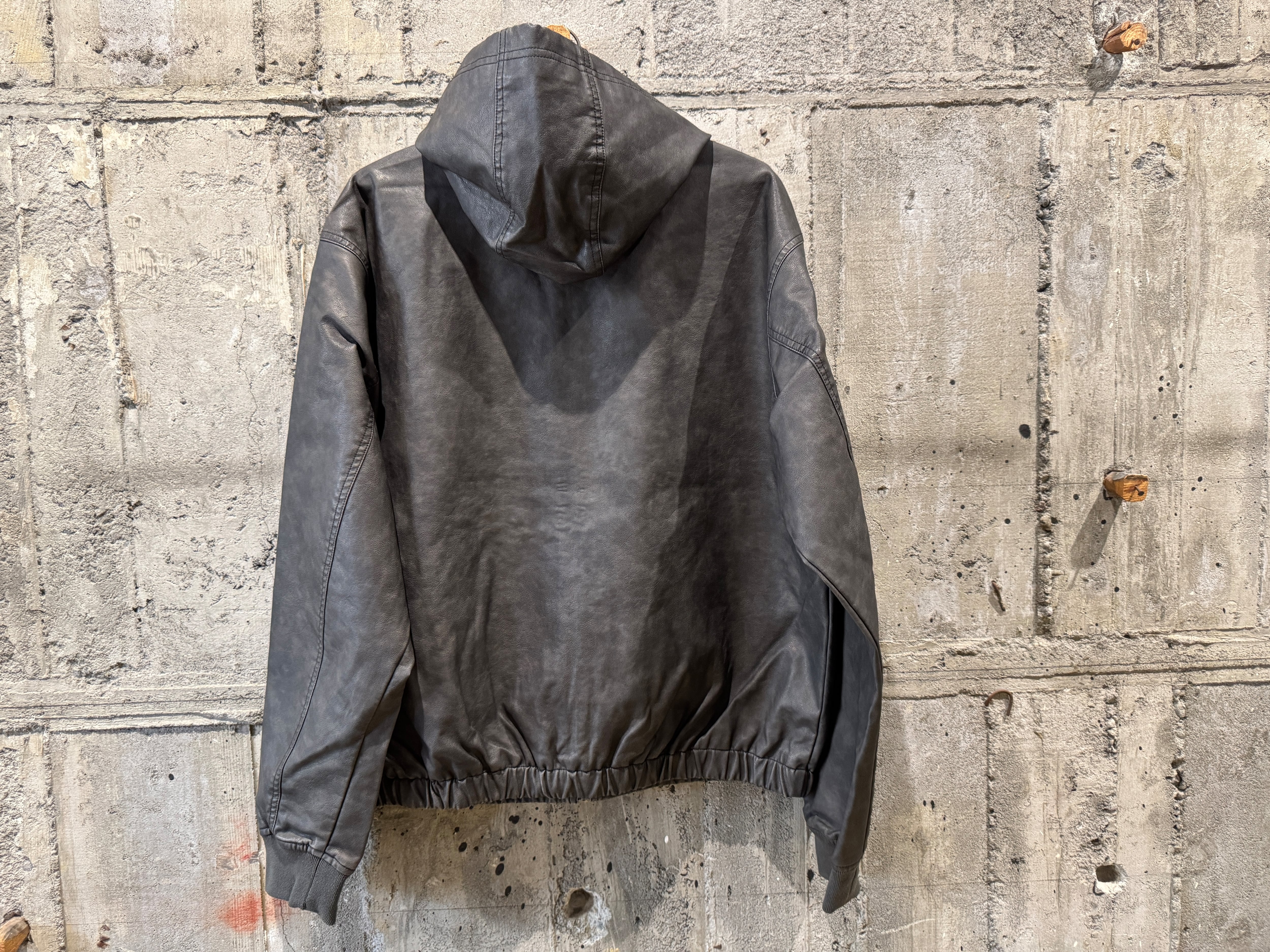 コチラはしっとりとしたレザータッチな生地感のフード付きブルゾン。ウォッシュ加工による独特な色落ち感のある珍しいフェイクレザー生地を使用。リクエストの多かったジップアップパーカーデザイン。