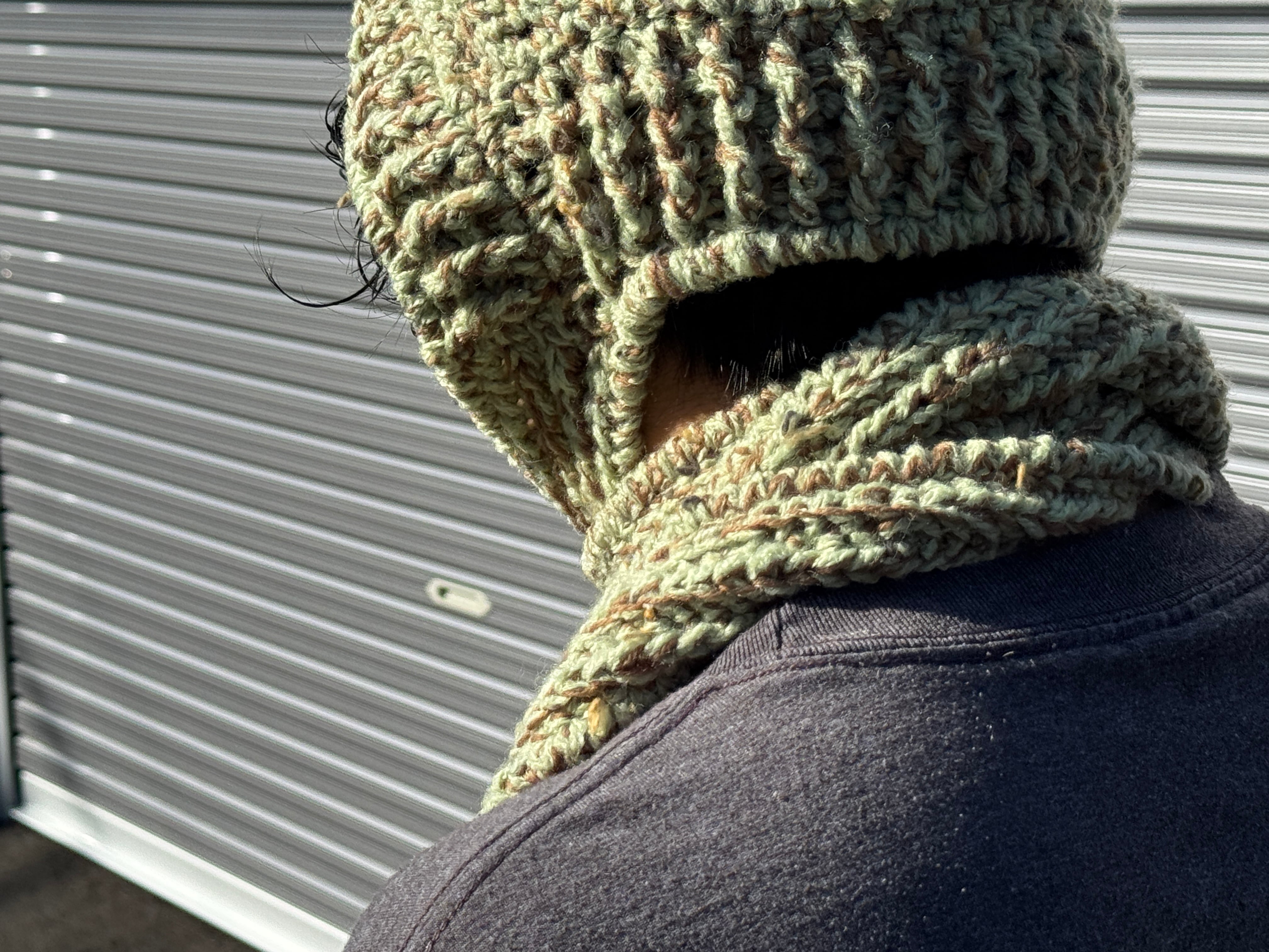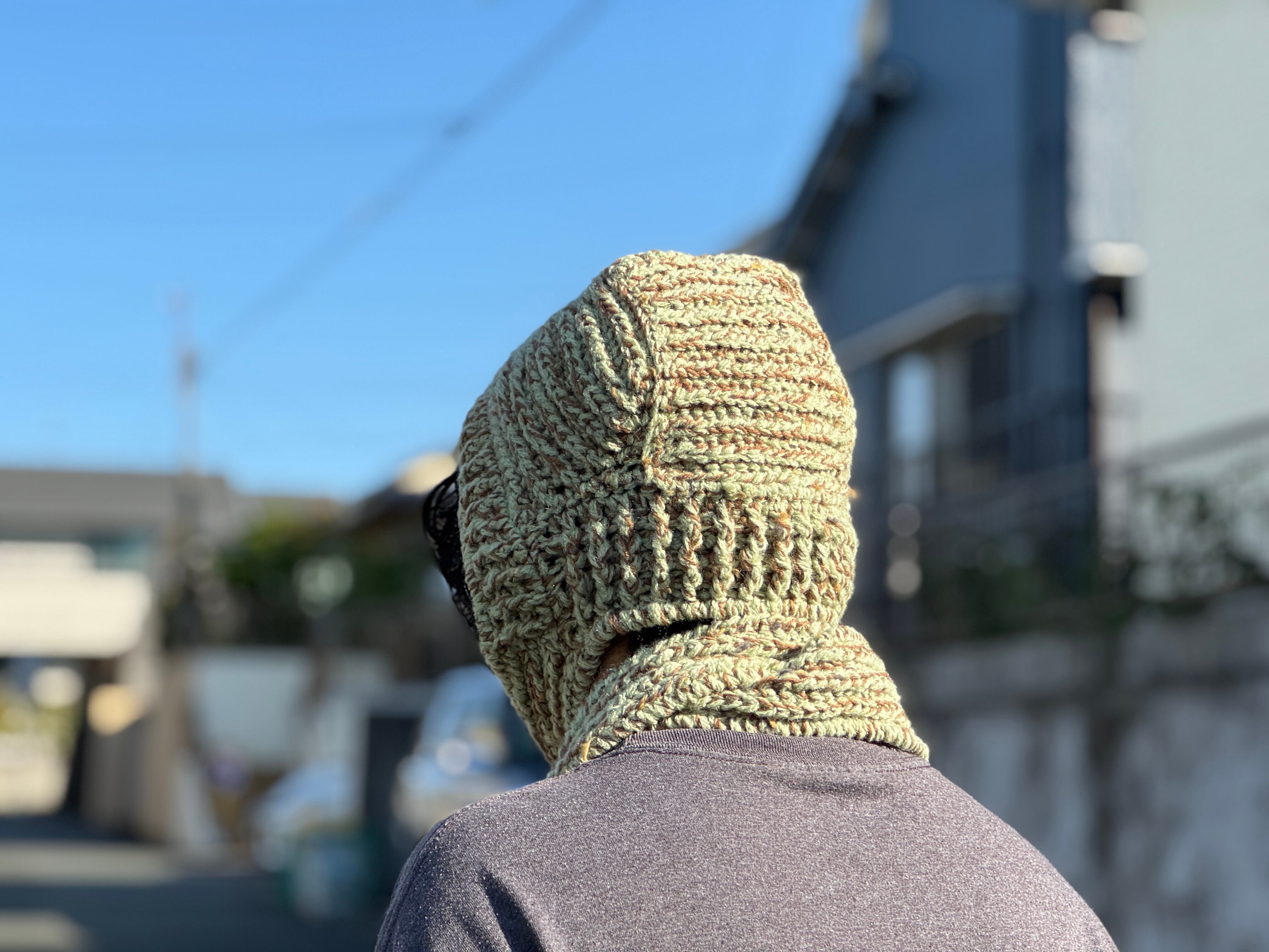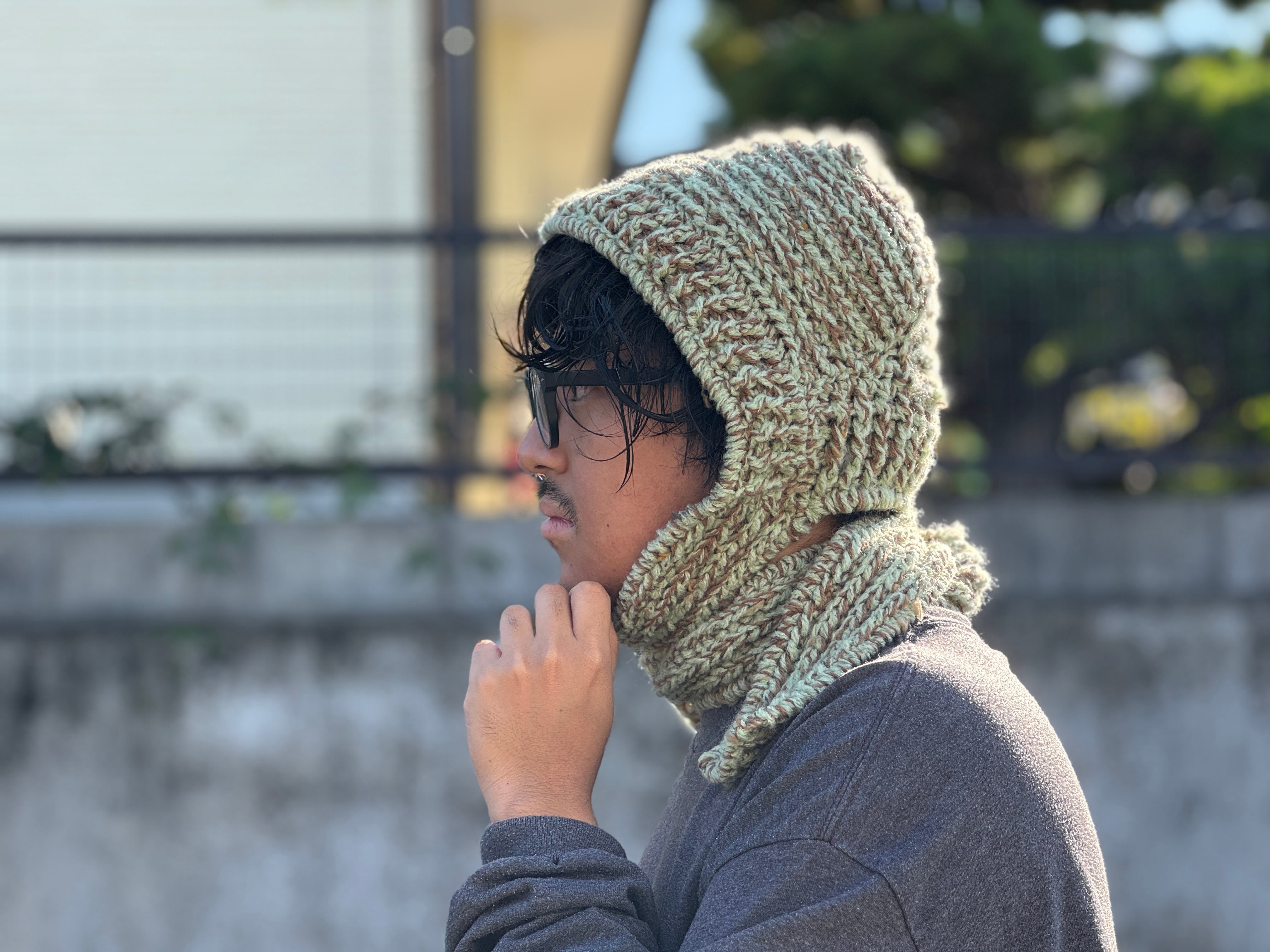 新作は肌触りが良く被り心地の良いウールを使用。ペールグリーン×ブラウンのミックスカラー、しかもネップ入りが絶妙。コードは垂らしたままでも良いし、首に巻くとマフラーライクな暖かさがあり、かぶるのをやめるとフード感覚なスタイリングが楽しめます。