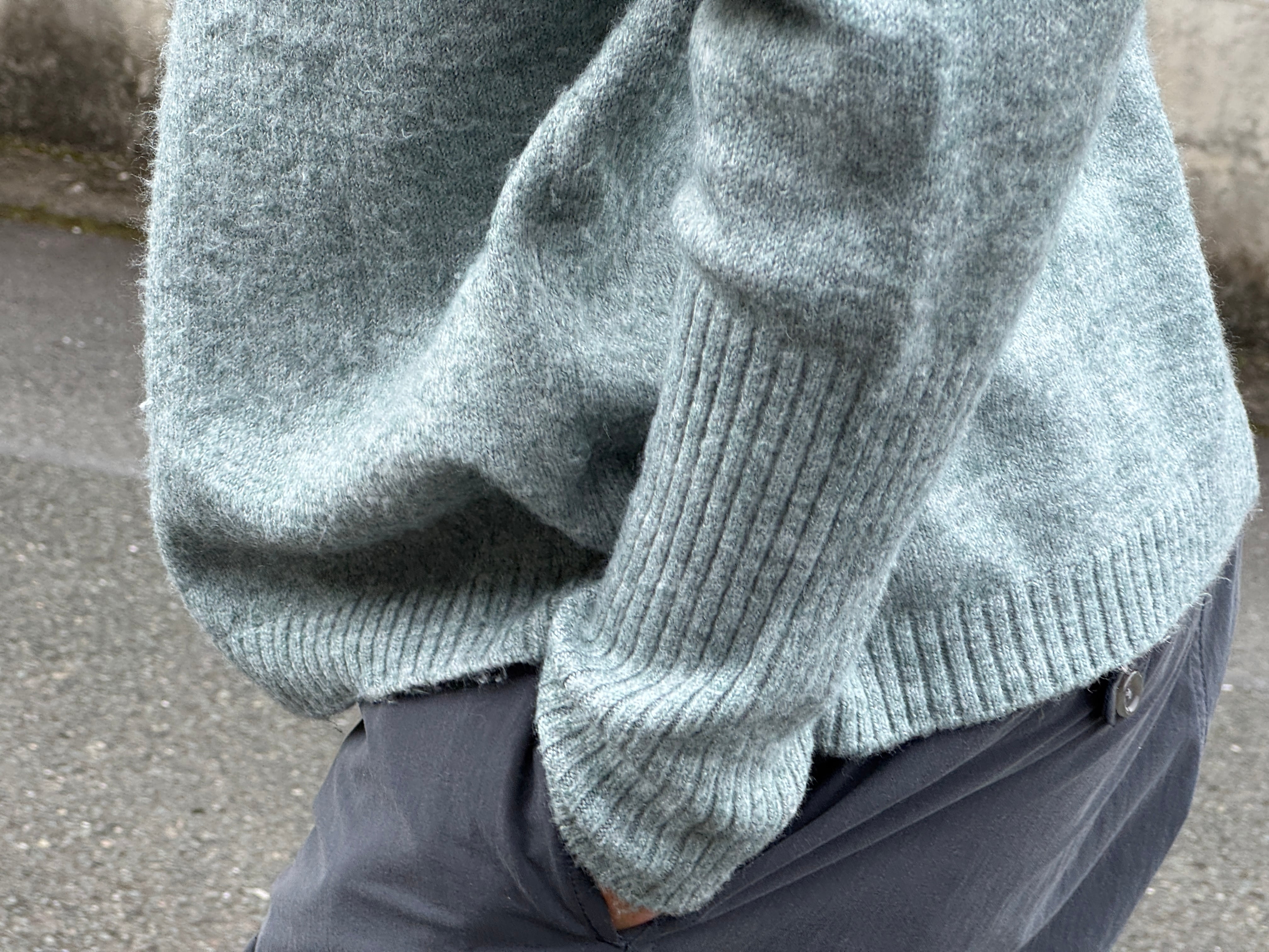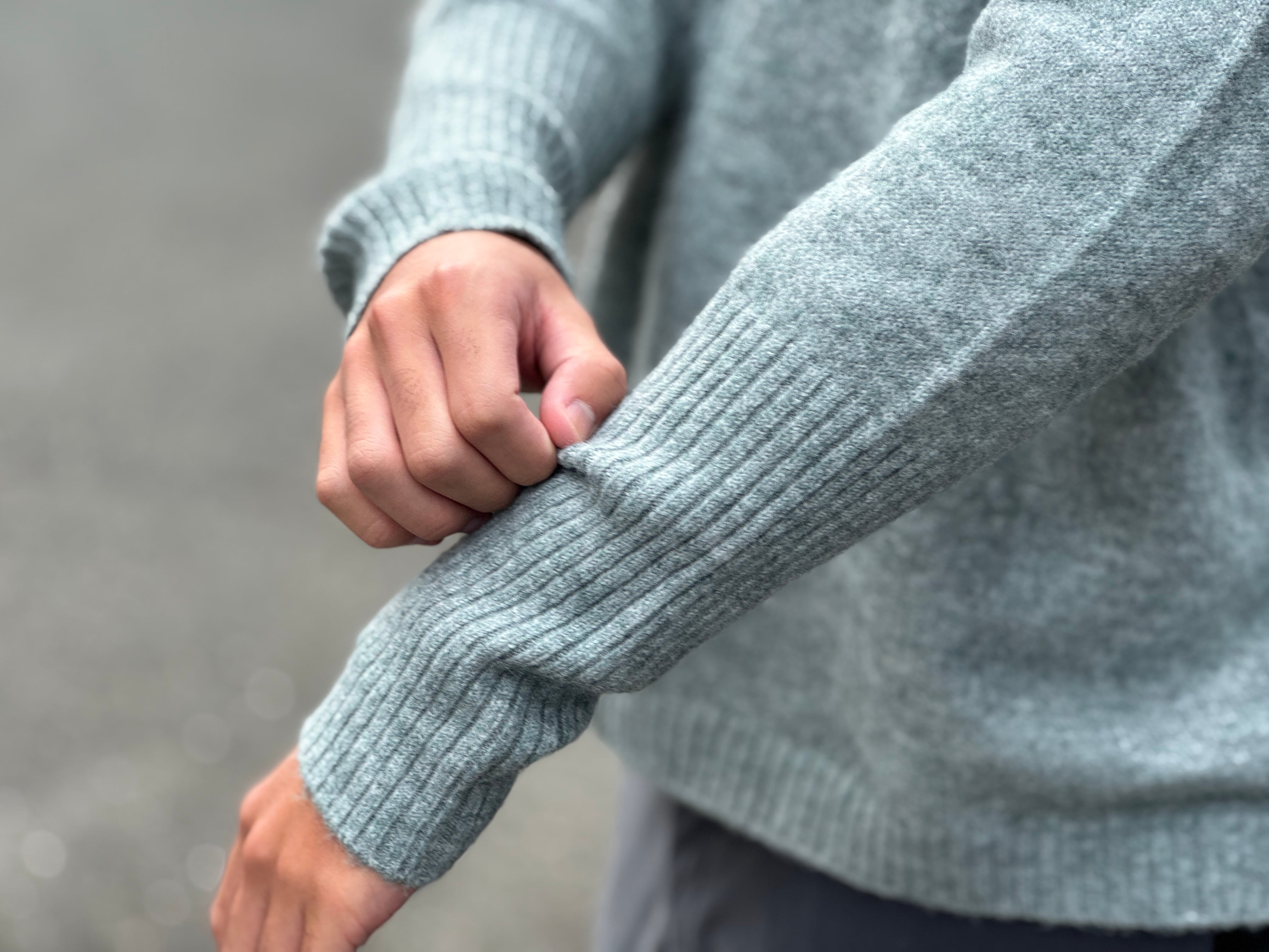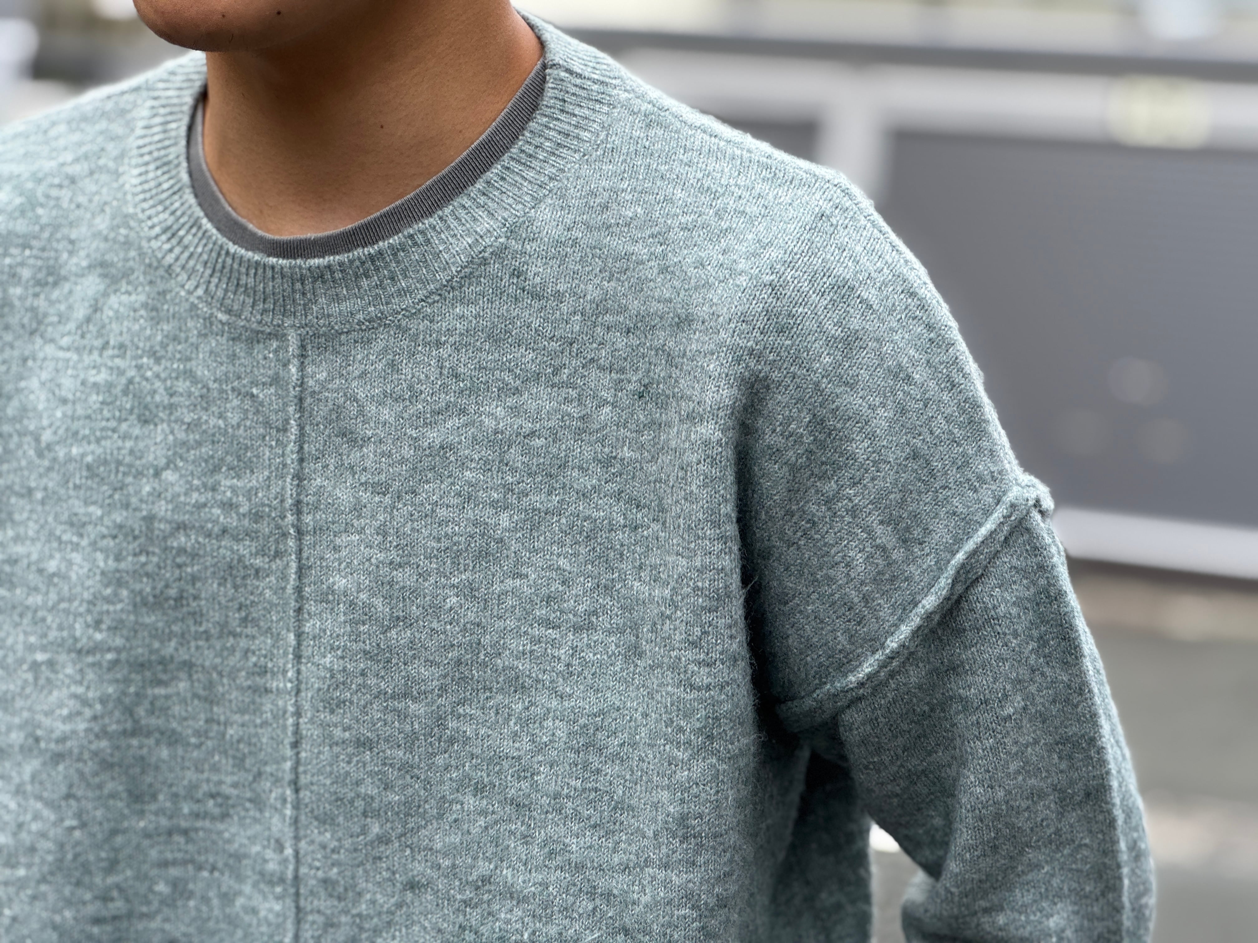 鮮やかなライトブルー杢のカラー、切り替えデザインや袖のリブ長のデザインも魅力的です。