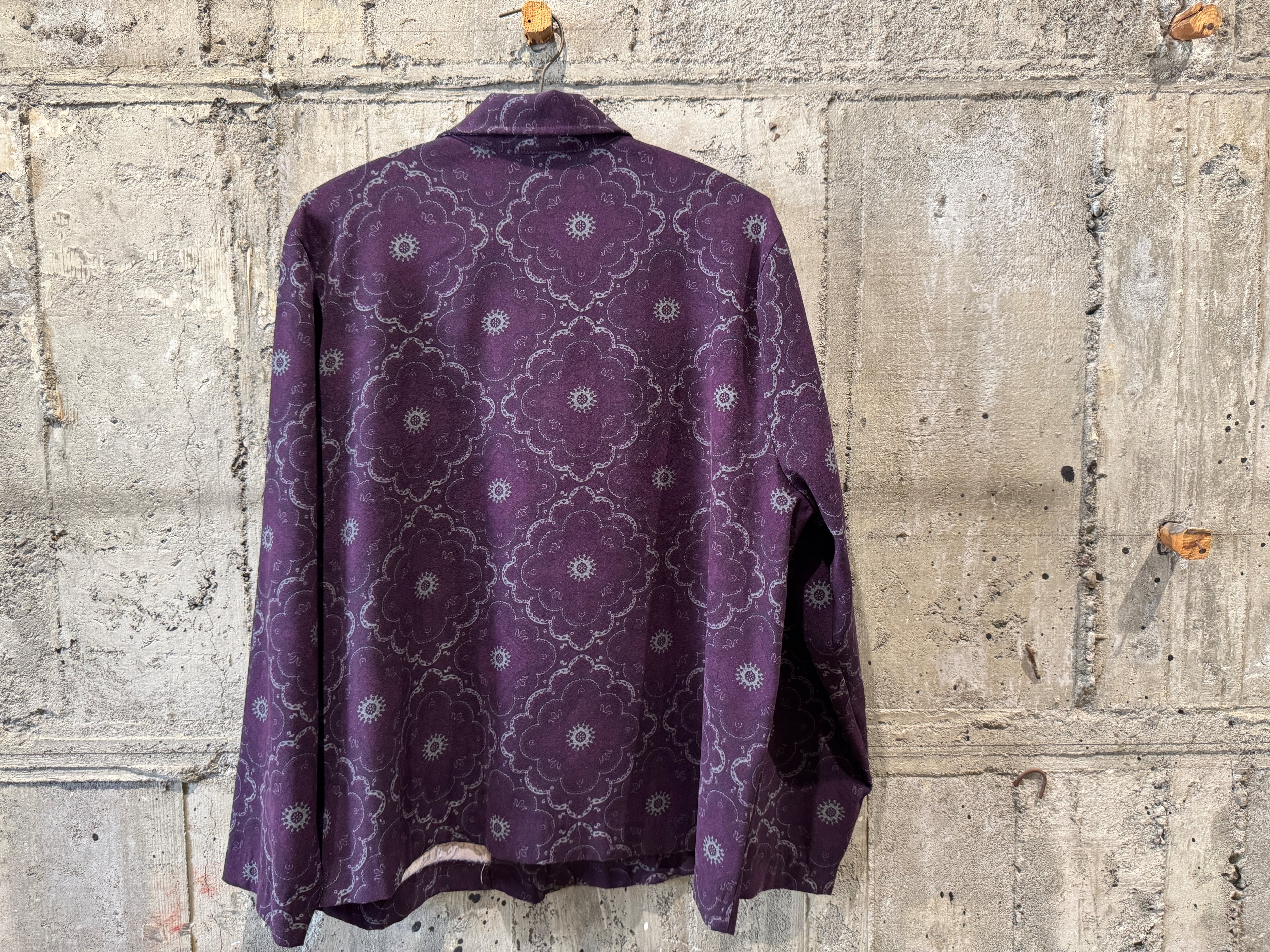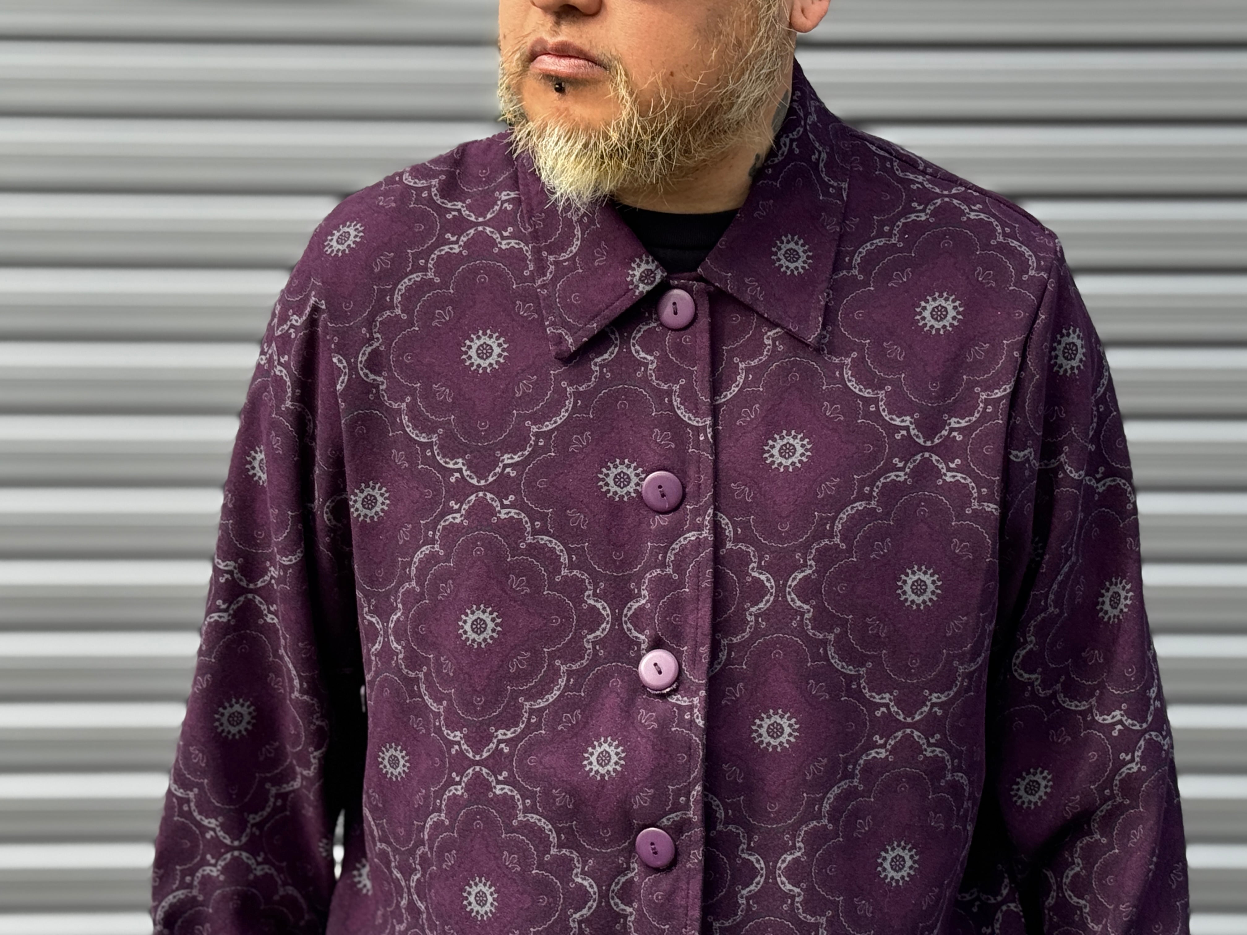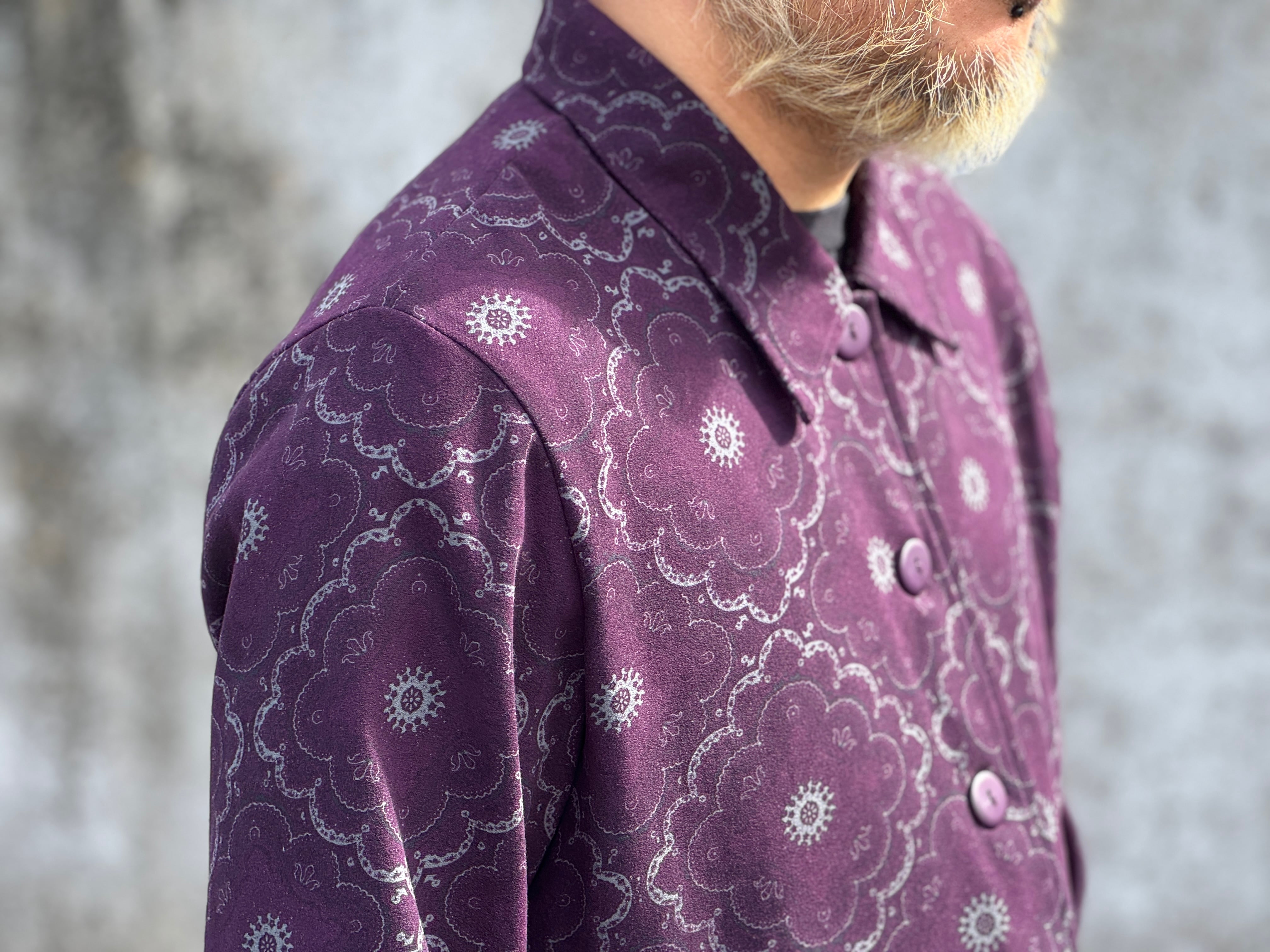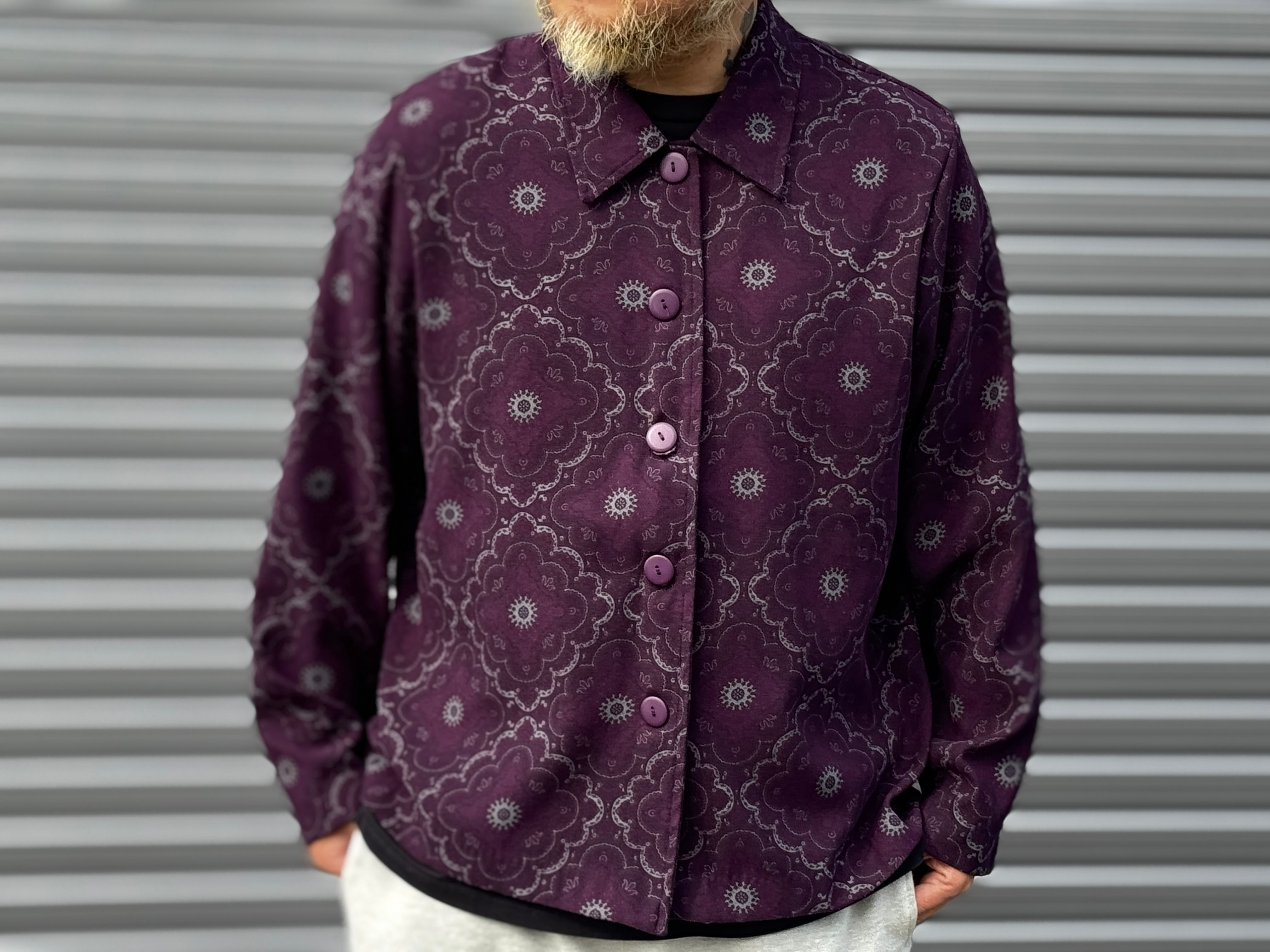 しっとりとした品のある肌触りのデザインシャツ。ダークパープルのボディに妖艶なグラフィック。jktのようなボタンの大きさ、袖はボタンレス仕様。