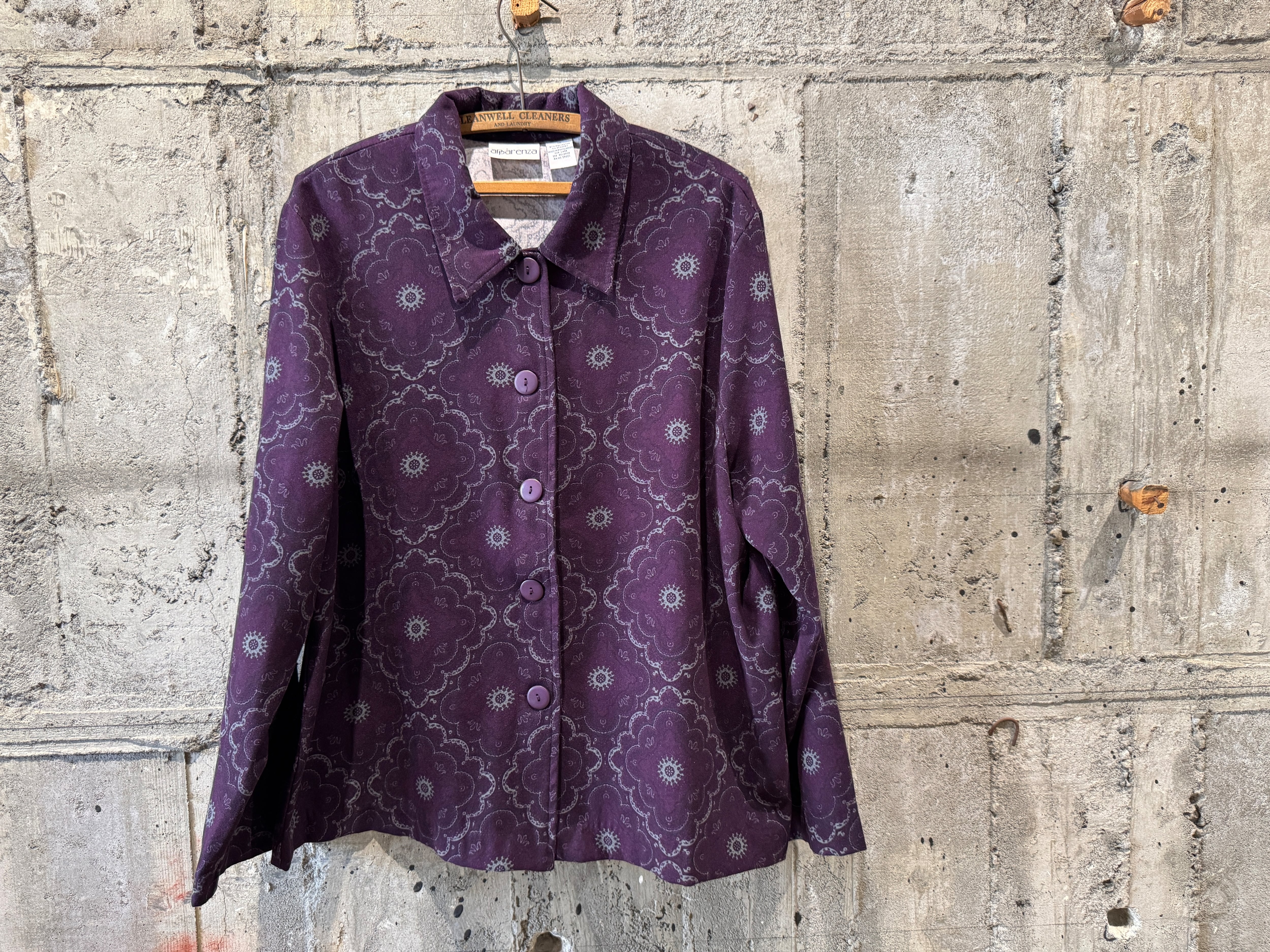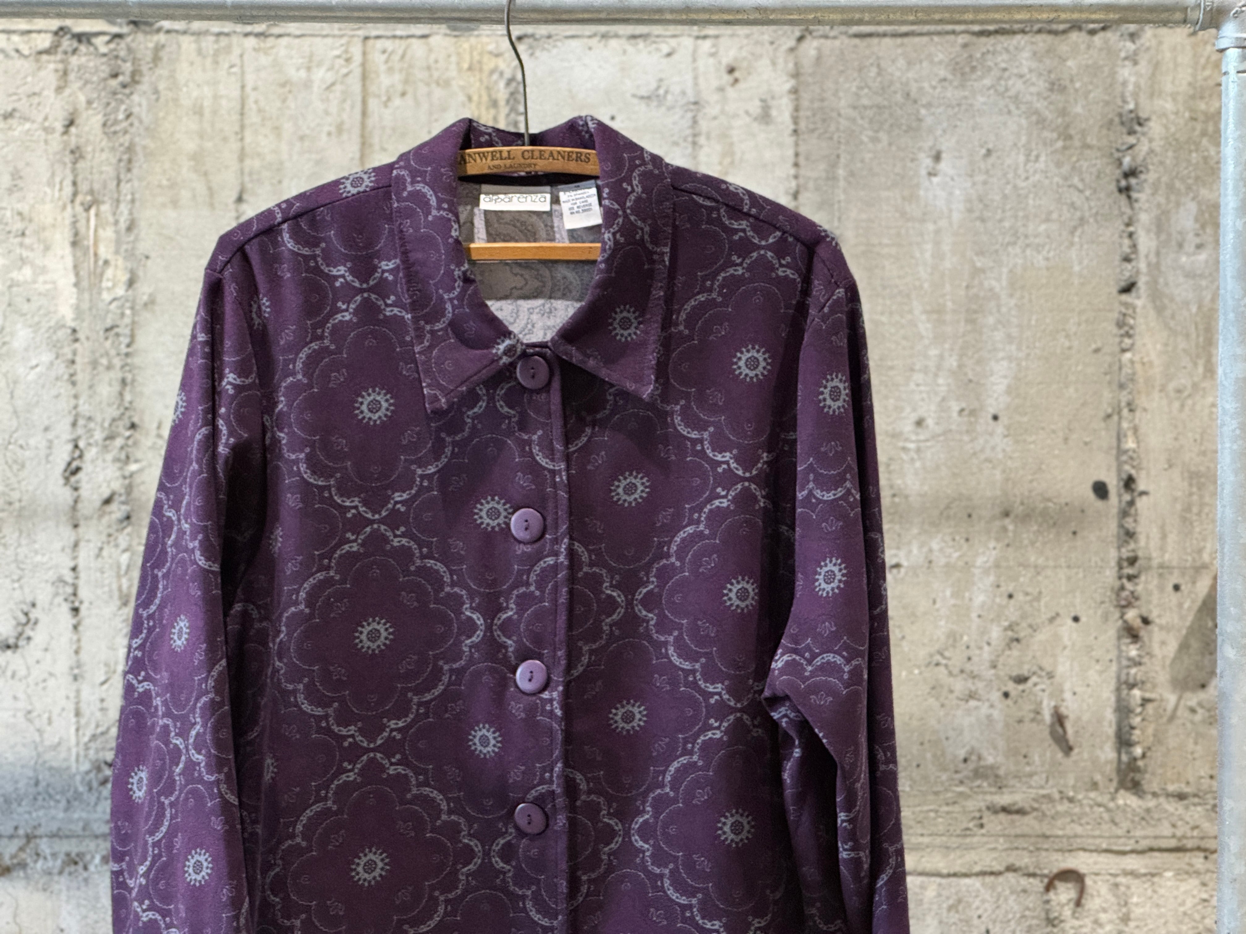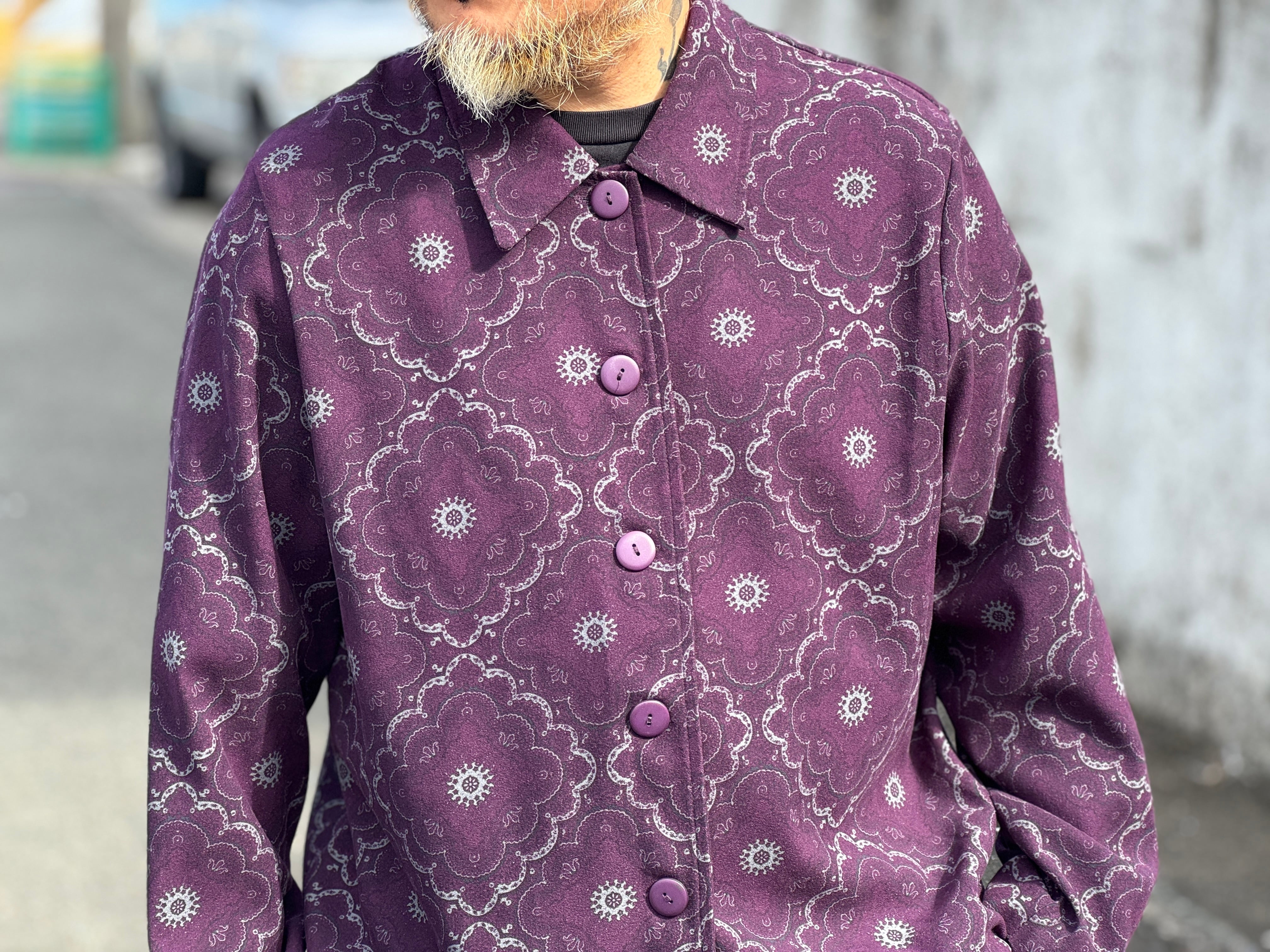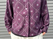 しっとりとした品のある肌触りのデザインシャツ。ダークパープルのボディに妖艶なグラフィック。jktのようなボタンの大きさ、袖はボタンレス仕様。