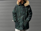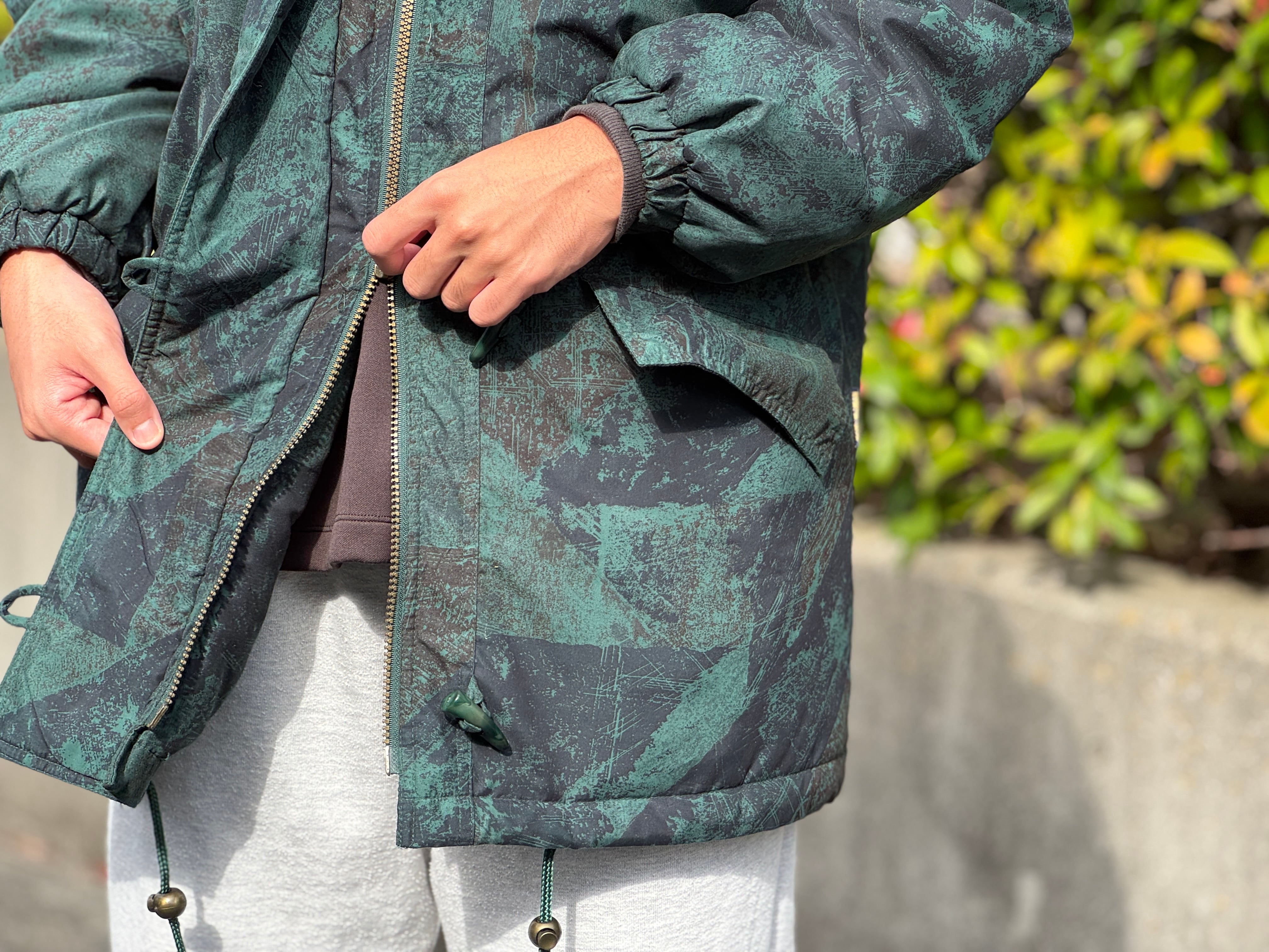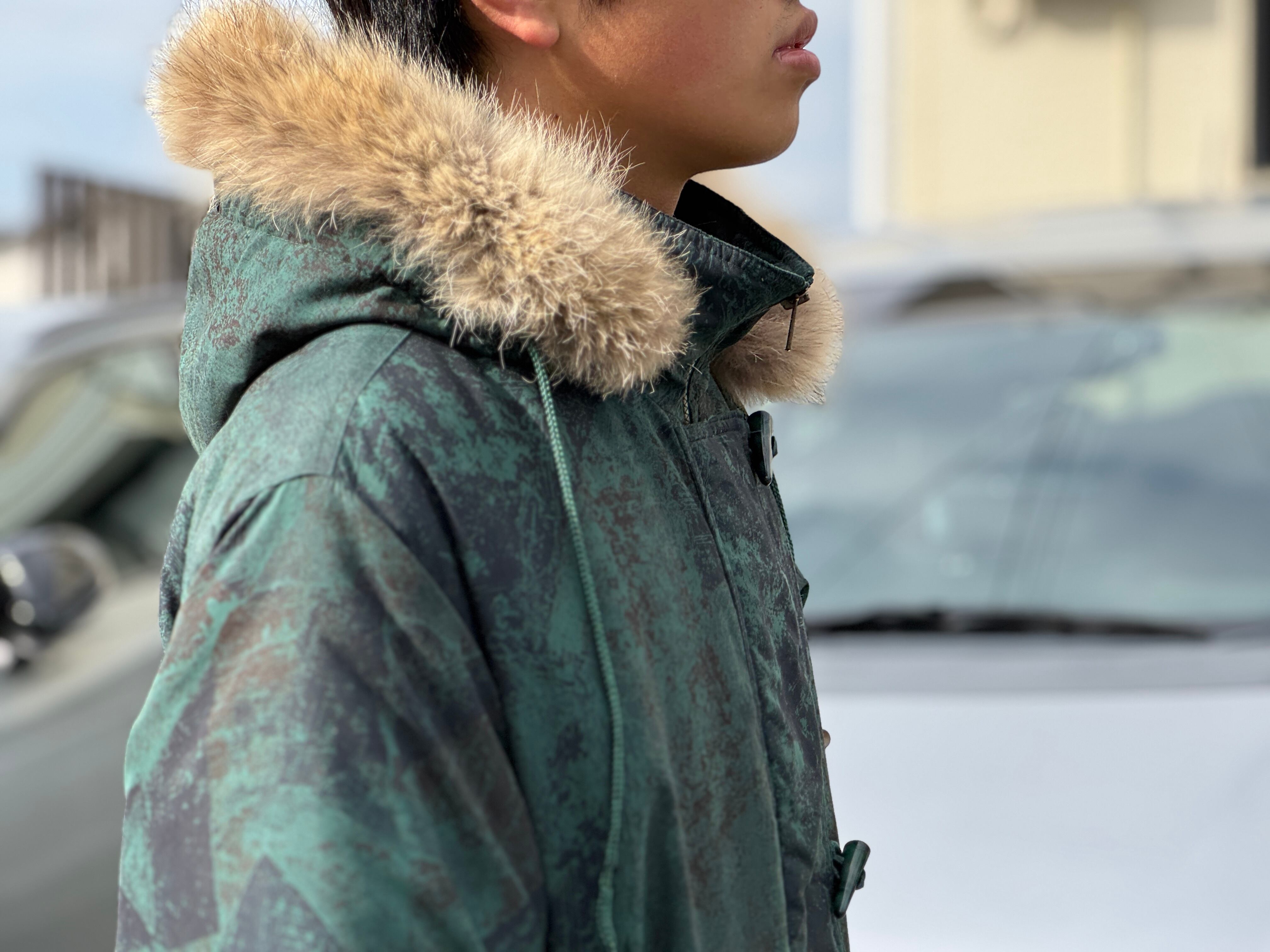 ボタンはトグル、w-zip、フード脱着でファー部分はリアルコヨーテ。後ろ身頃のアクションプリーツ等、土臭いイメージのミリタリーのN-3Bをモダンにモディファイされています。