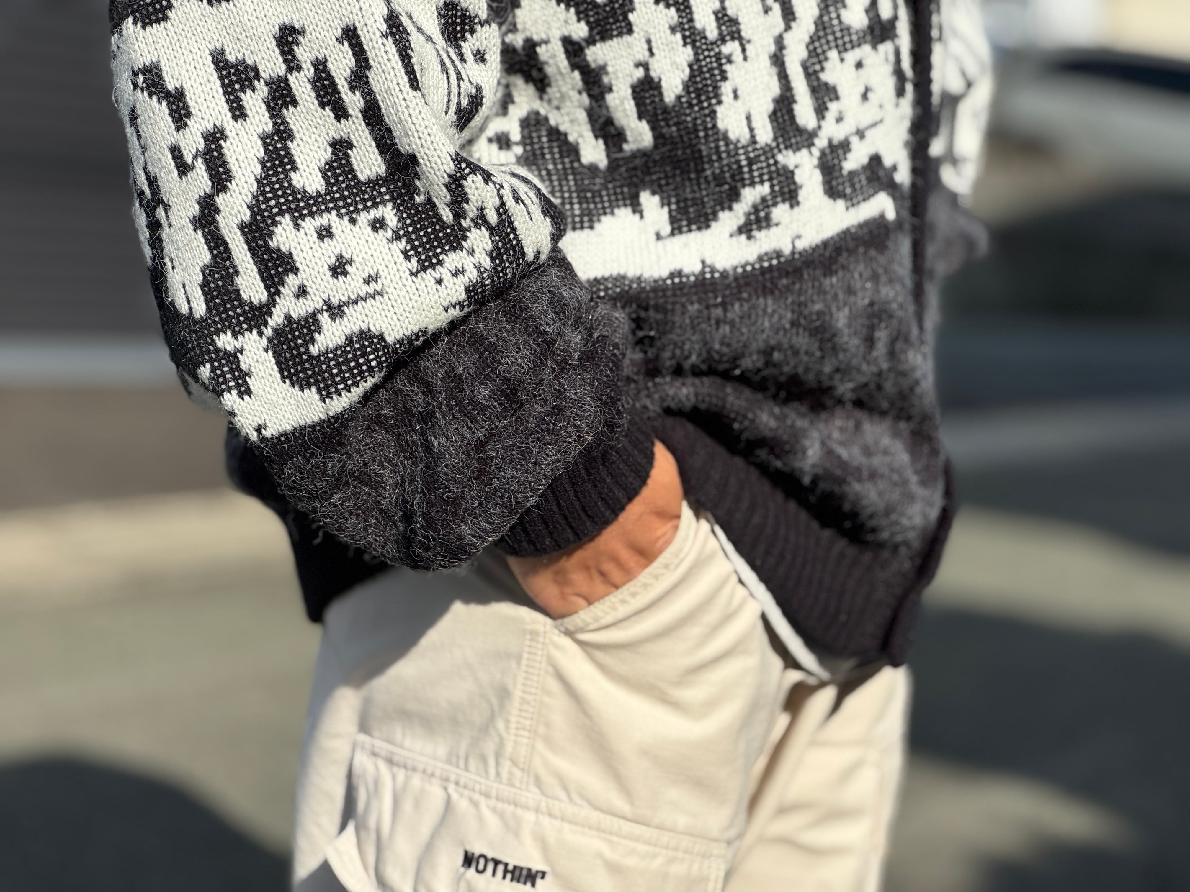 モノトーンのデザインパターン、シャギー系の生地感で切り替えられていたりと雰囲気があります。