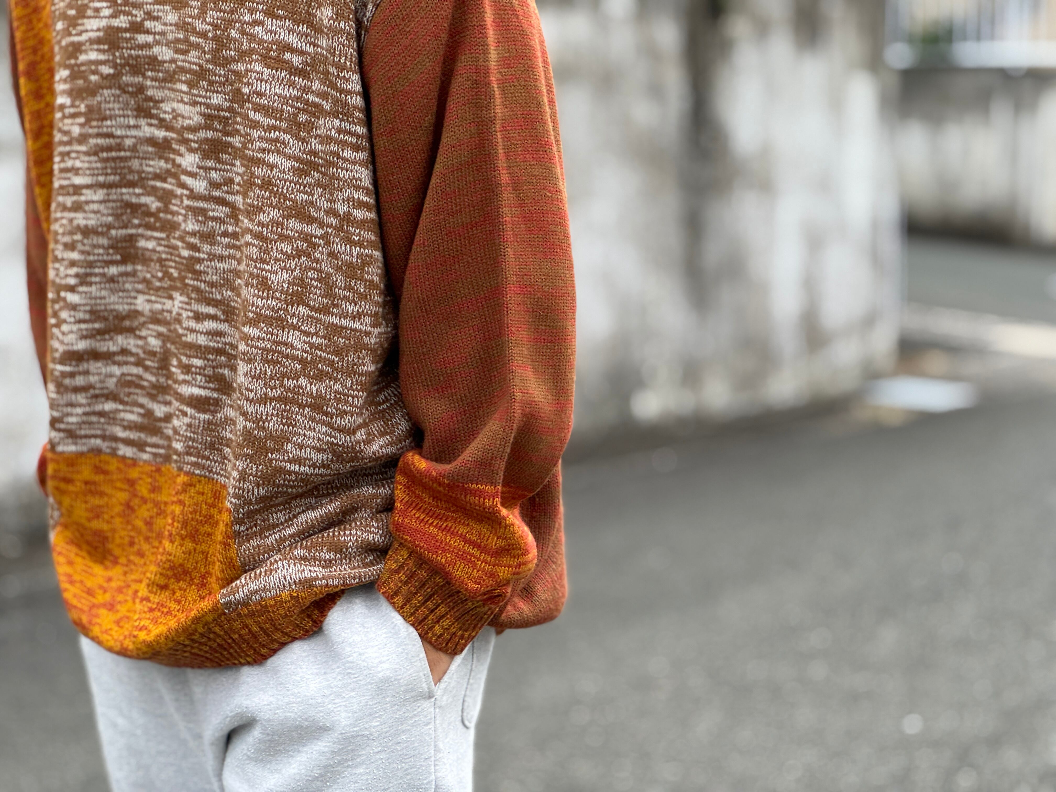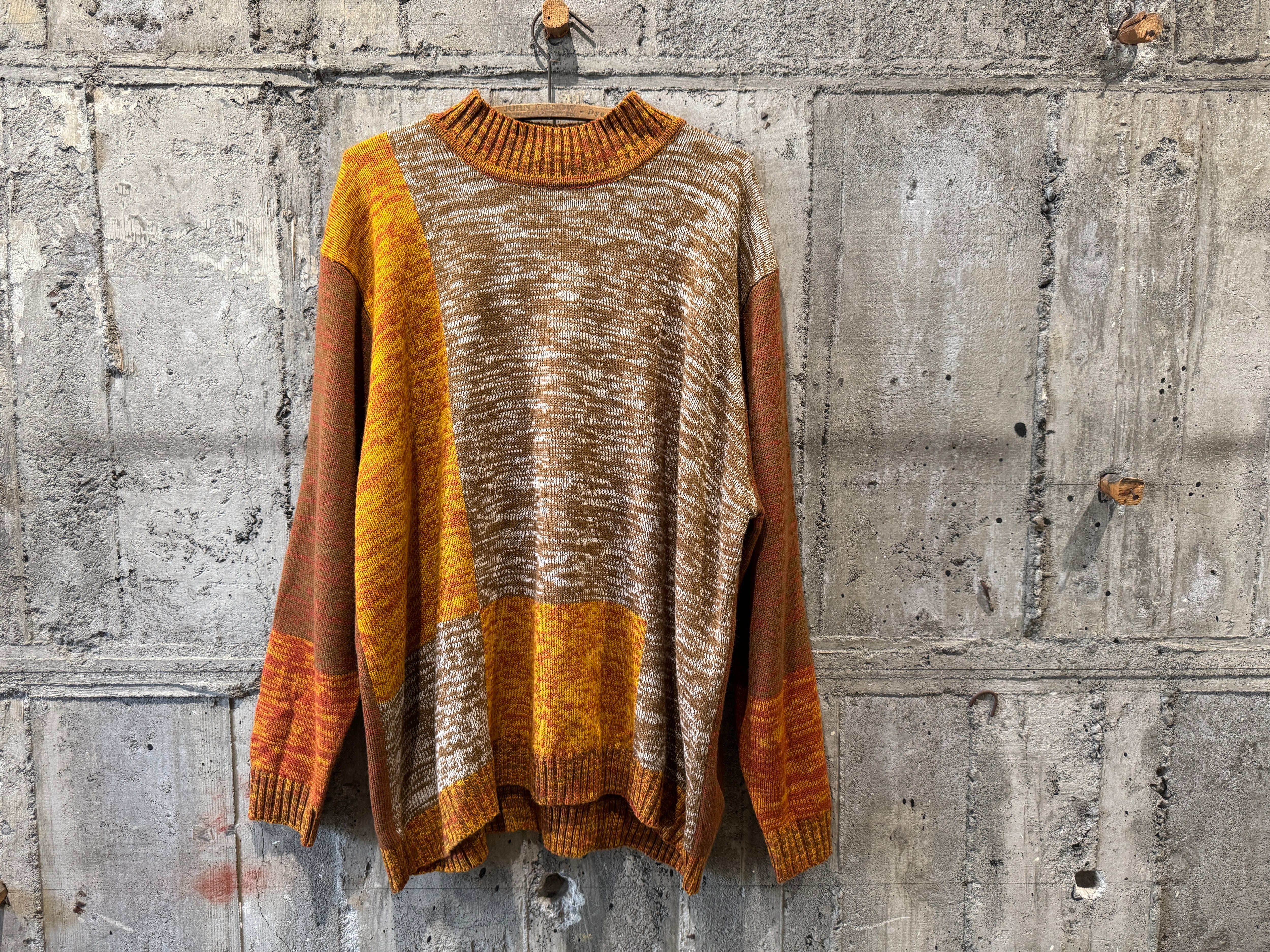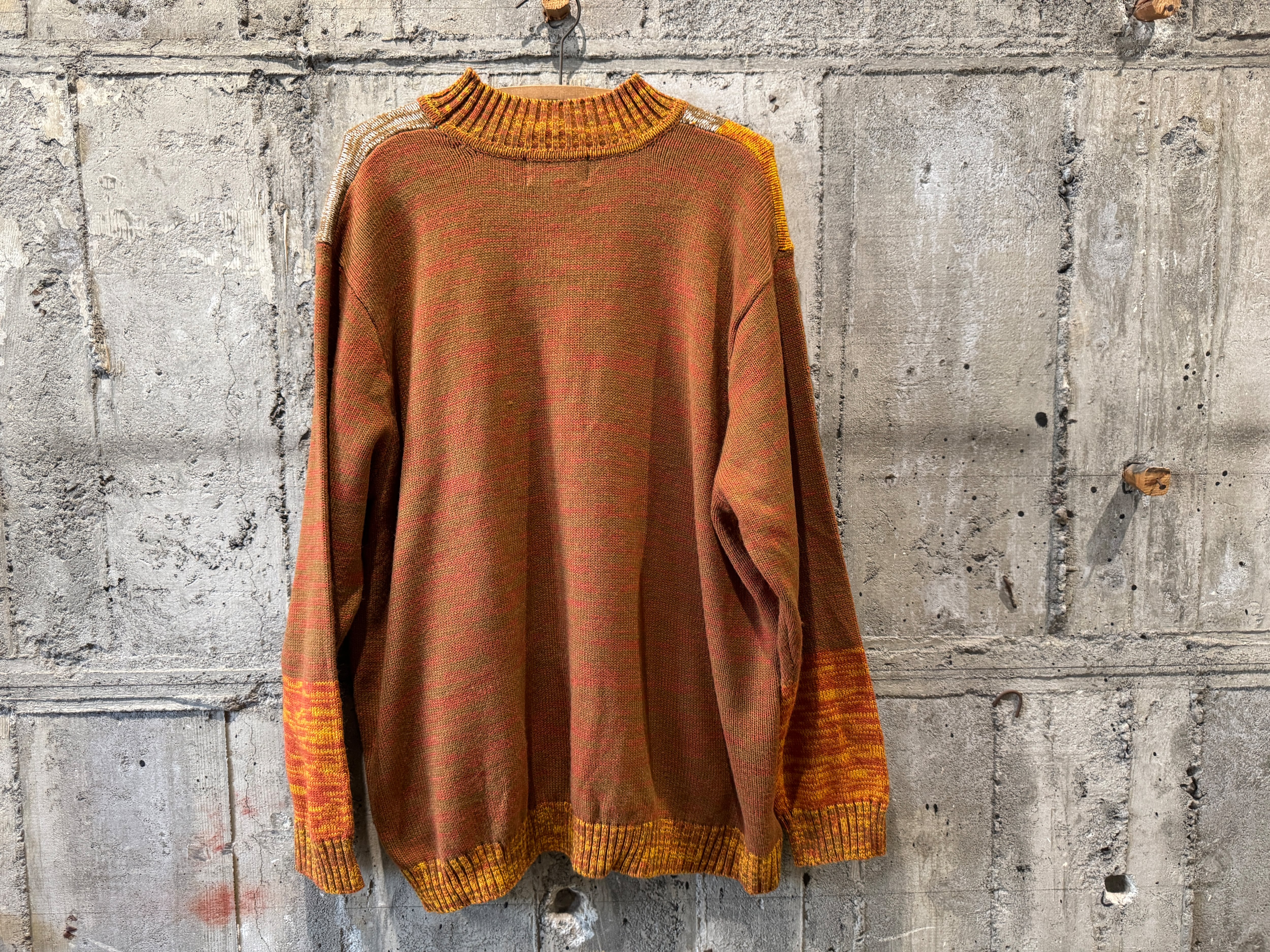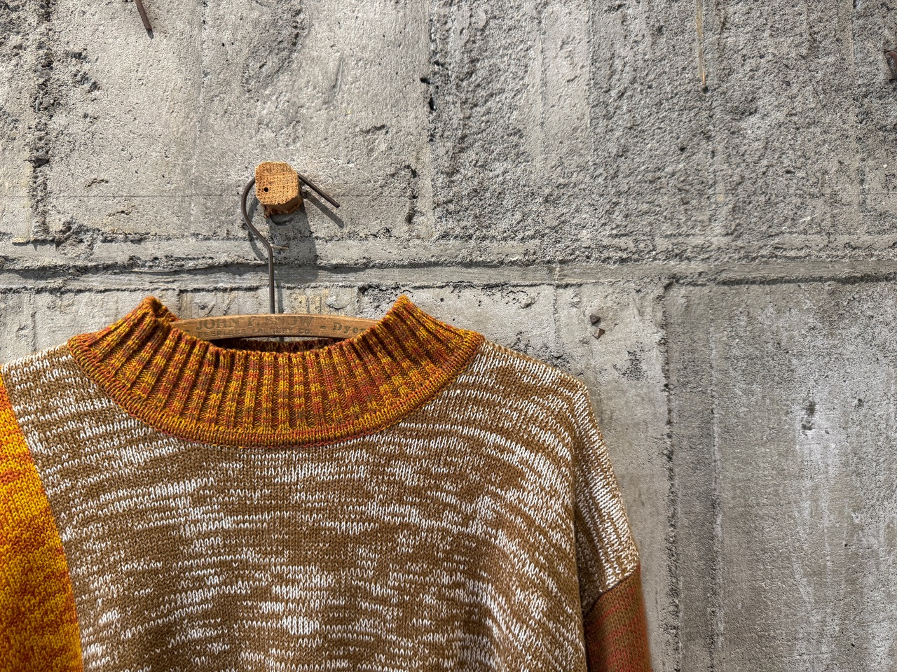 オレンジ×イエロー×ブラウン×ボルドー×ホワイトの様々なカラーのメランジ編みによる奥行きのあるデザインニットセーター。