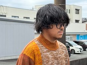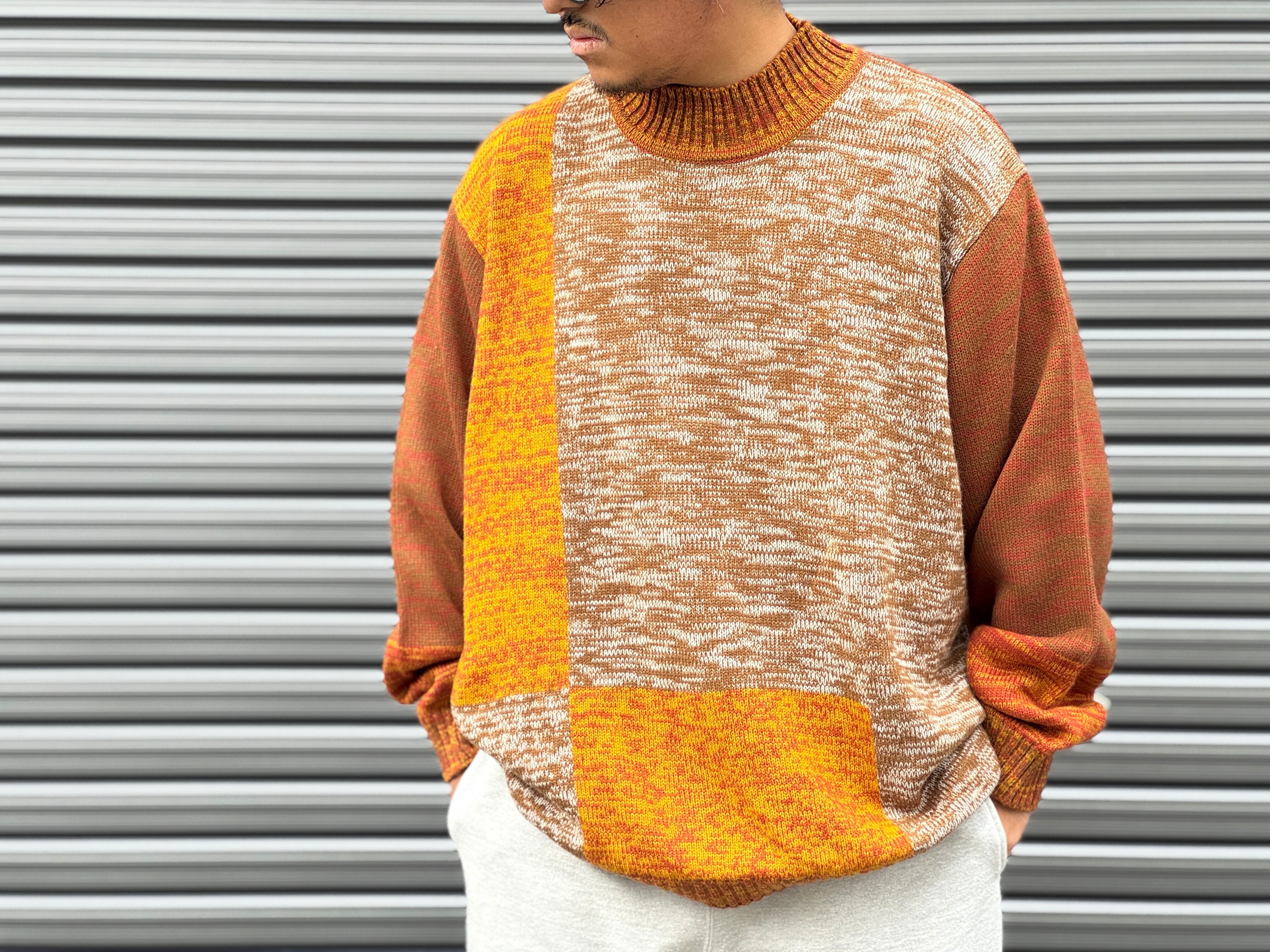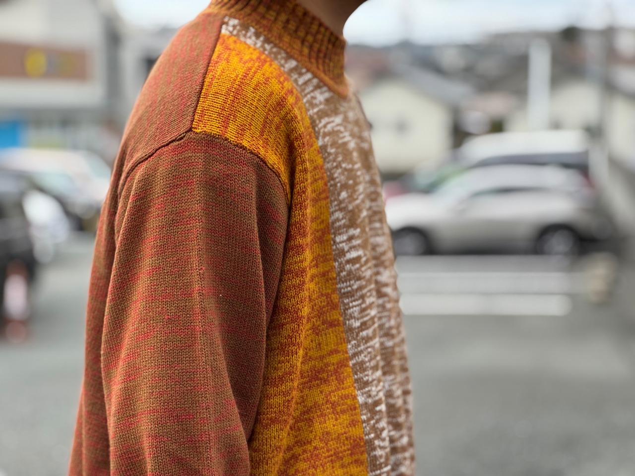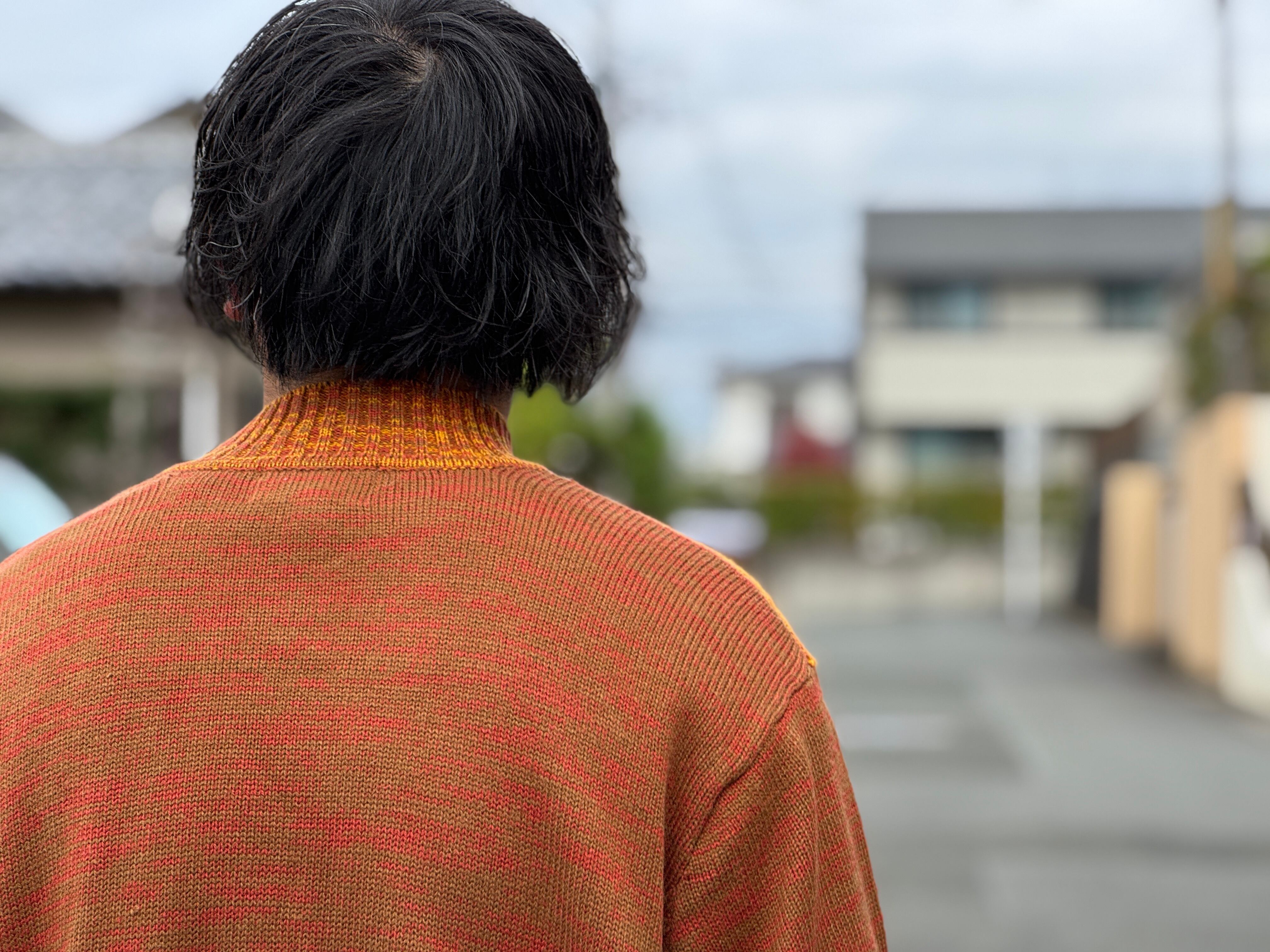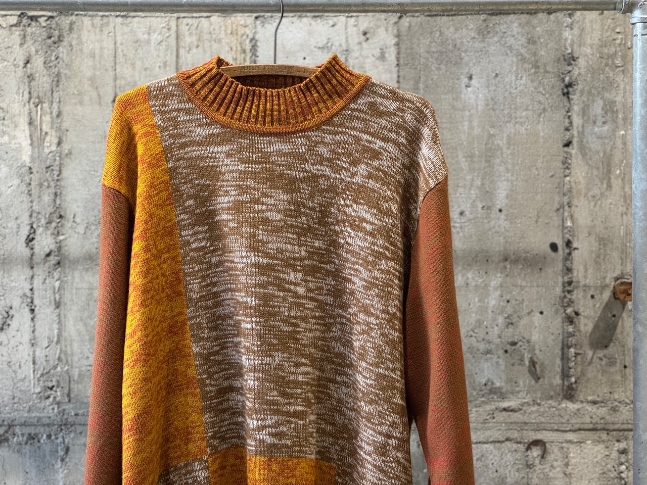 オレンジ×イエロー×ブラウン×ボルドー×ホワイトの様々なカラーのメランジ編みによる奥行きのあるデザインニットセーター。