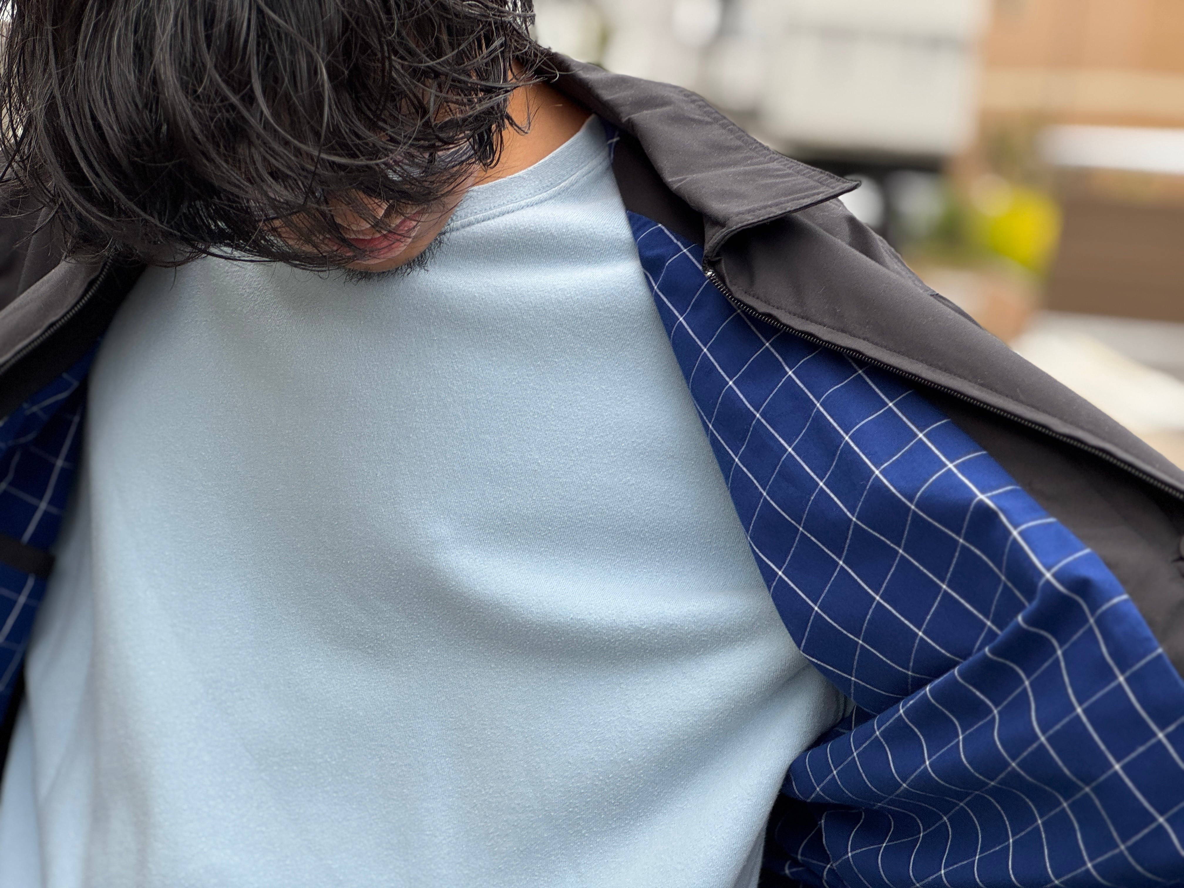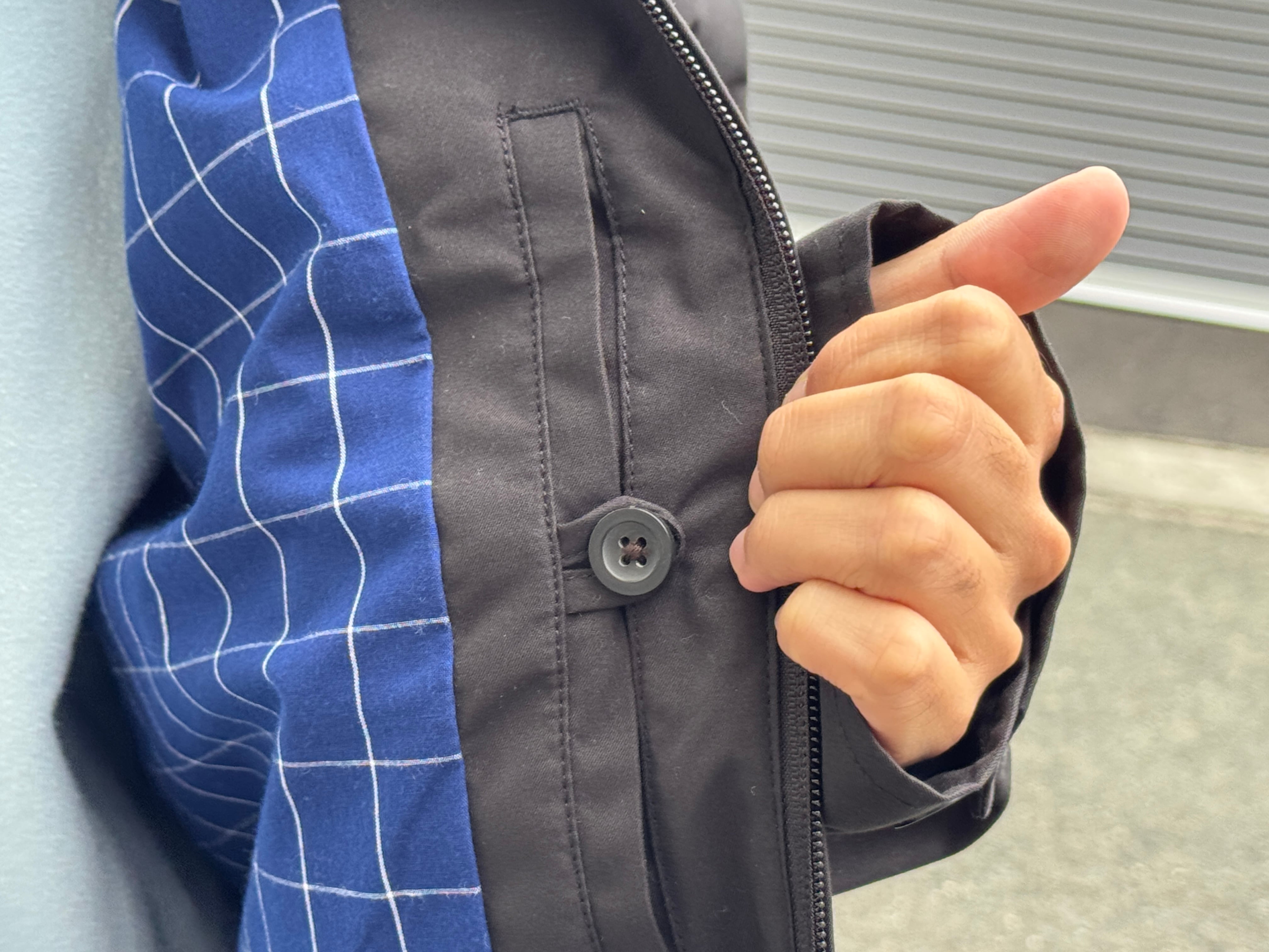 ボディと同色の胸のロゴ、ミニマルなデザインながら裏のウィンドウペンチェックパターンに惹かれました。内側にポケットが2つ配してあります。