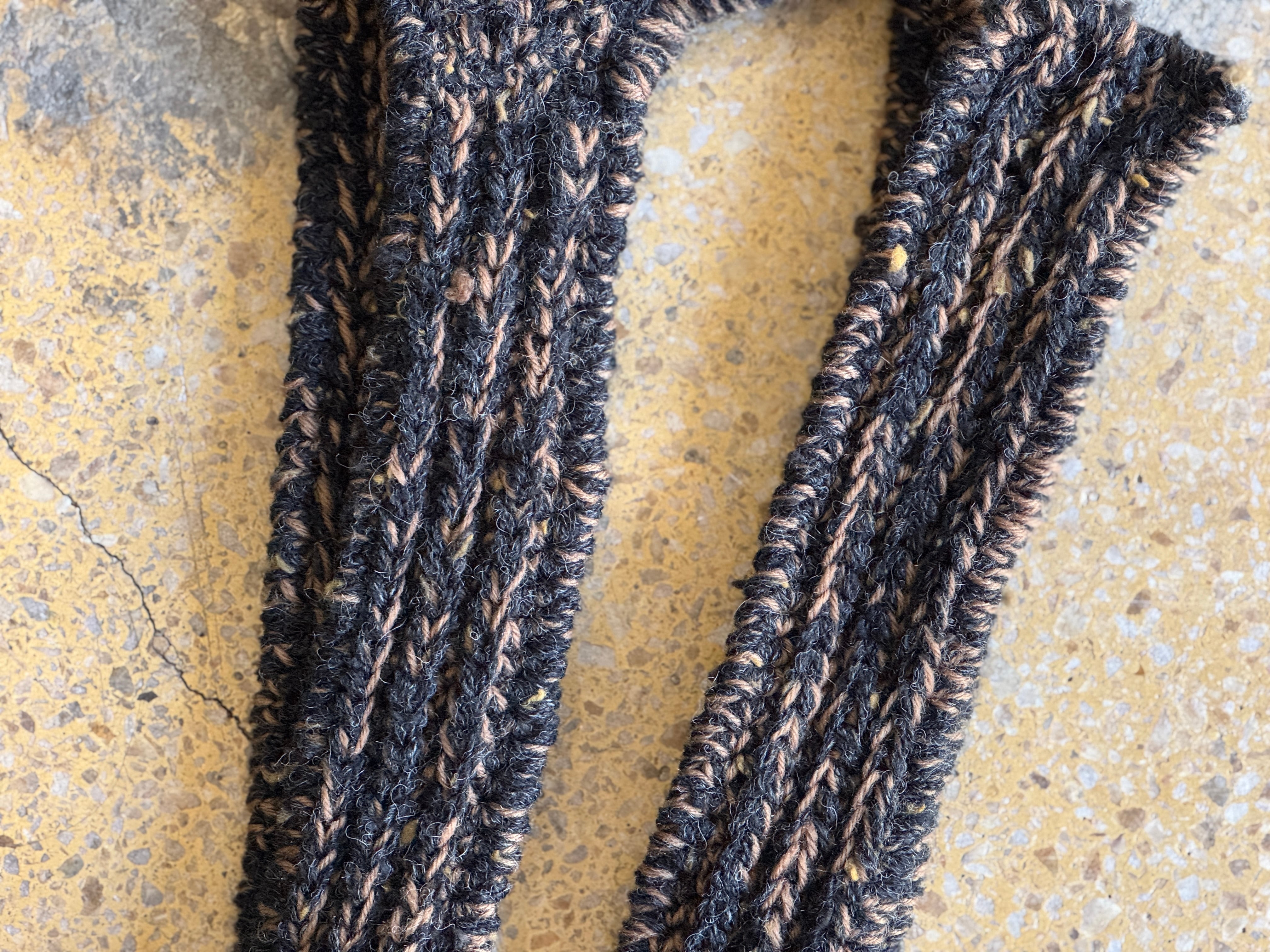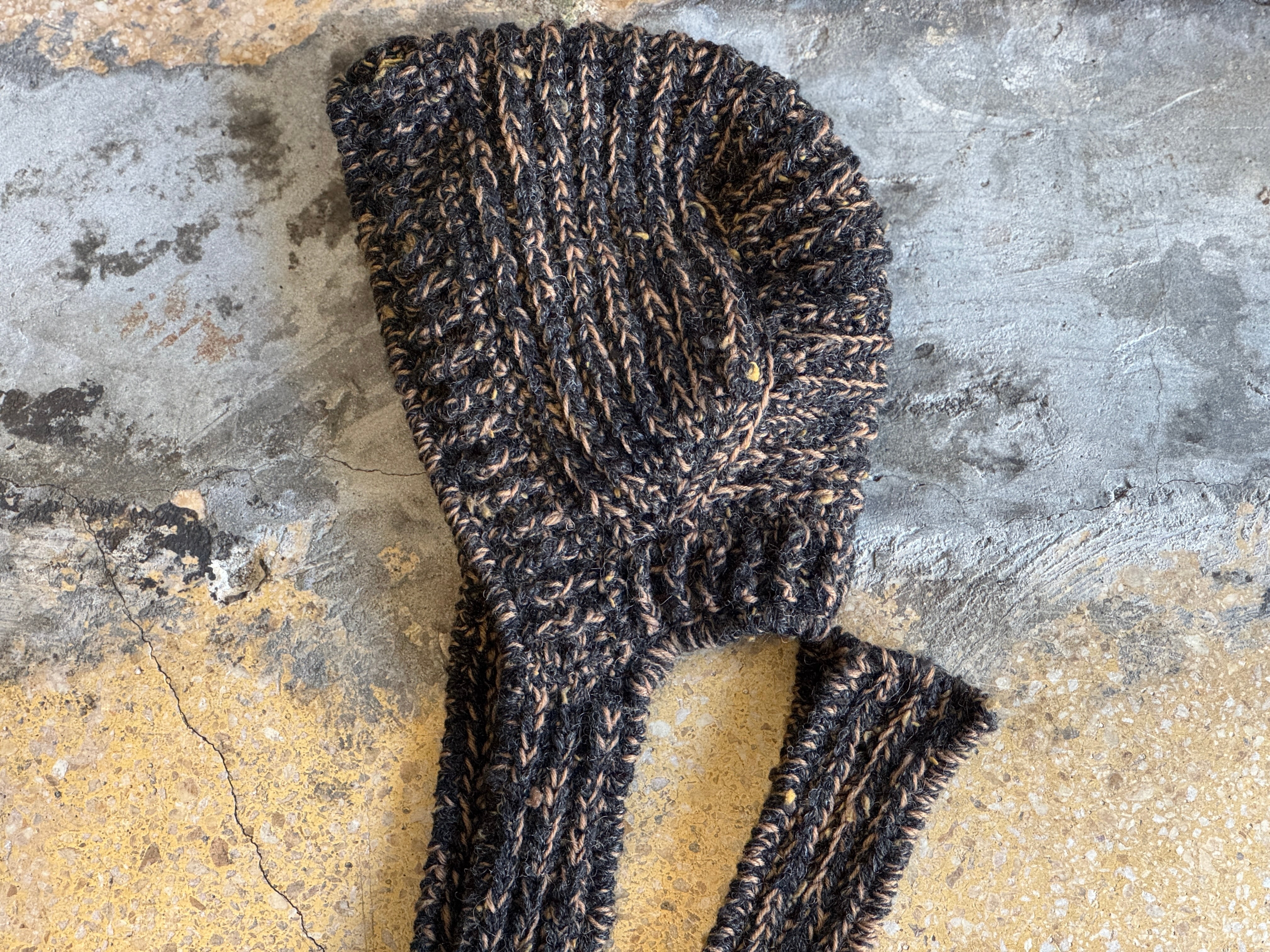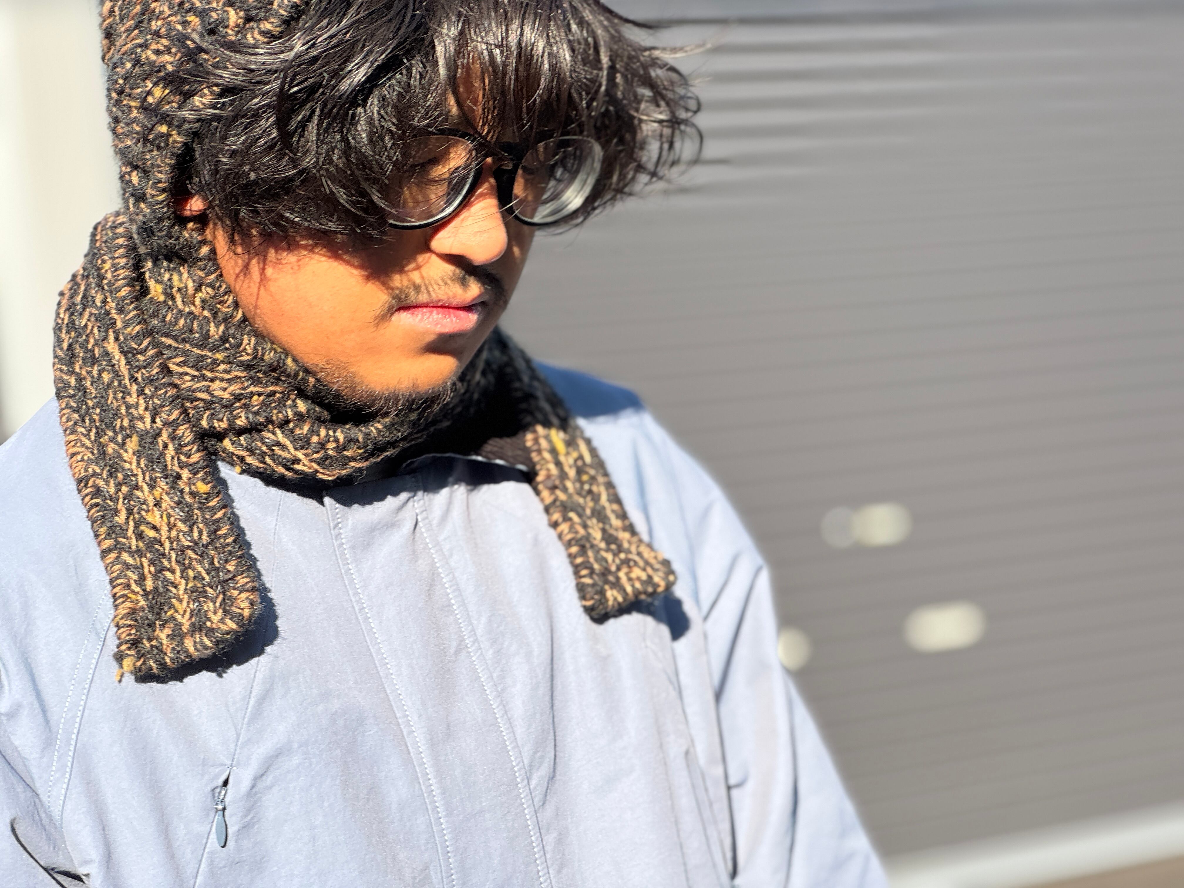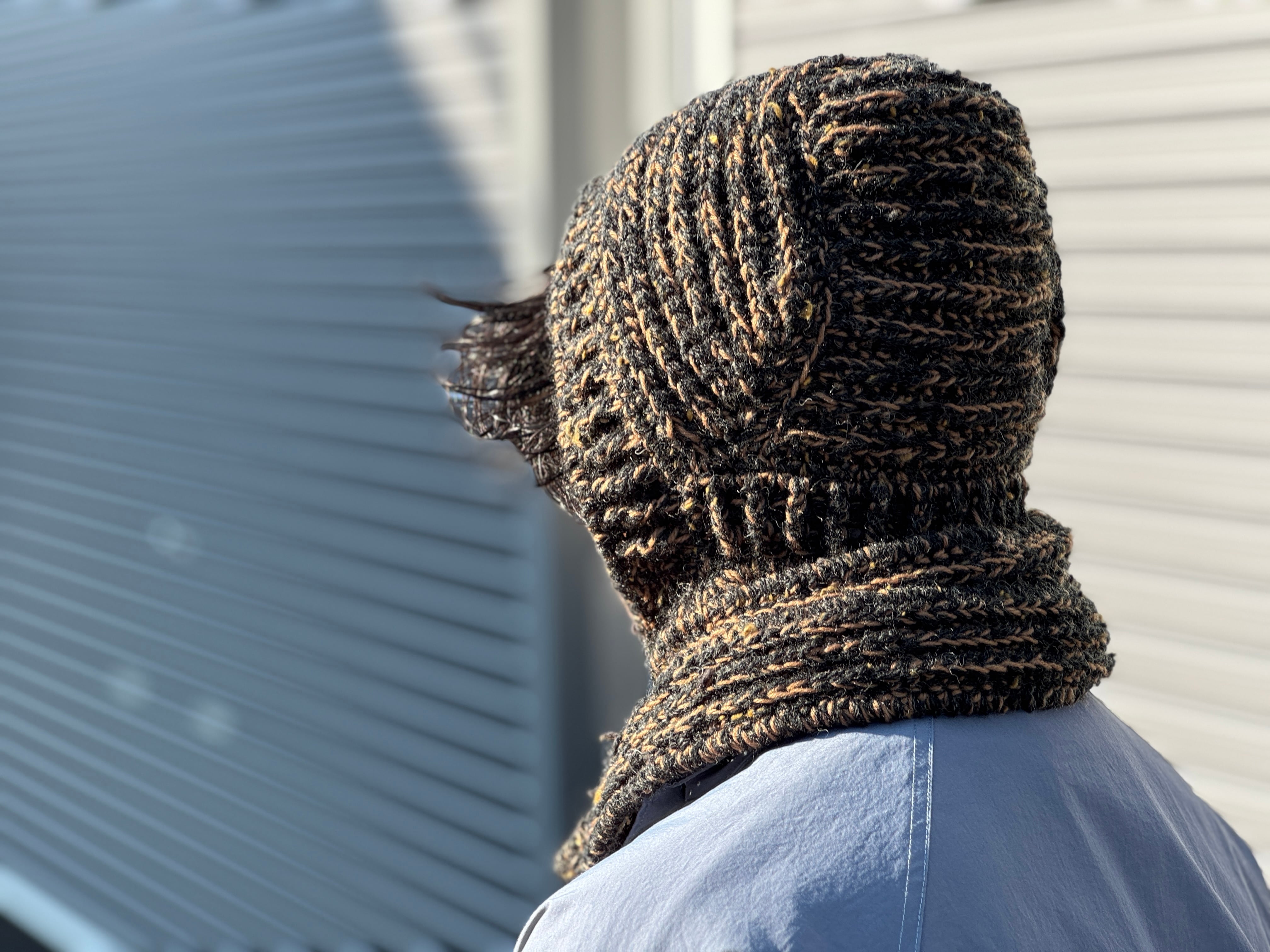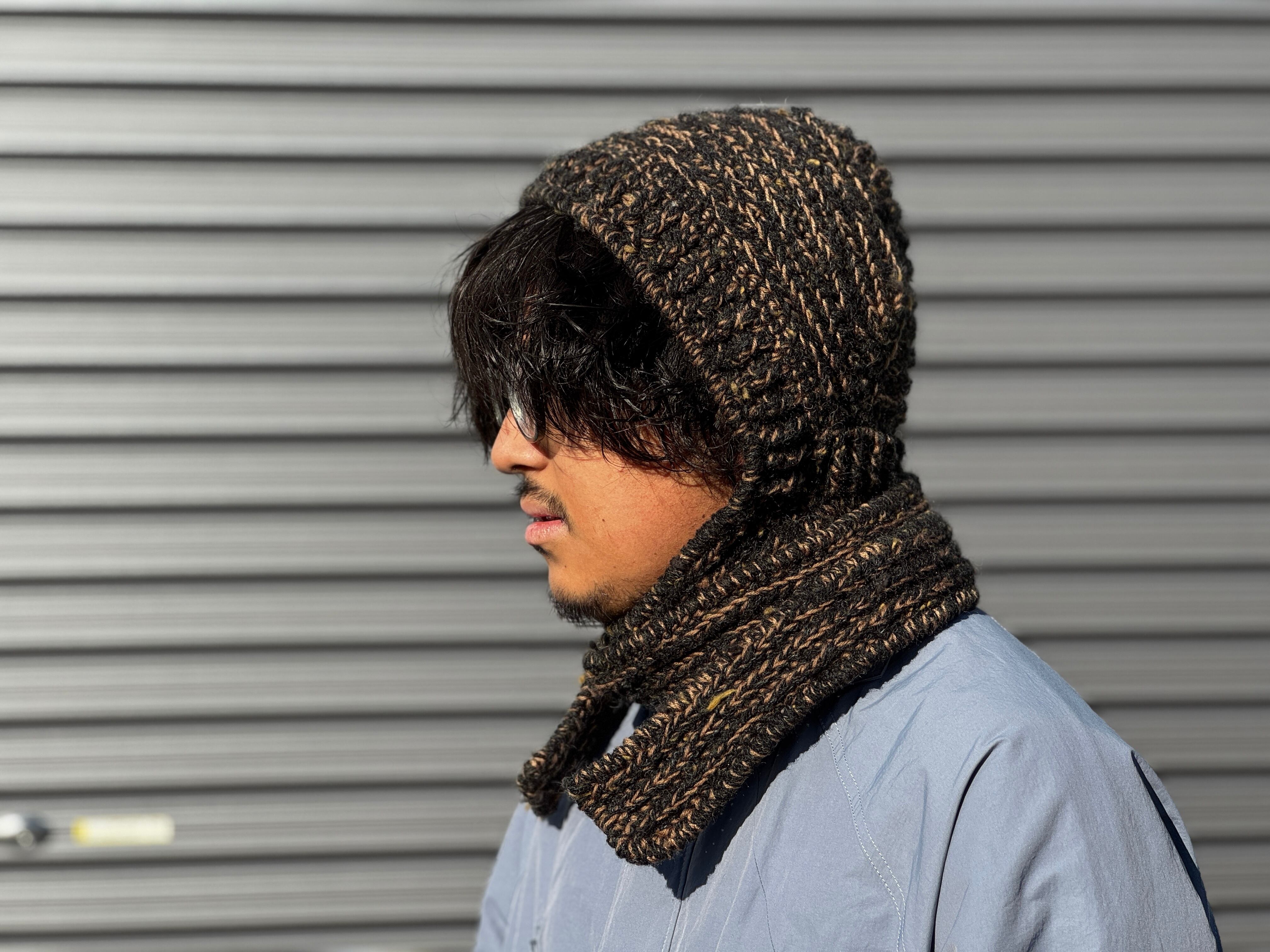 新作は肌触りが良く被り心地の良いウールを使用。ブラック×ブラウンのミックスカラー絶妙。コードは垂らしたままでも良いし、首に巻くとマフラーライクな暖かさがあり、かぶるのをやめるとフード感覚なスタイリングが楽しめます。