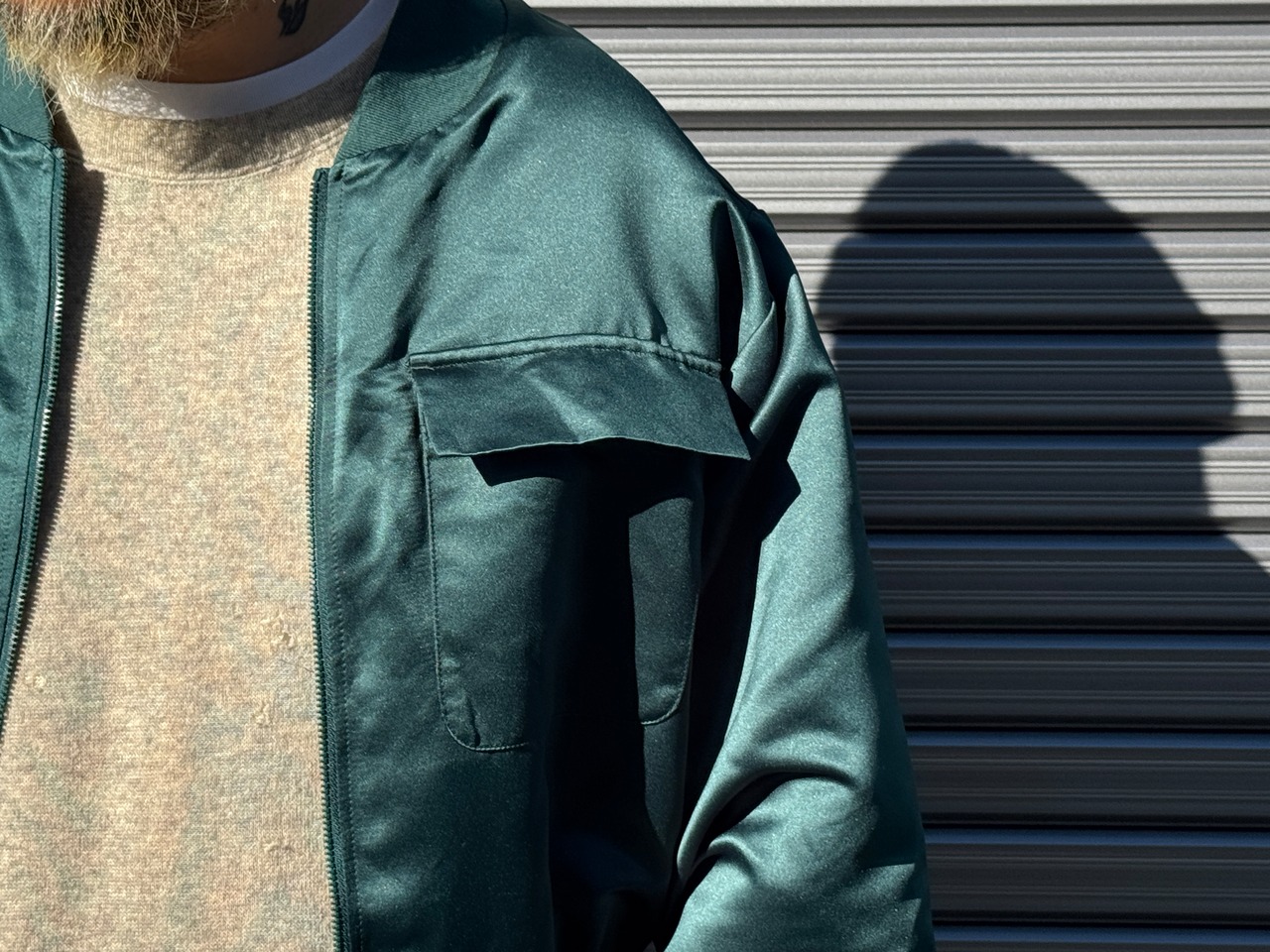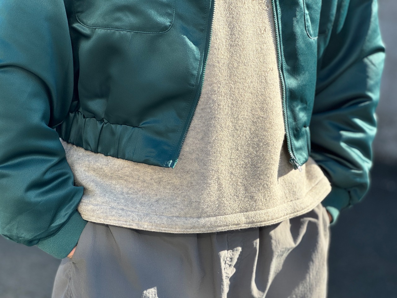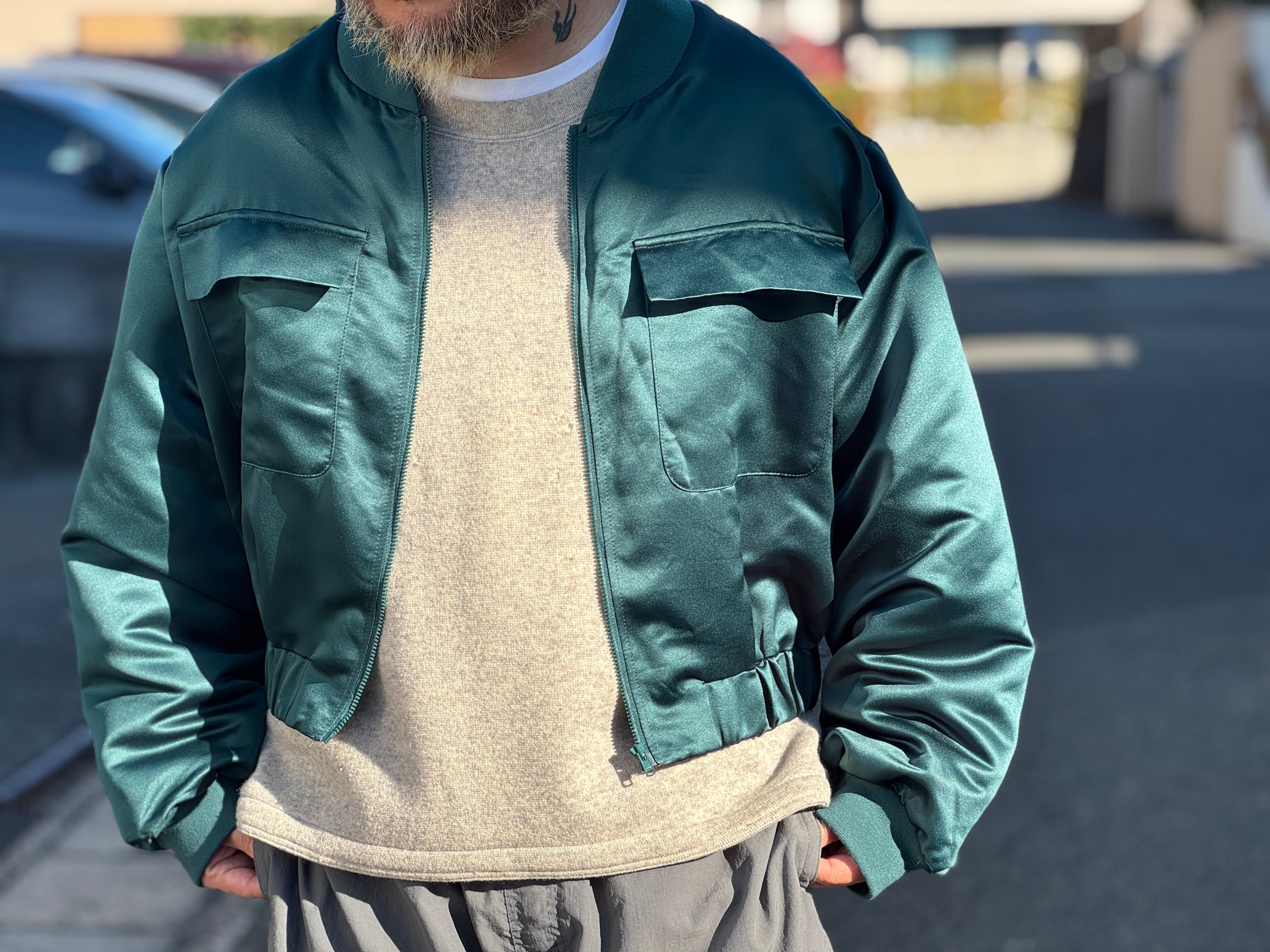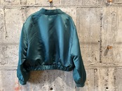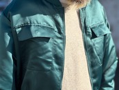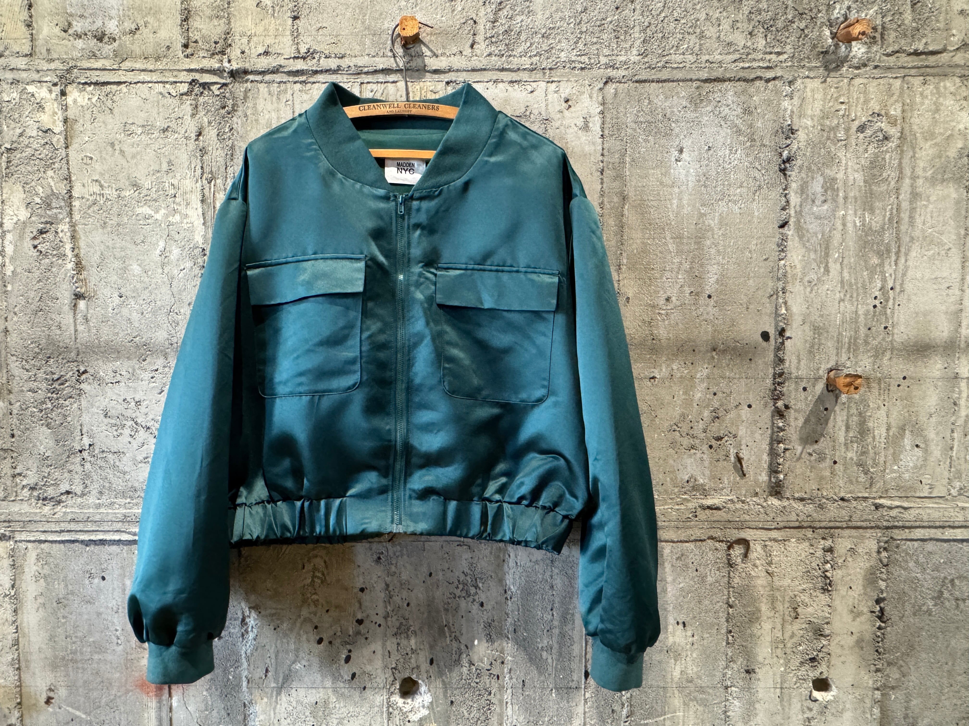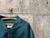 光沢感のあるグリーンカラーのサテン生地のデザインブルゾン。
