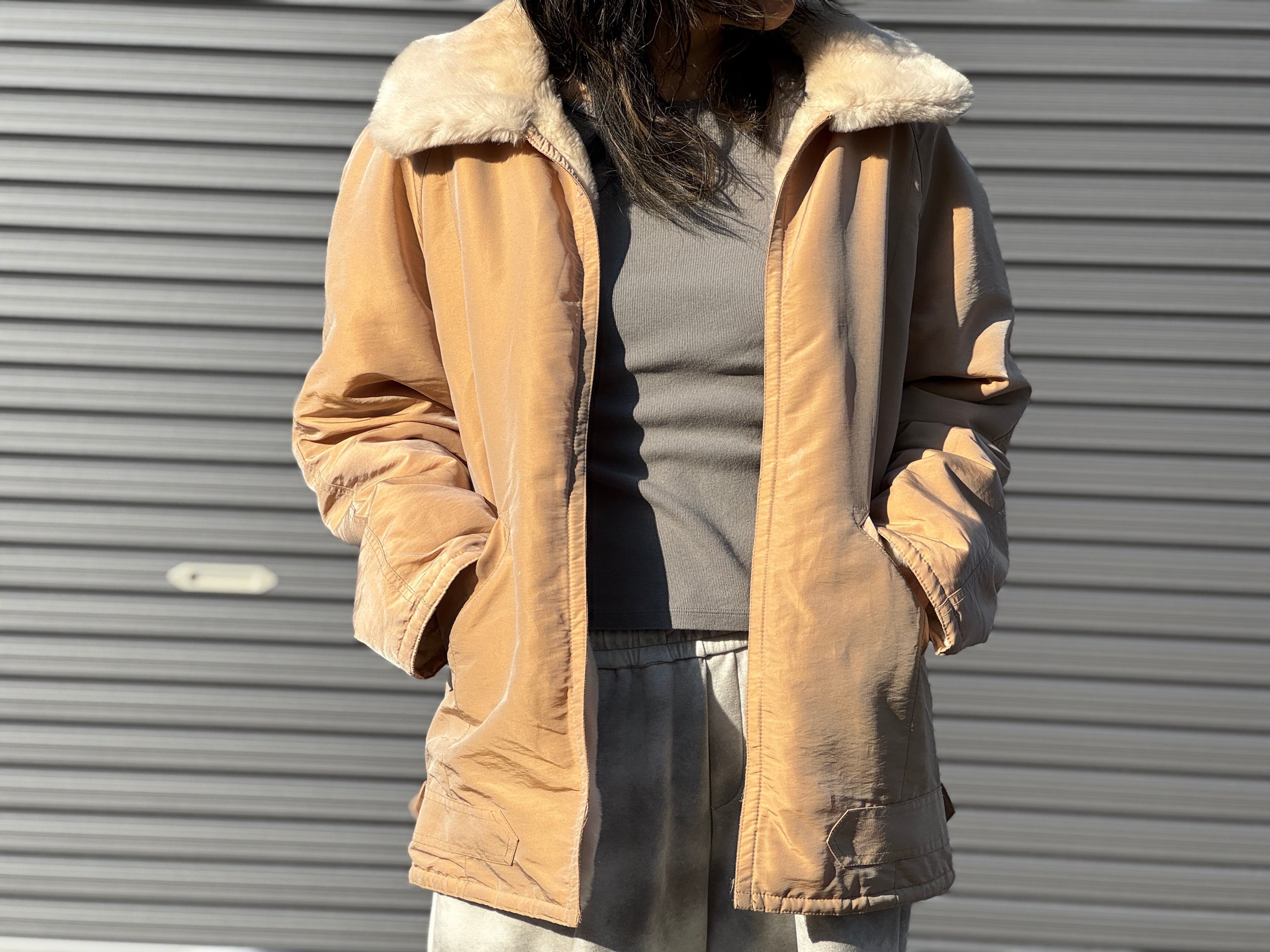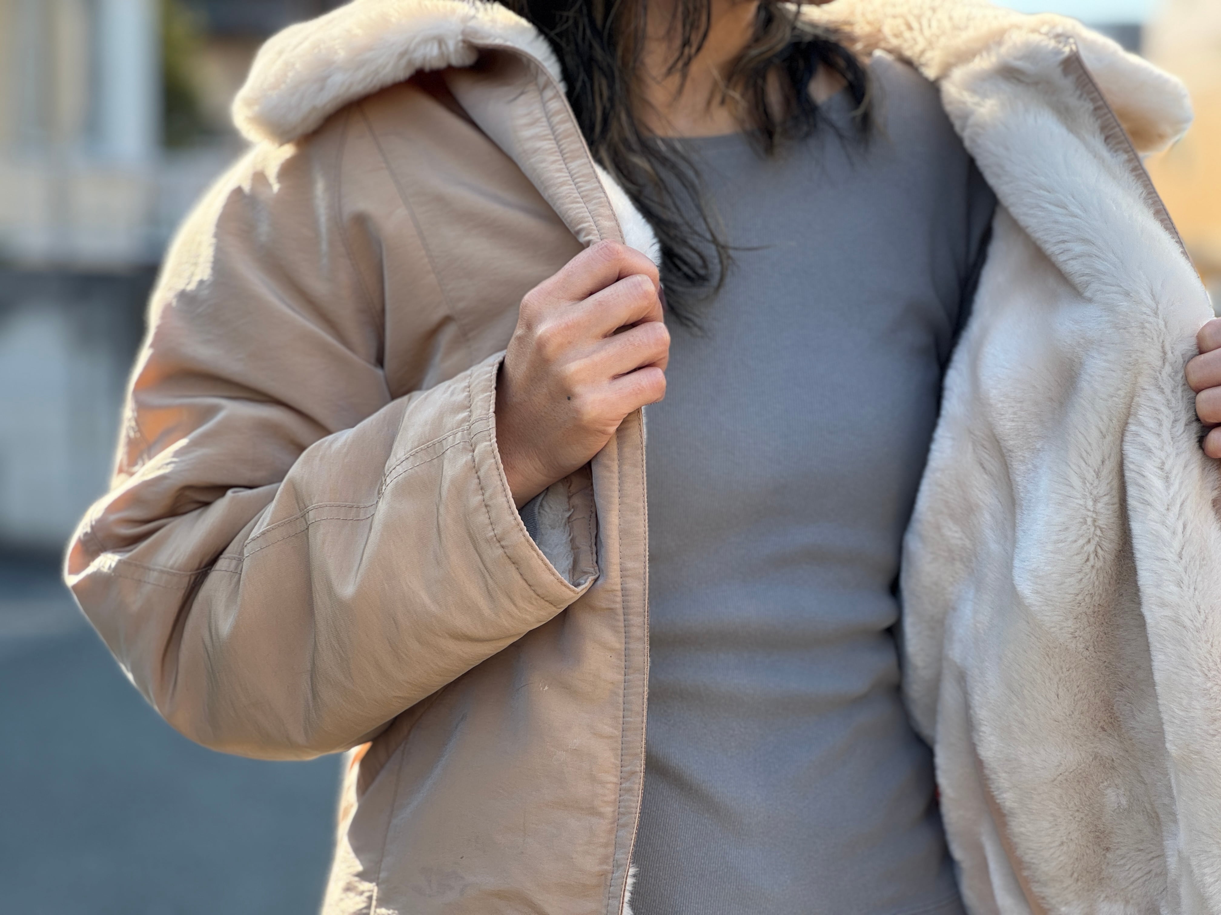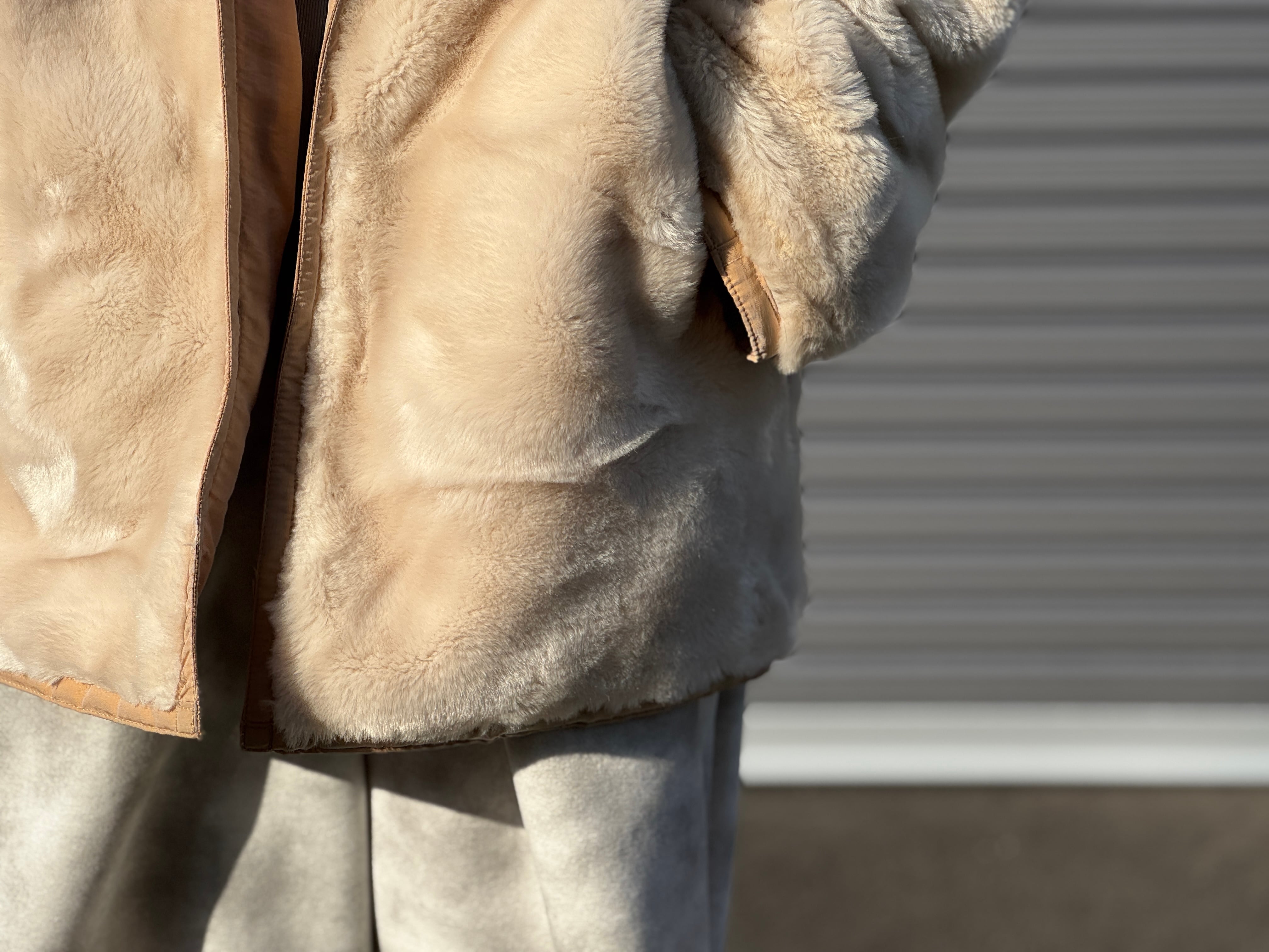 高密度なナイロン×フェイクファーのリバーシブルです。