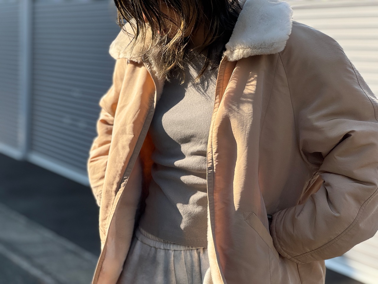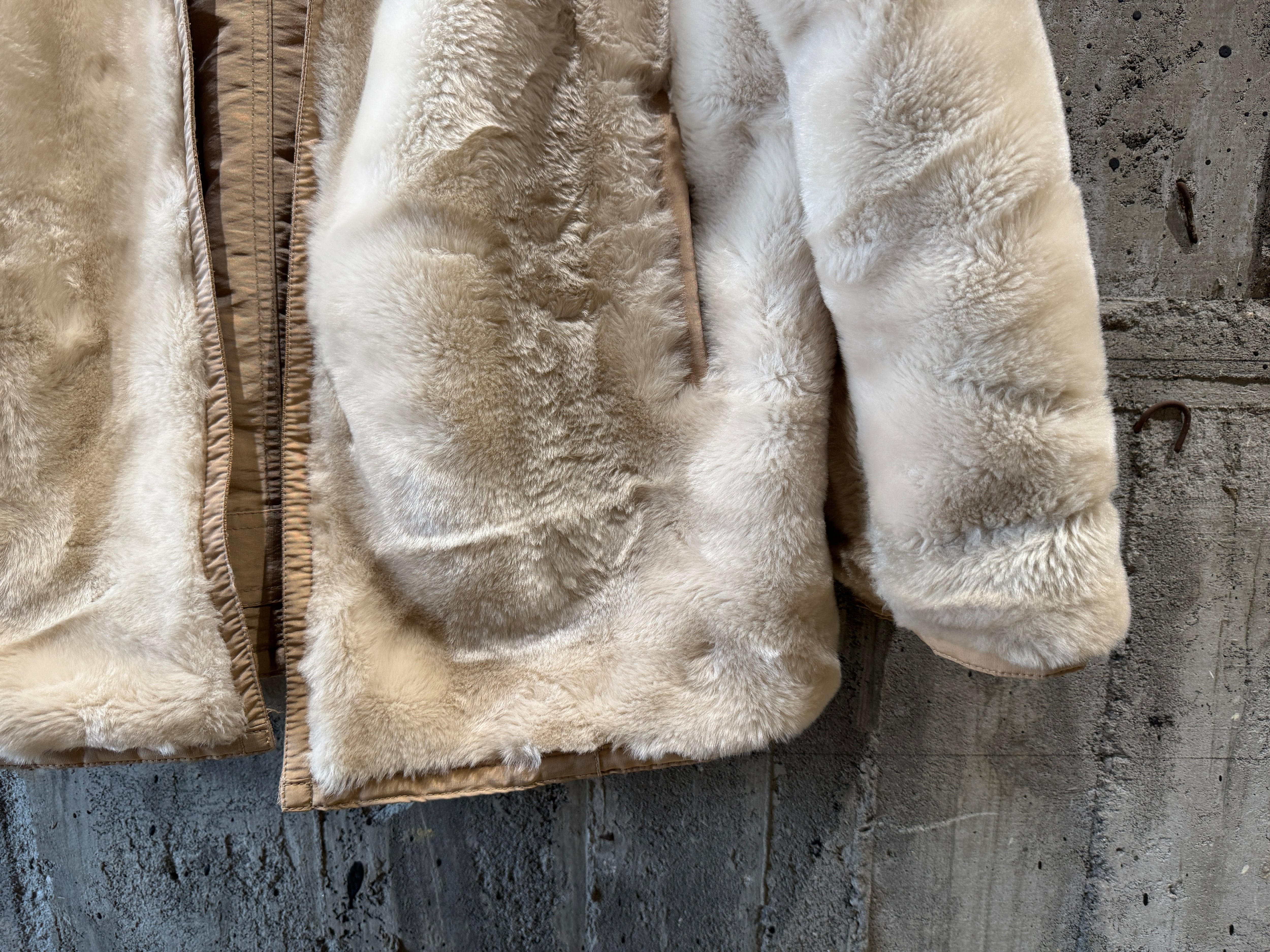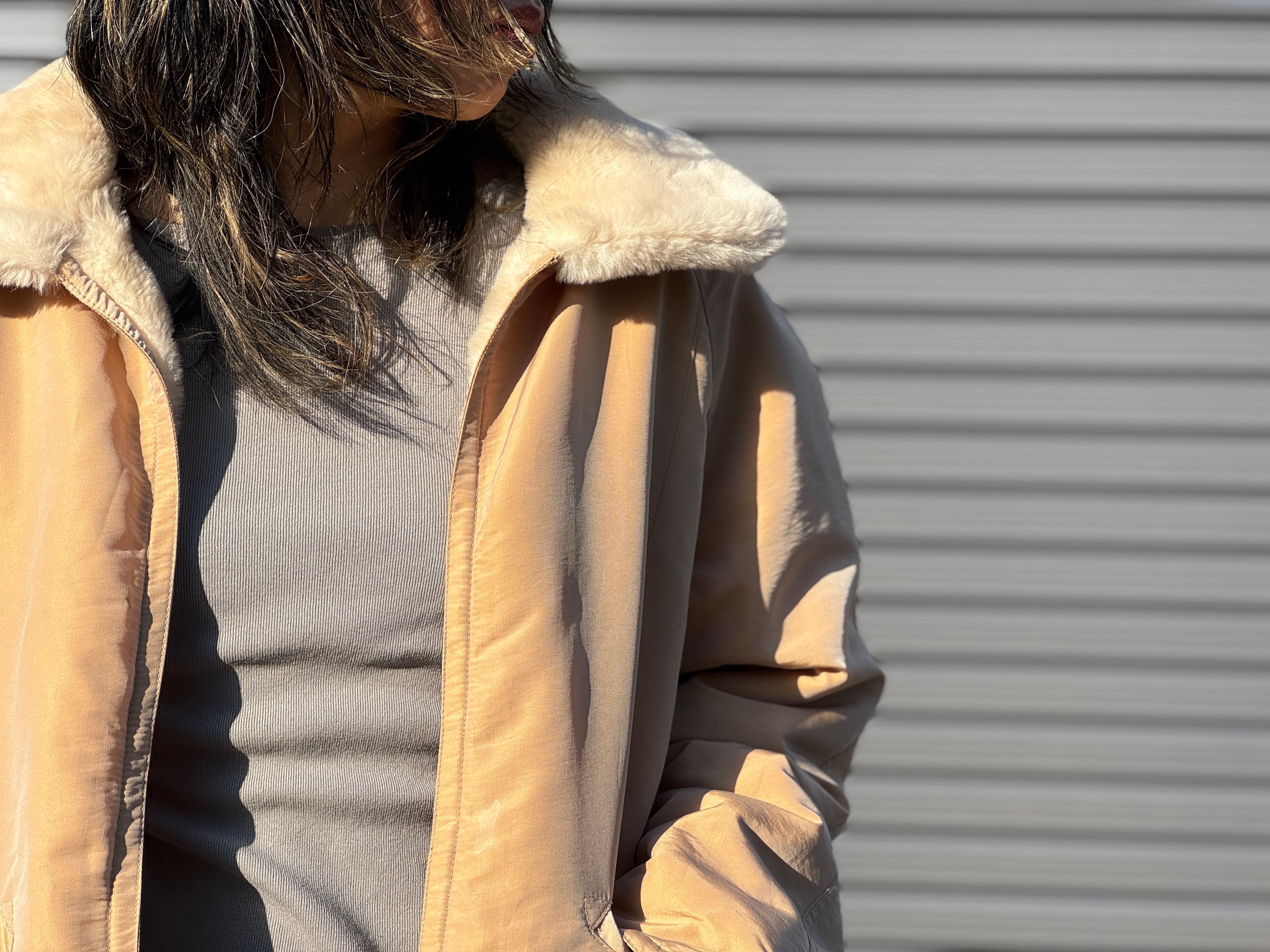 高密度なナイロン×フェイクファーのリバーシブルです。