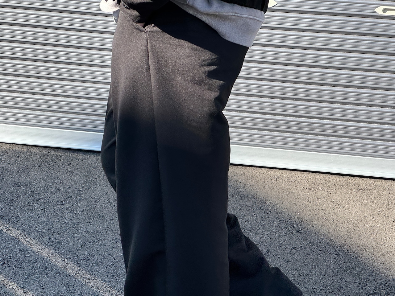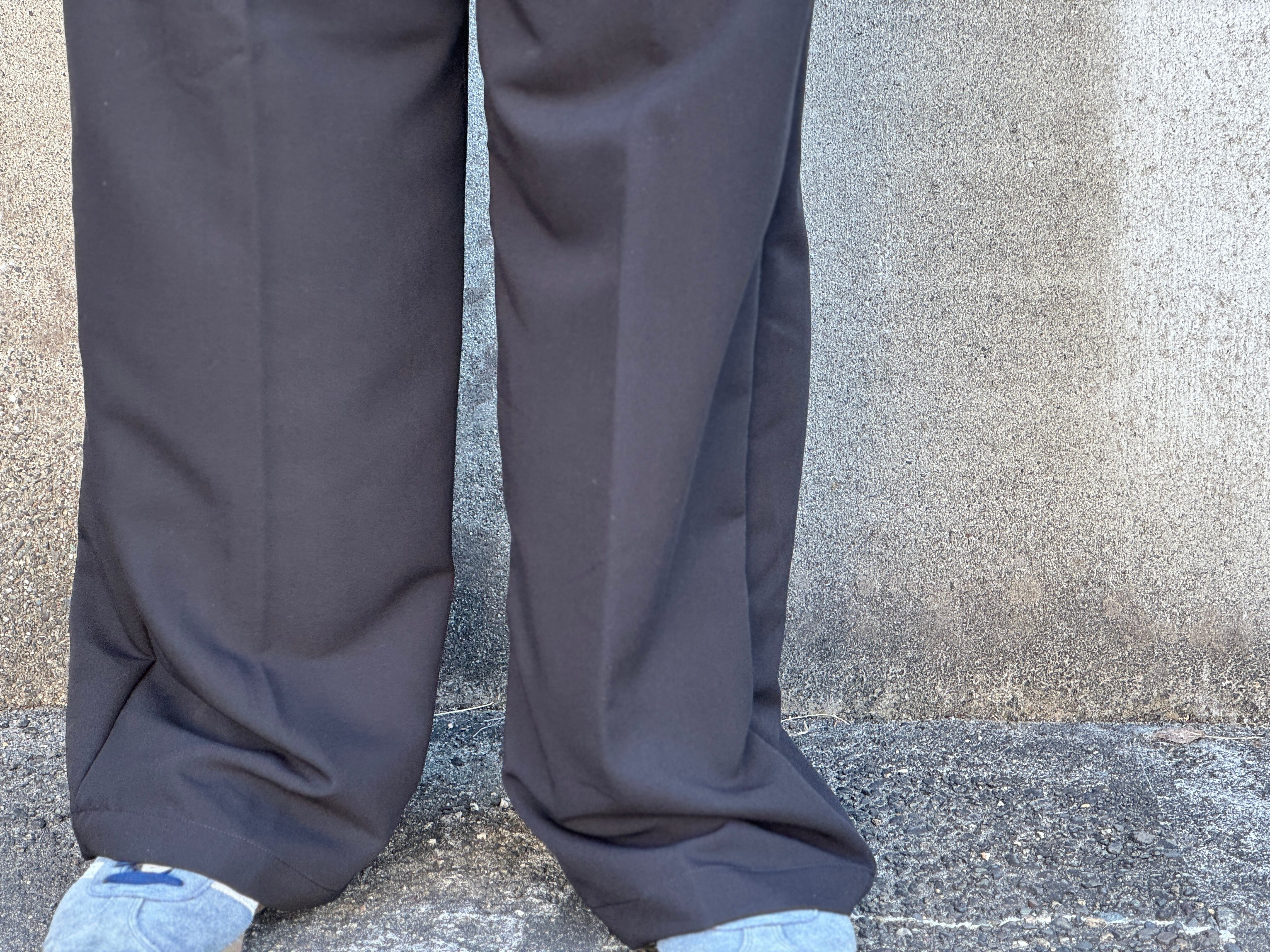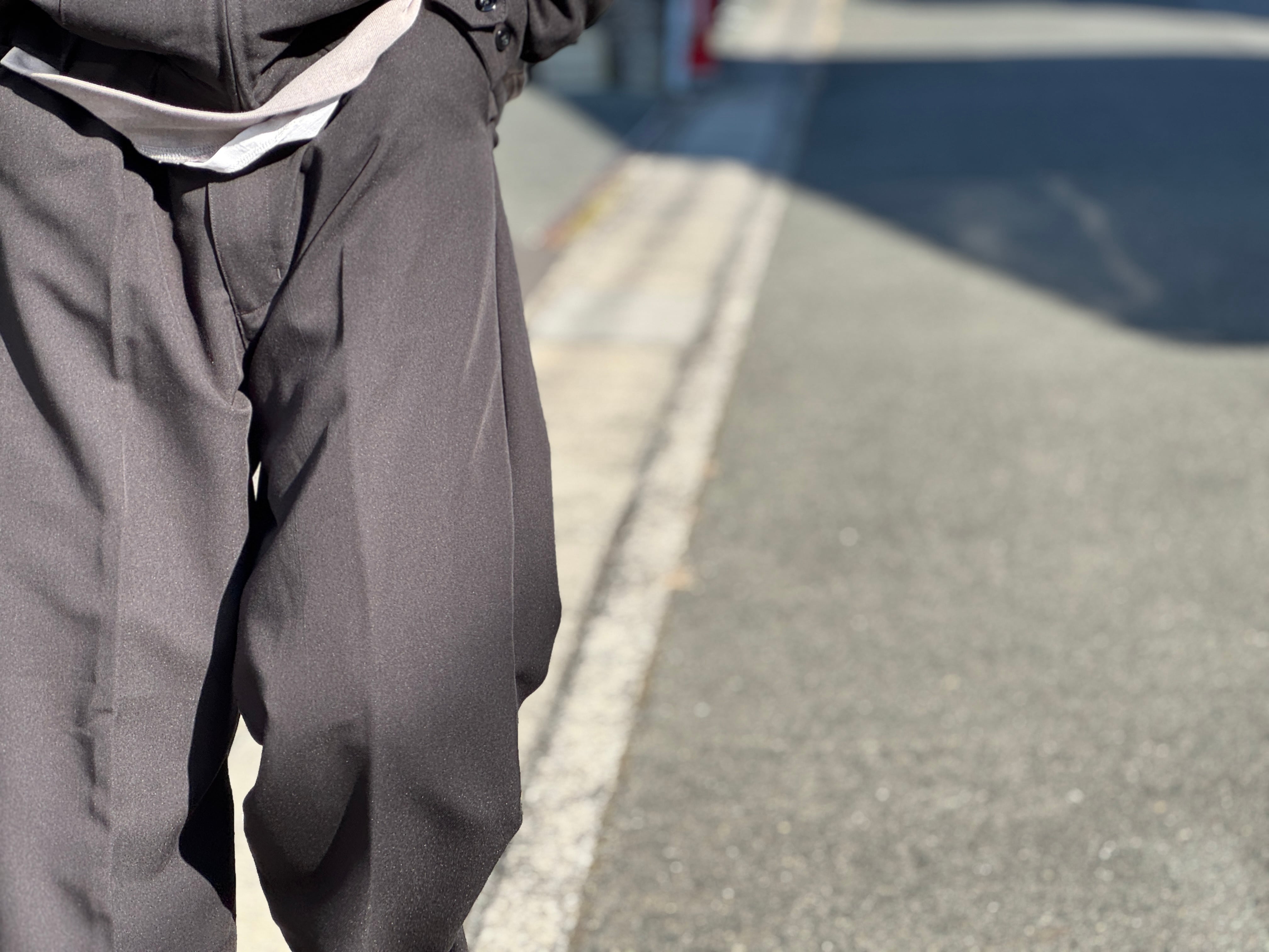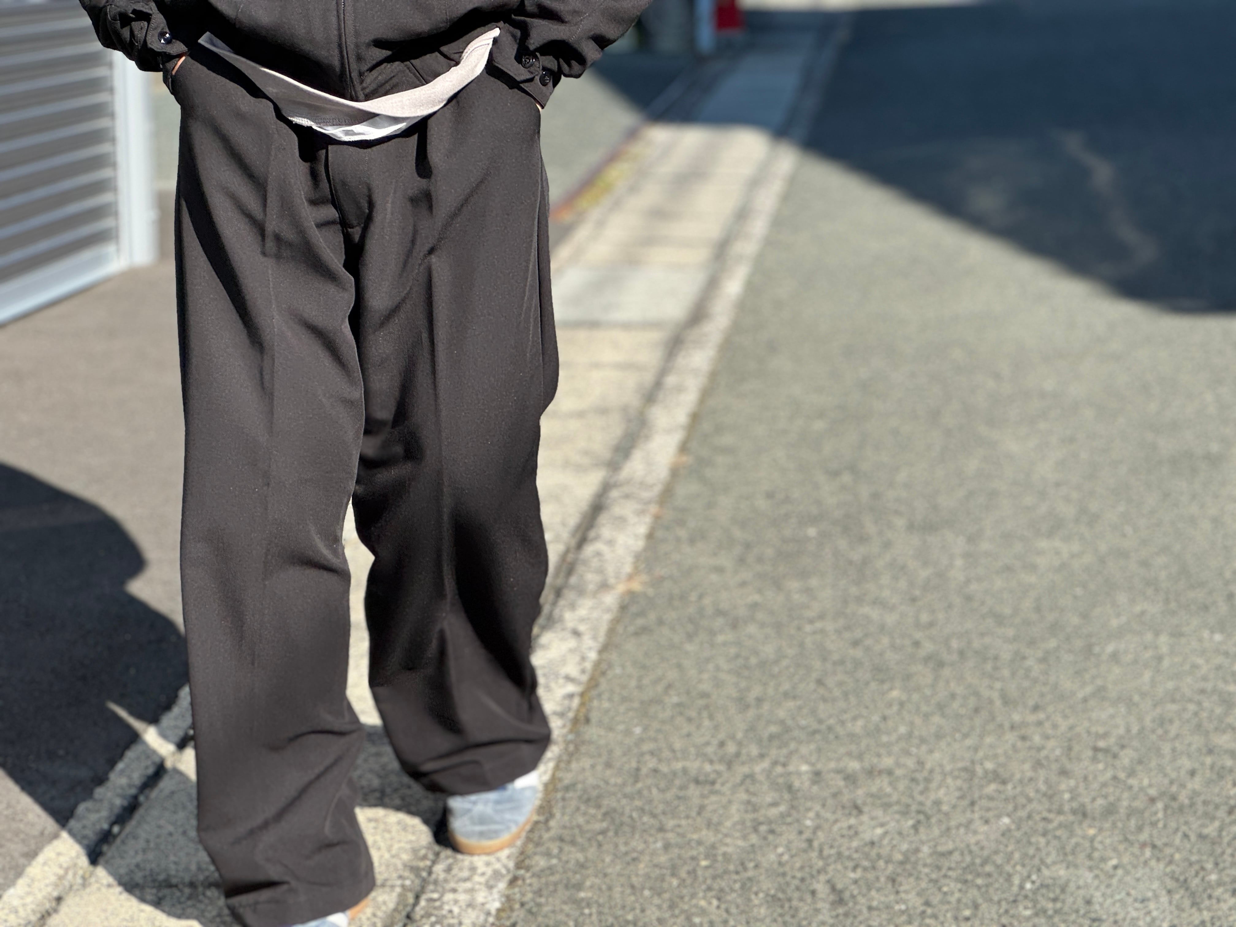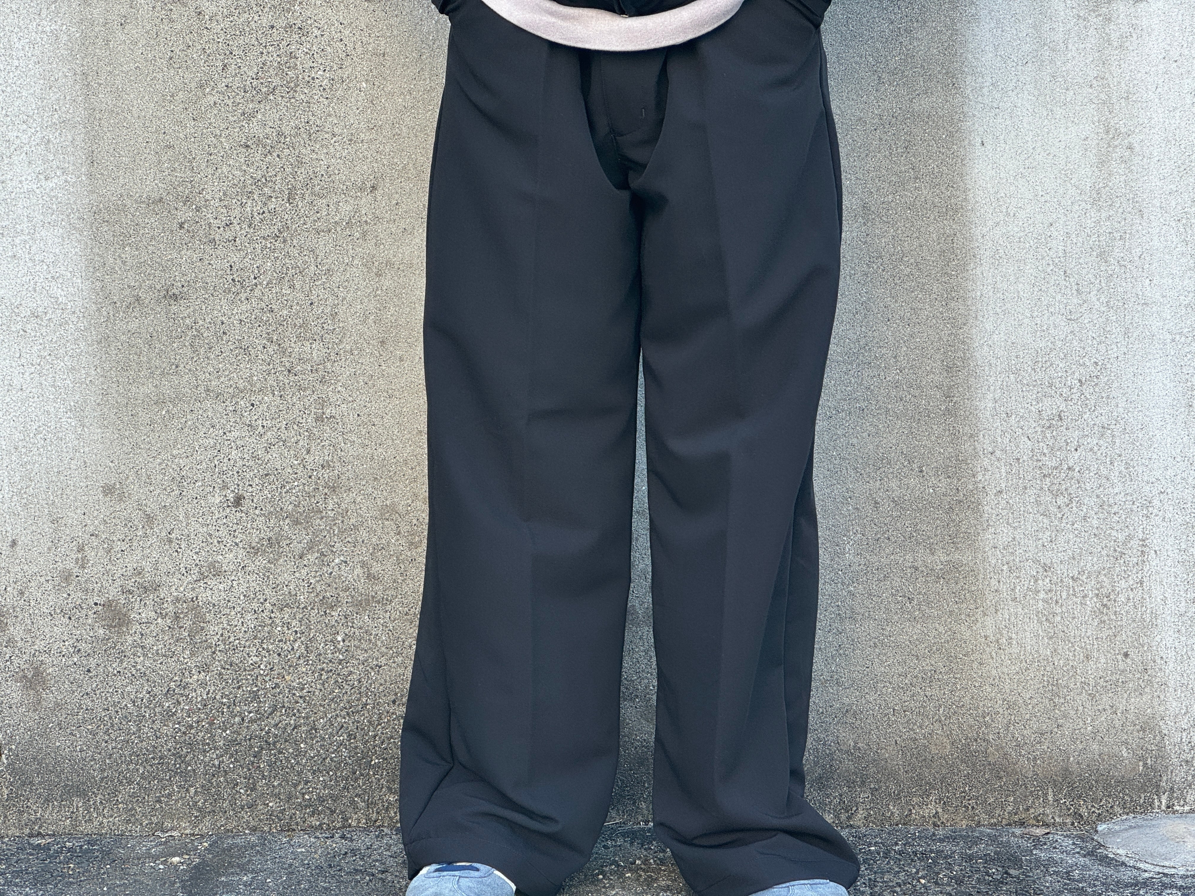 1タックでセンタープレスの入った程よくワイドなシルエット。ウエストはゴムとコードのイージー仕様なので快適な穿き心地です。