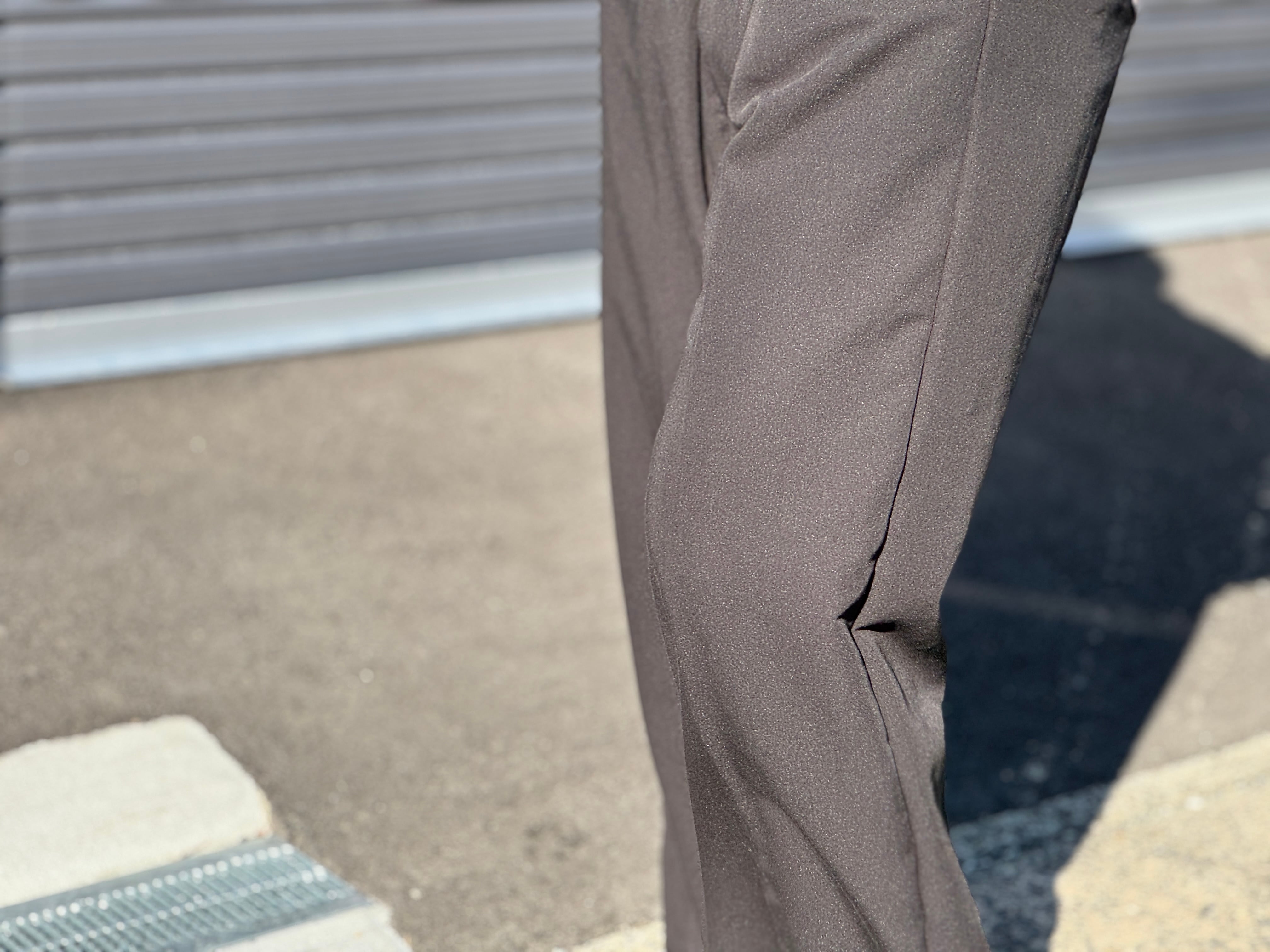 上品な光沢、滑らかな肌触り、ドレープ性を兼ね備えているモダンな生地感のデザインスラックス。