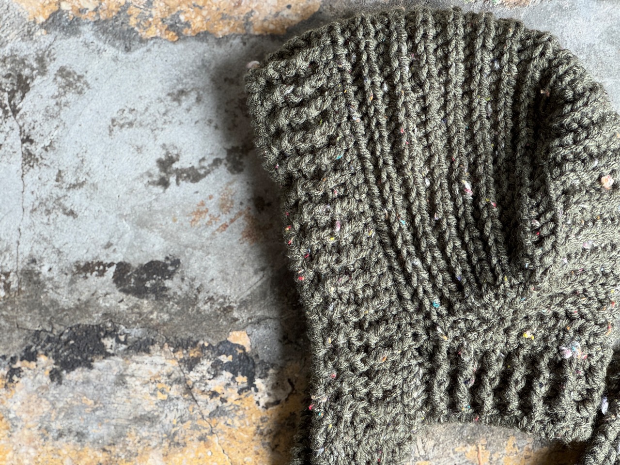 高品質なアクリルを使用。カラーはオリーブ。様々なカラーのネップが散りばめられています。手編みによる丁寧に編まれ、肌触り・被り心地は抜群。