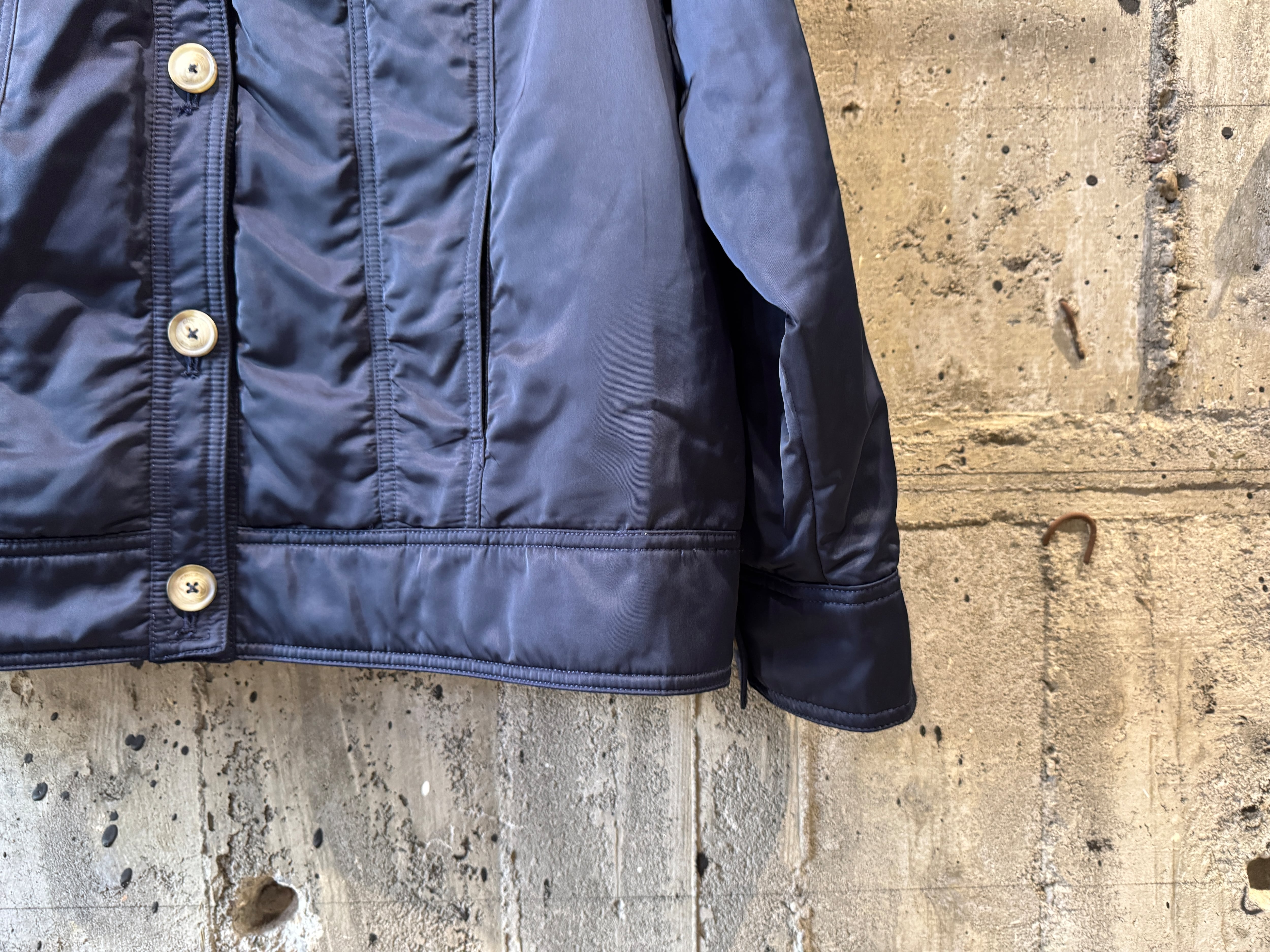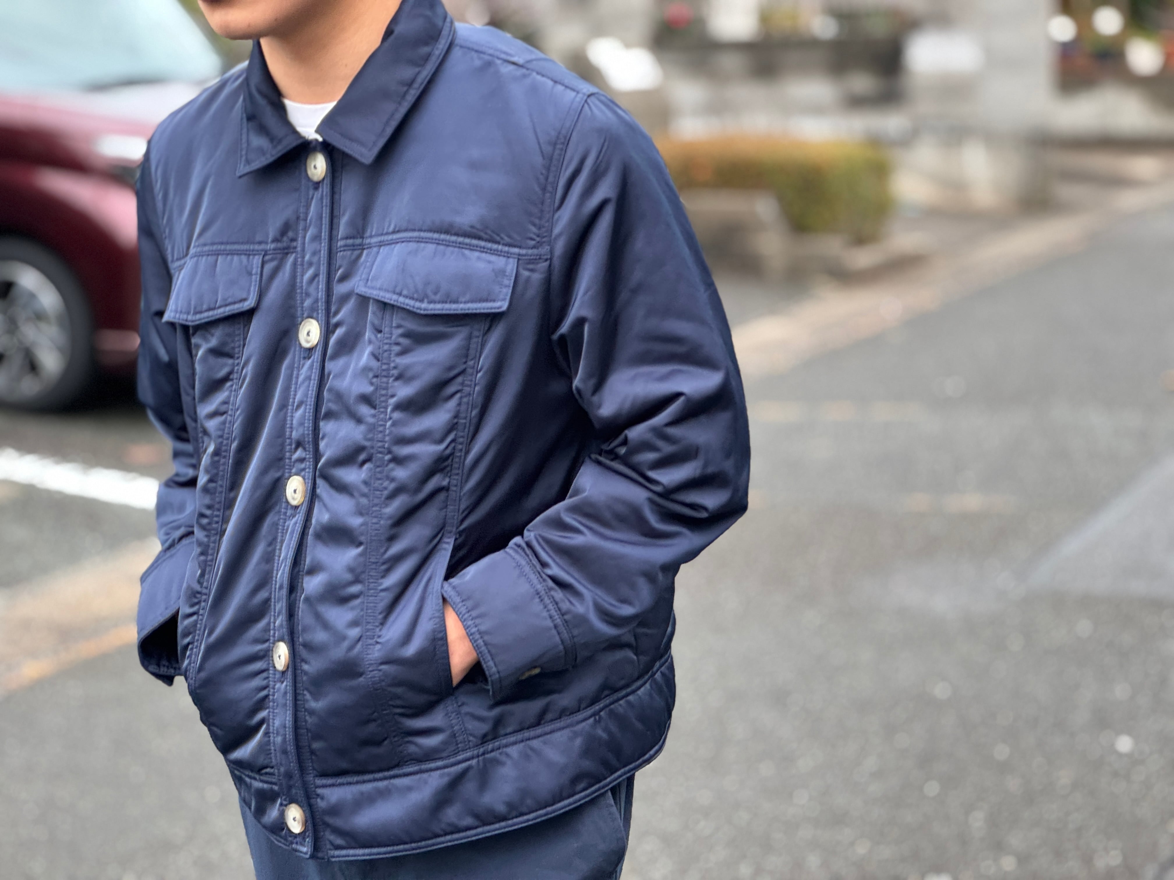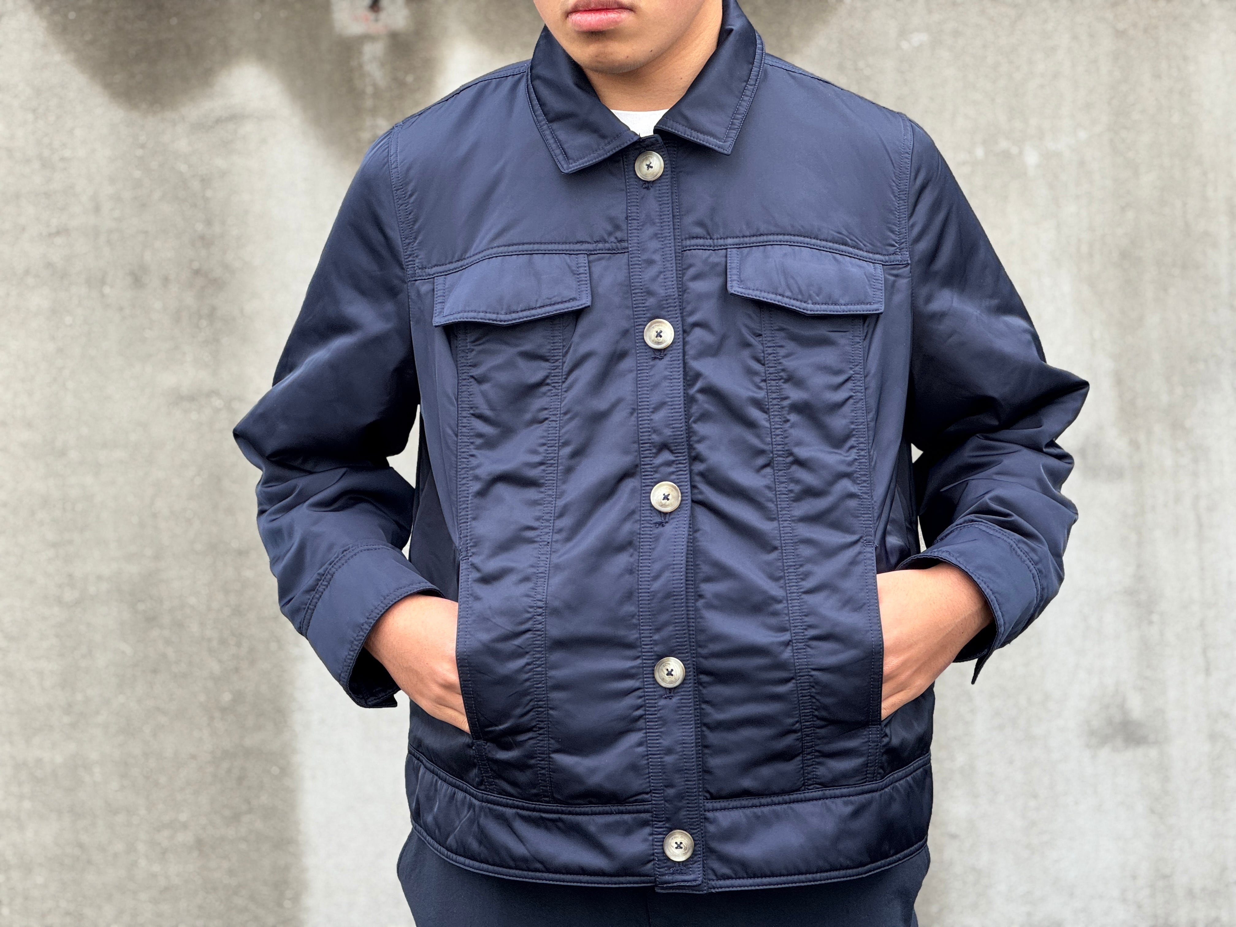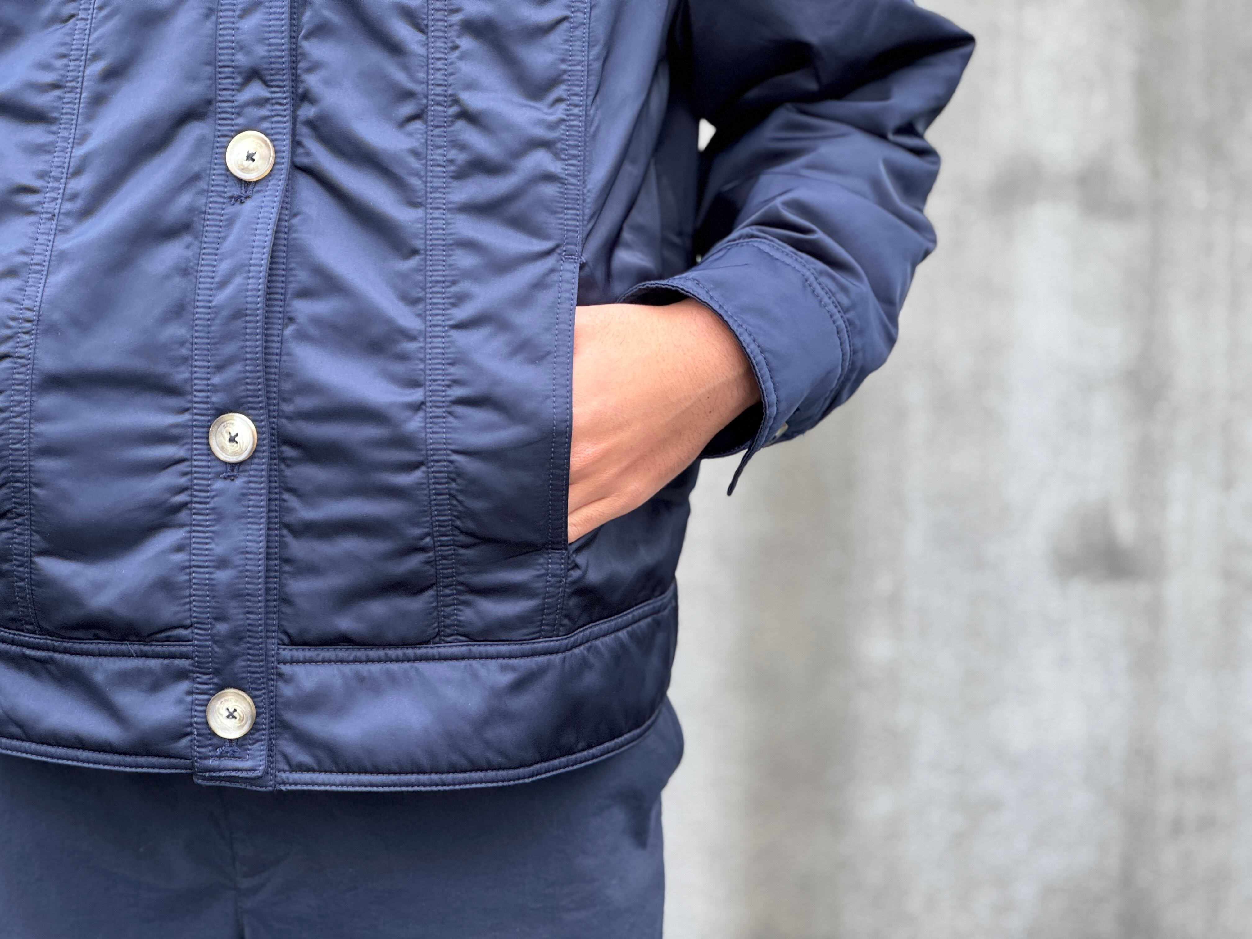 ナイロンのようなサラッとした生地感の中綿入りのトラッカーjkt。