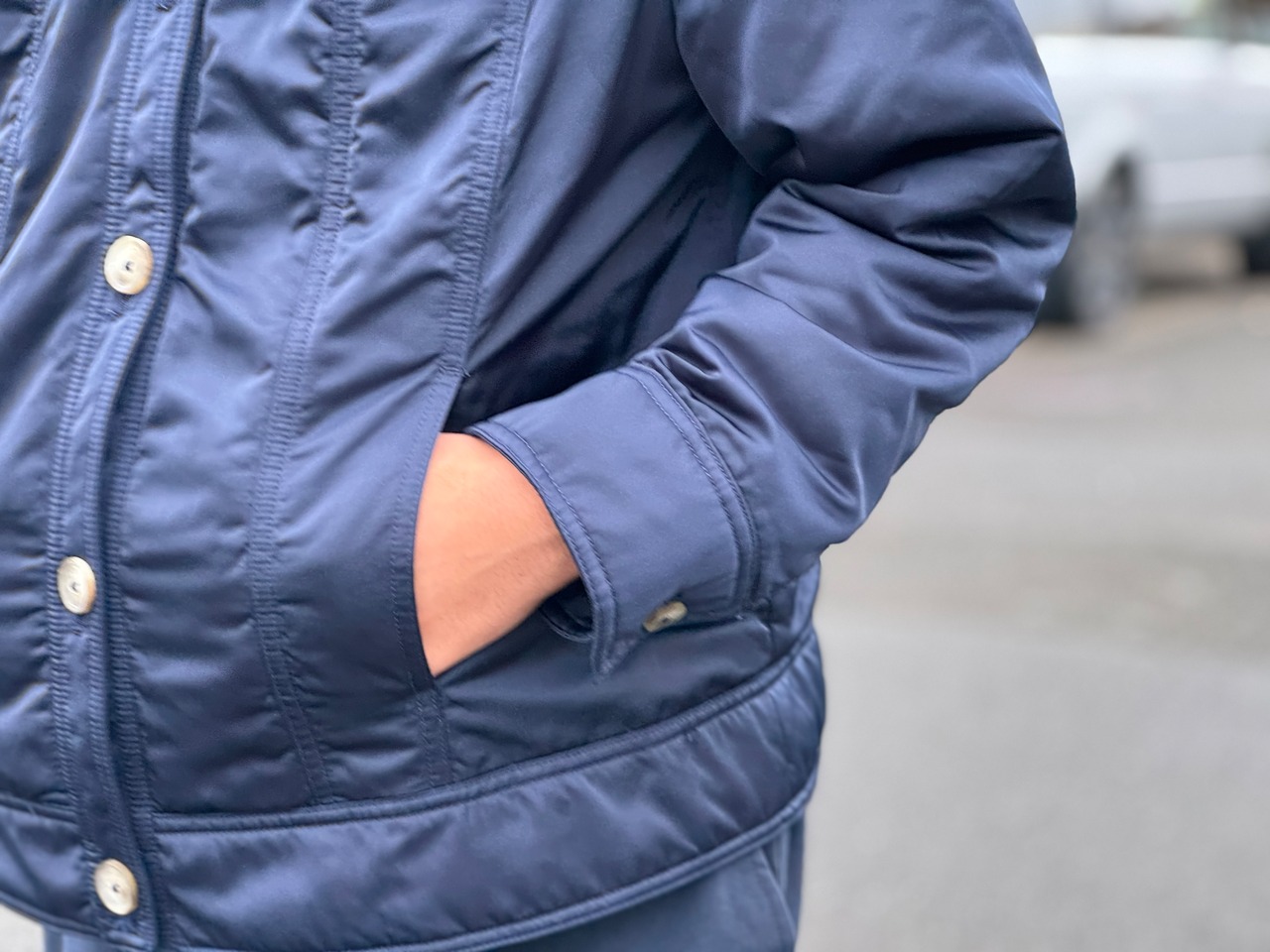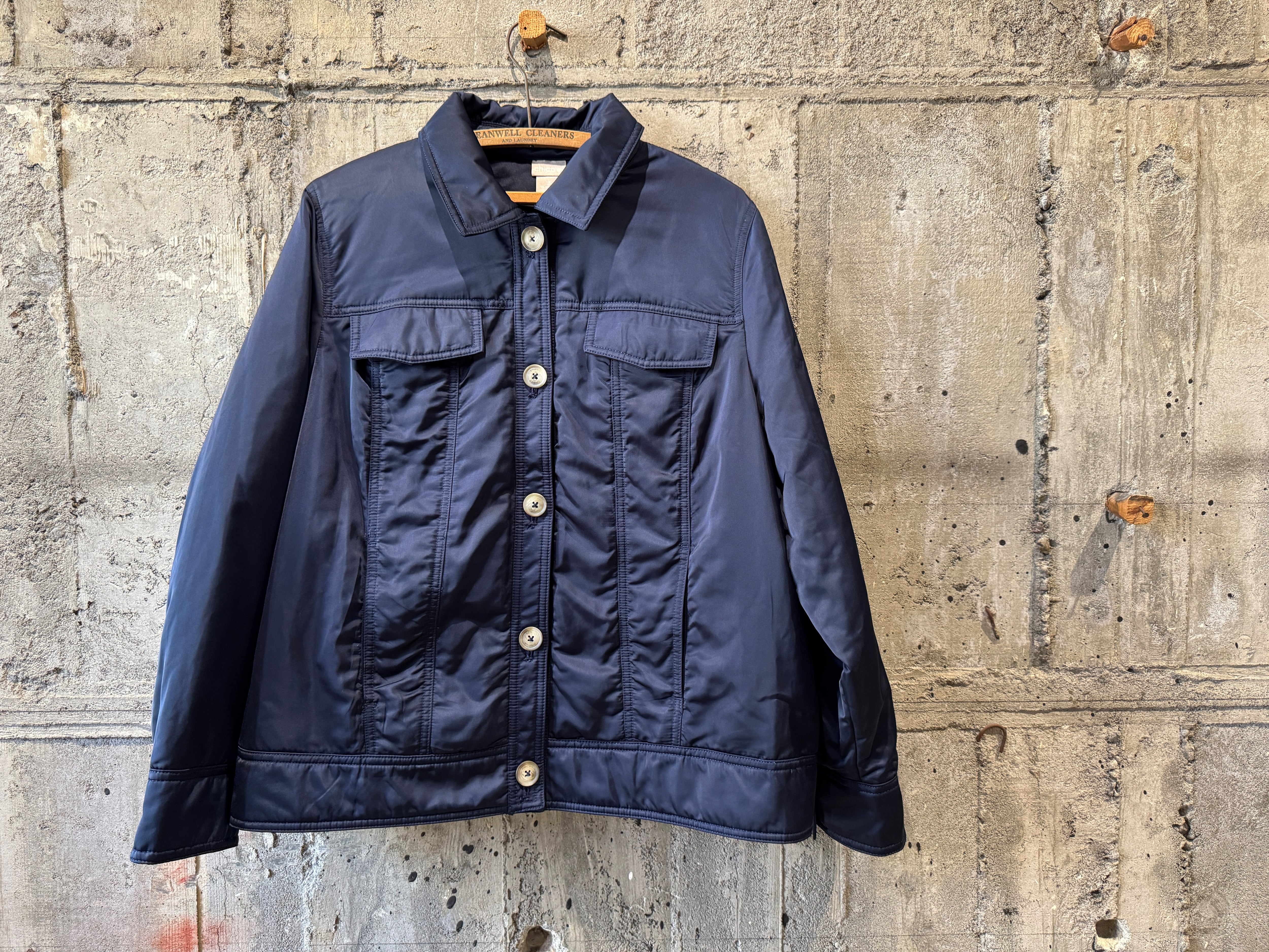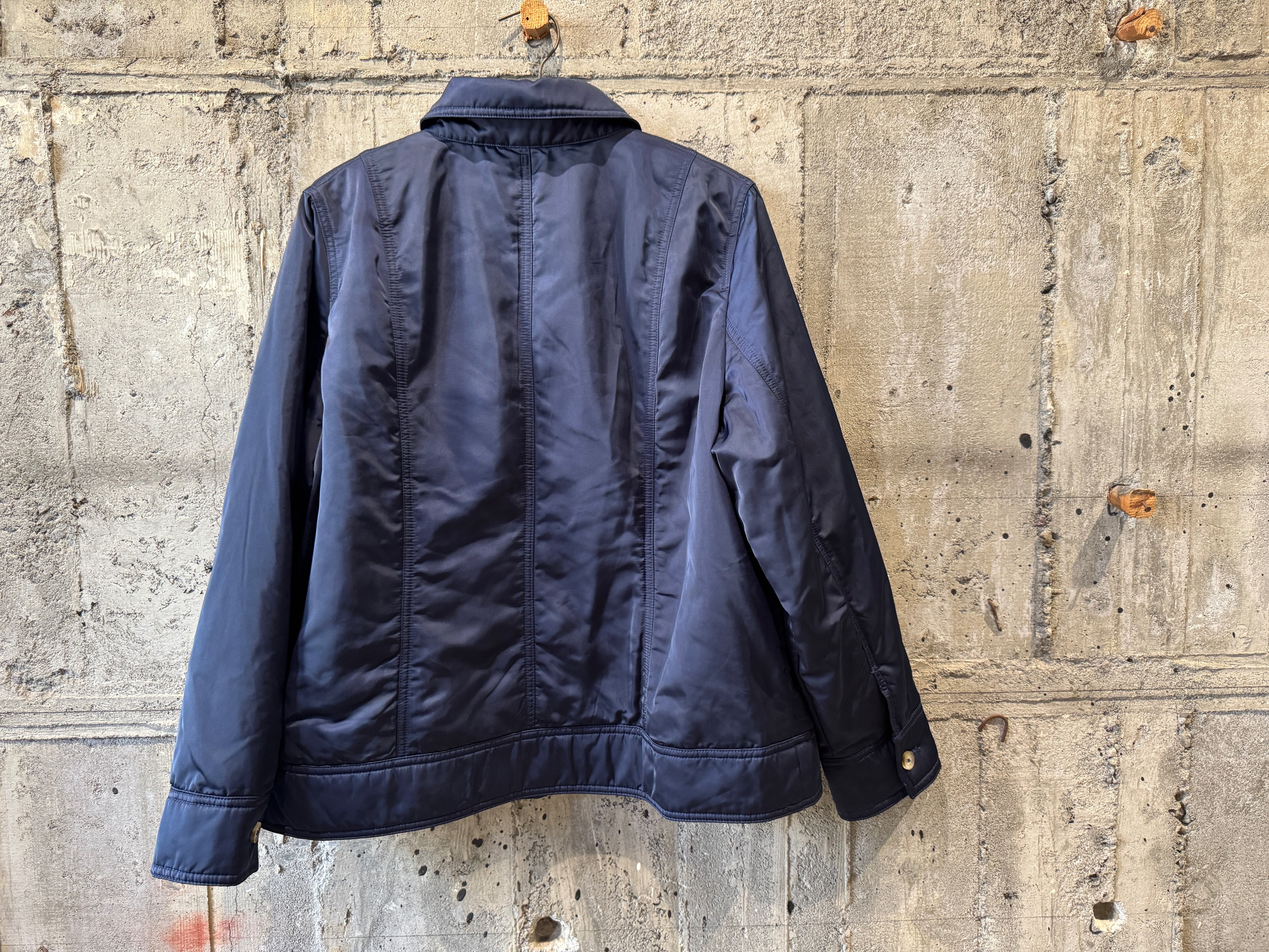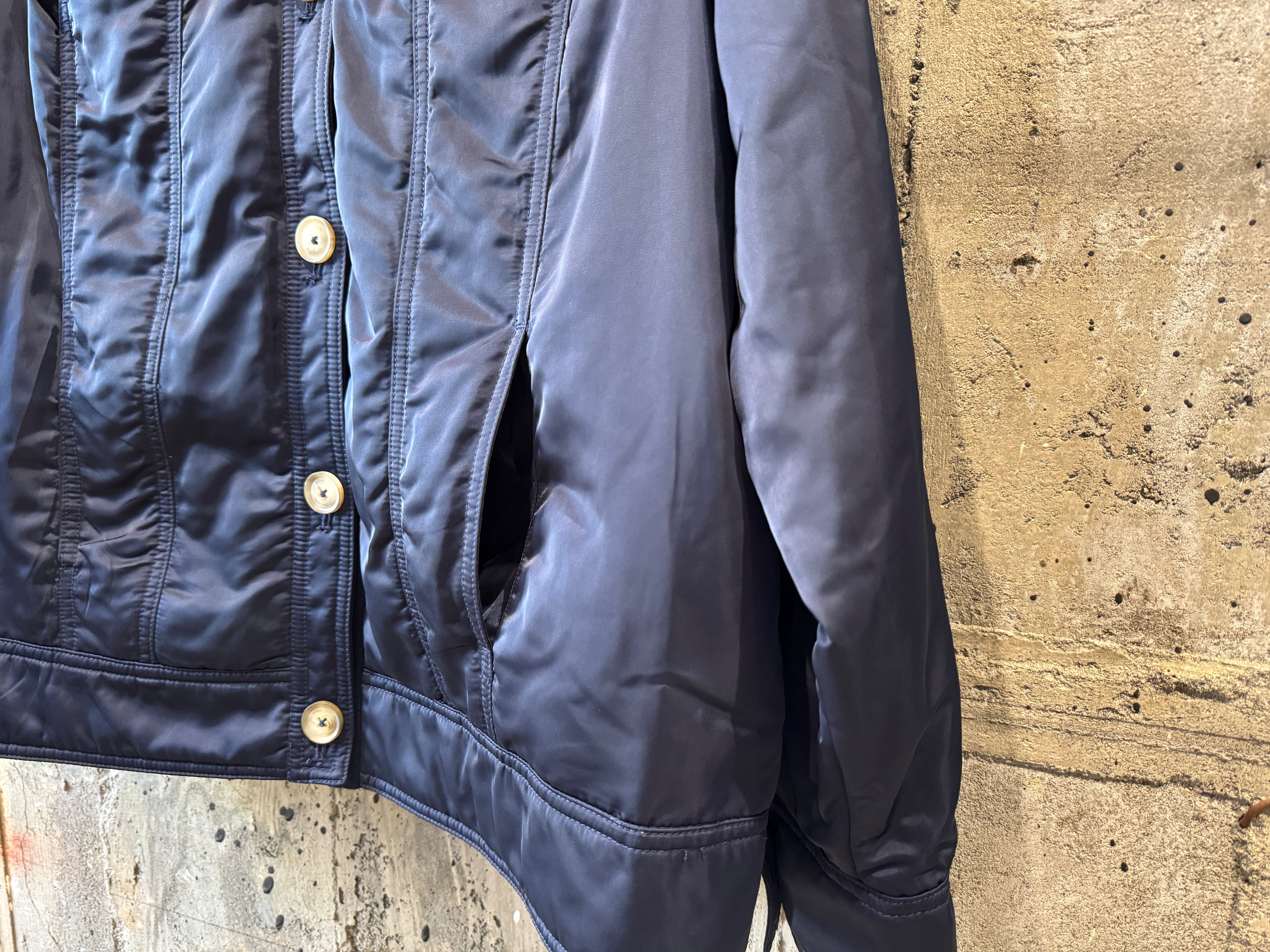 ナイロンのようなサラッとした生地感の中綿入りのトラッカーjkt。