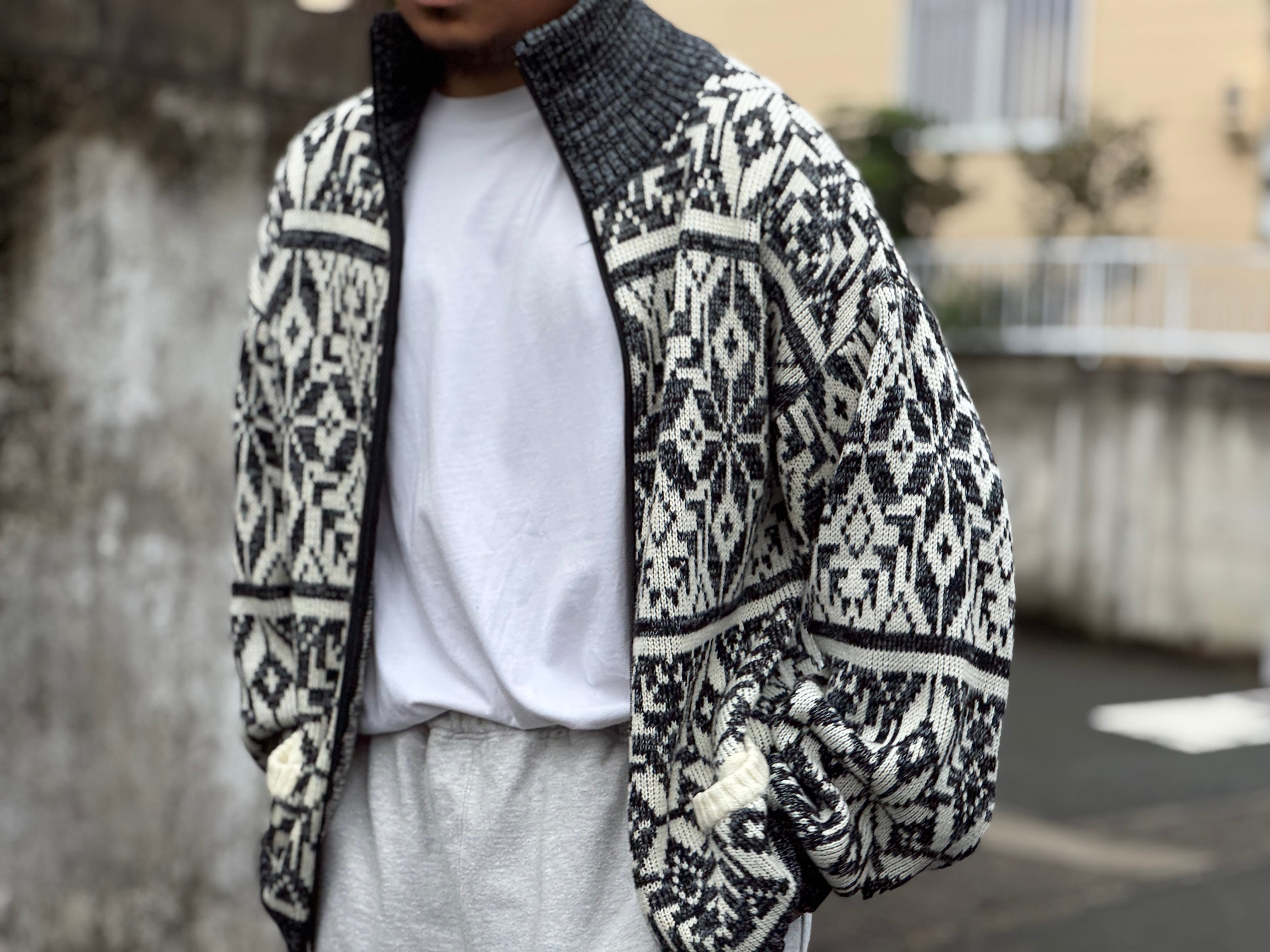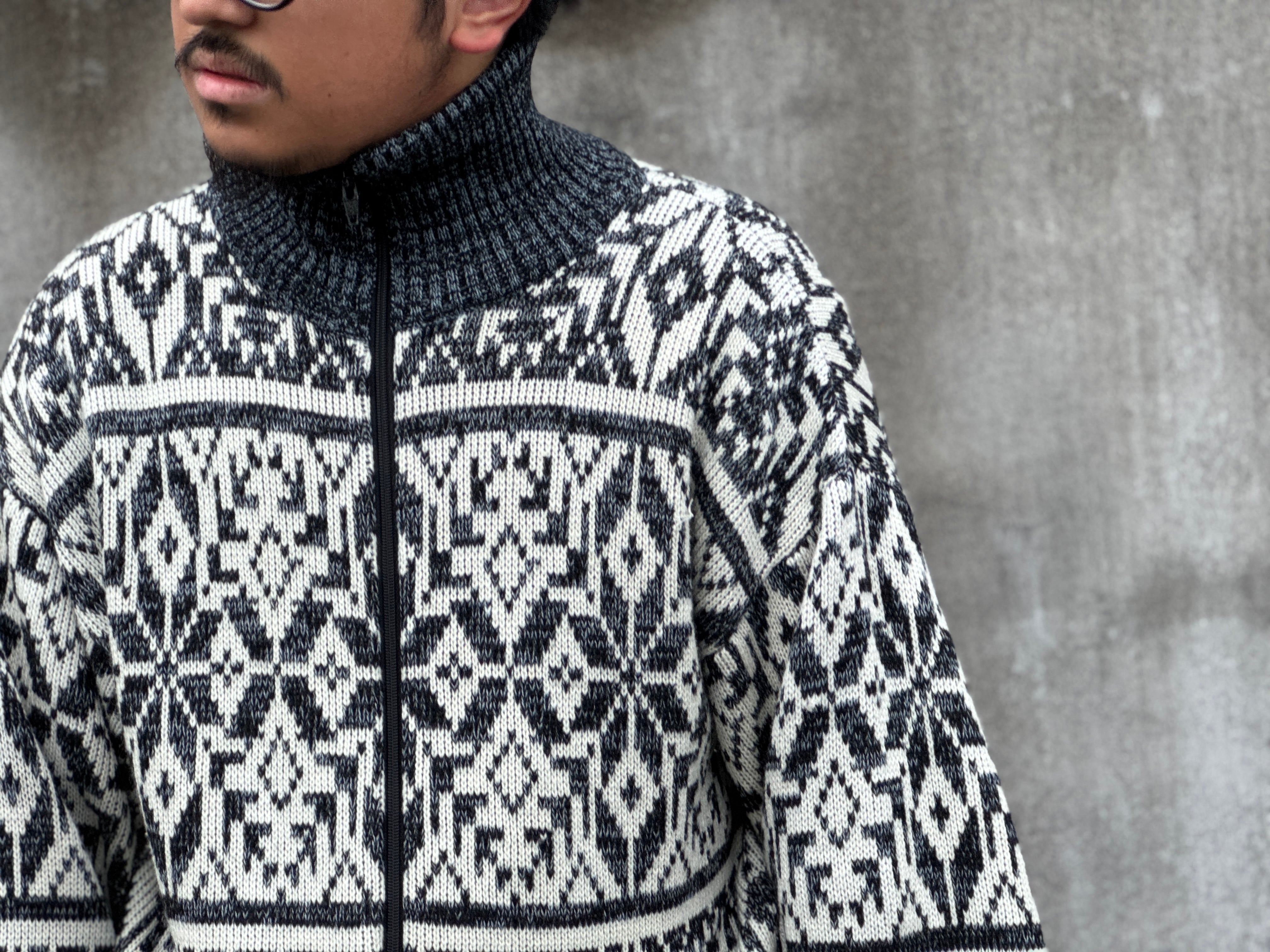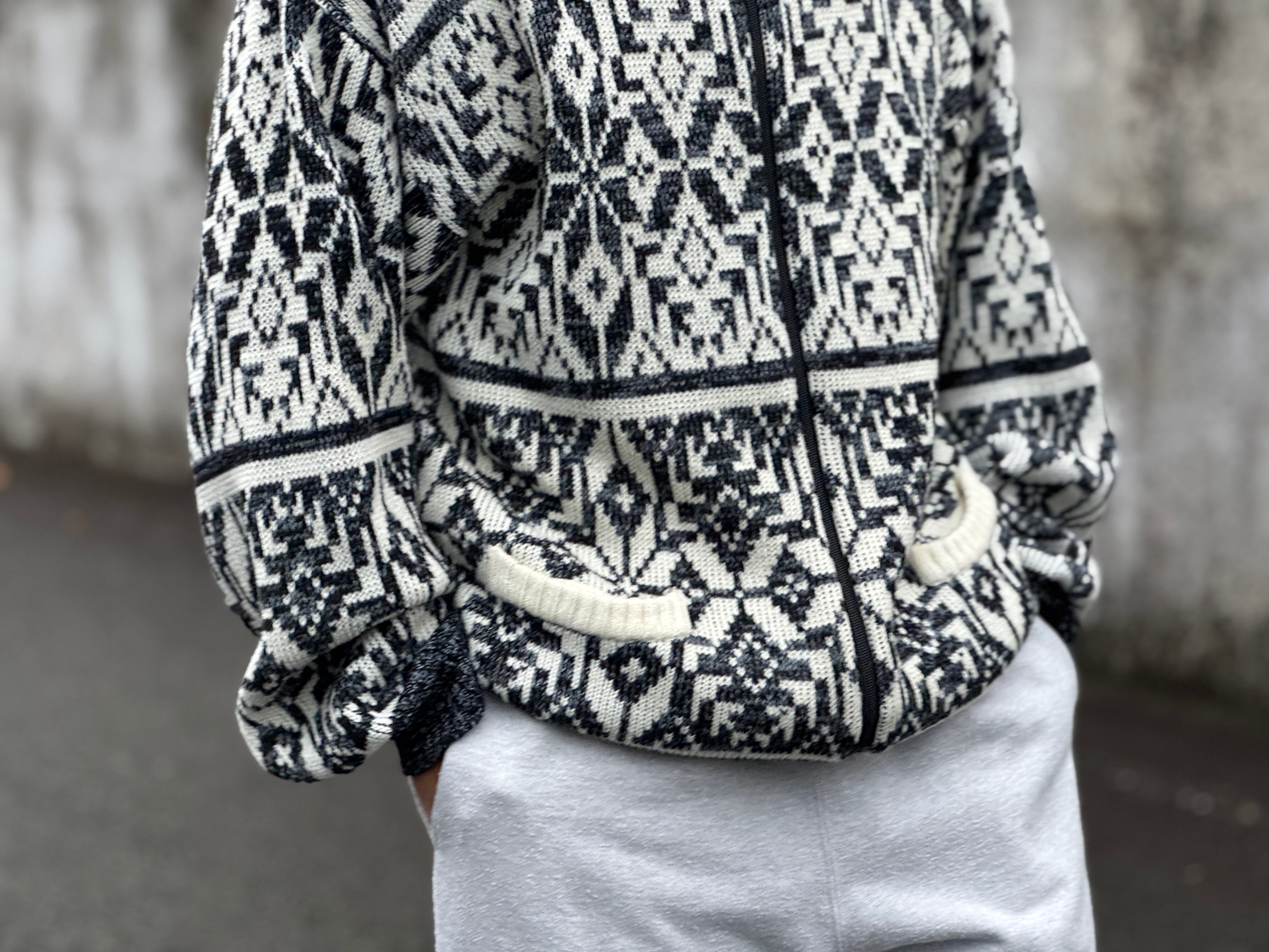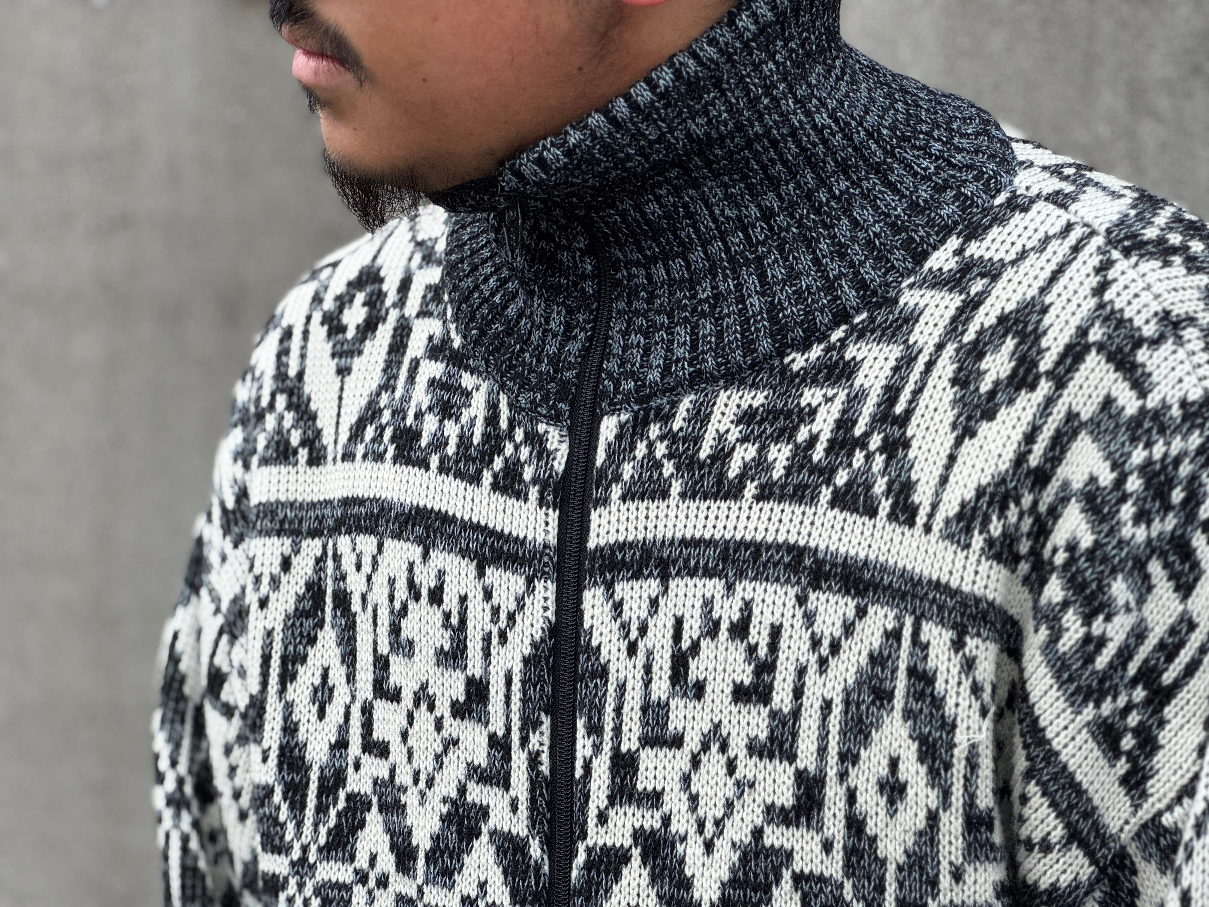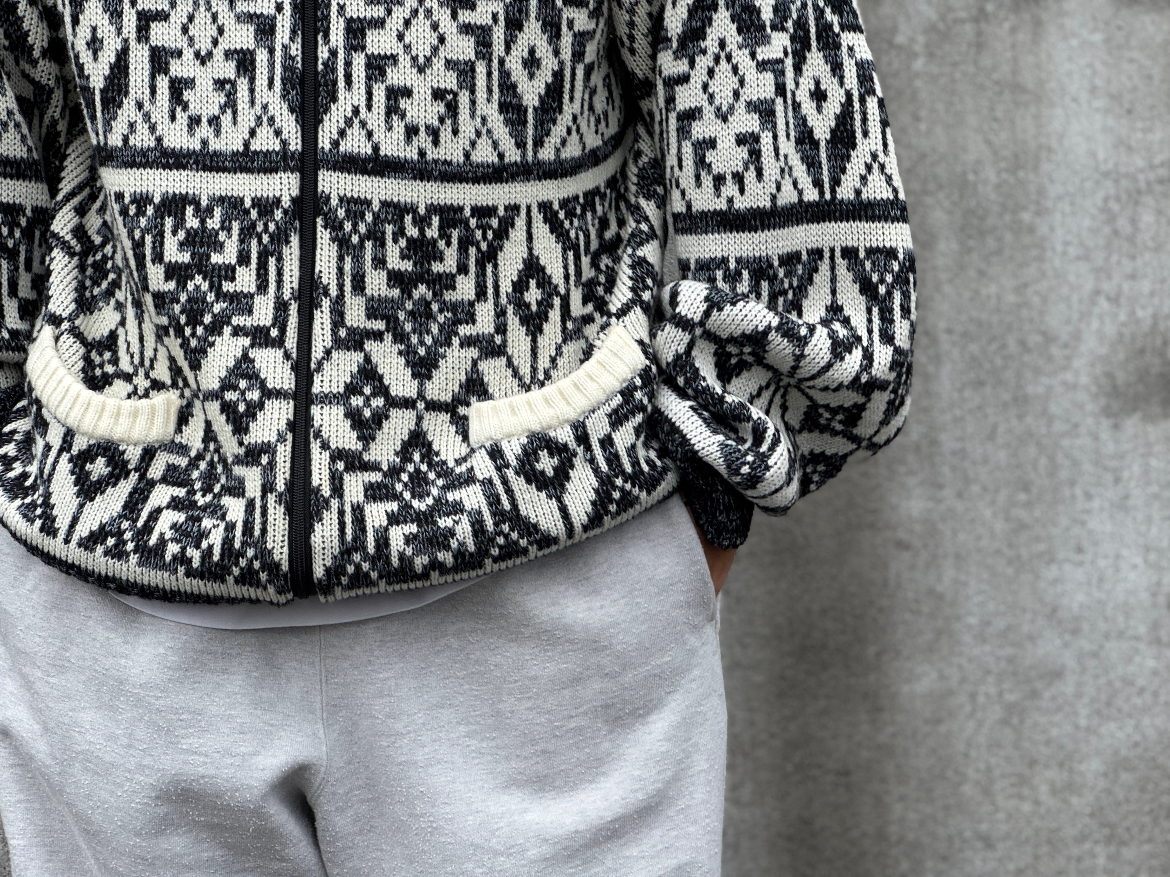 ハイネックのフルジップアップ仕様、ホワイト×グレー×ブラックのモノトーンな配色のパターン。
