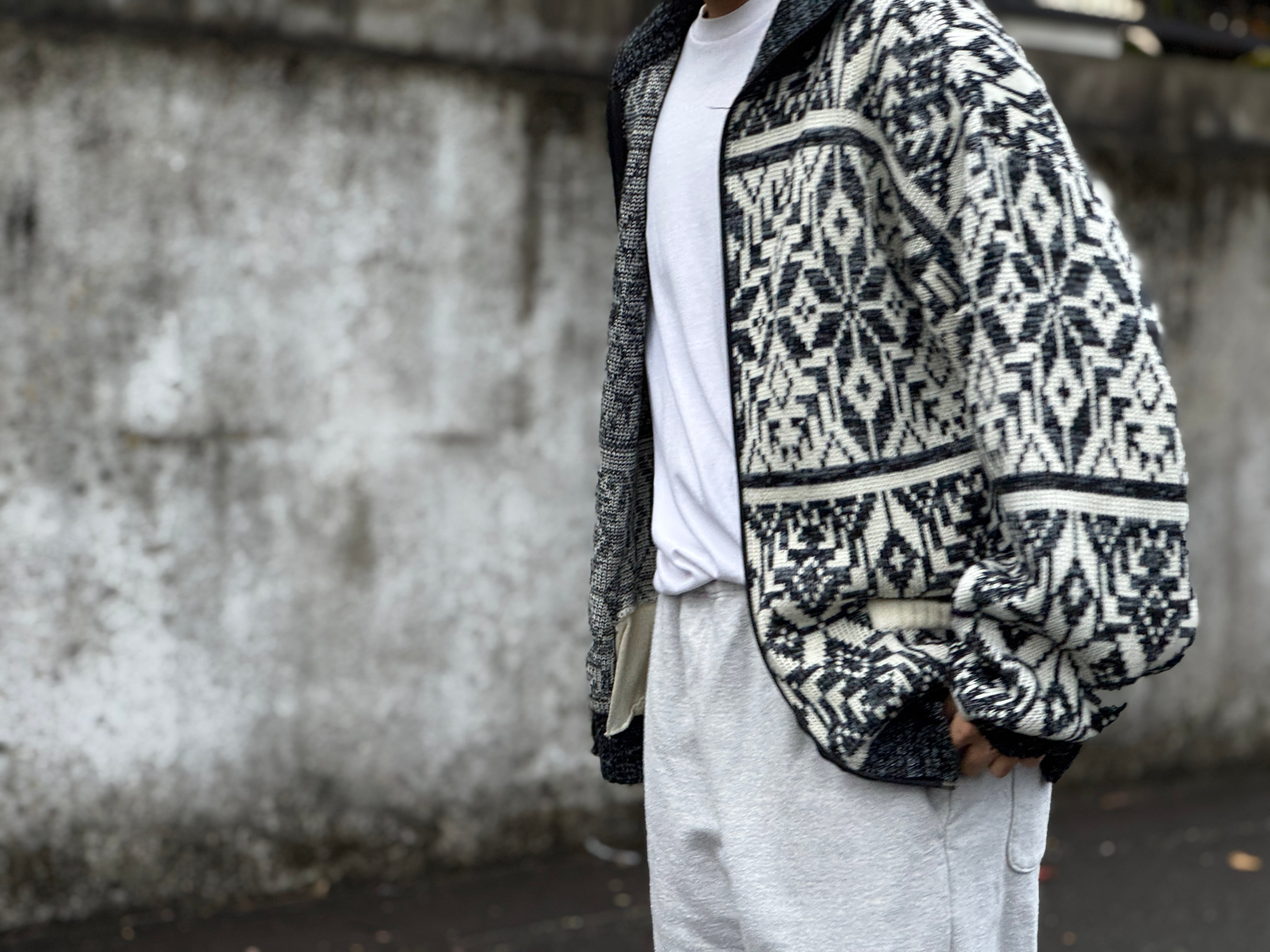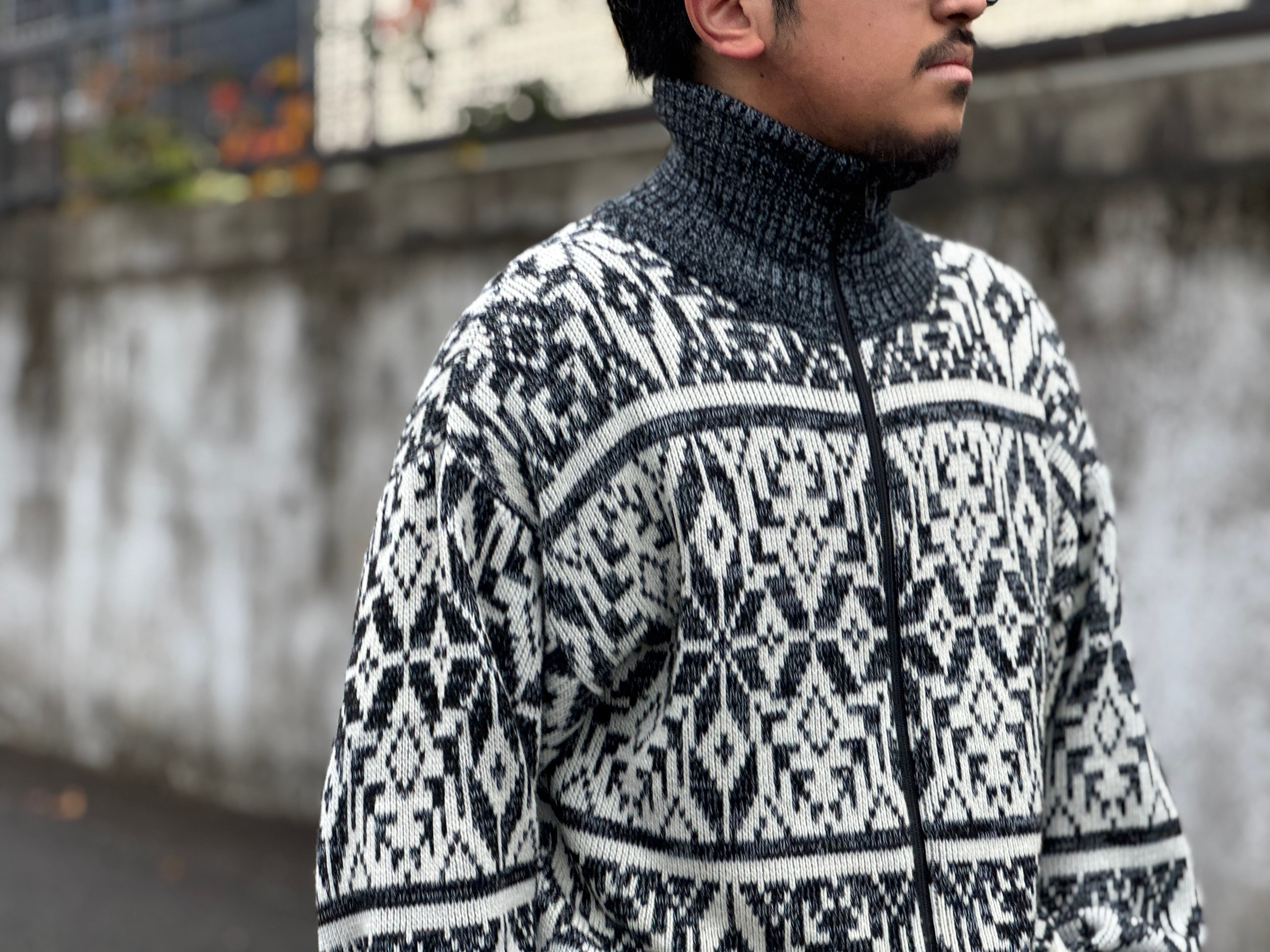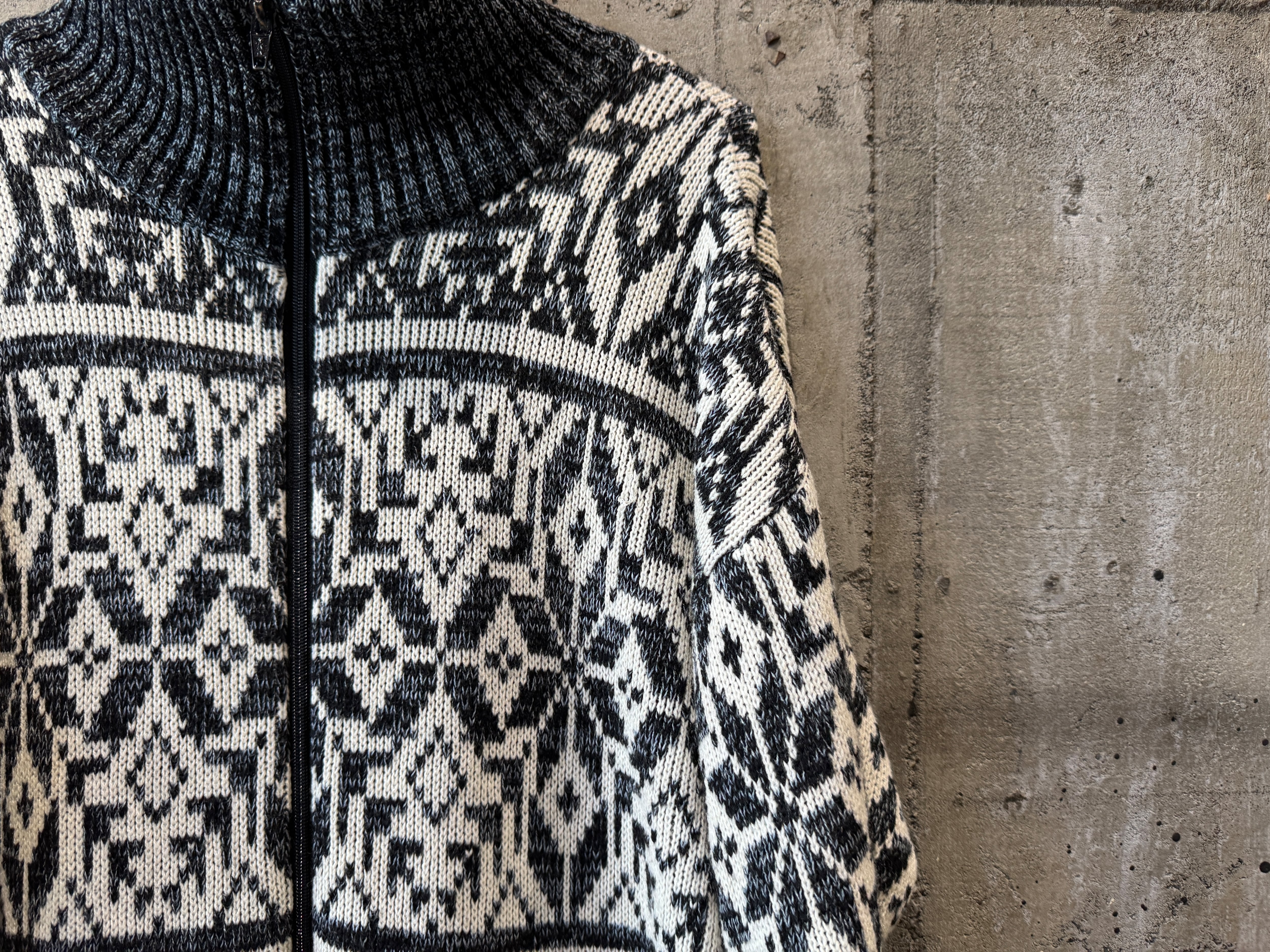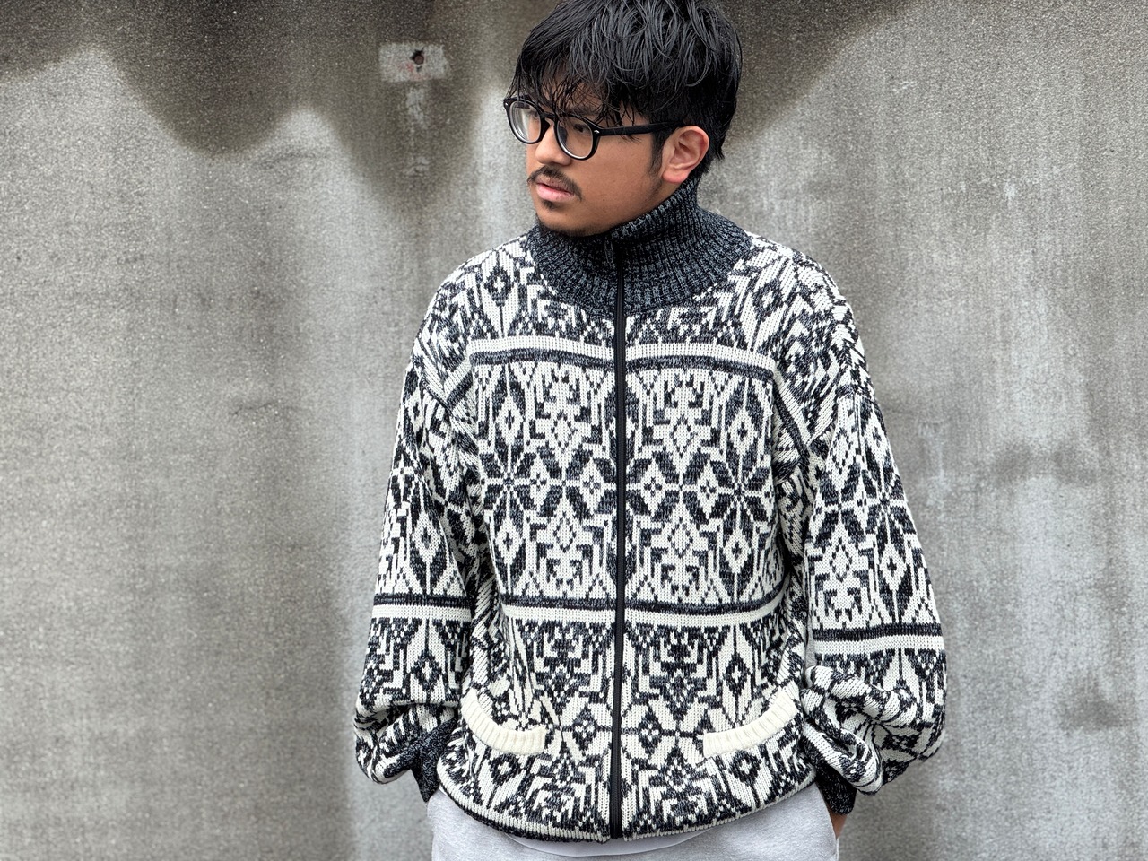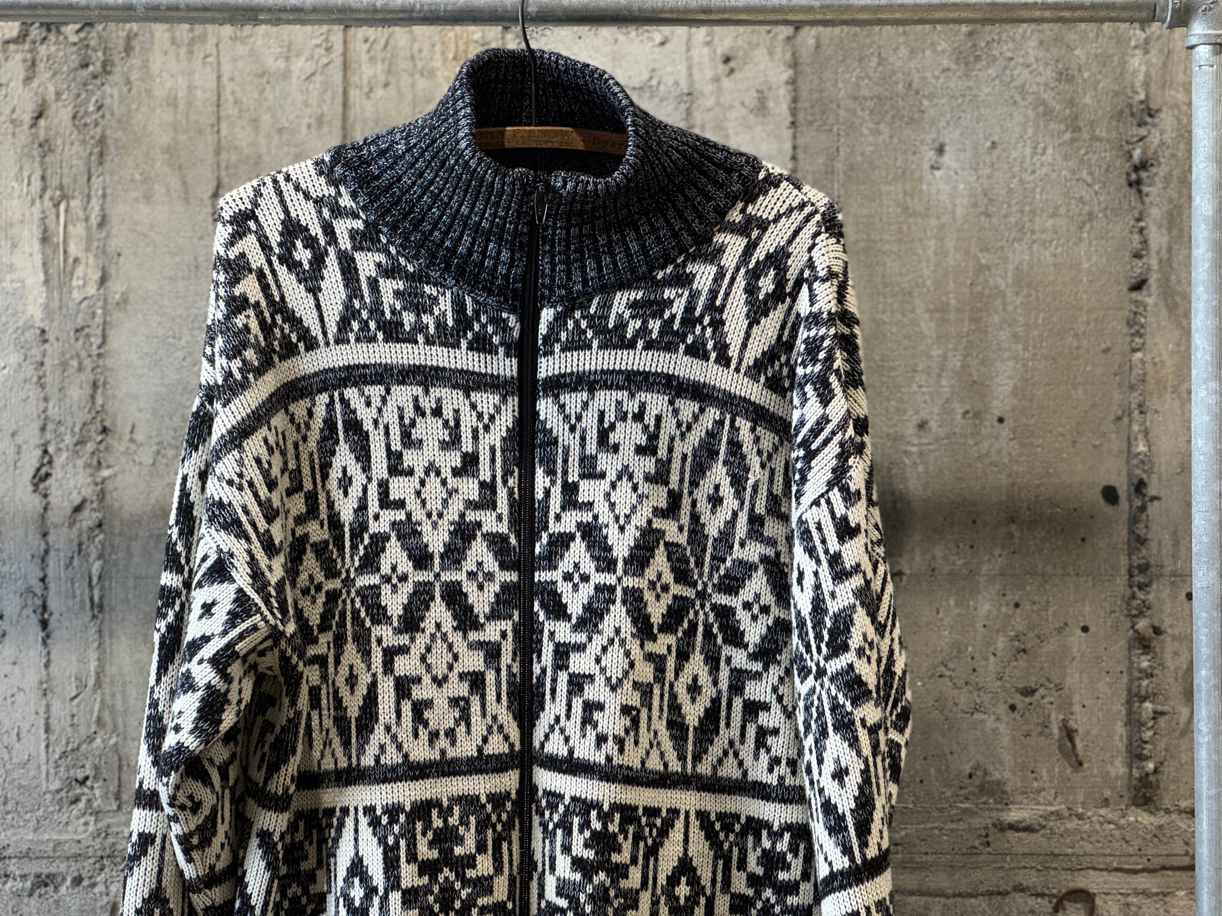 ハイネックのフルジップアップ仕様、ホワイト×グレー×ブラックのモノトーンな配色のパターン。