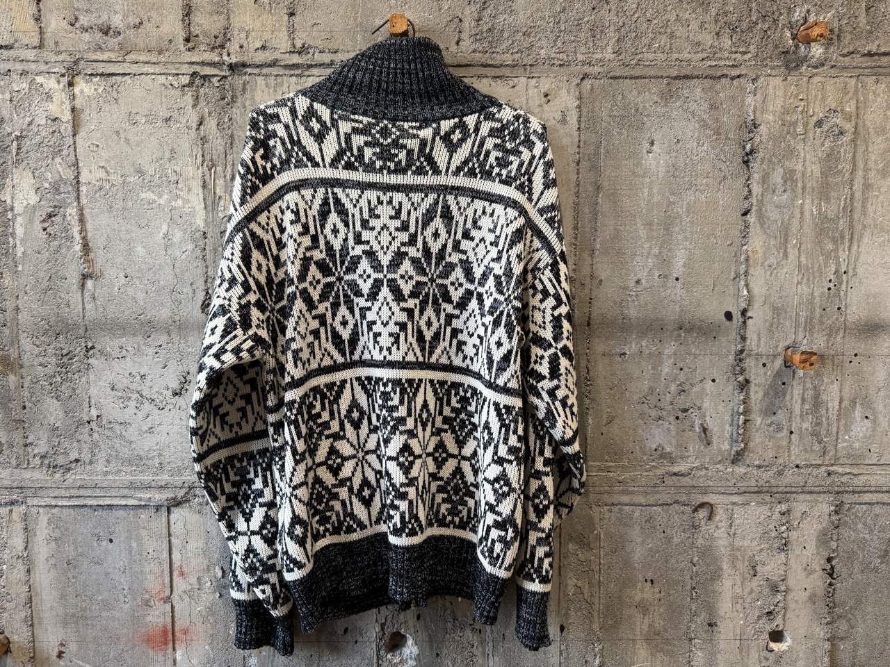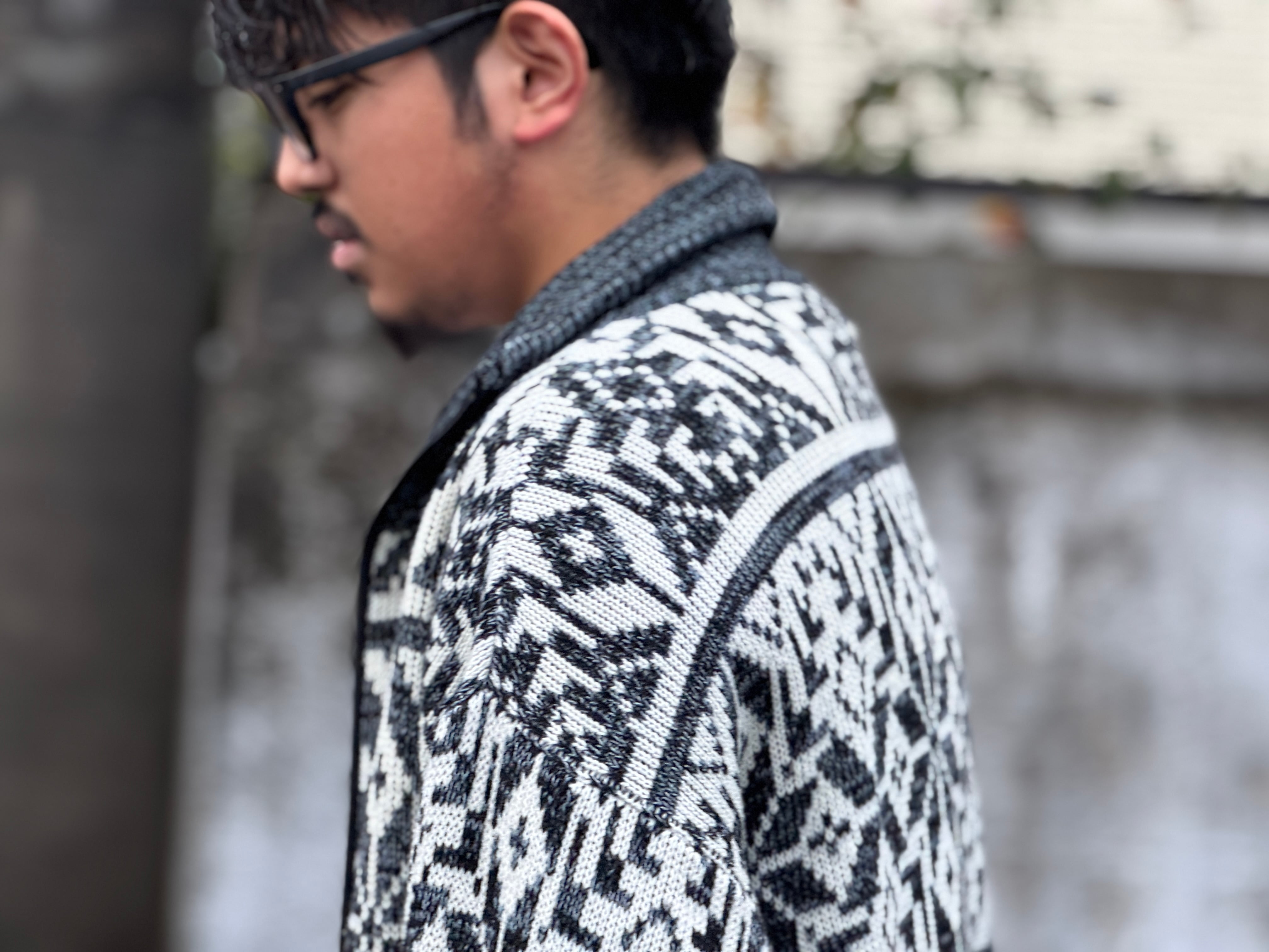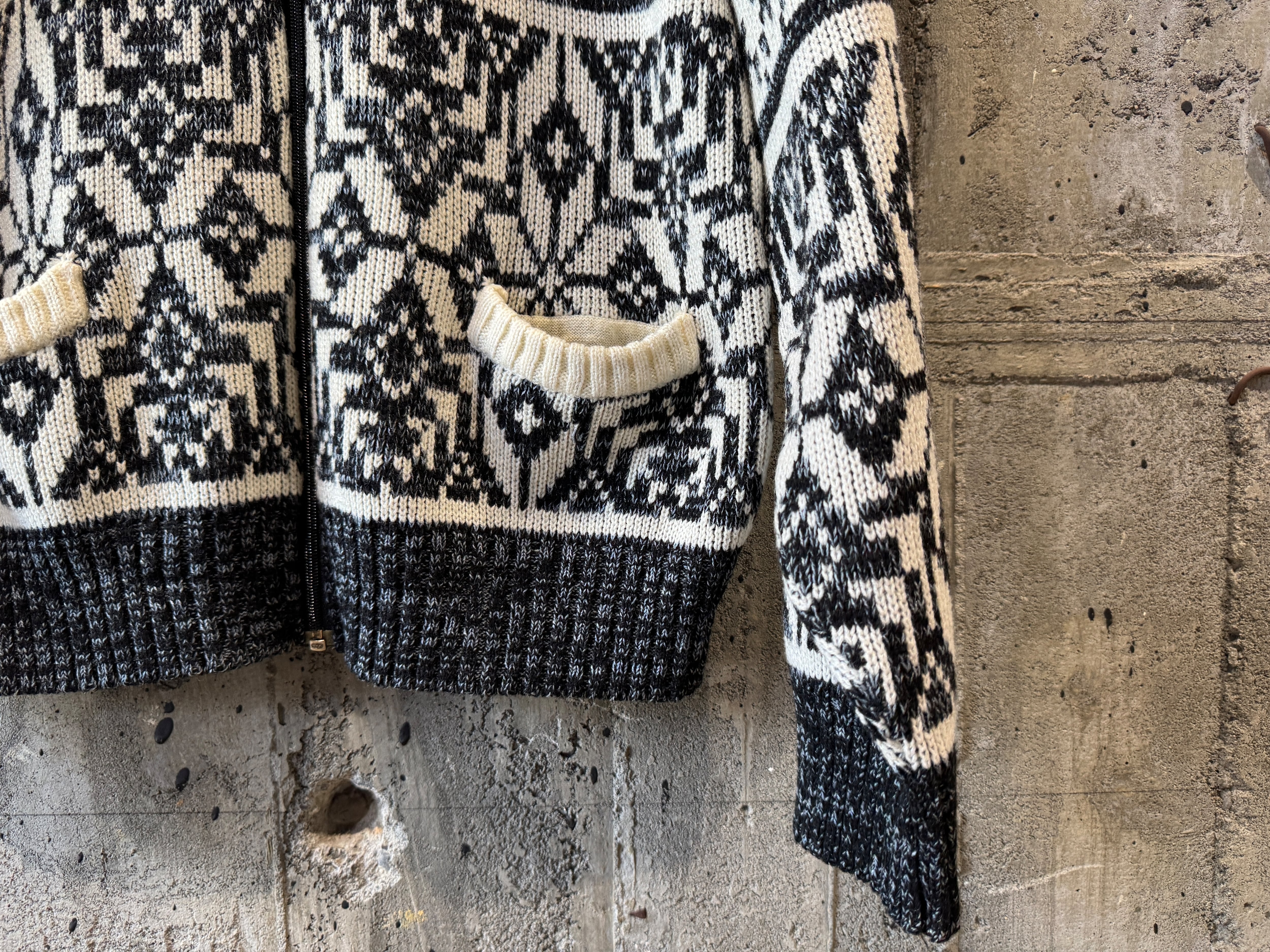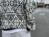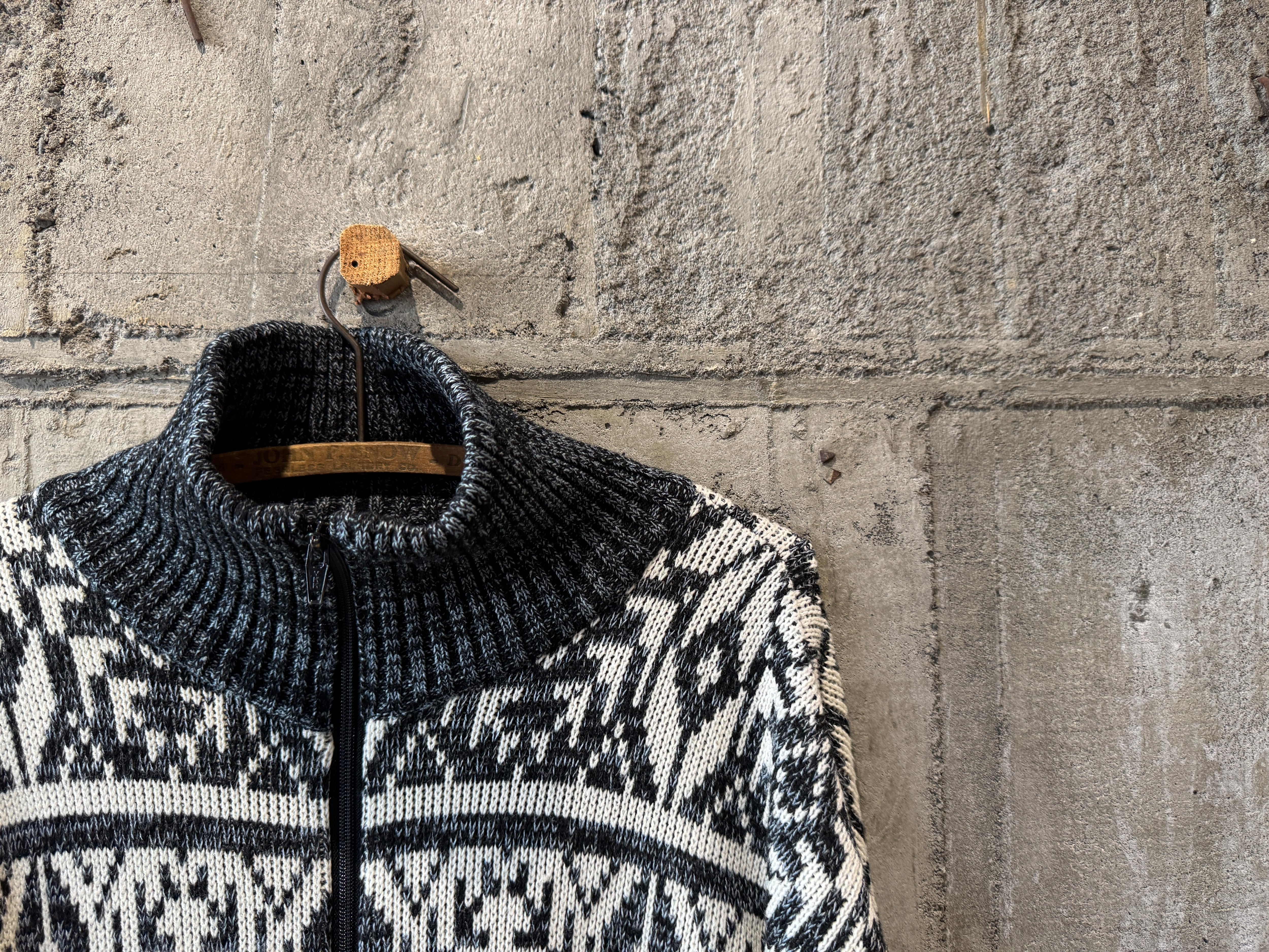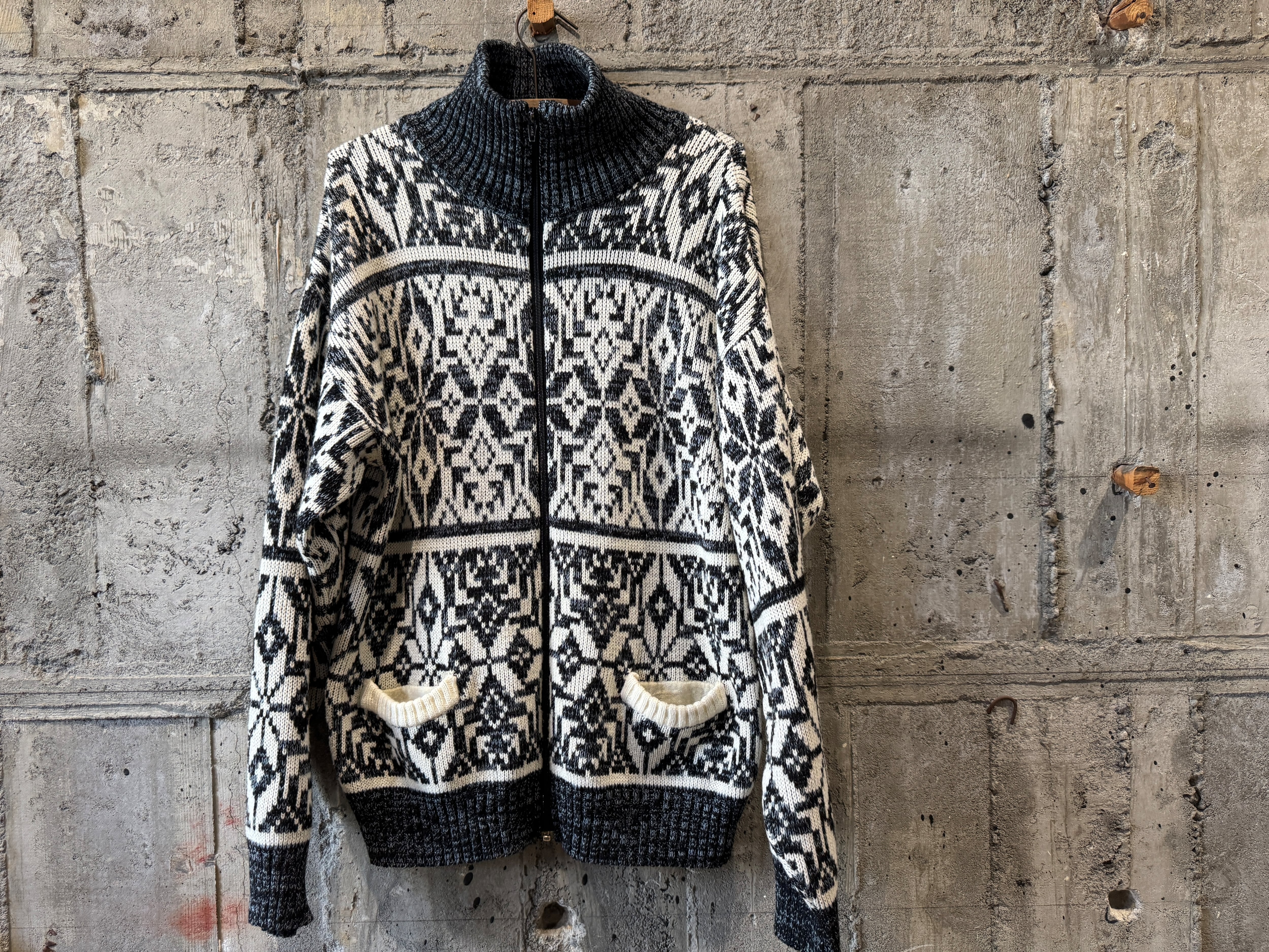 ハイネックのフルジップアップ仕様、ホワイト×グレー×ブラックのモノトーンな配色のパターン。