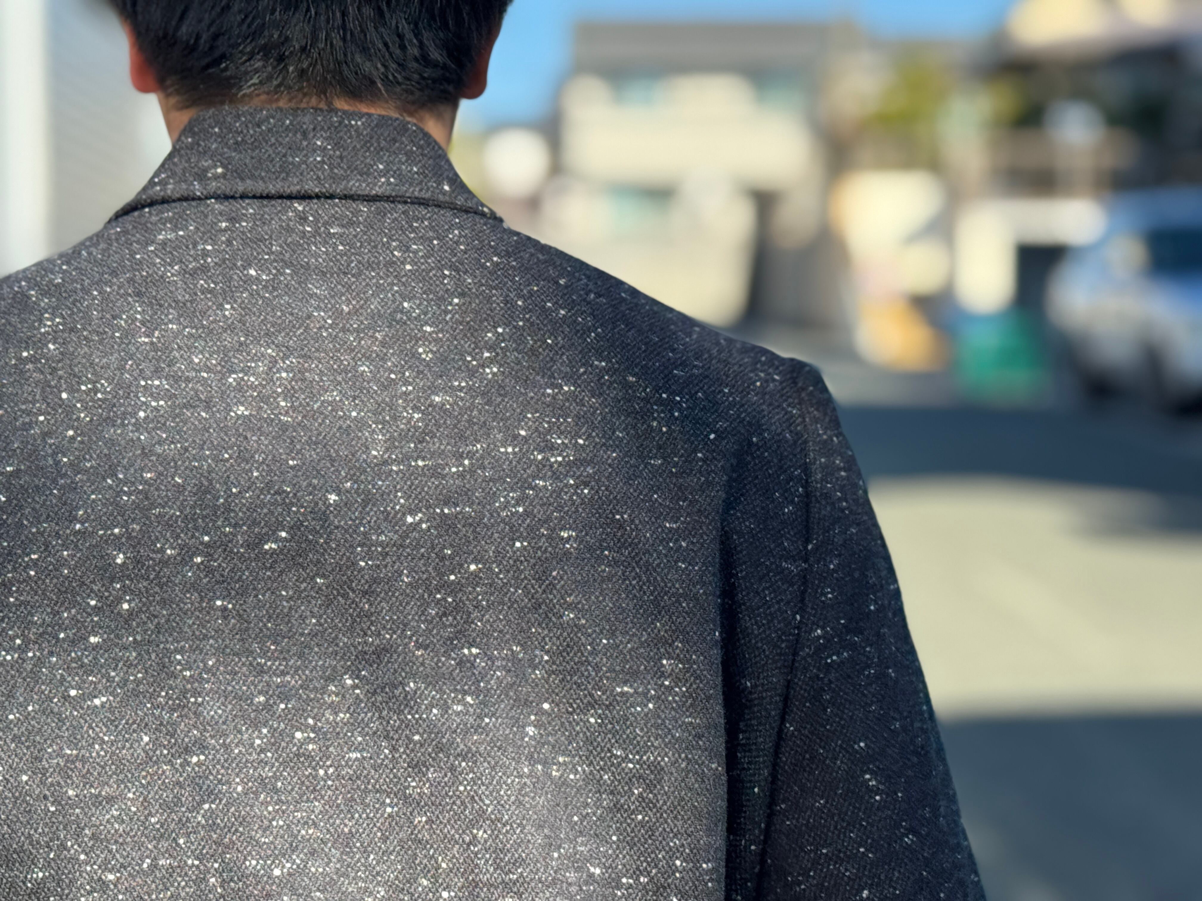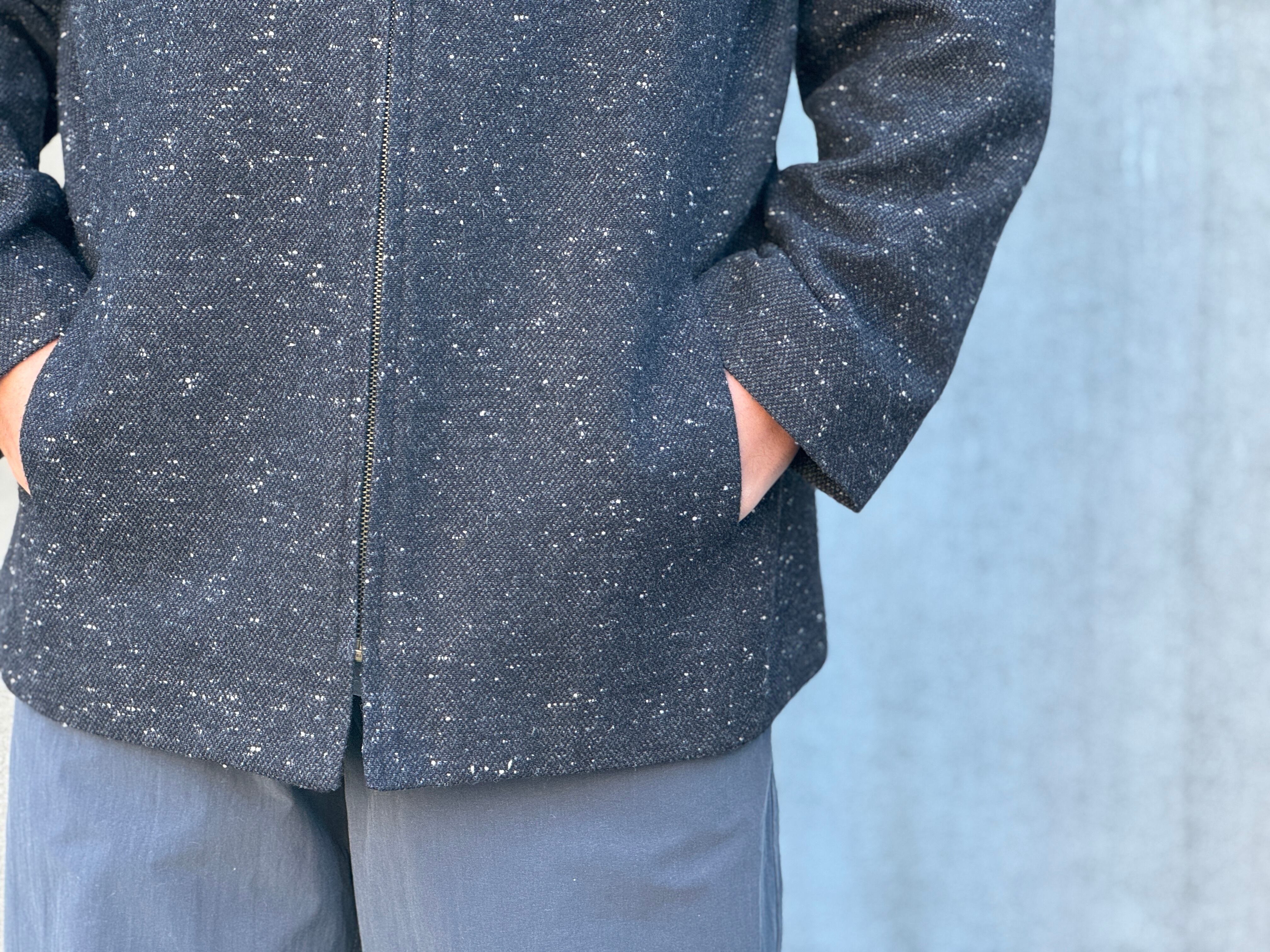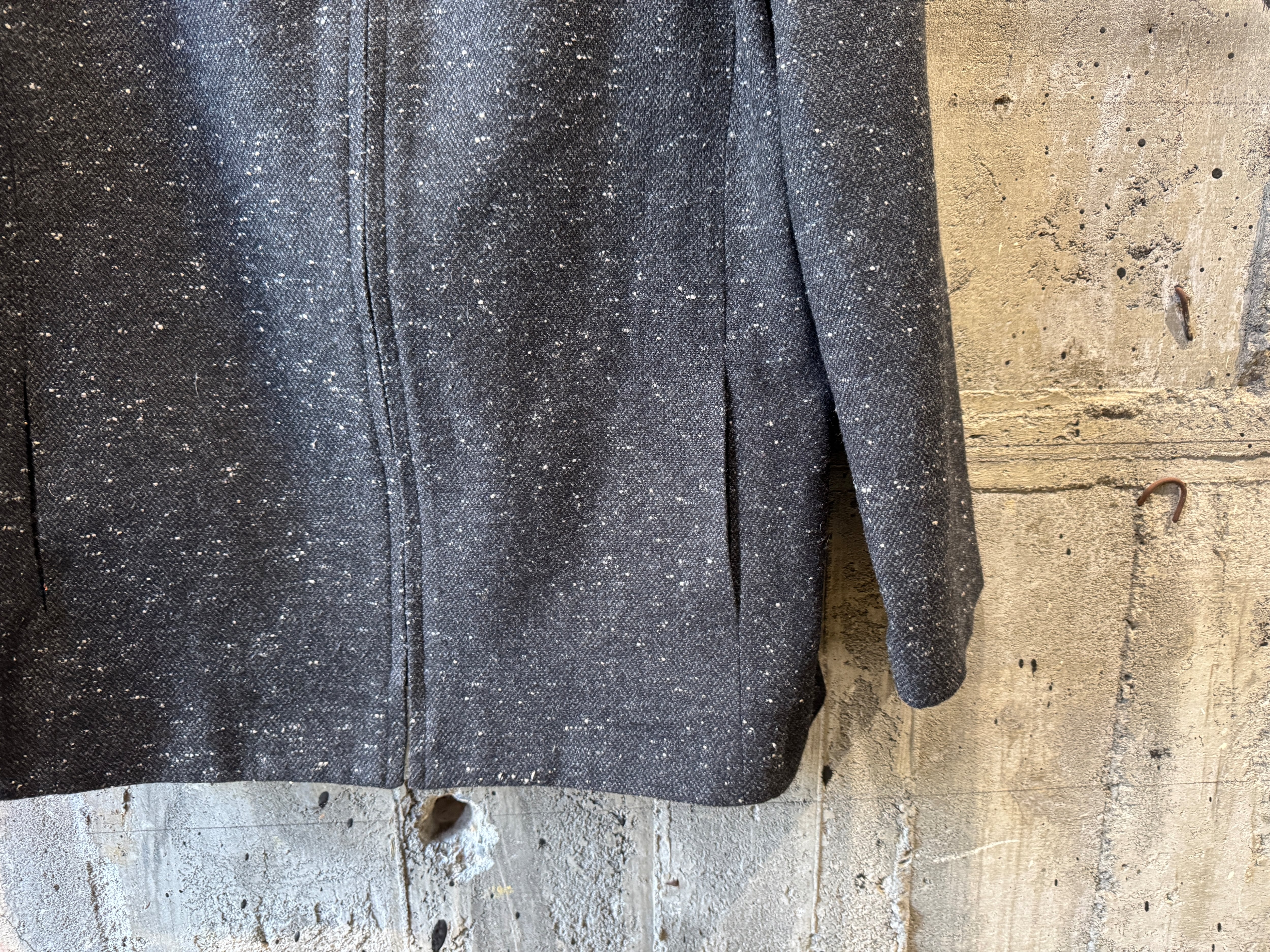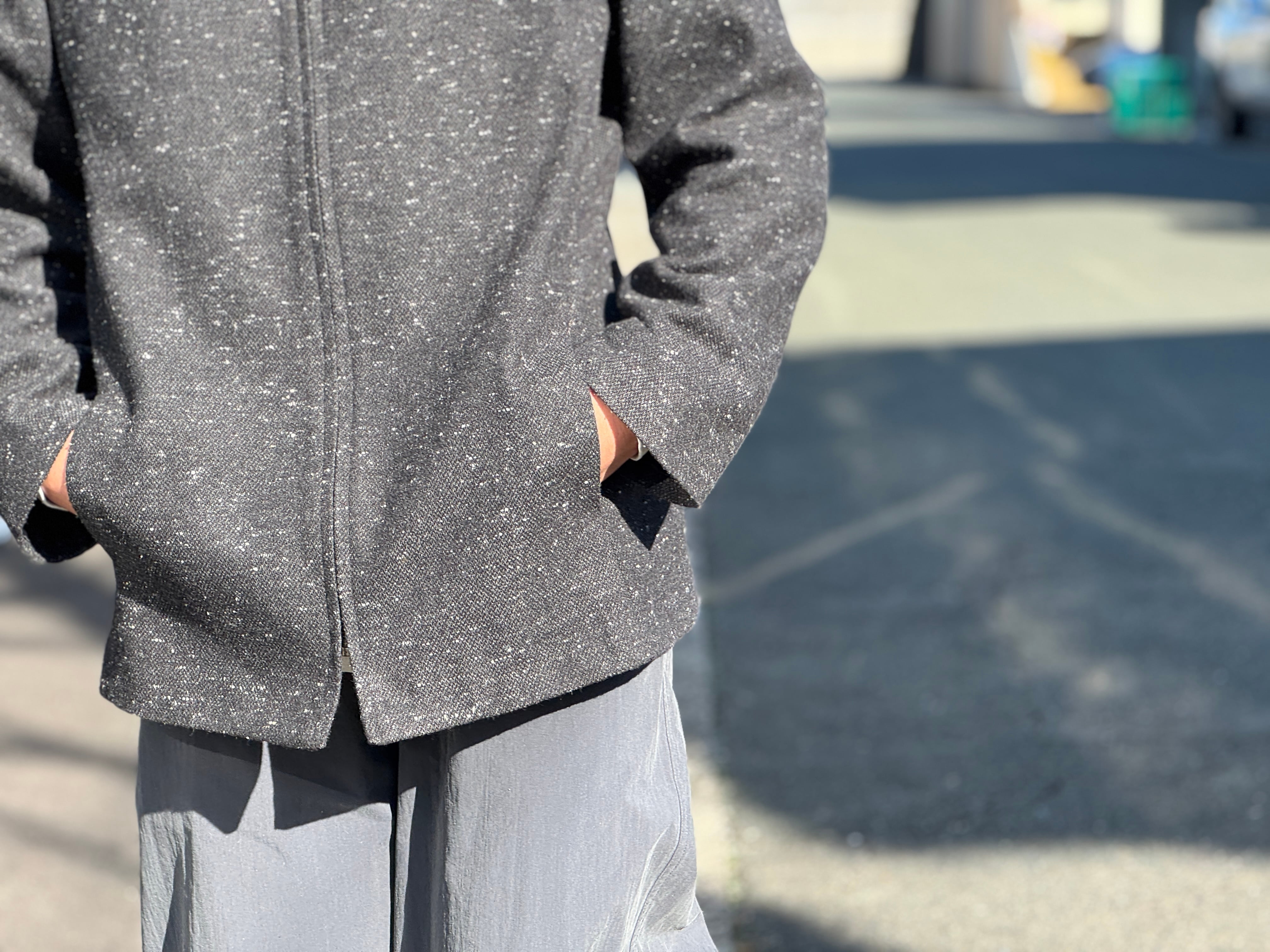 チャコールカラーのボディに全体にネップが入ったデザイン。ポケットはスラッシュタイプ。