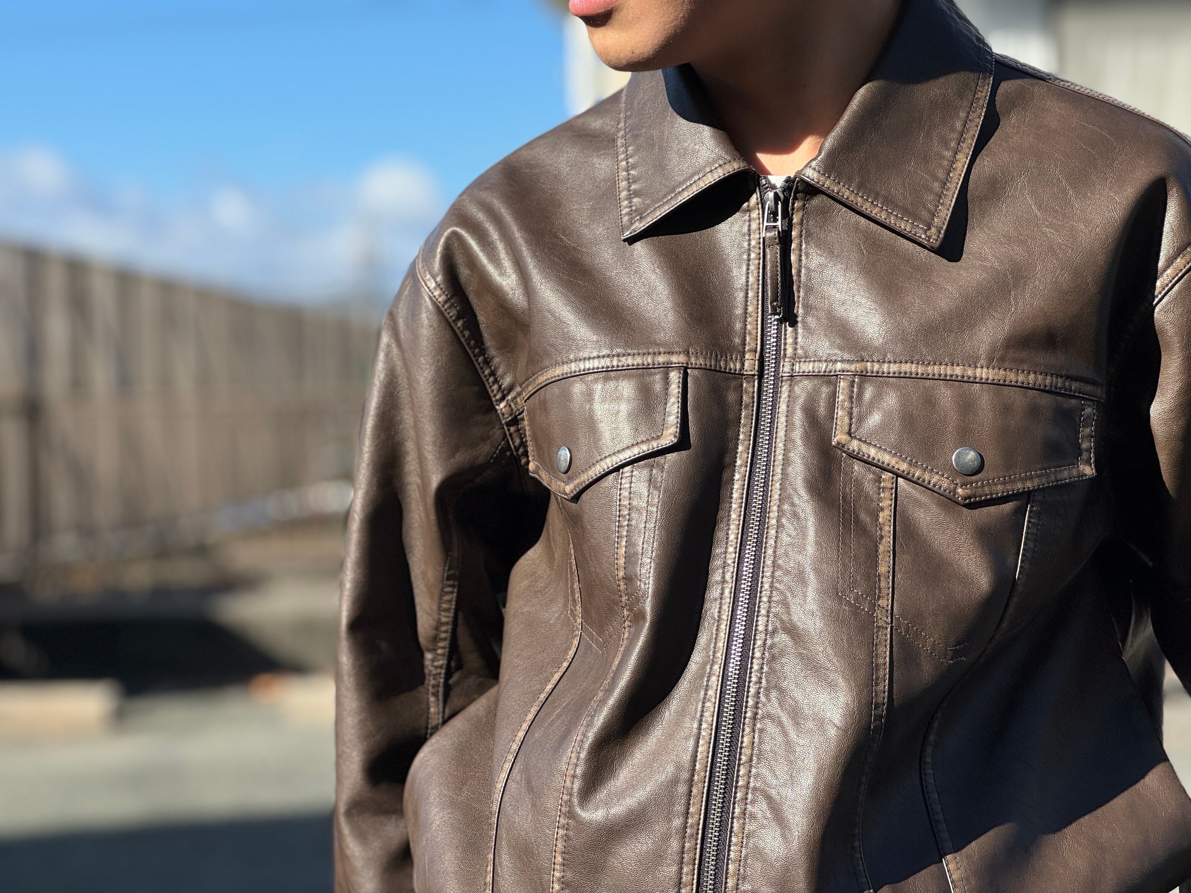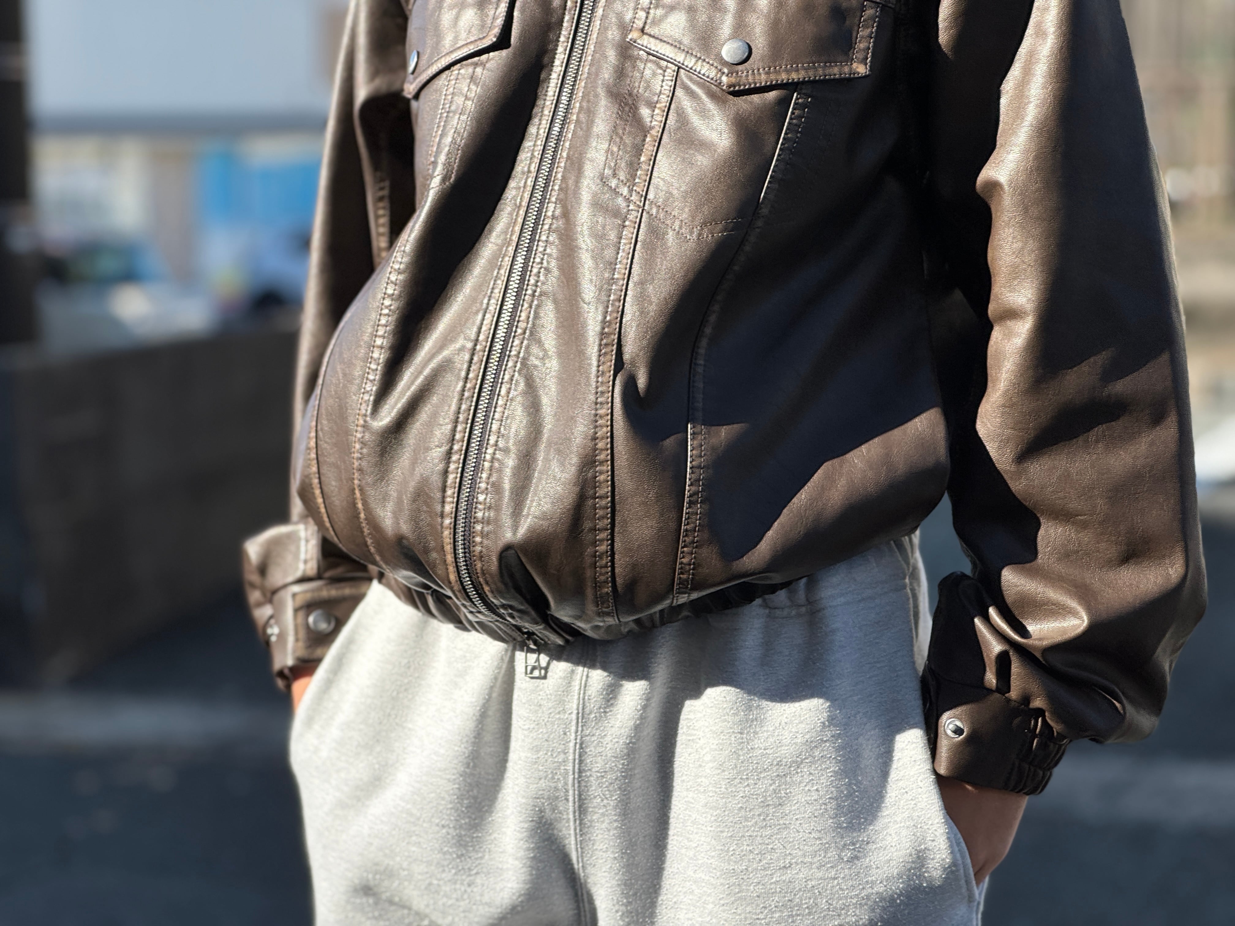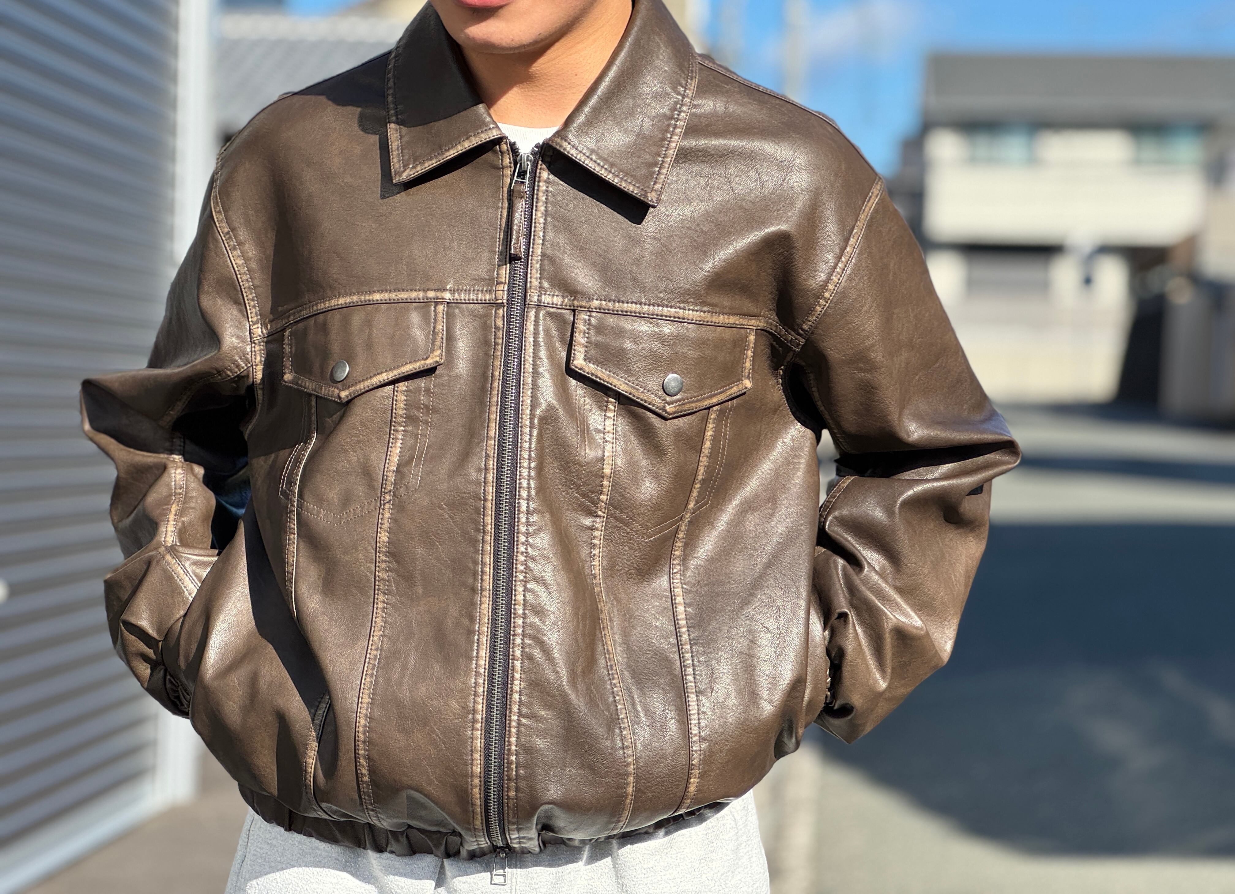 コチラはしっとりとしたレザータッチな生地感のトラッカーデザインのzip jkt。ヴィンテージ加工による独特な“あたり”色落ち感のある珍しいフェイクレザー生地を使用。両サイドにスラッシュポケット、内側にもポケットが配してあります。