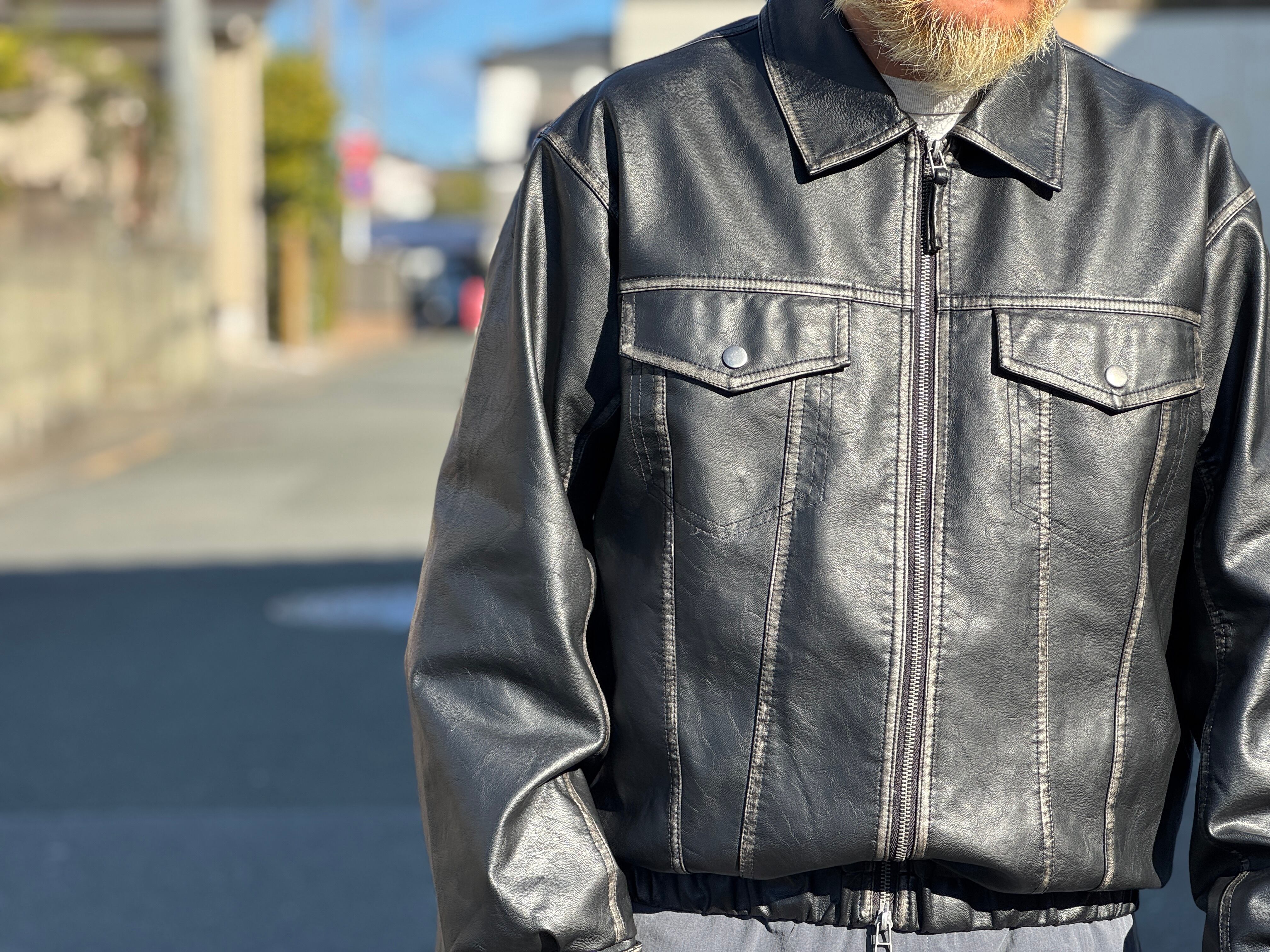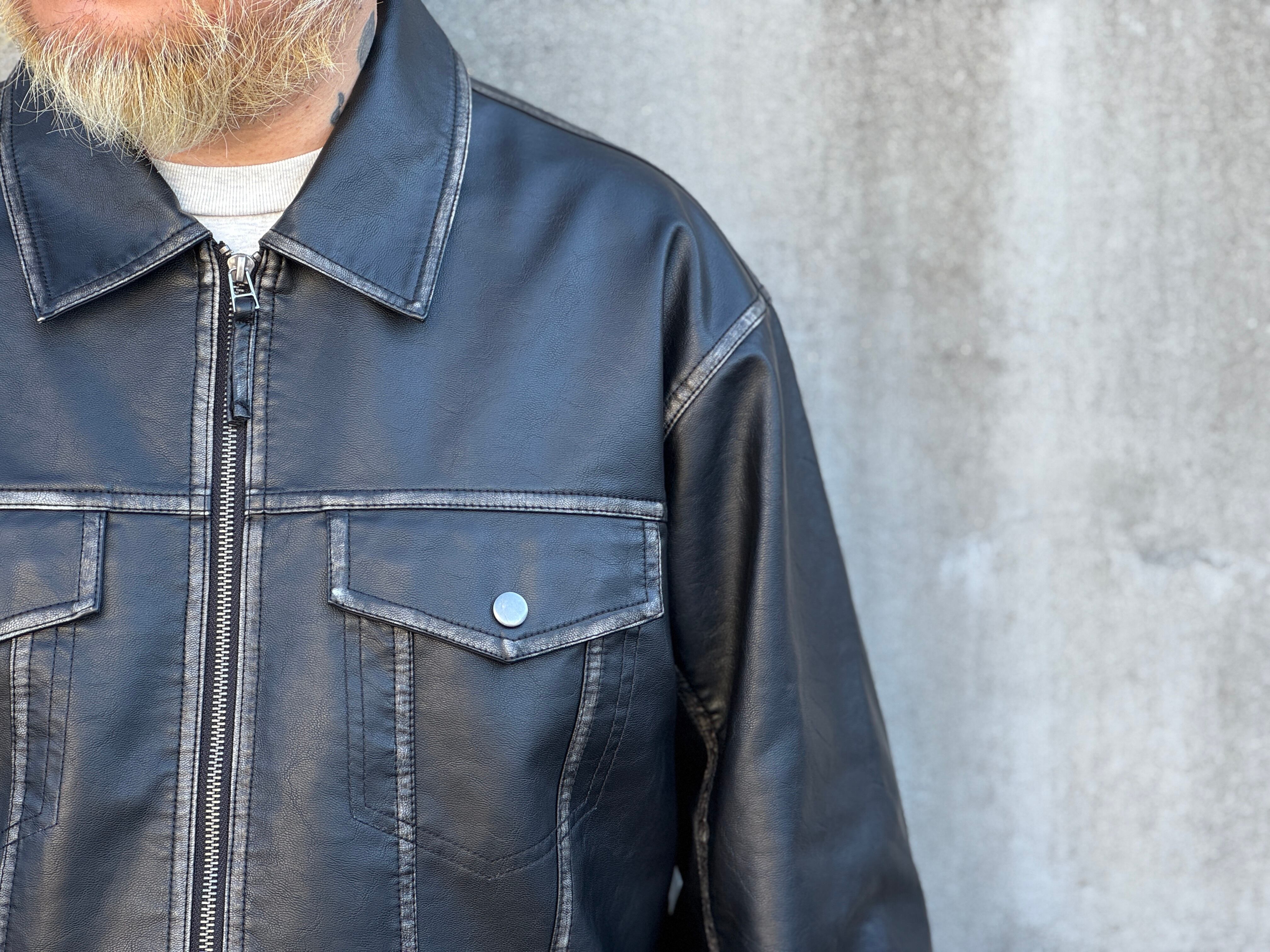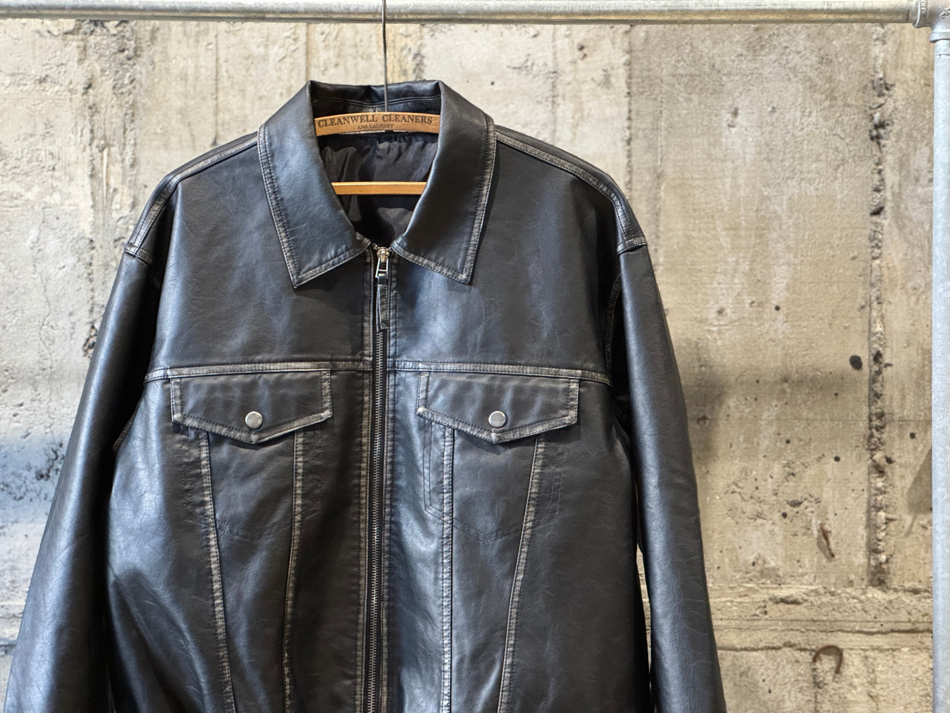 コチラはしっとりとしたレザータッチな生地感のトラッカーデザインのzip jkt。ヴィンテージ加工による独特な“あたり”色落ち感のある珍しいフェイクレザー生地を使用。両サイドにスラッシュポケット、内側にもポケットが配してあります。