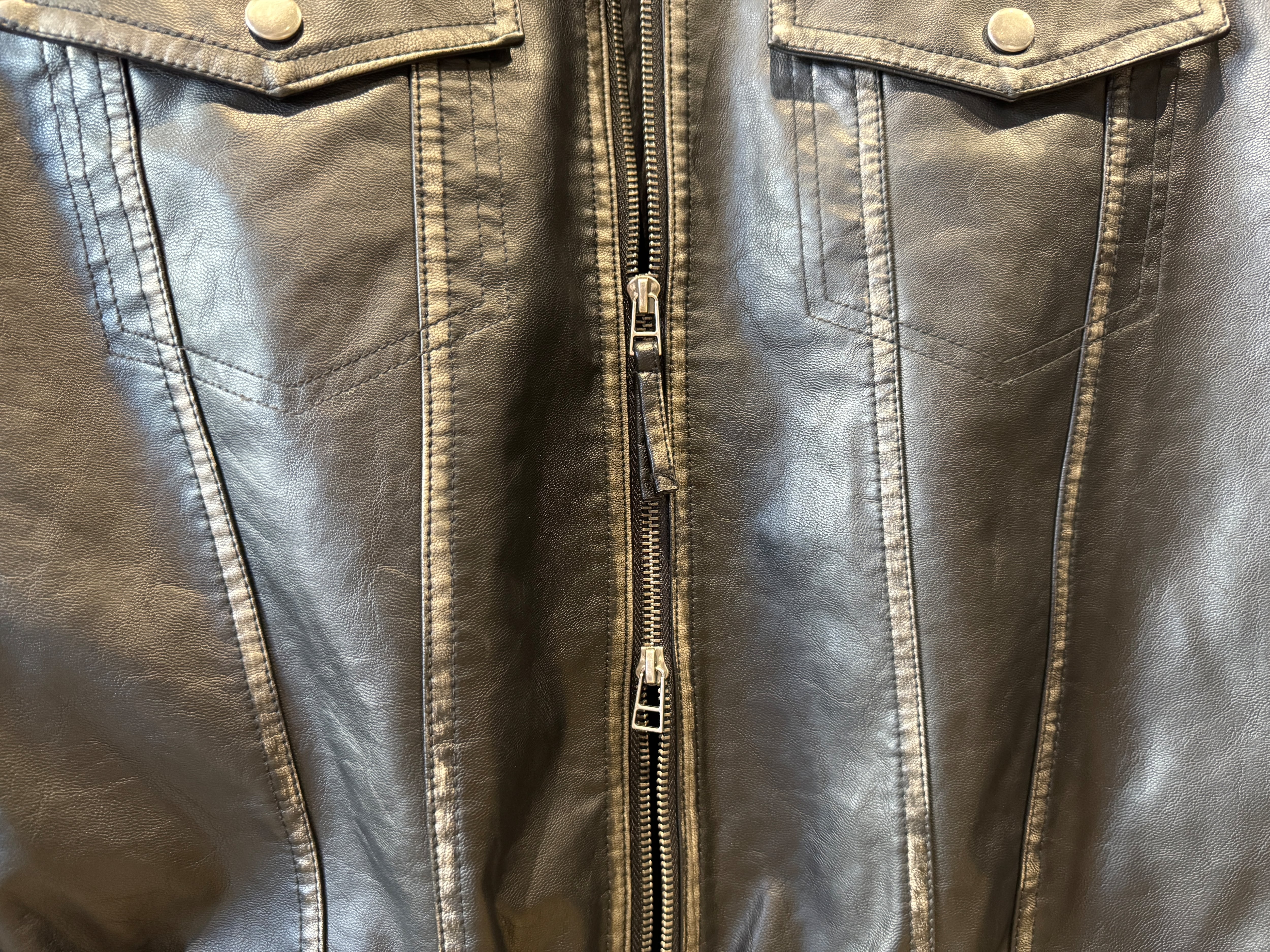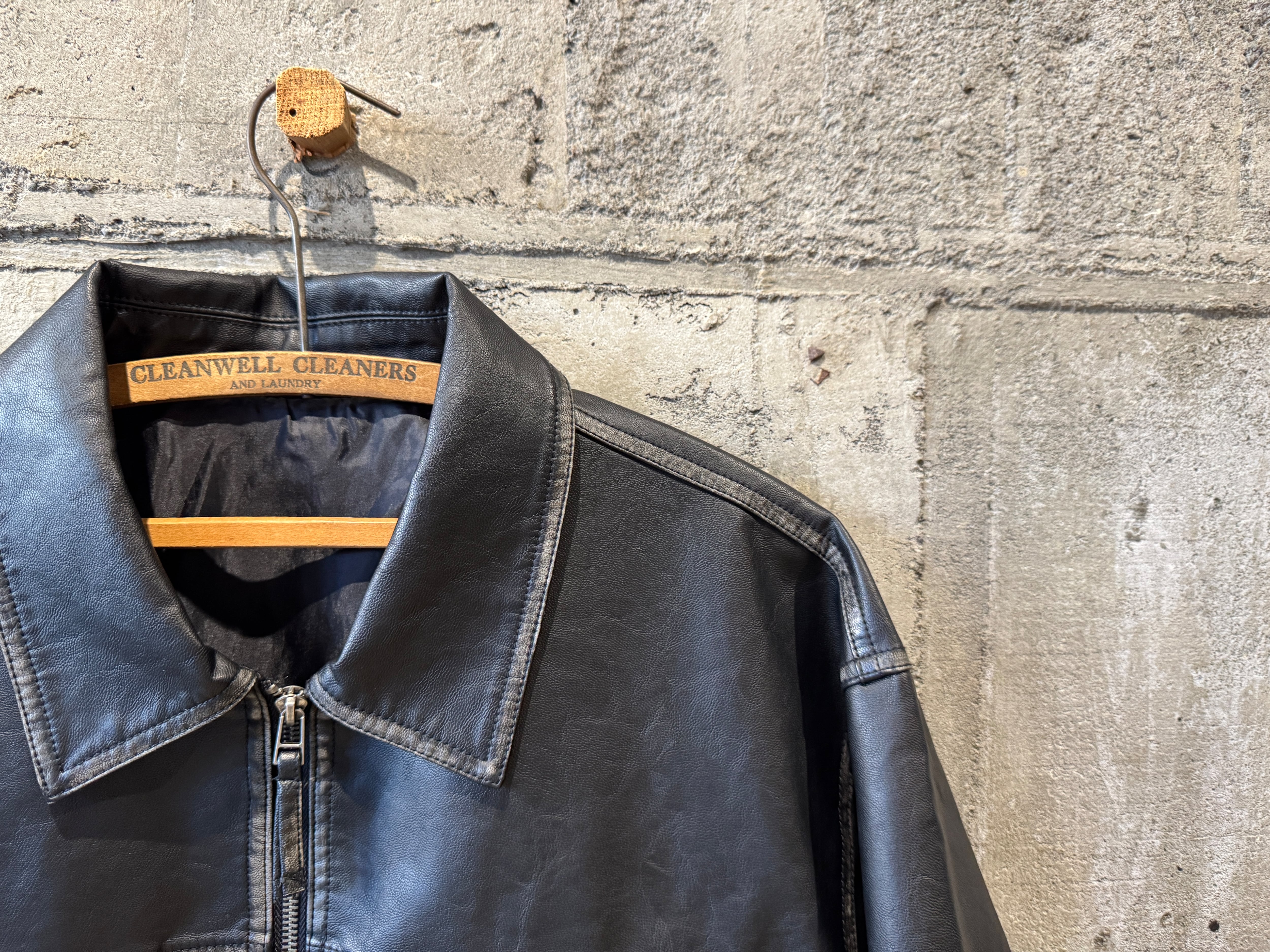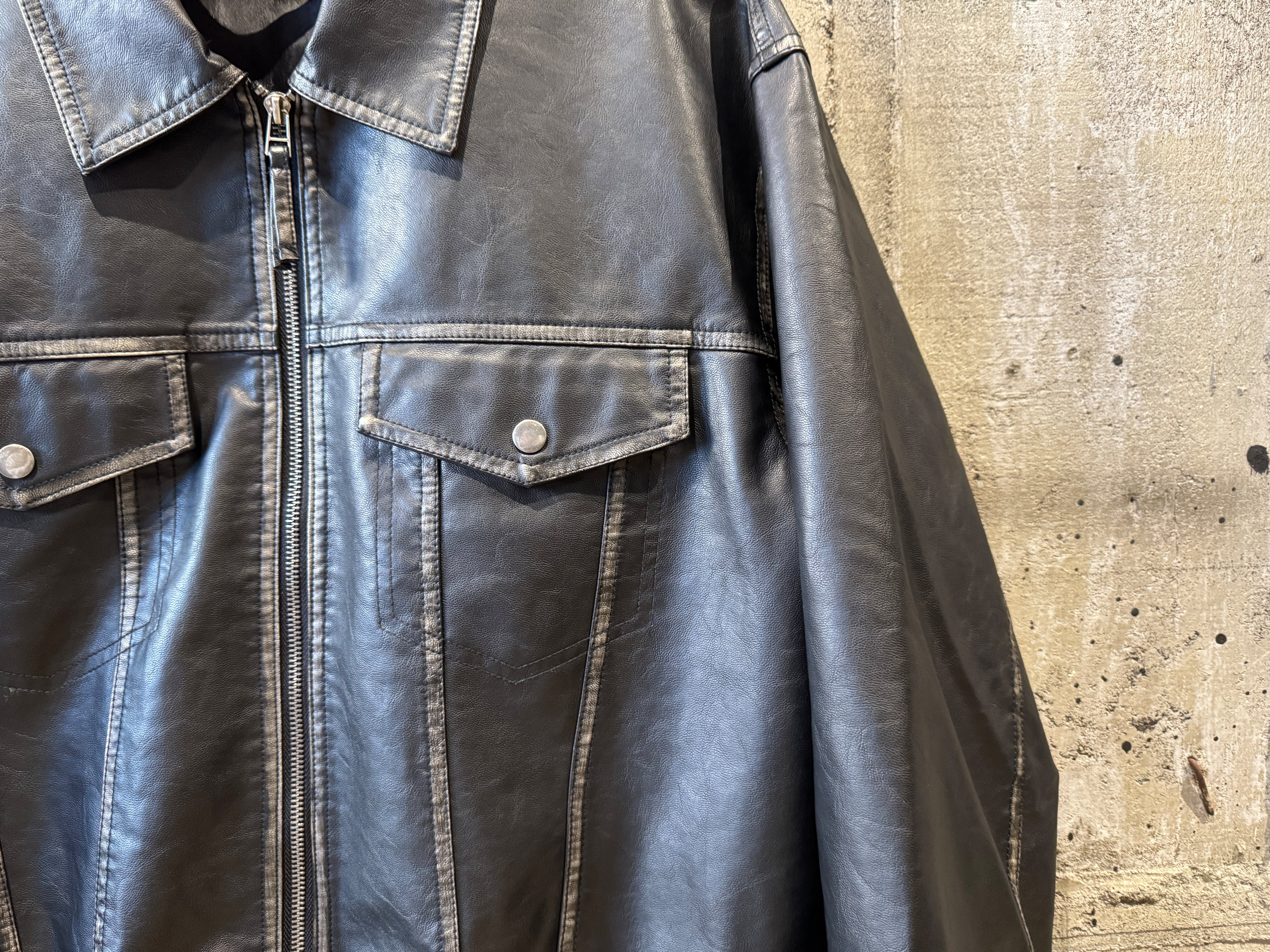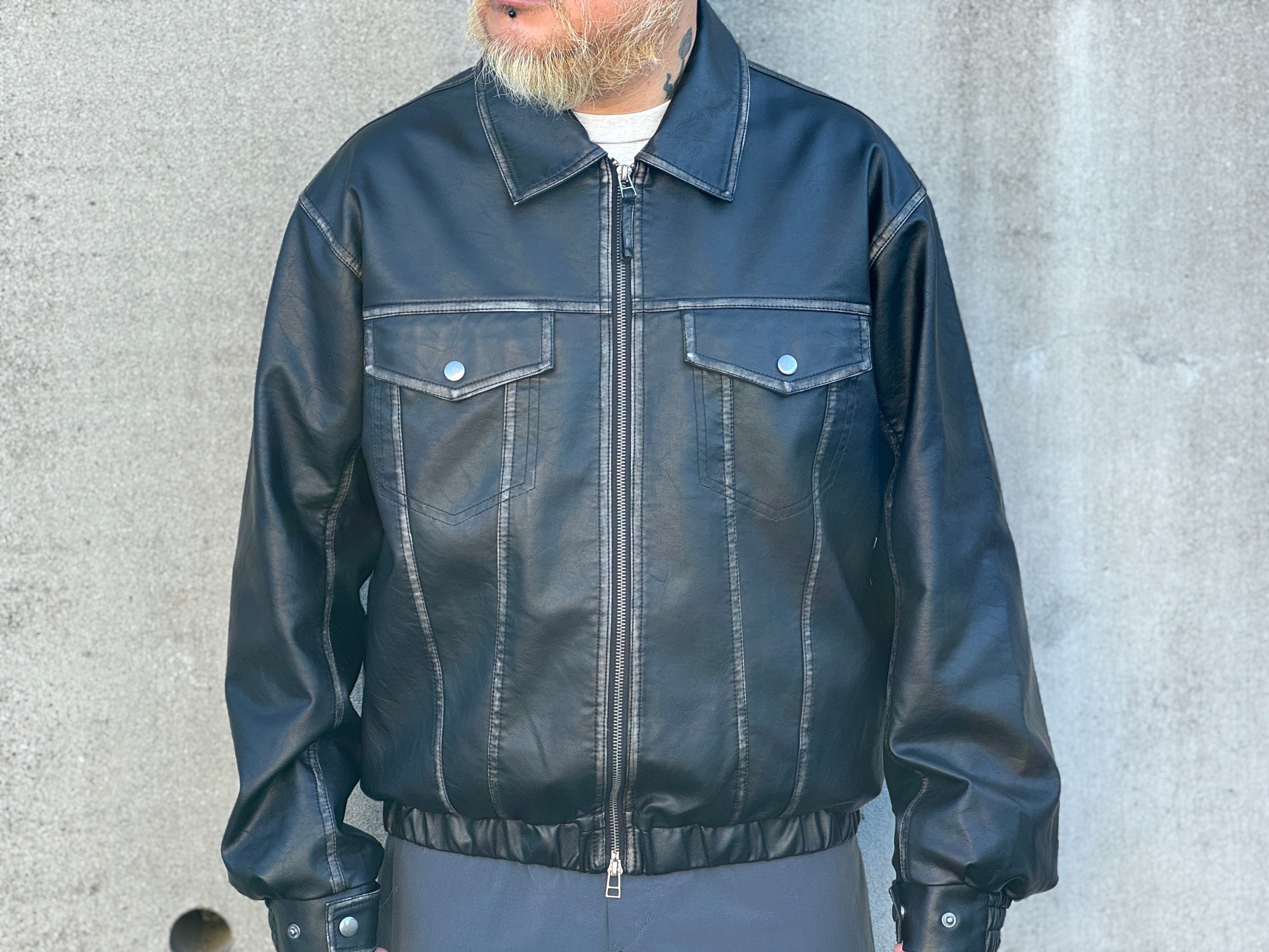 コチラはしっとりとしたレザータッチな生地感のトラッカーデザインのzip jkt。ヴィンテージ加工による独特な“あたり”色落ち感のある珍しいフェイクレザー生地を使用。両サイドにスラッシュポケット、内側にもポケットが配してあります。