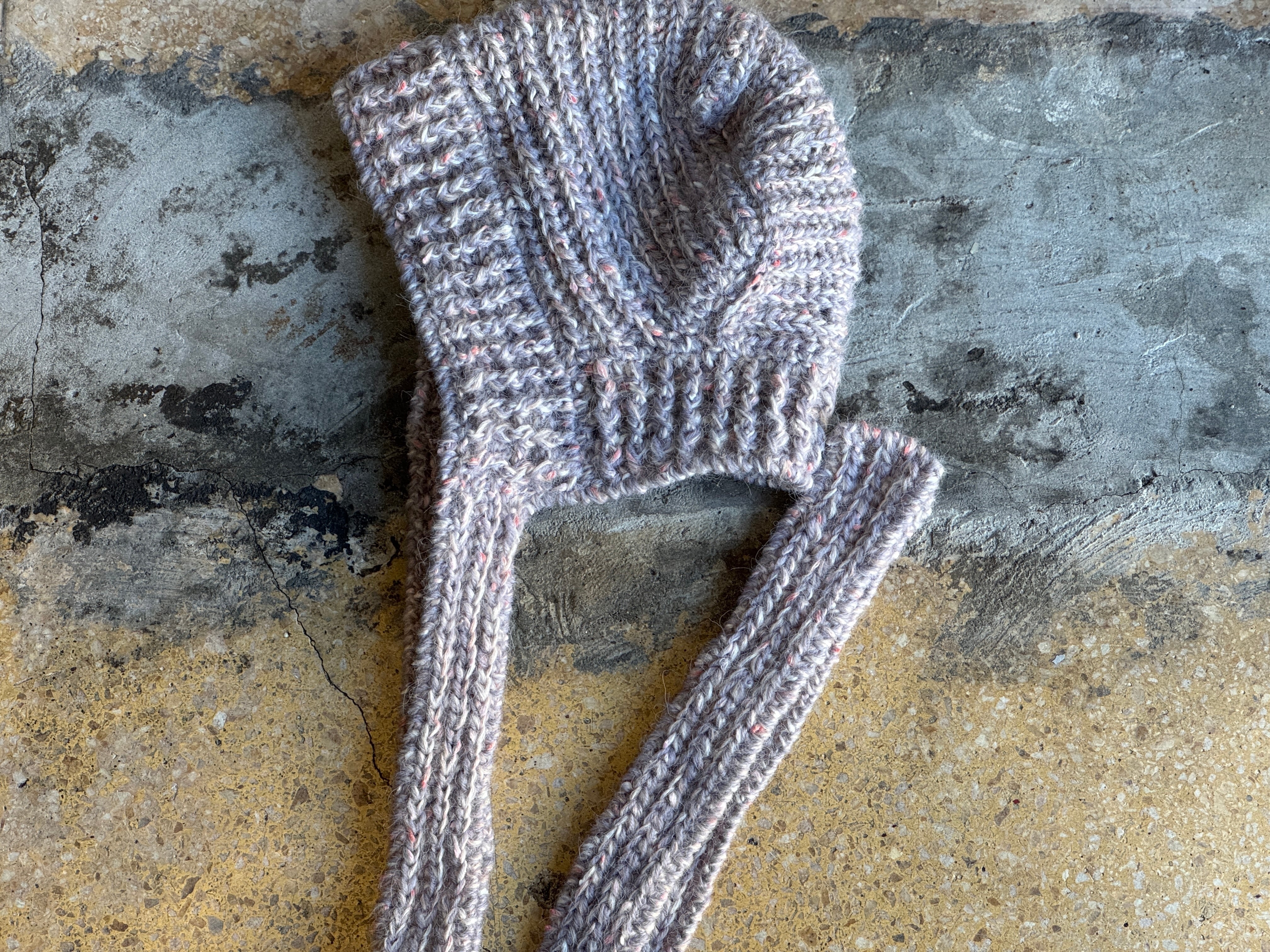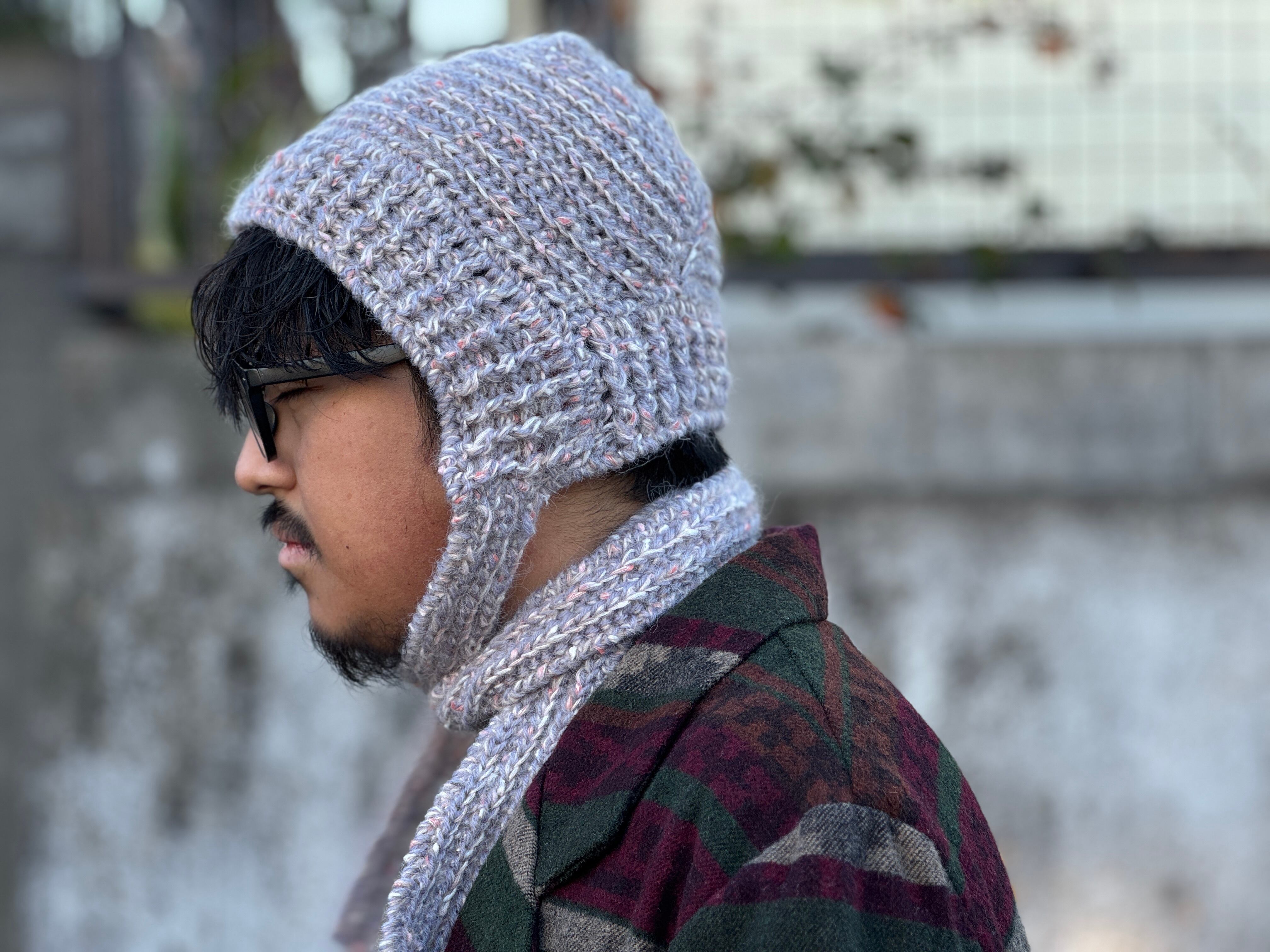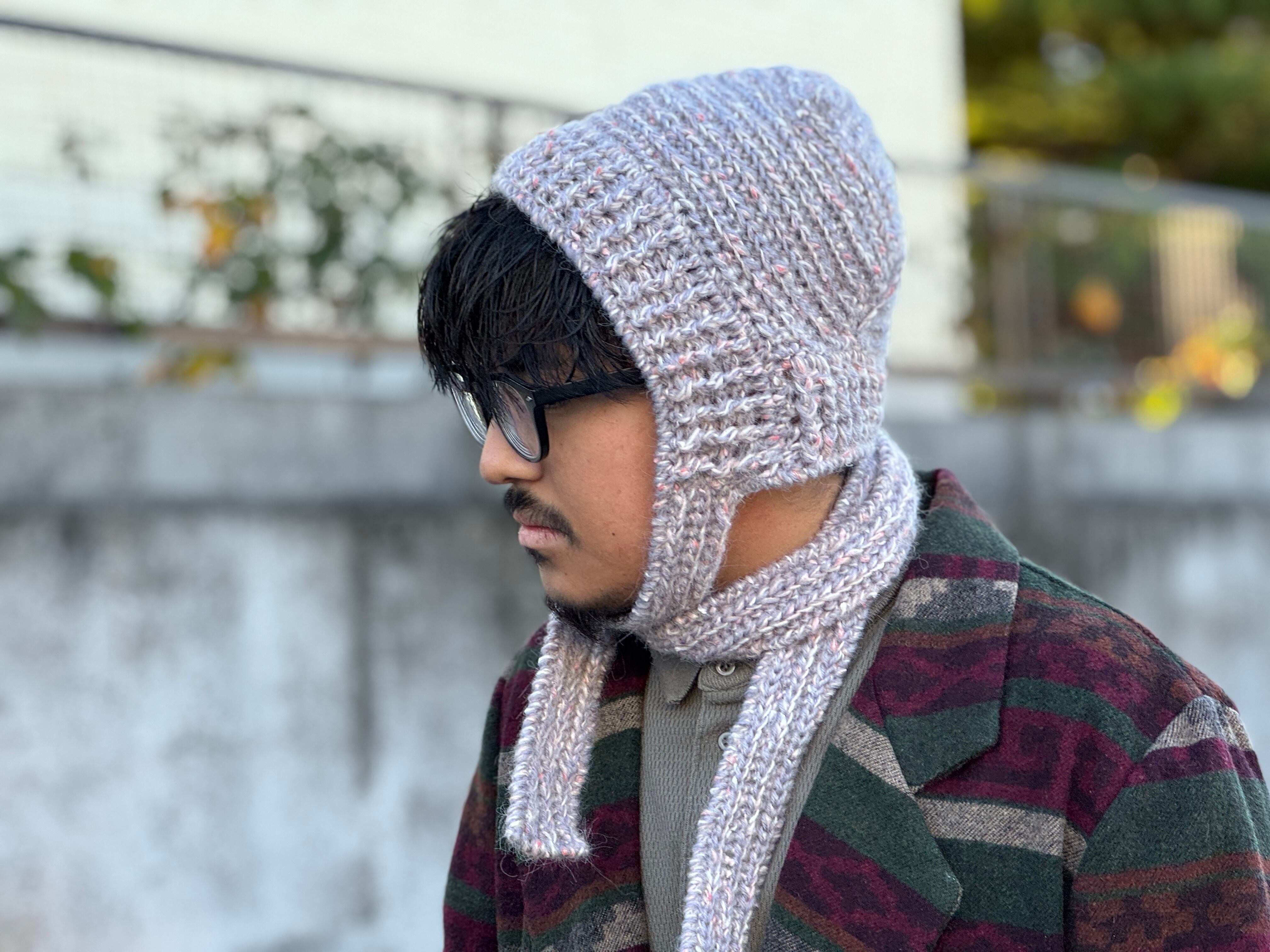 高品質なアクリルを使用。カラーはピンク×オフホワイト×ライトグレー。手編みによる丁寧な編み地、肌触り・被り心地は抜群。