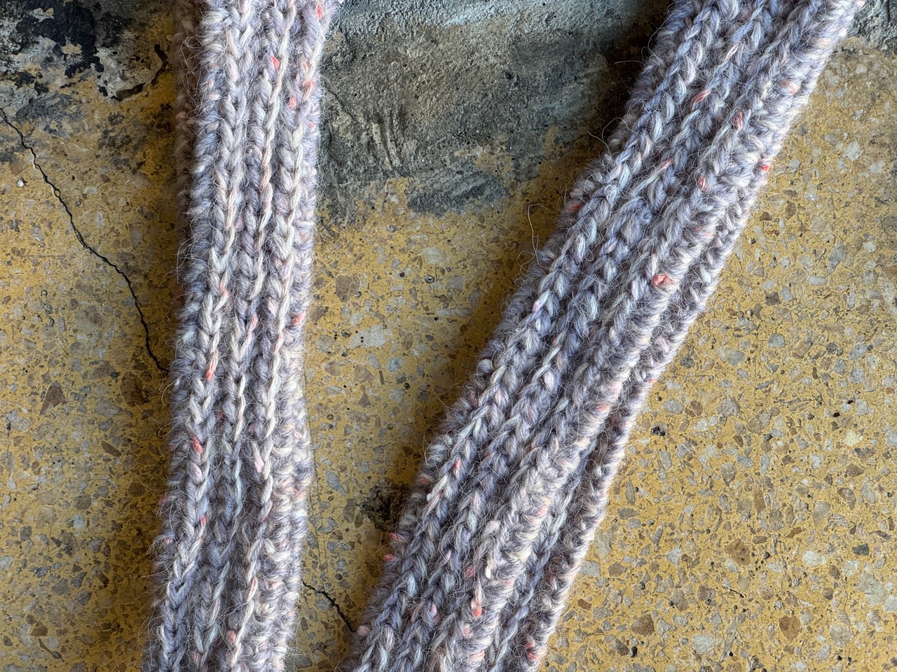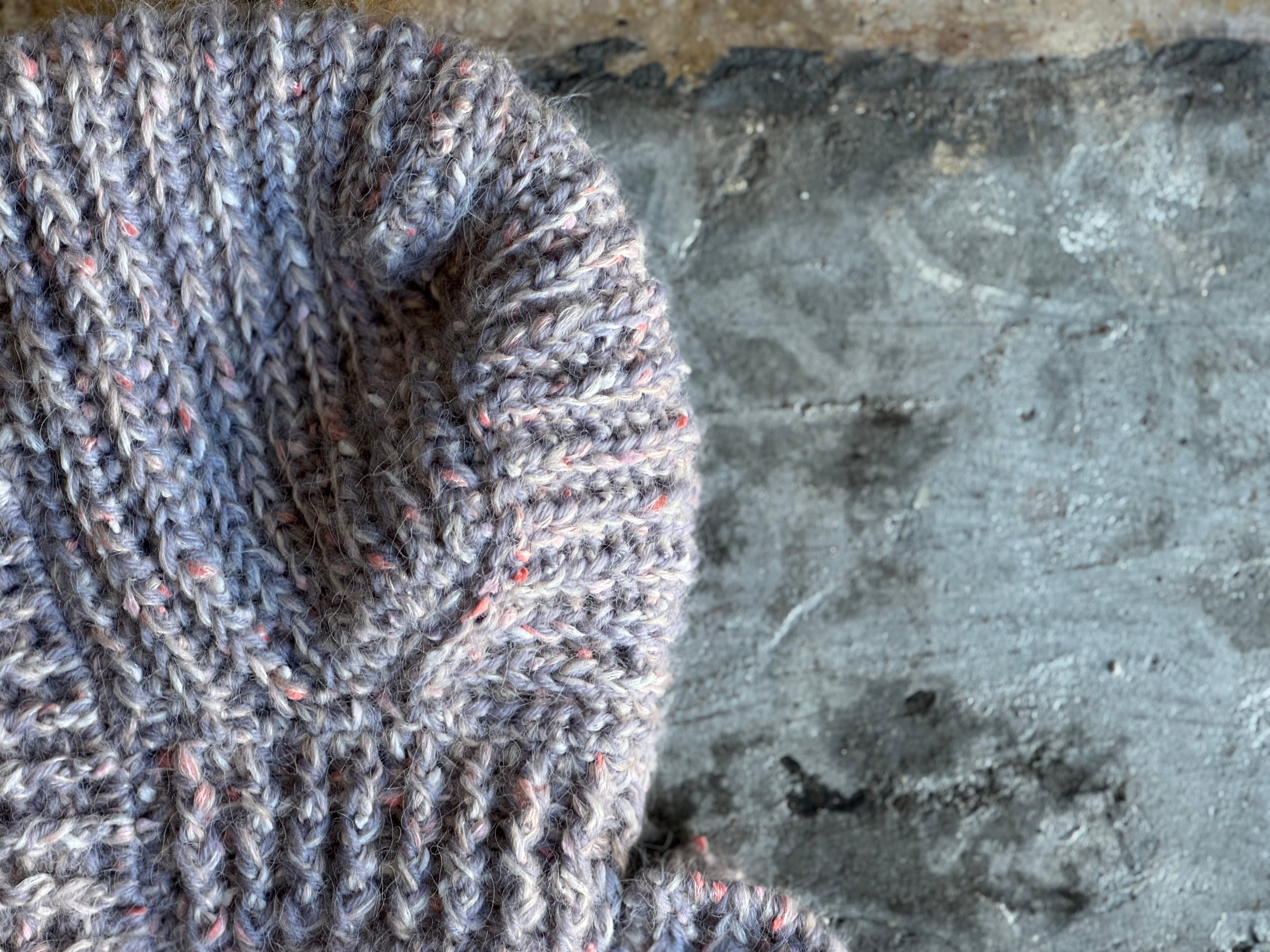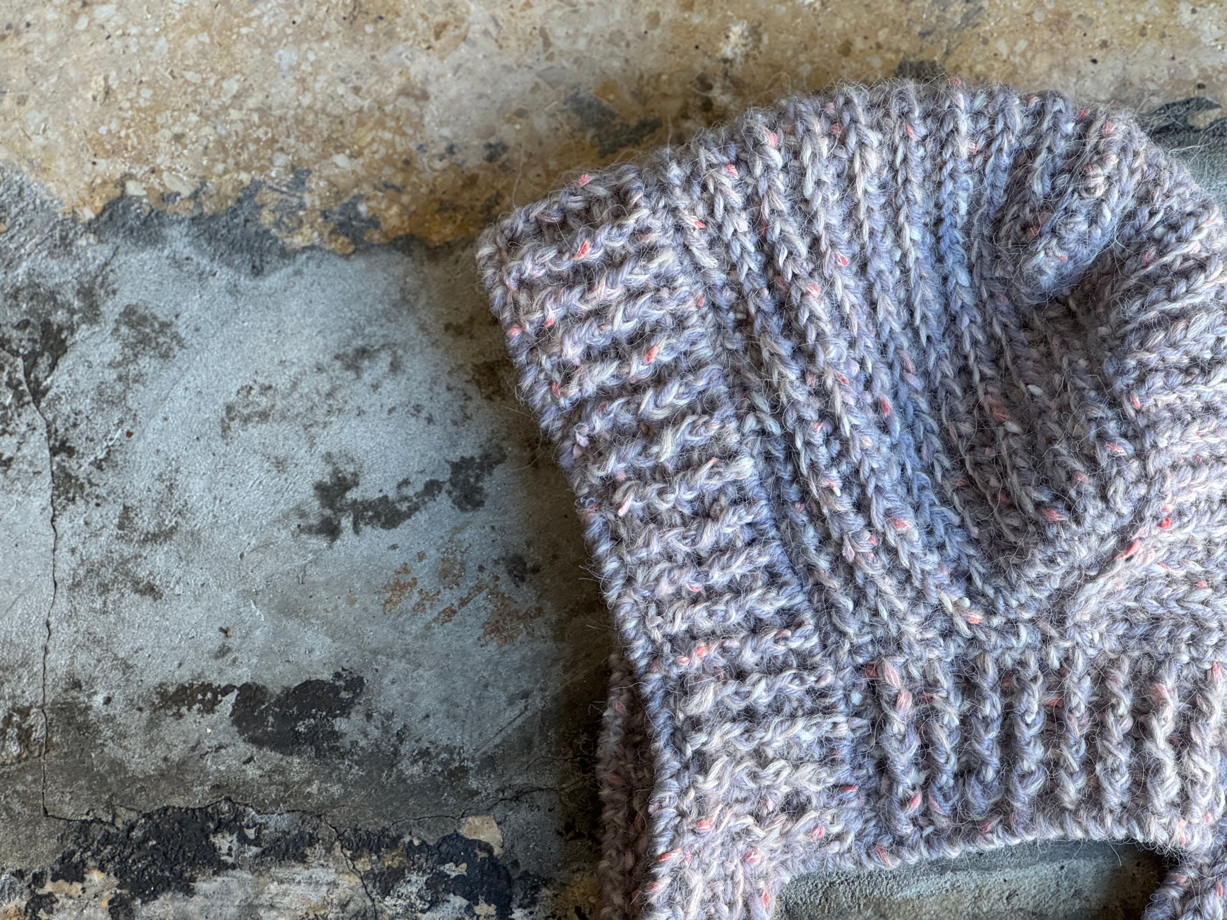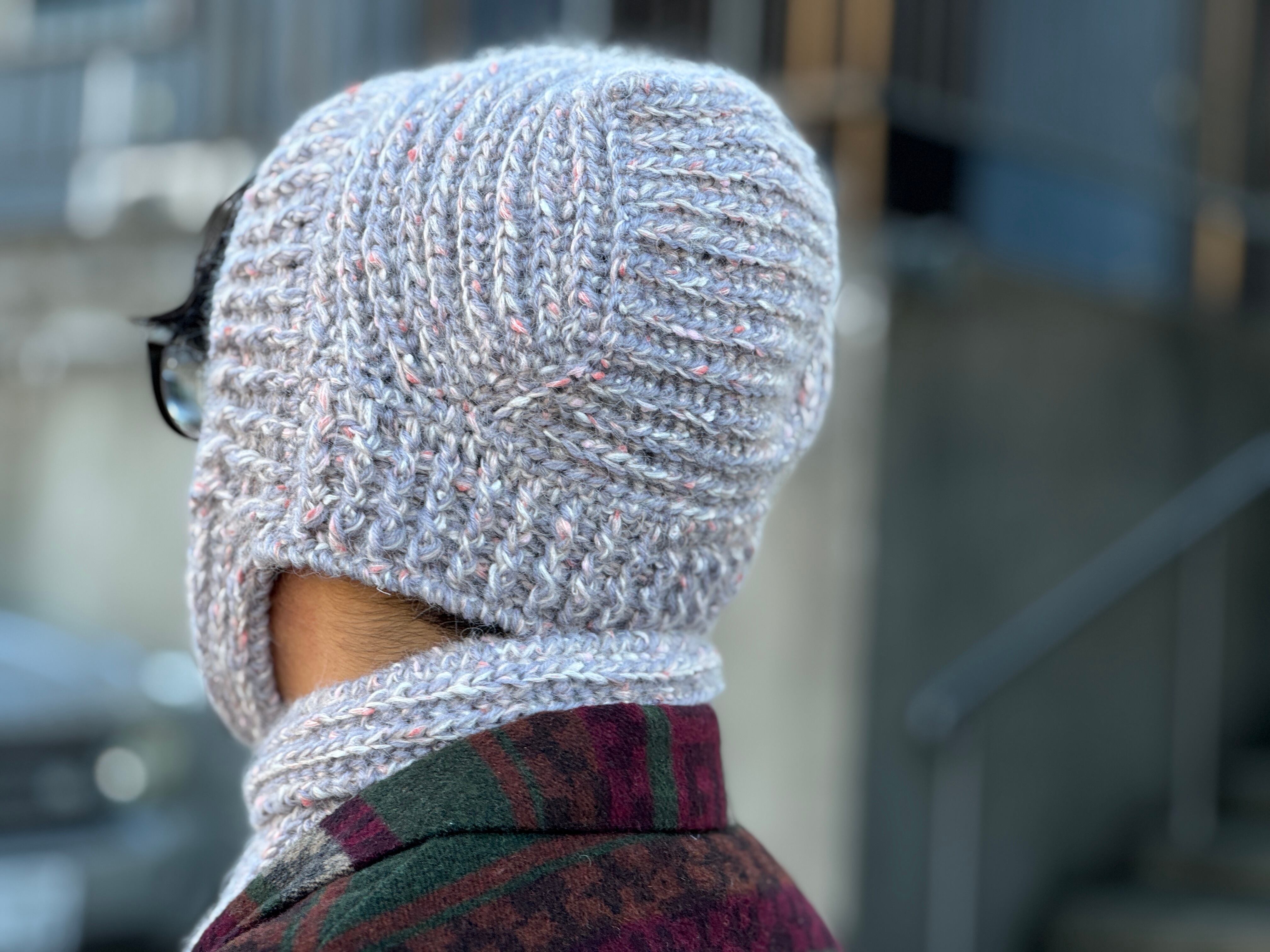 高品質なアクリルを使用。カラーはピンク×オフホワイト×ライトグレー。手編みによる丁寧な編み地、肌触り・被り心地は抜群。