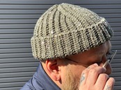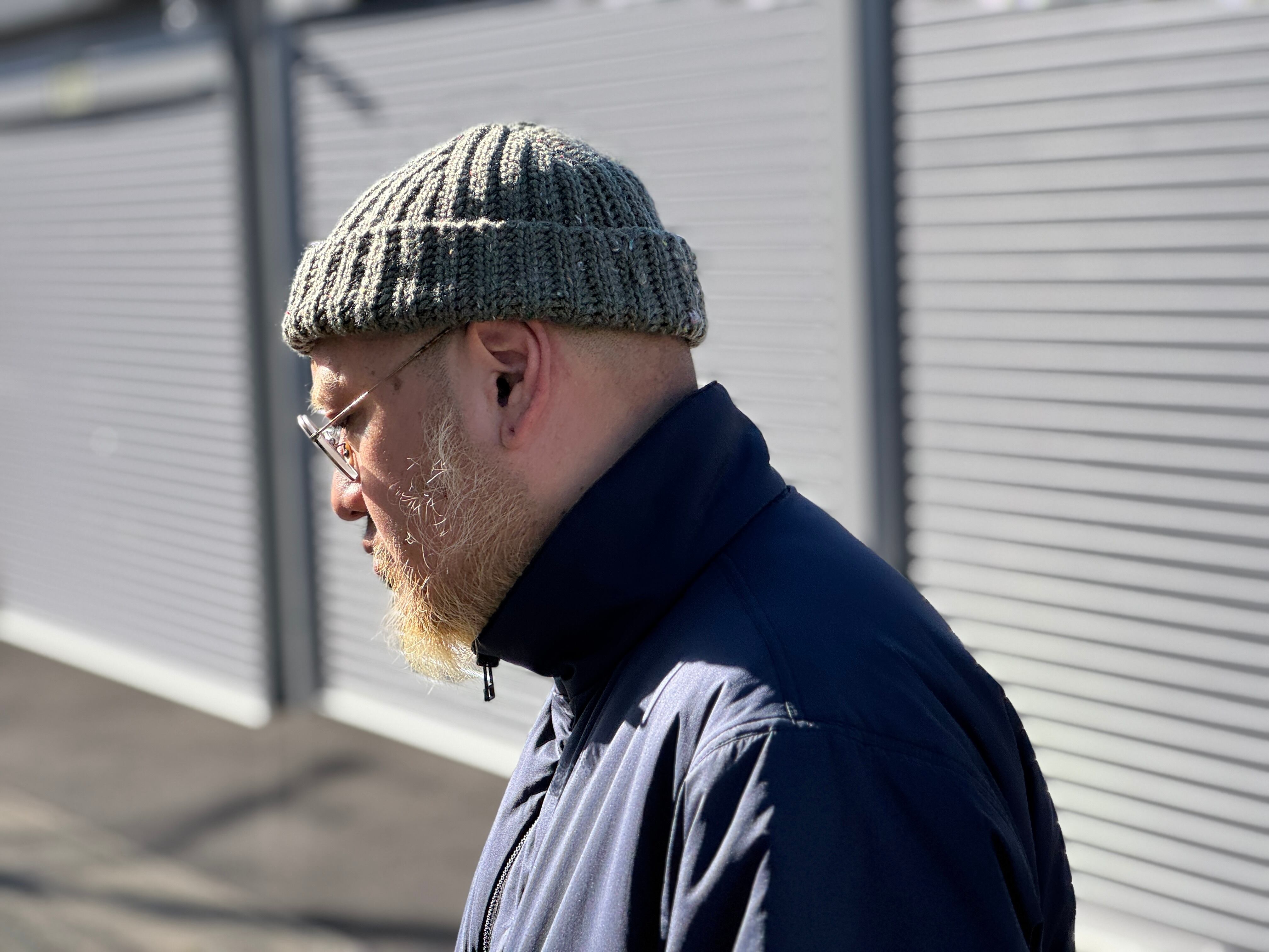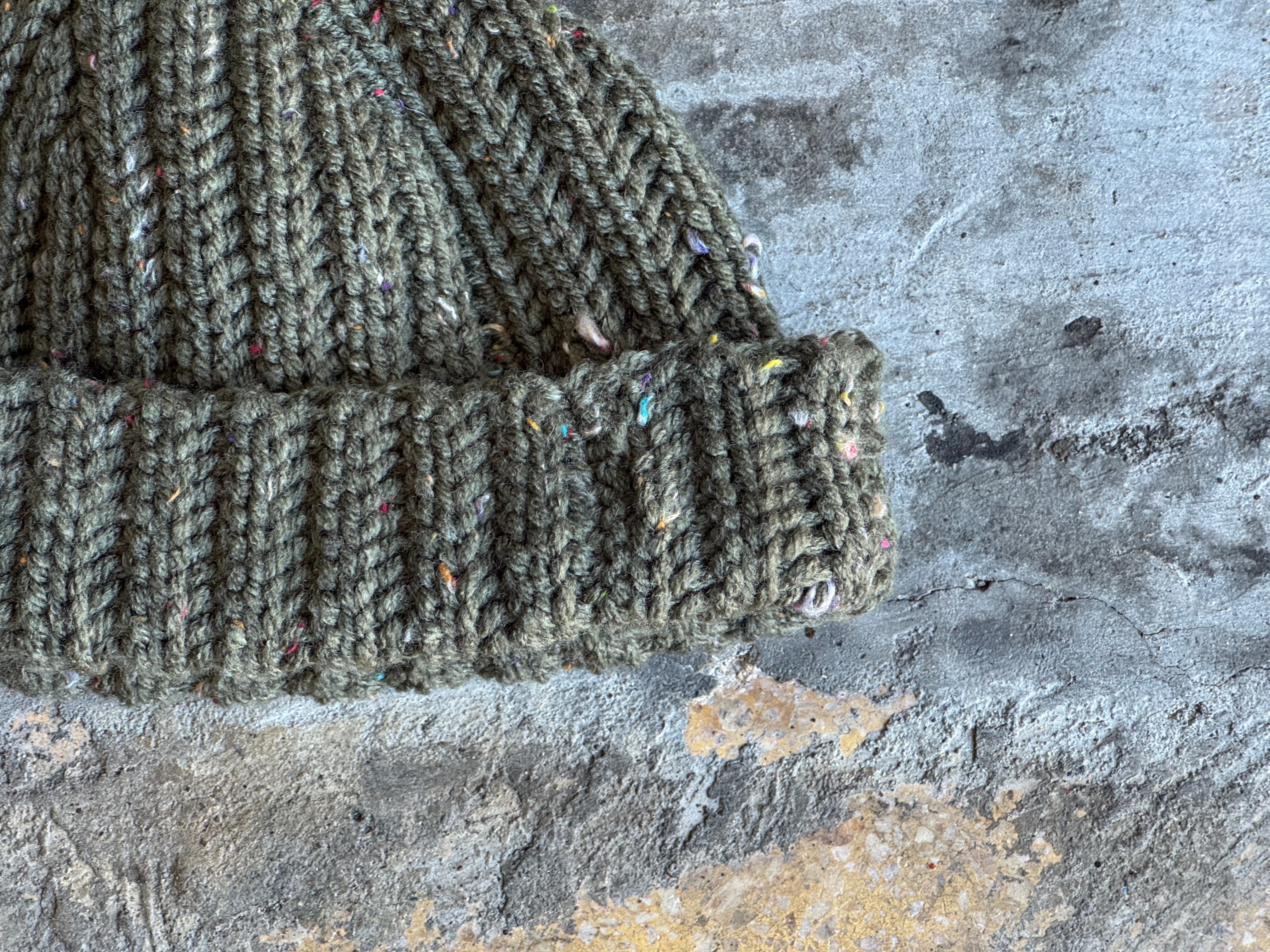 高品質なアクリルを使用。カラーはオリーブ。様々なカラーのネップが散りばめられています。手編みによる丁寧な編み地、肌触り・被り心地は抜群。