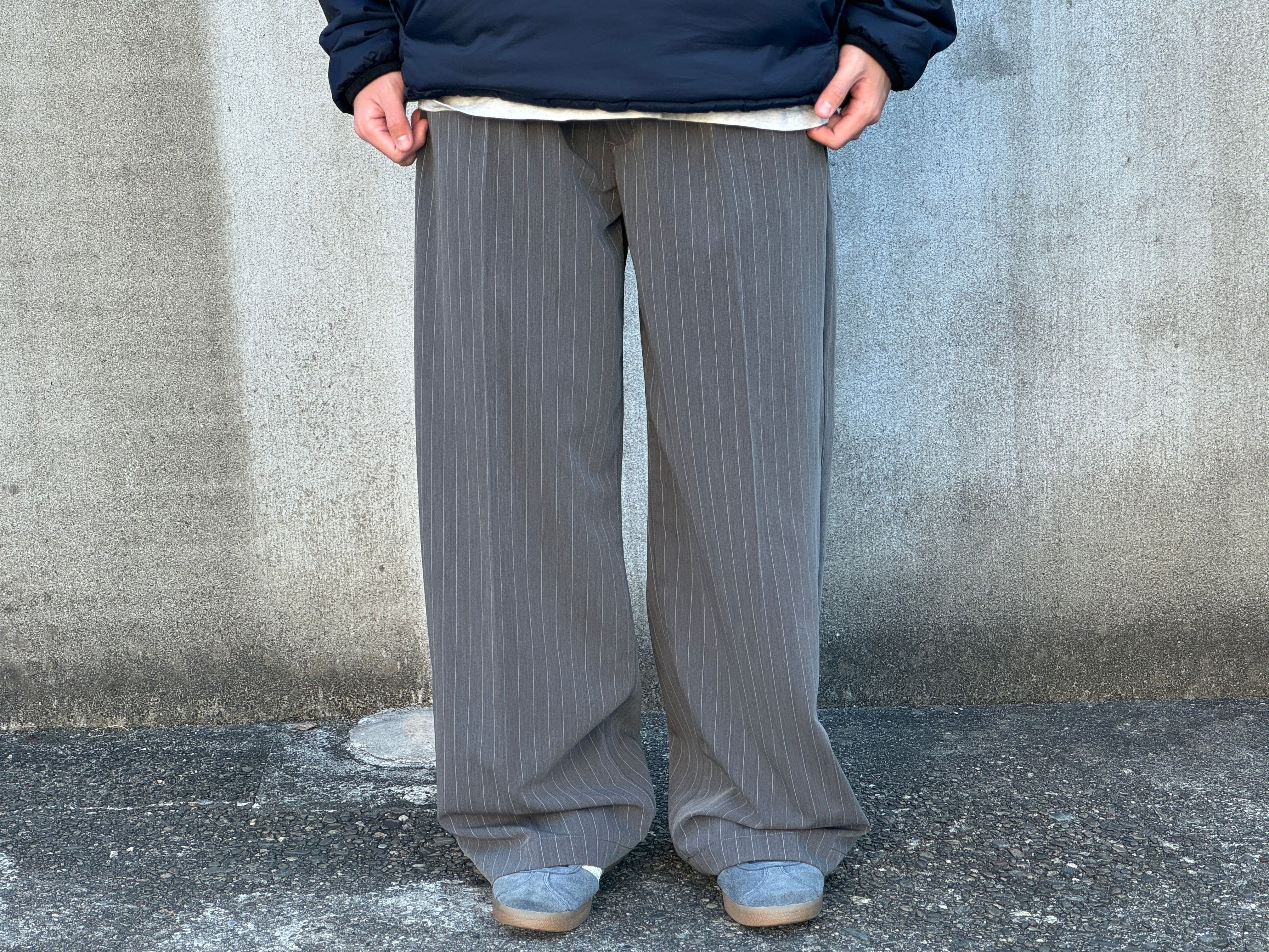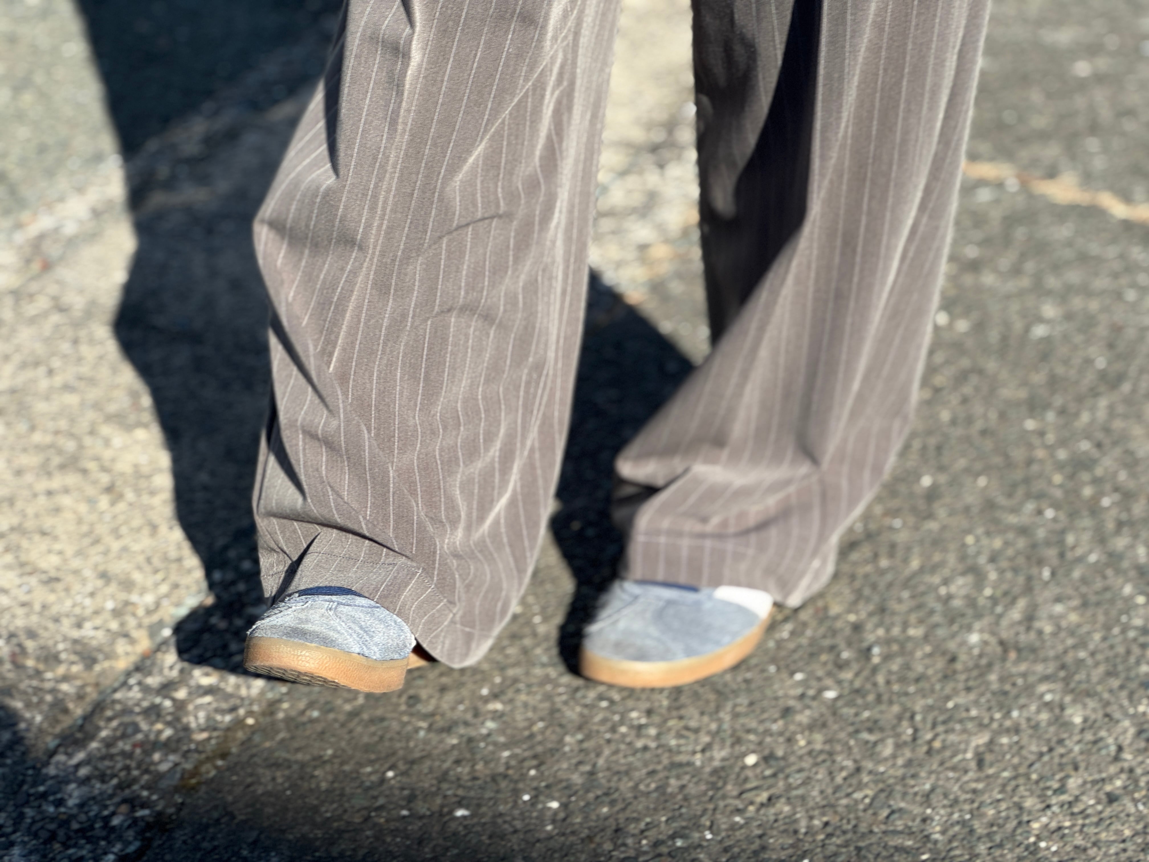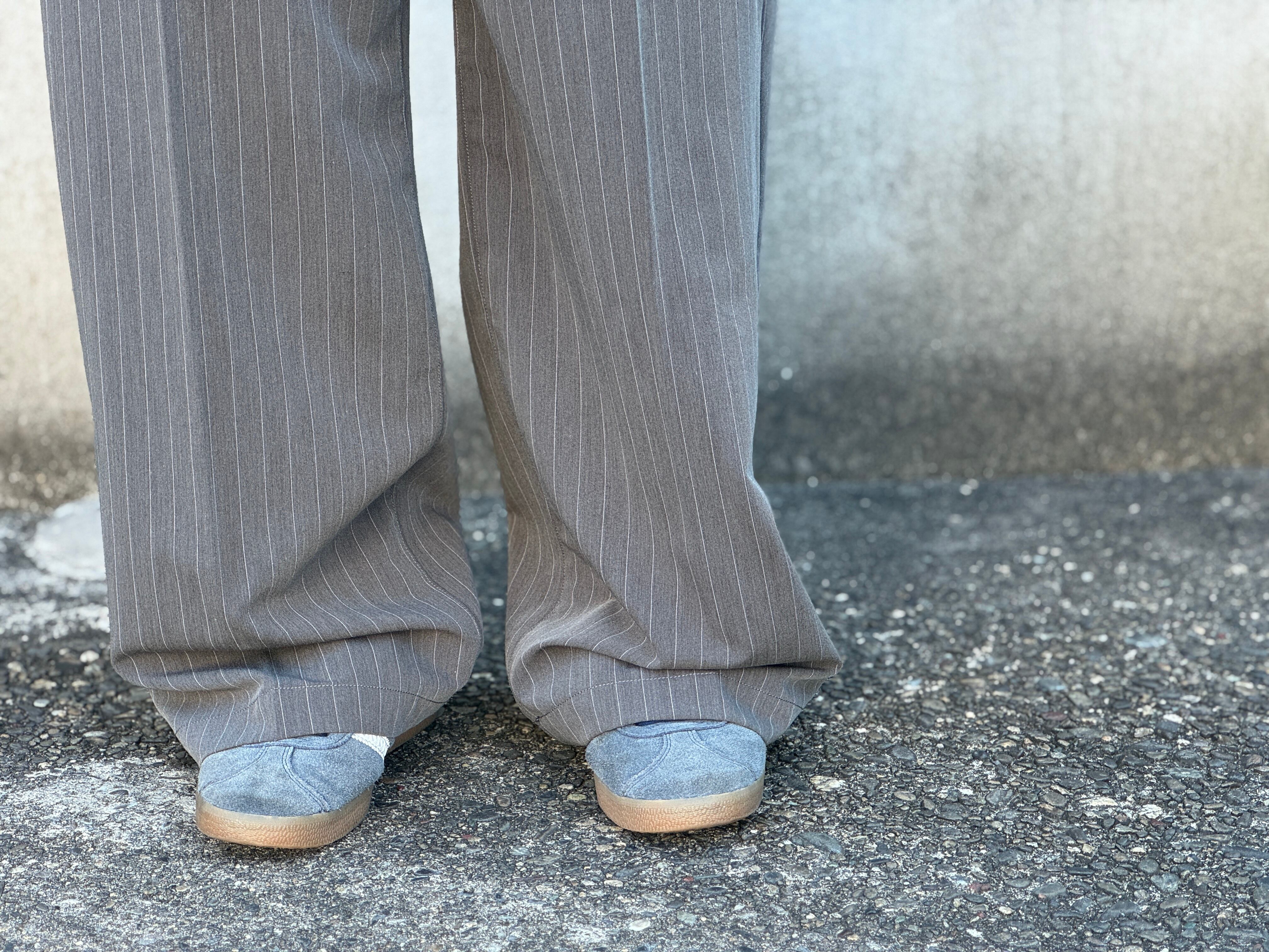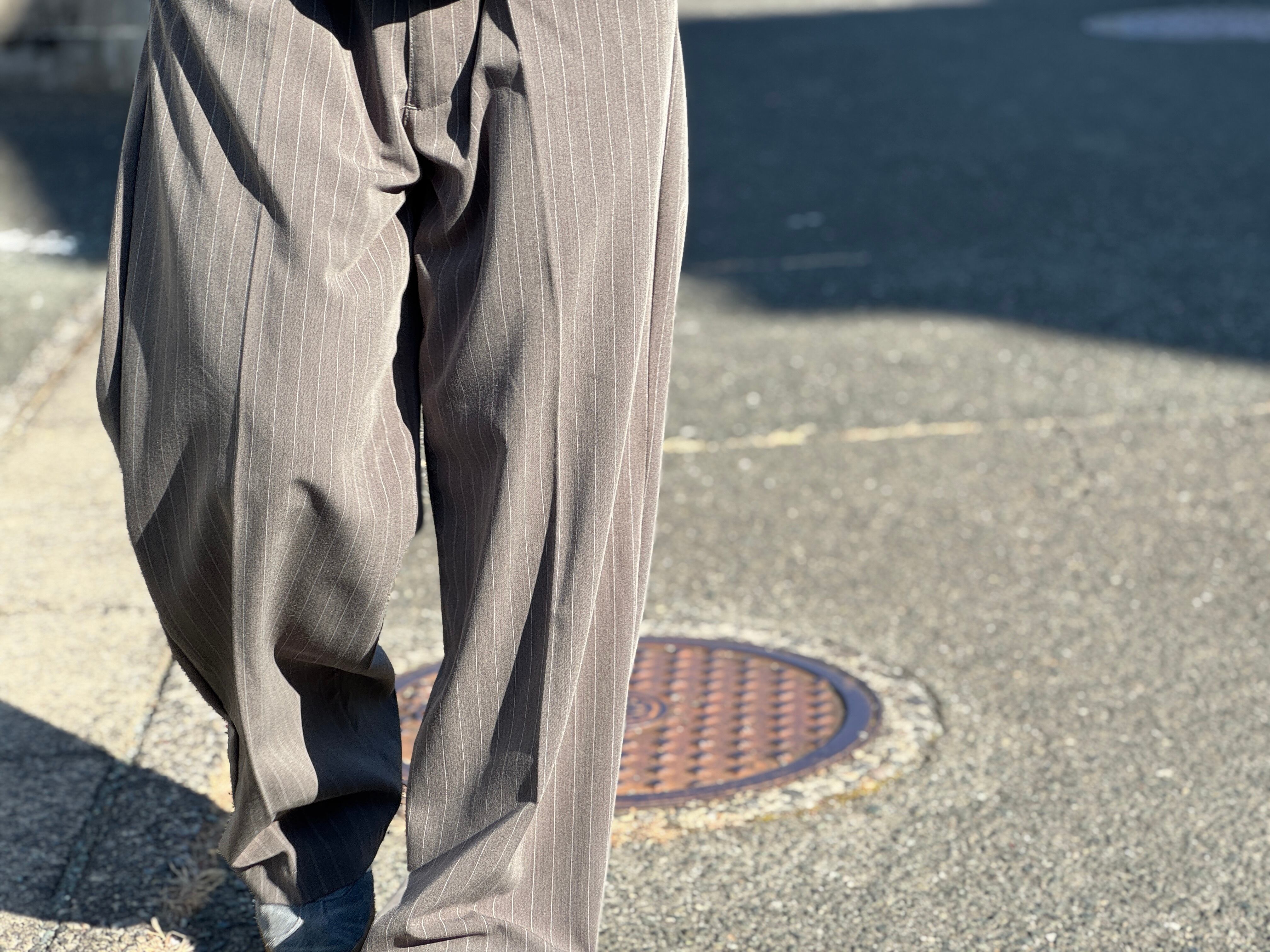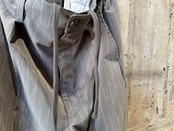 グレーベースのストライプパターン。1タックでセンタープレスの入った程よくワイドなシルエット。ウエストはゴムとコードのイージー仕様なので快適な穿き心地です。