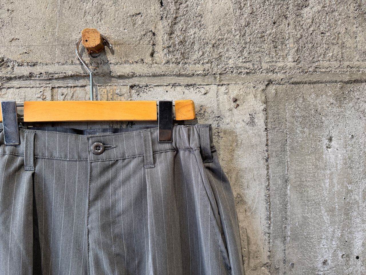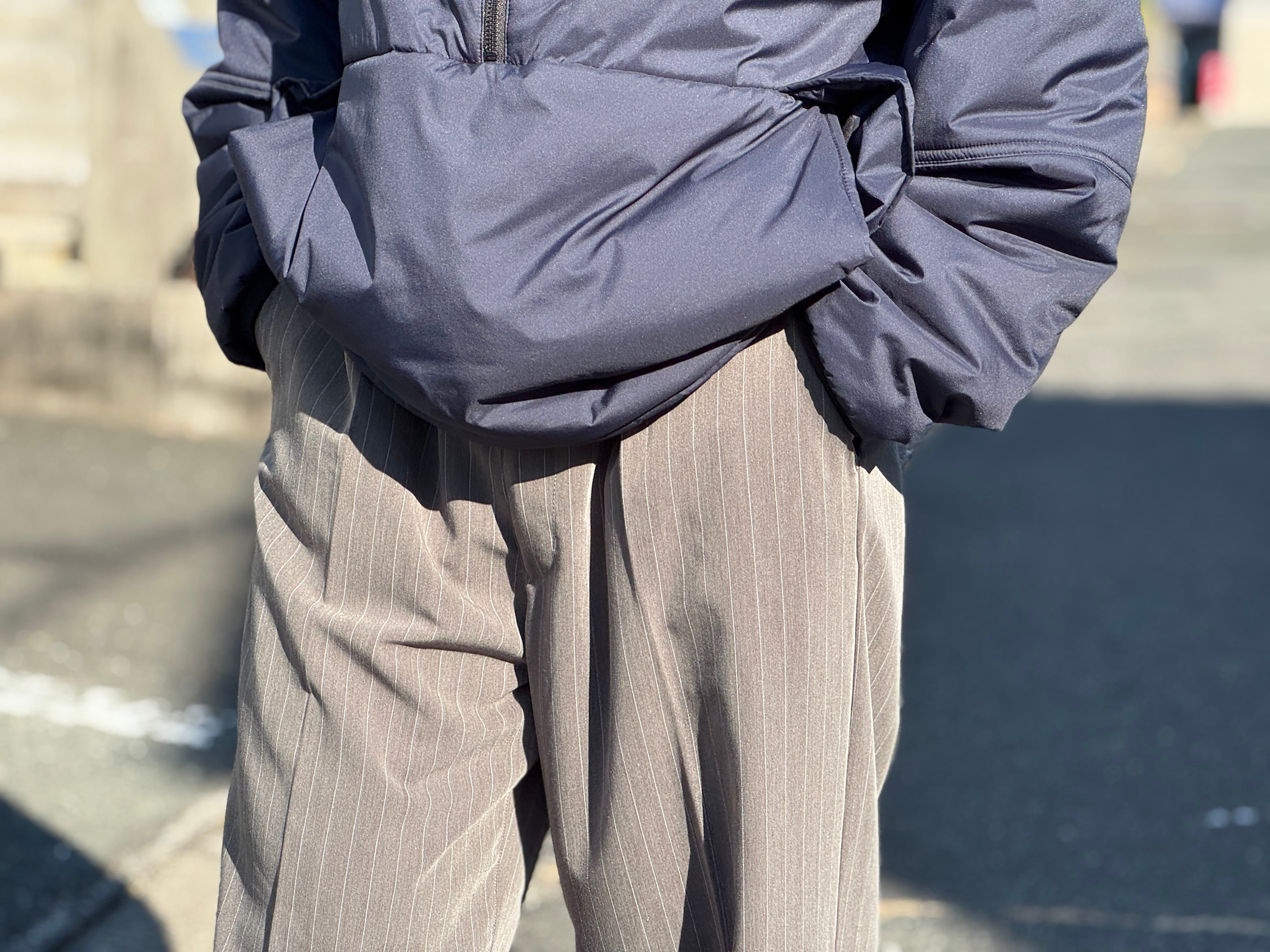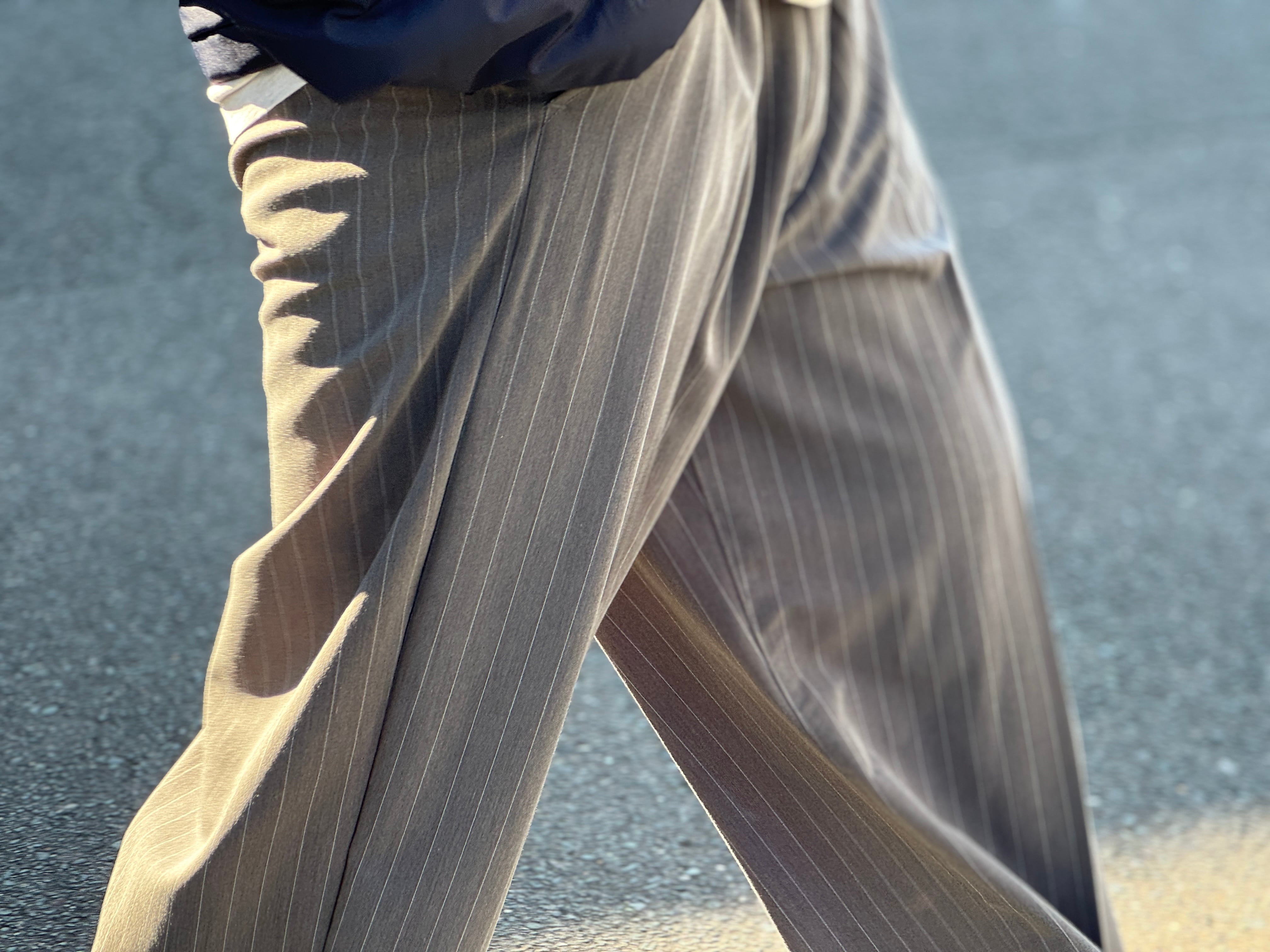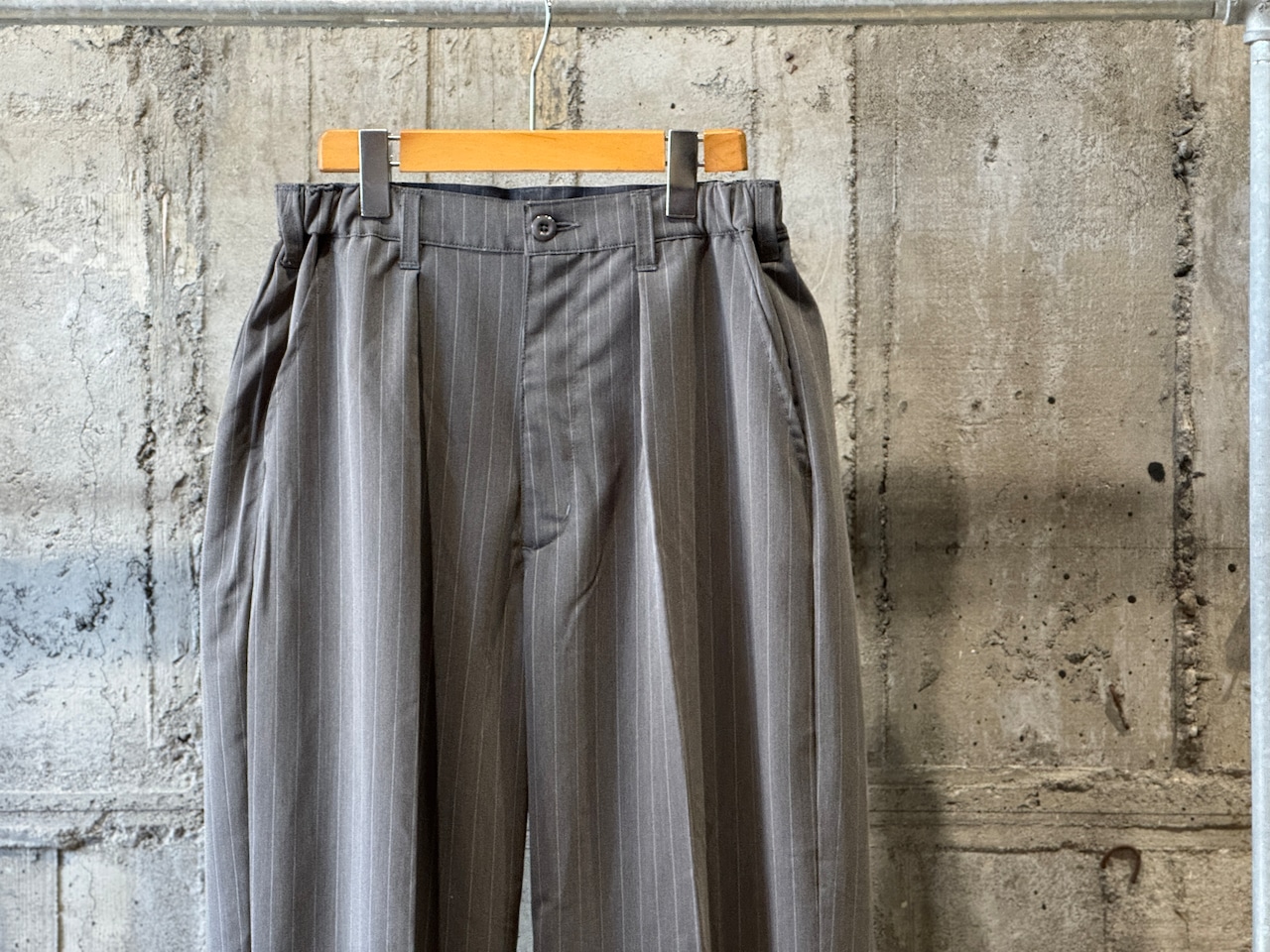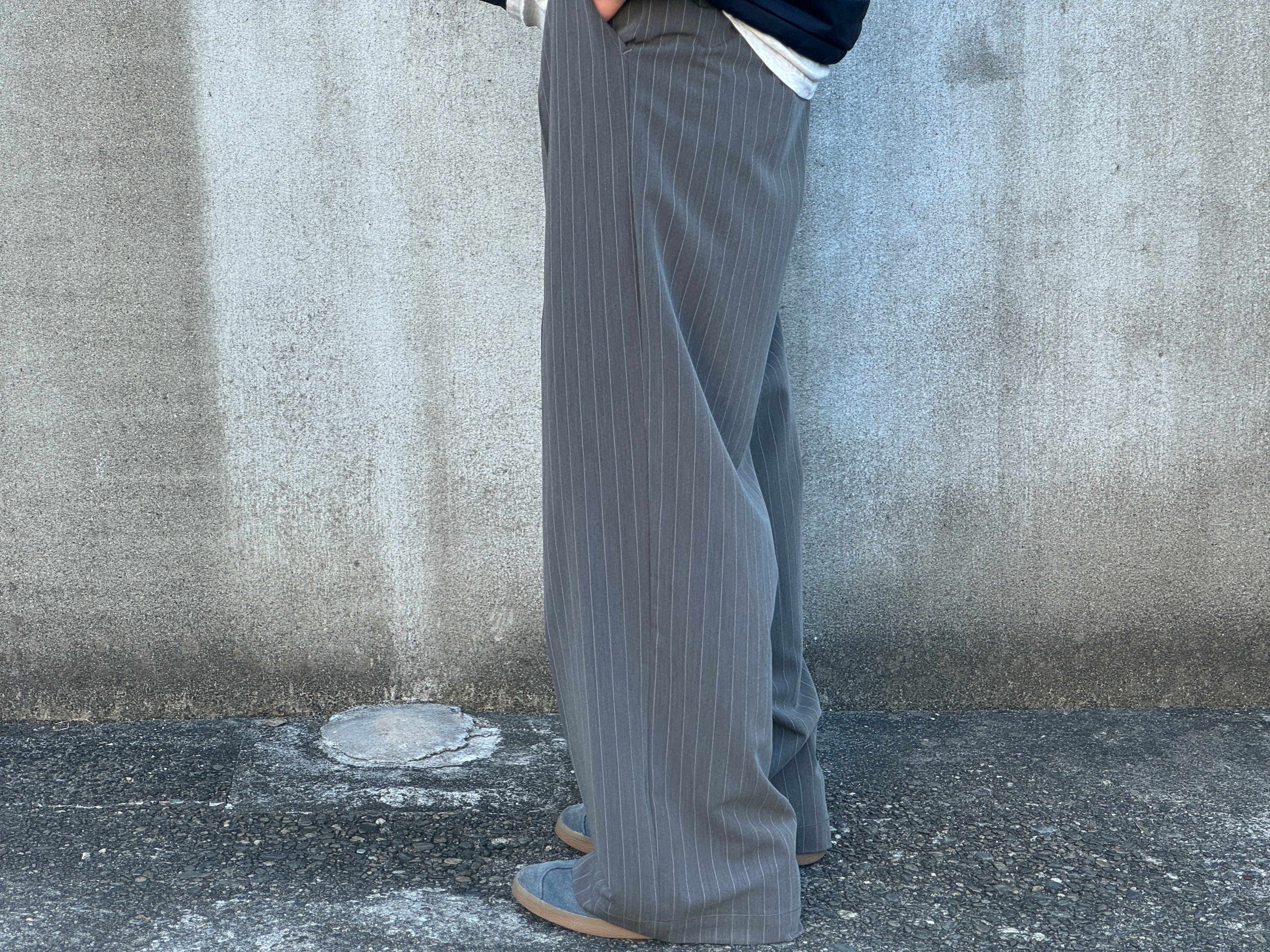 グレーベースのストライプパターン。1タックでセンタープレスの入った程よくワイドなシルエット。ウエストはゴムとコードのイージー仕様なので快適な穿き心地です。